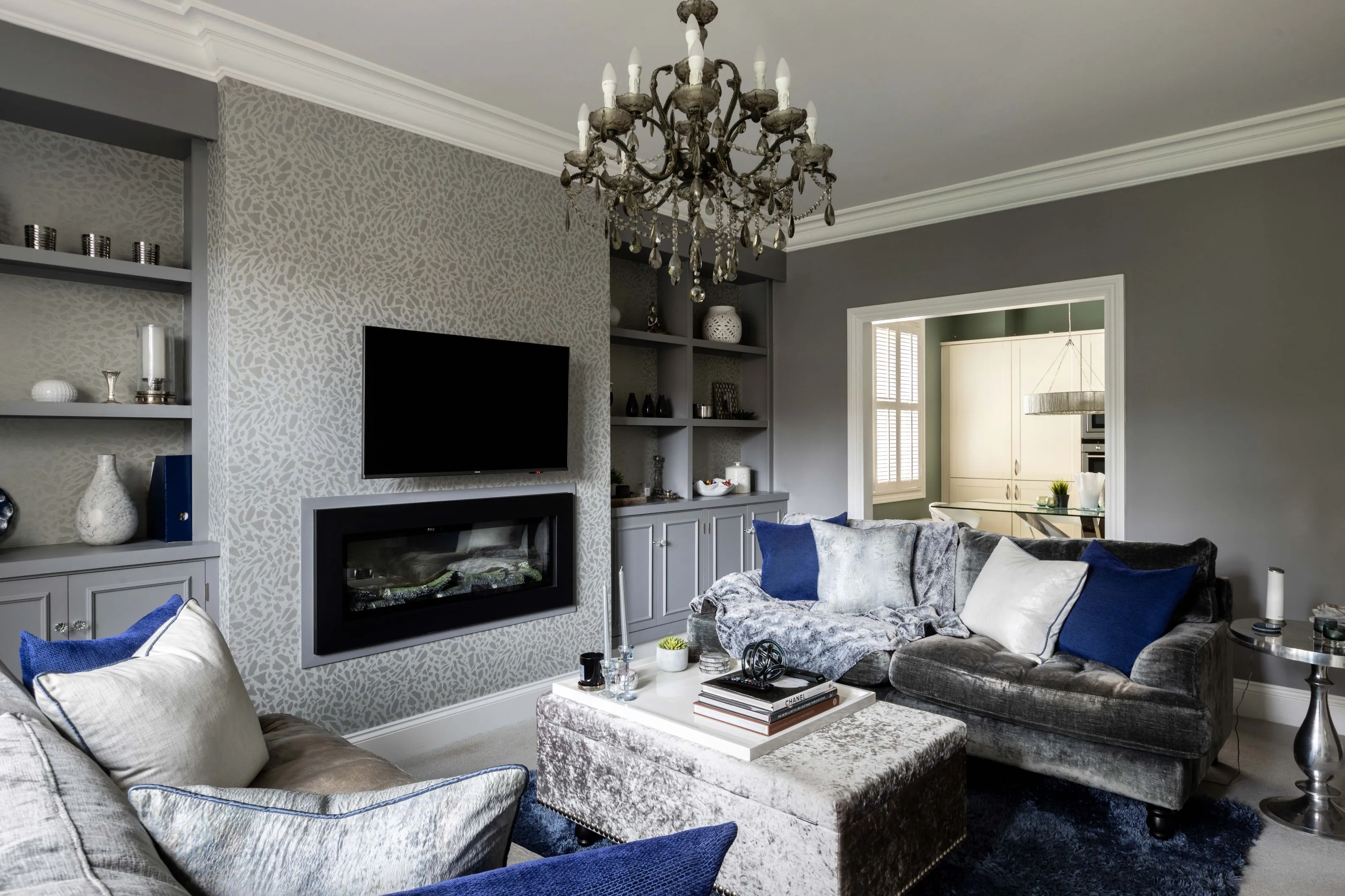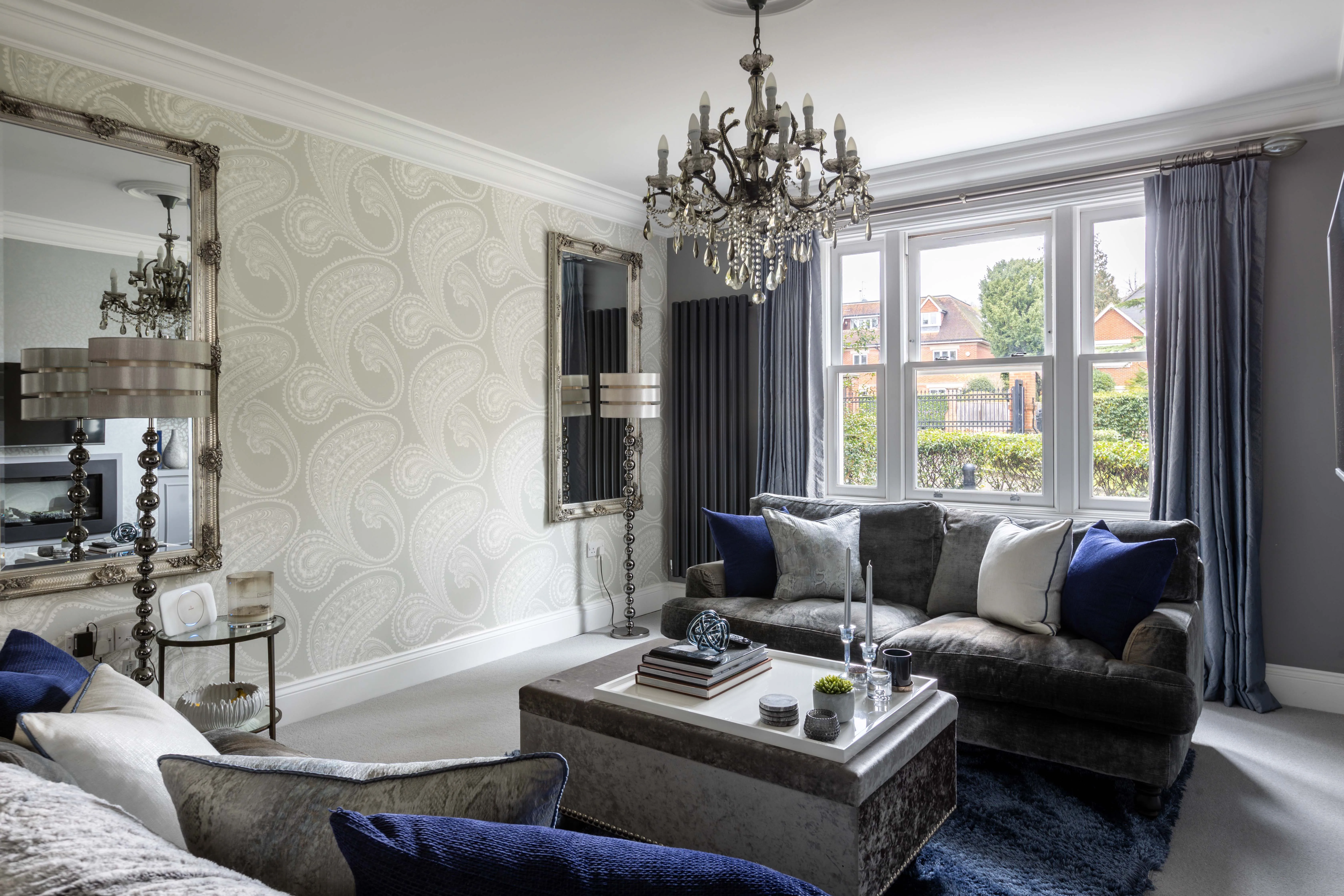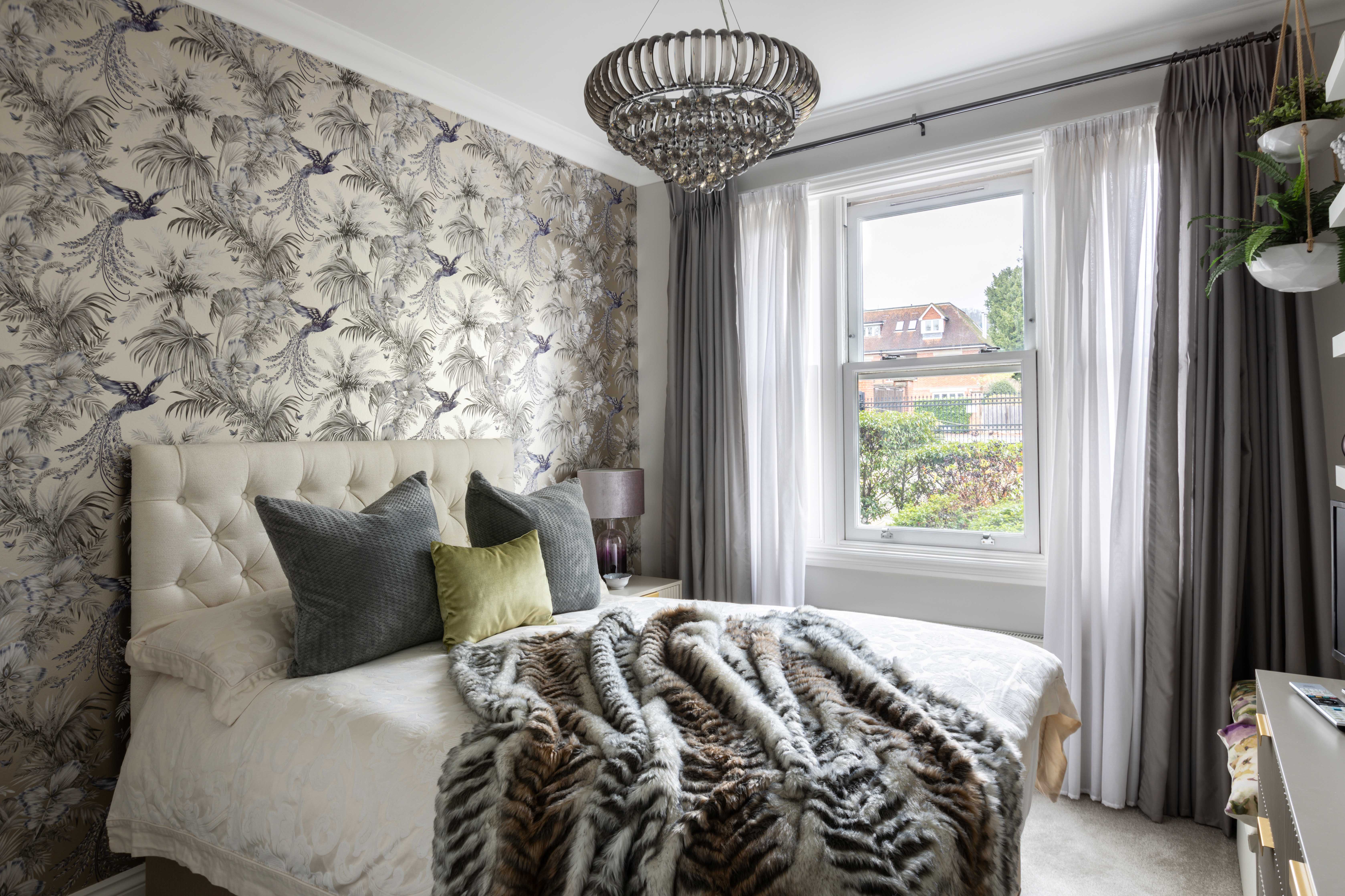The large reception room is a masterclass in design, featuring expertly placed patterned wallpaper, bespoke cabinetry, and open shelving. Stepping inside, the home immediately impresses with its tall ceilings, intricate ceiling rose, and decorative coving, all contributing to an elegant ambiance. Huge windows flood the space with natural light and provide leafy views, while a sleek electric fire and tall, contemporary radiator add both comfort and style.