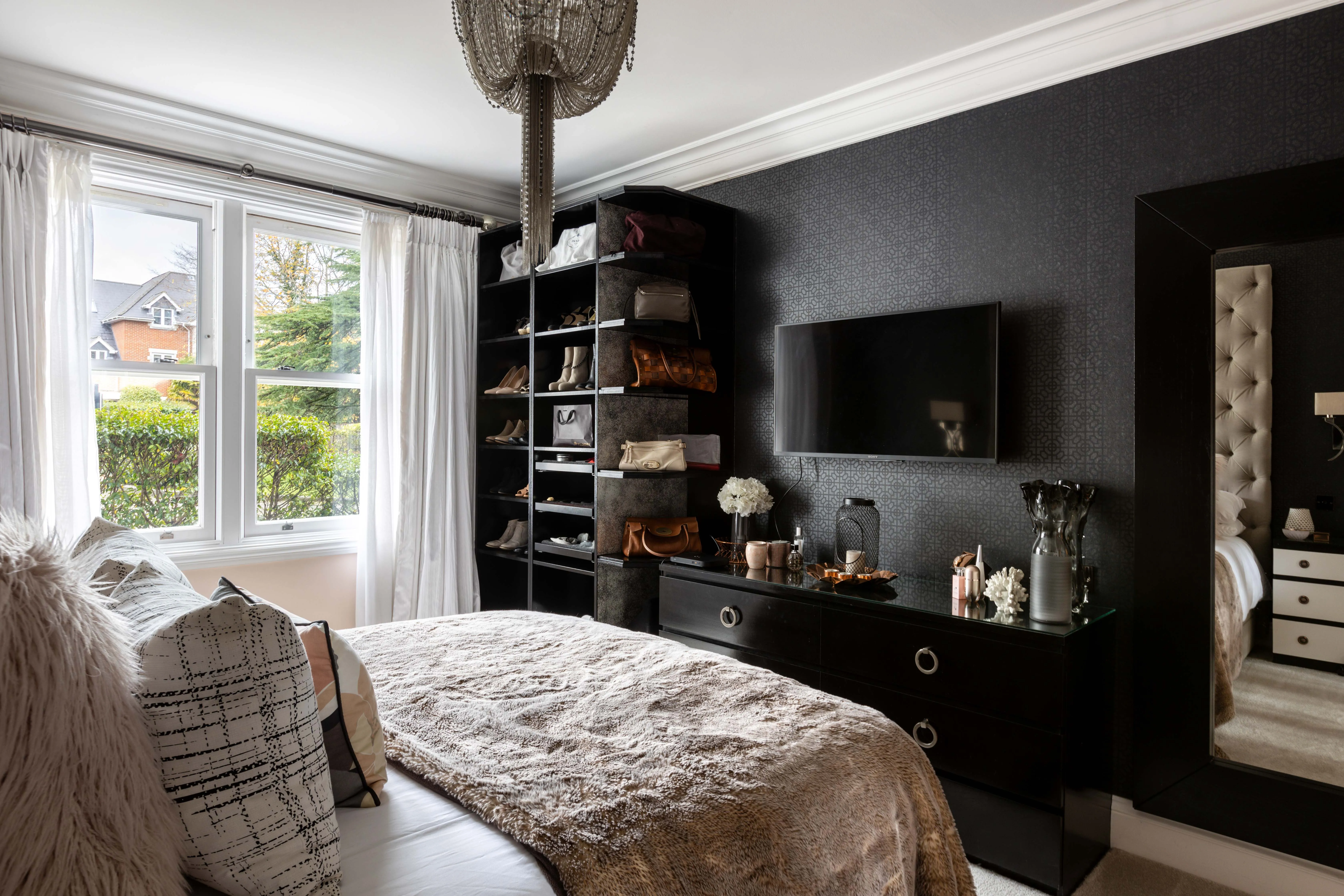 The principal bedroom is a luxurious retreat, complete with fitted wardrobes and a hotel-inspired en-suite bathroom. Designed with a moody sophistication, the en-suite features a large walk-in shower with stone-effect panels, a metro-tiled mirror, and sleek built-in cabinetry.