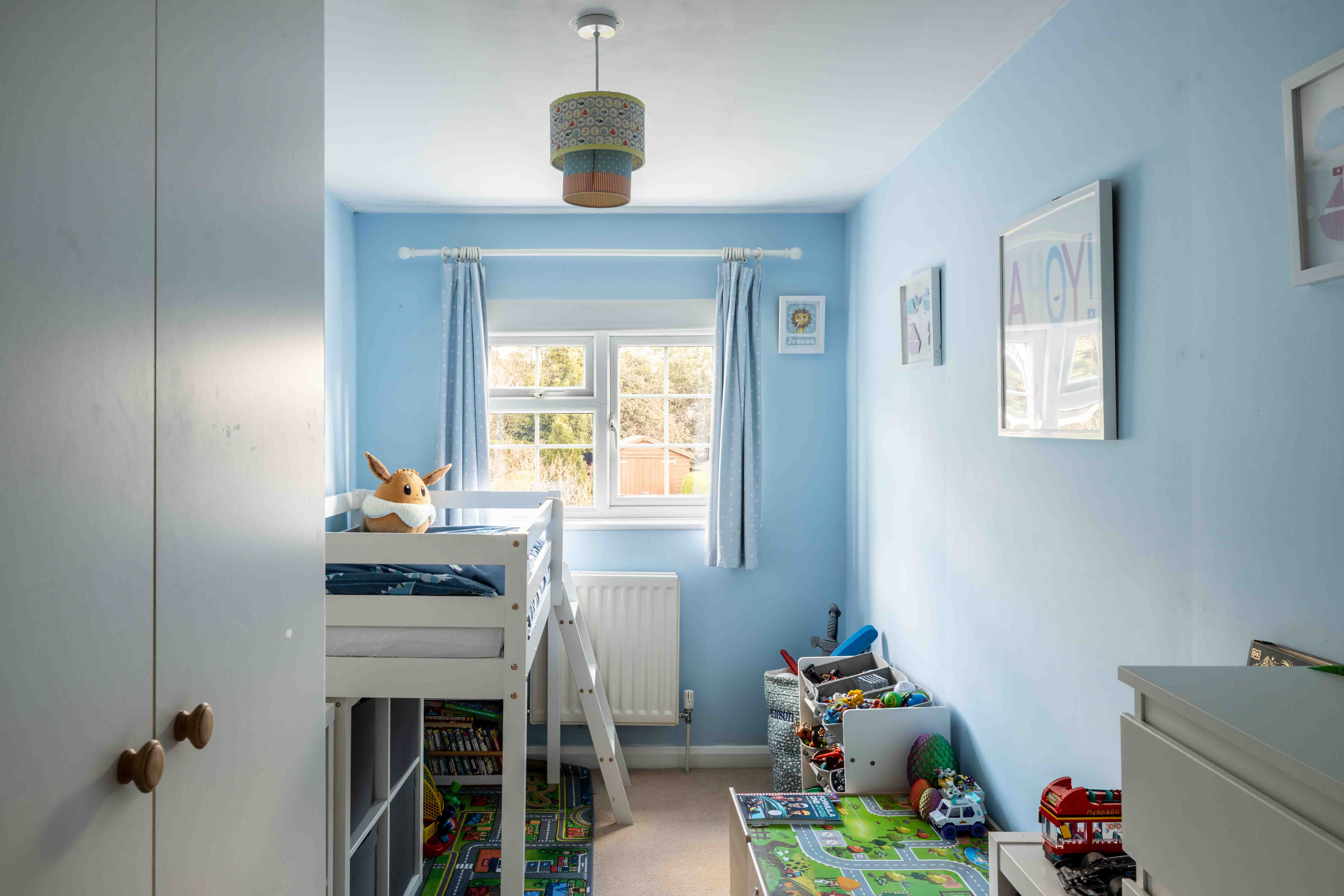 Upstairs, the bedrooms are restful retreats, painted in soft tones that invite rest and restoration. The principal bedroom is spacious and serene, while the second bedroom is equally well-proportioned, ideal for guests, children, or a home office. The contemporary bathroom continues the home’s refined aesthetic, beautifully appointed with a separate shower to complement the bathtub — a space that feels quietly indulgent. Rising above, the loft room provides a versatile space, currently used as a bedroom, but equally suitable as a creative studio, reading nook, or peaceful home office.