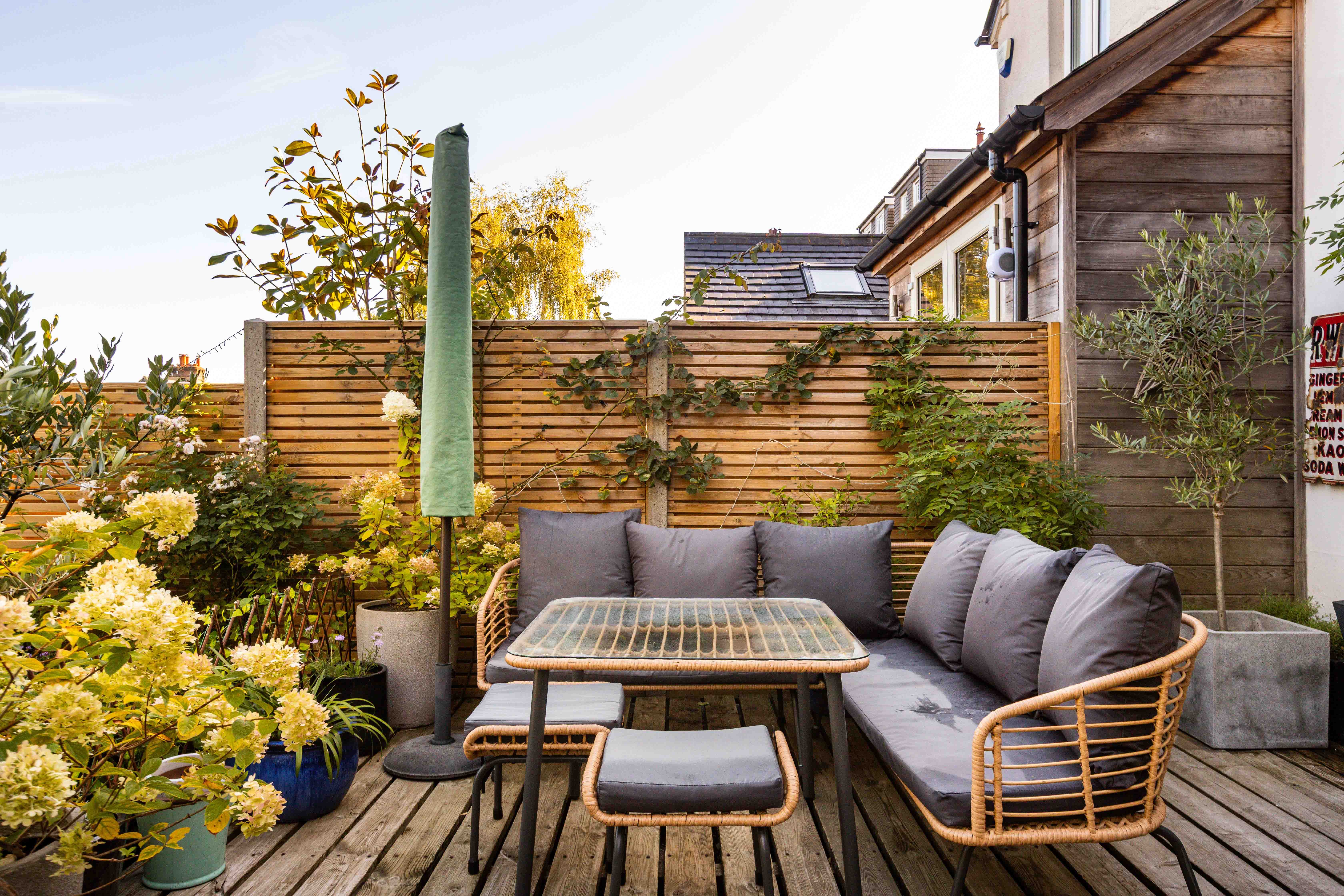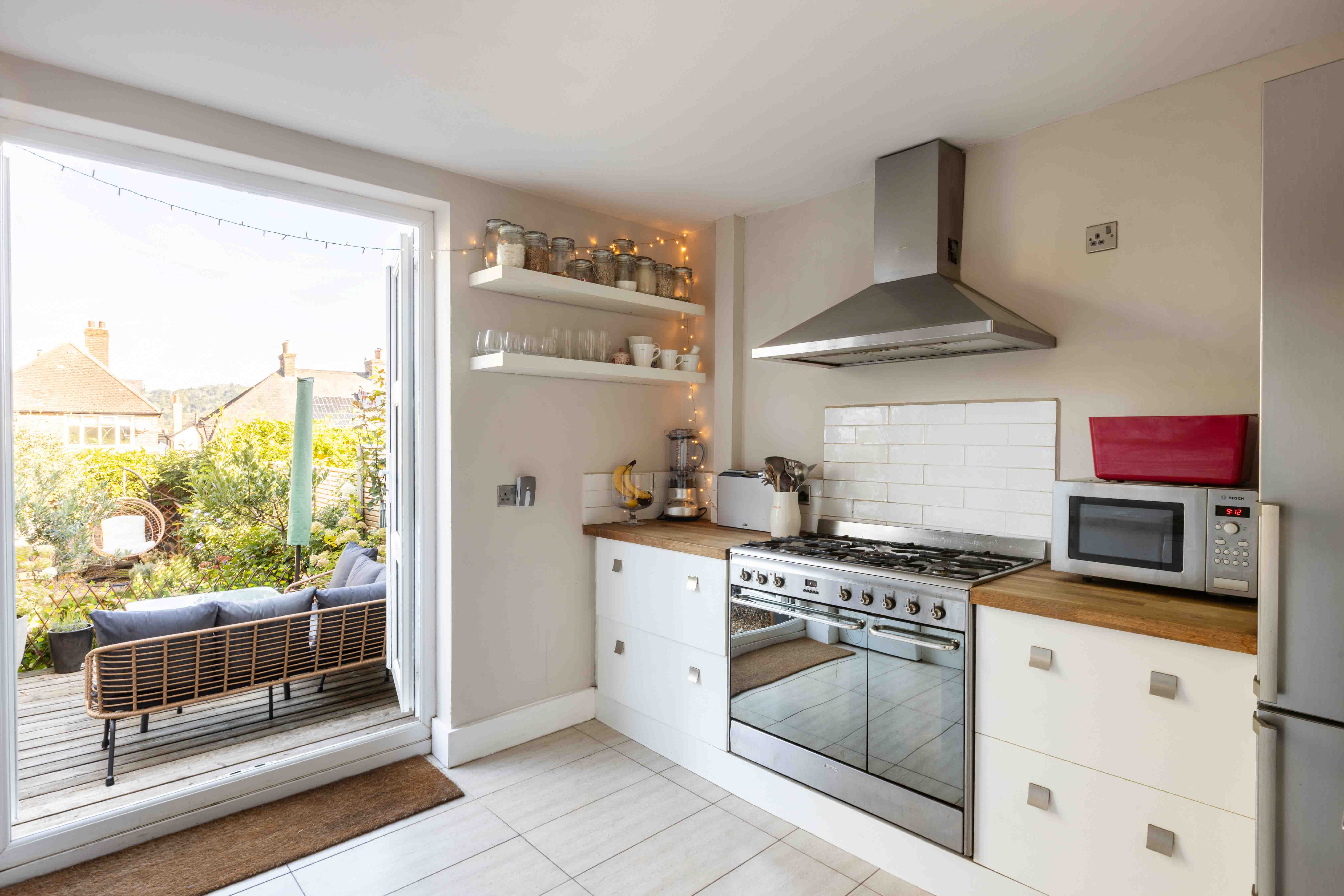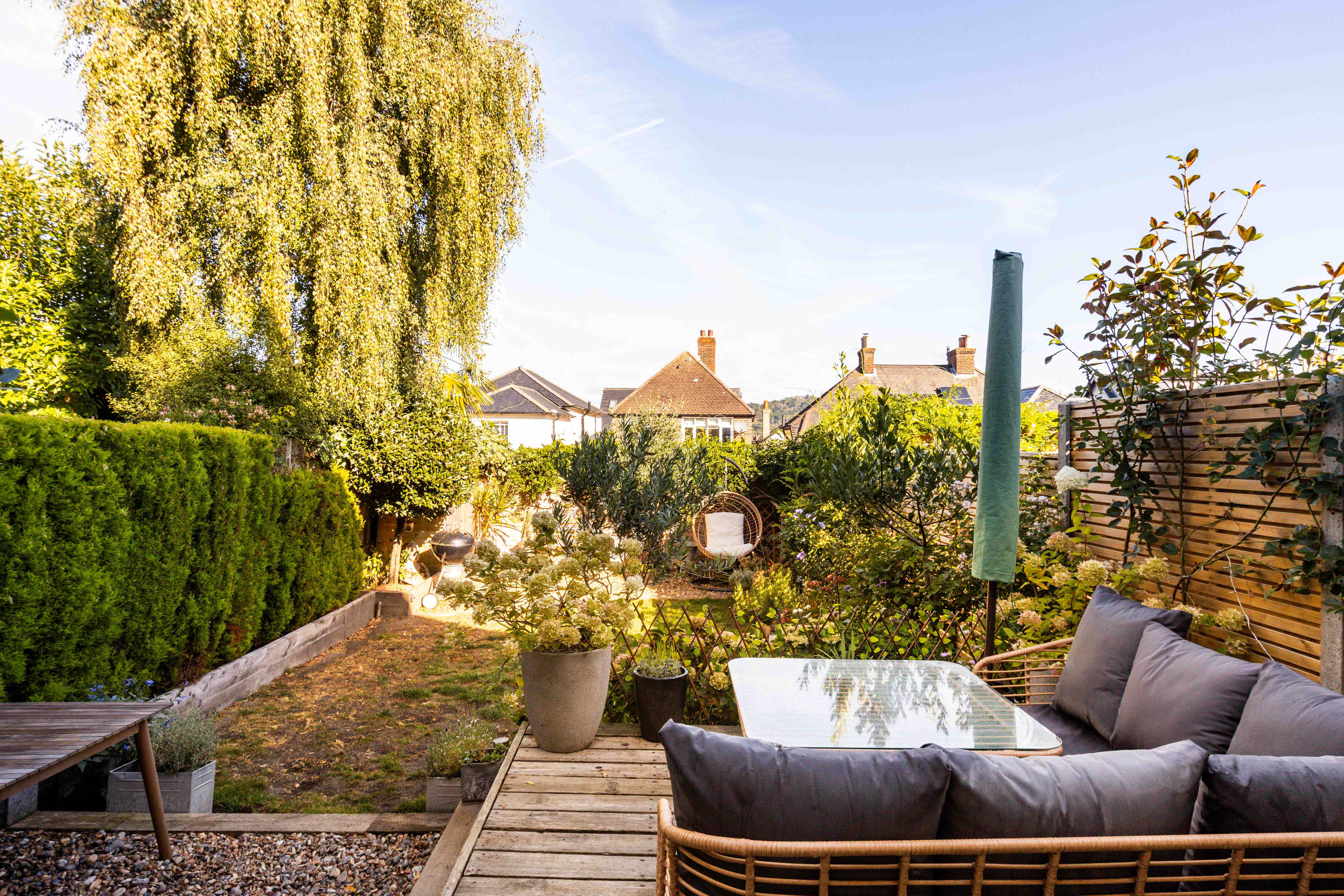 At the rear, the kitchen reveals a striking scandi-inspired scheme, where sleek cabinetry, oak worktops and handcrafted zellige tiles play against garden views and access to a raised deck for al fresco suppers. The private garden extends like an outdoor room, designed with both family life and entertaining in mind. A modern cladded fence and traditional walled boundary create a sense of enclosure, softened by mature planting. The raised deck invites late summer evenings of barbecues and friends, while the lawn lends itself to play and leisure.