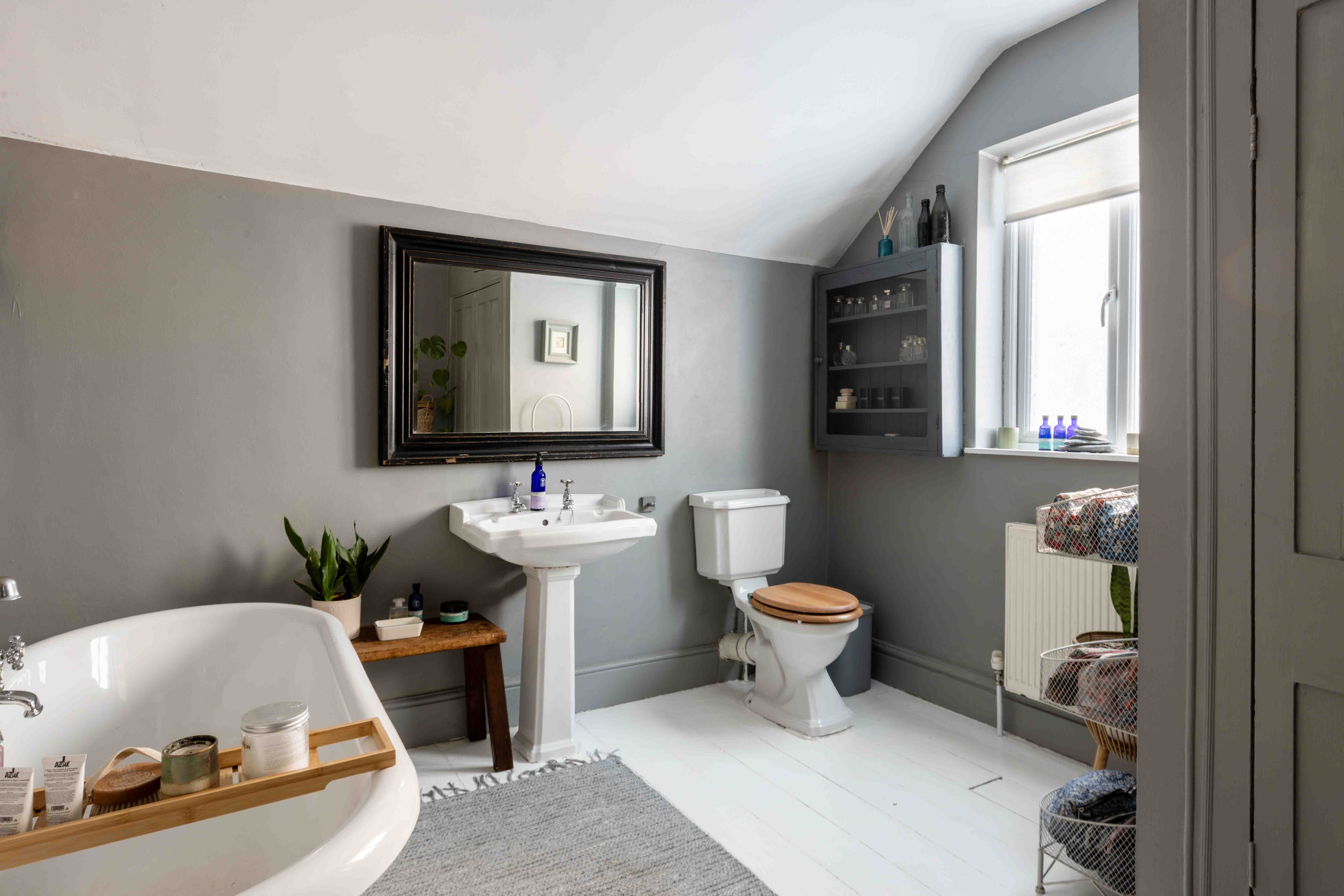 Upstairs, the sense of calm continues, with three double bedrooms. On the first floor, two retain their original Victorian fireplaces, while the bathroom has been elevated into a retreat, its claw-foot bathtub, painted wood floor and chrome fittings offering a touch of spa-like indulgence. The loft conversion delivers a generous third double bedroom, complete with picture window framing far-reaching views across Reigate Hill, alongside extensive eaves storage.