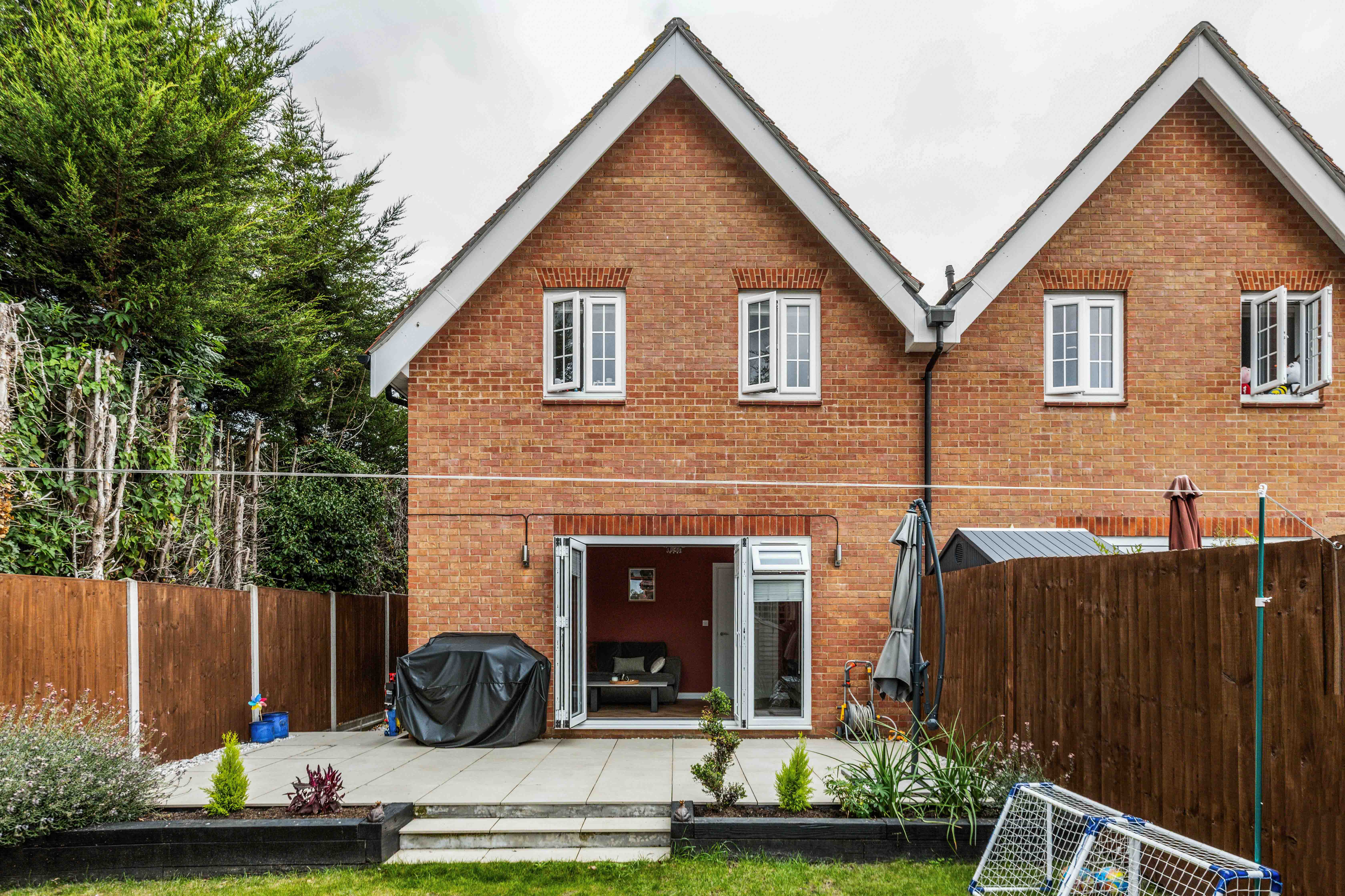 The rear garden has been thoughtfully landscaped, with a porcelain terrace providing the ideal spot for barbecues and entertaining. With its edge-of-development setting, the garden enjoys open views towards fields, enhancing its sense of space and privacy. Side access and a useful shed add convenience.