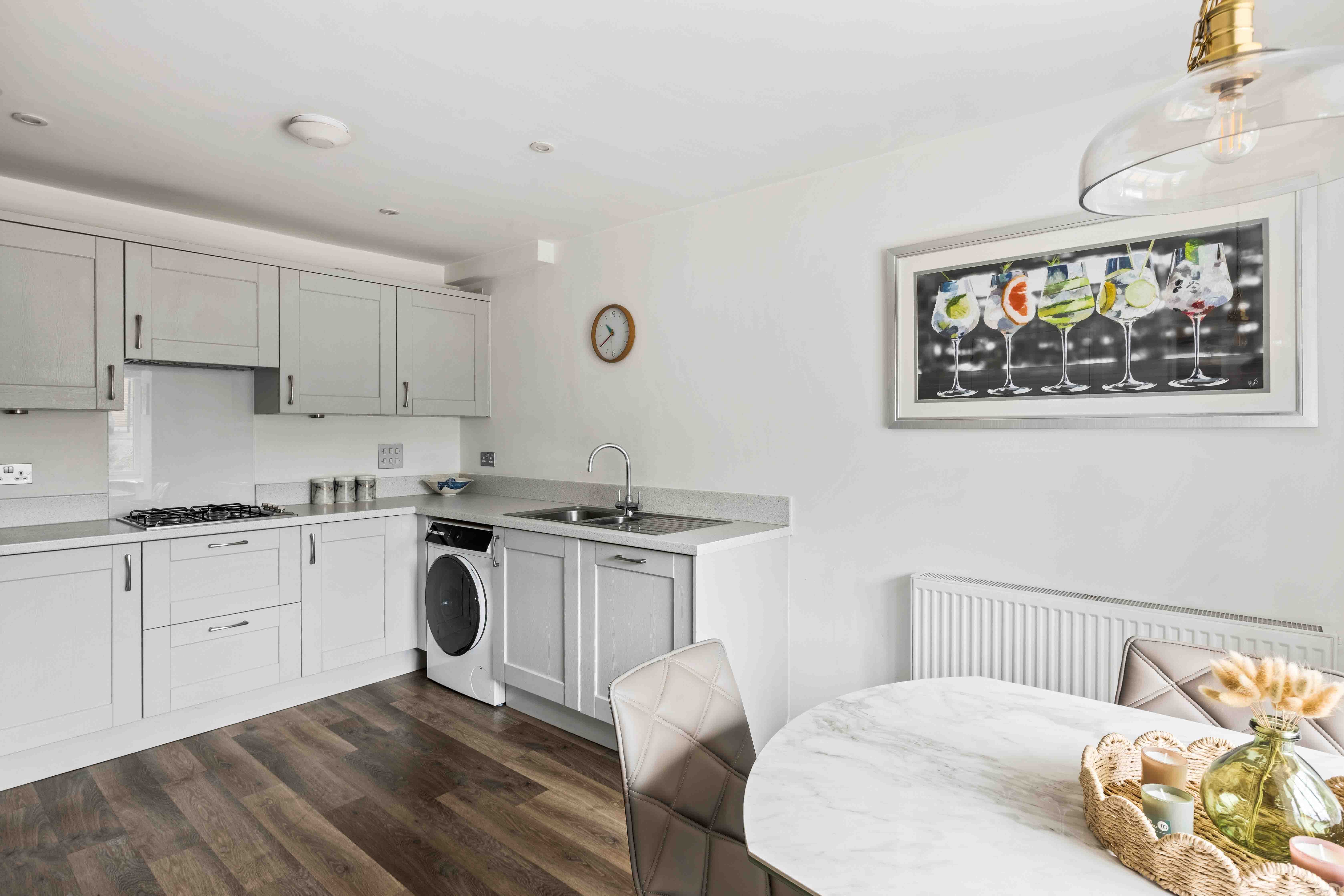 The entrance hall makes a welcoming first impression, with plenty of space for coats and shoes. To the front, the kitchen/dining room is bright and practical, featuring shaker-style cabinetry, sleek white worktops, and integrated appliances for a streamlined finish. A bay window floods the room with light, making it a perfect space to gather around the table.