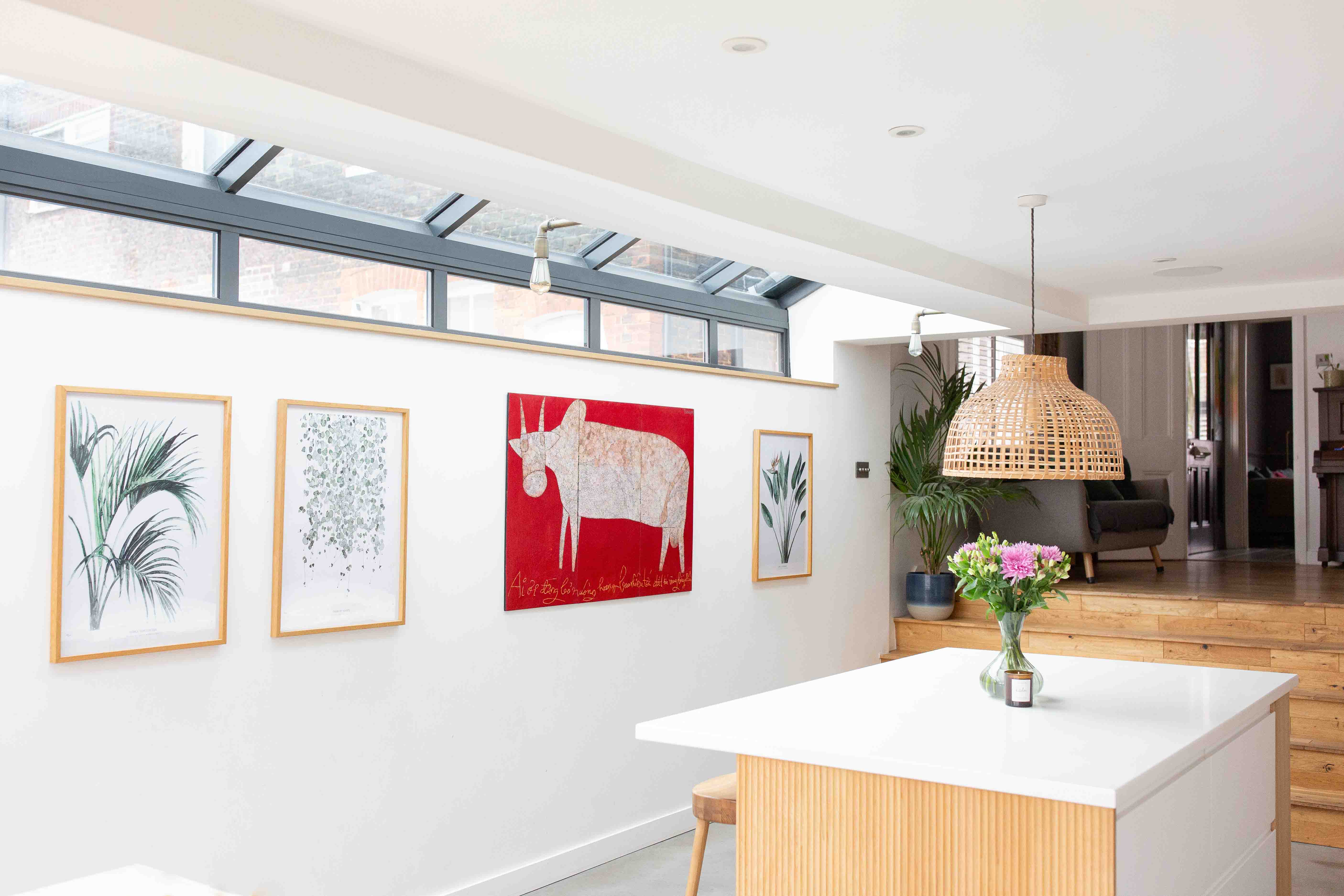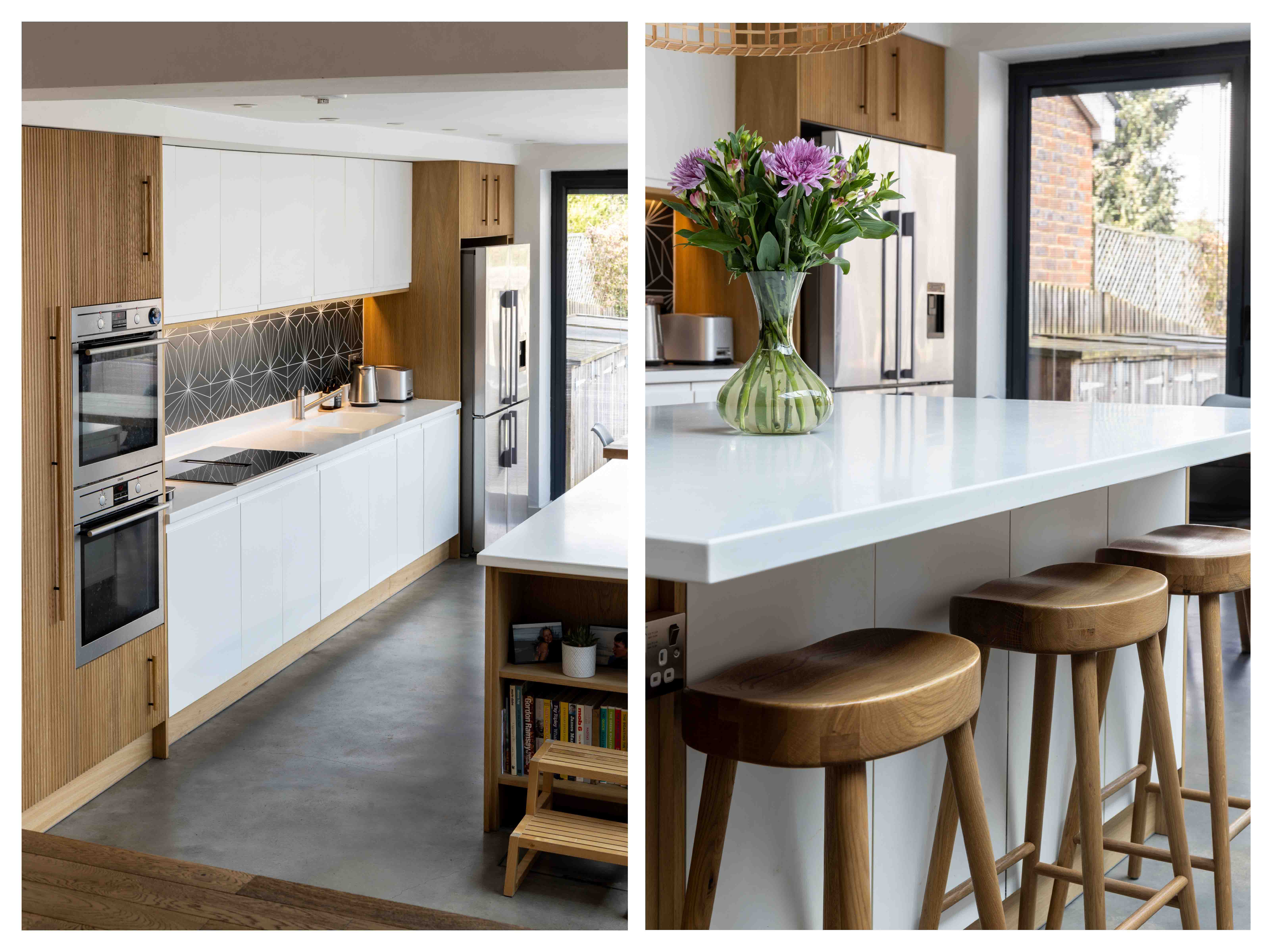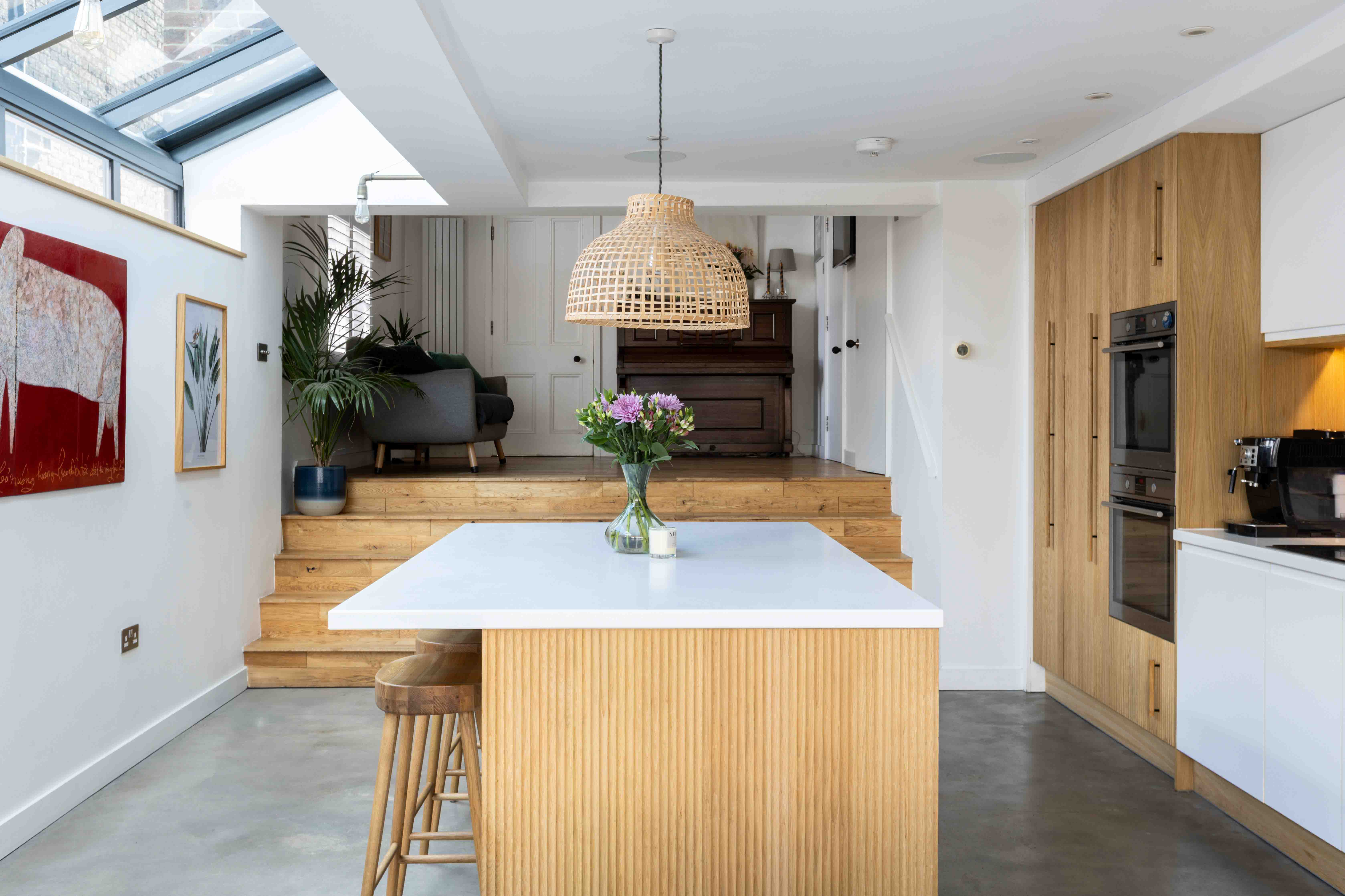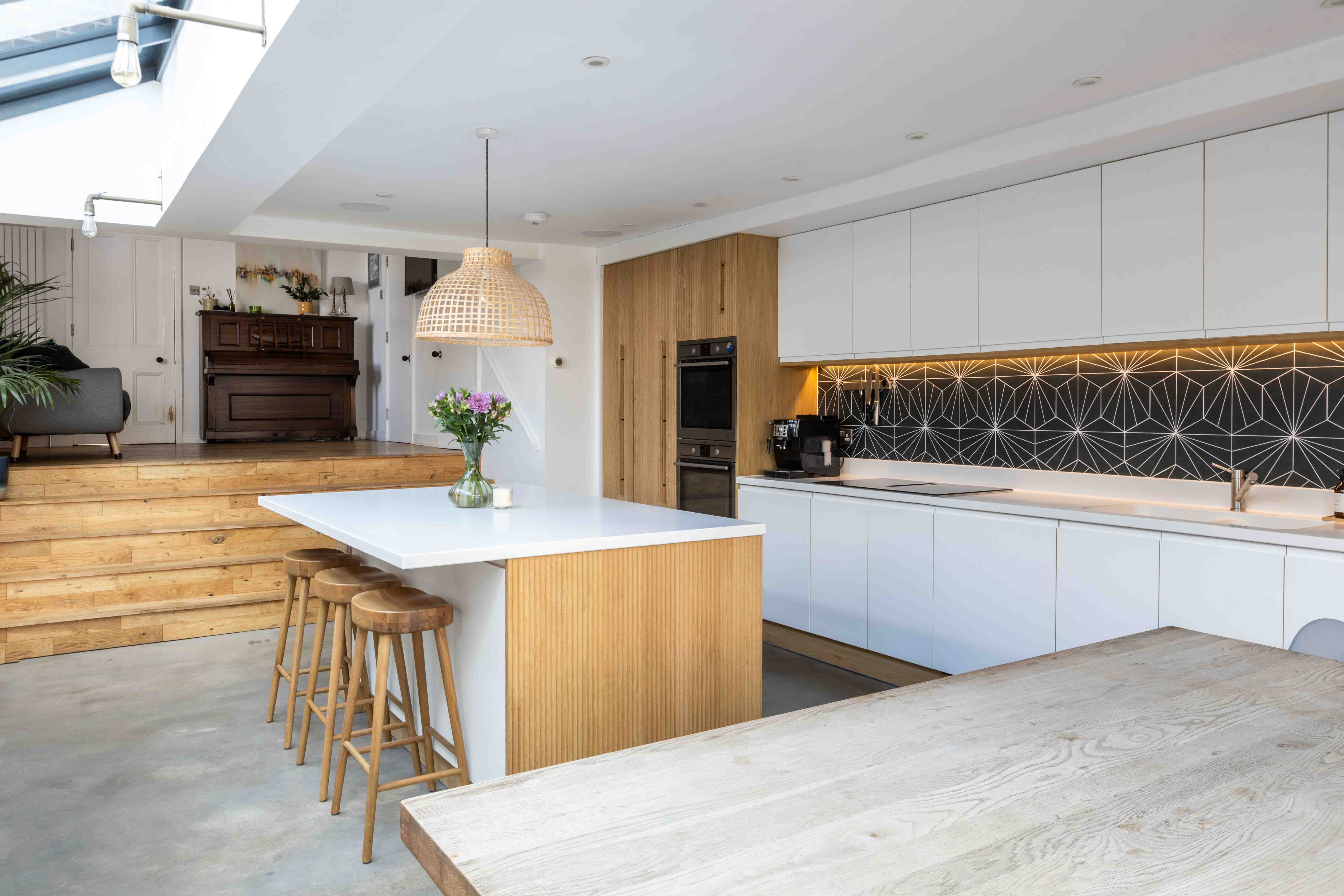 The rear of the property has been masterfully extended to create a striking kitchen and living space that celebrates modern design while maintaining a connection to the home’s heritage. The kitchen is a vision of symmetry, with oak and white gloss units, chrome hardware, and a striking monochrome hexagonal tile. A central island, complete with breakfast bar, reeded panelling, and bookshelves, serves as both a practical and social focal point.