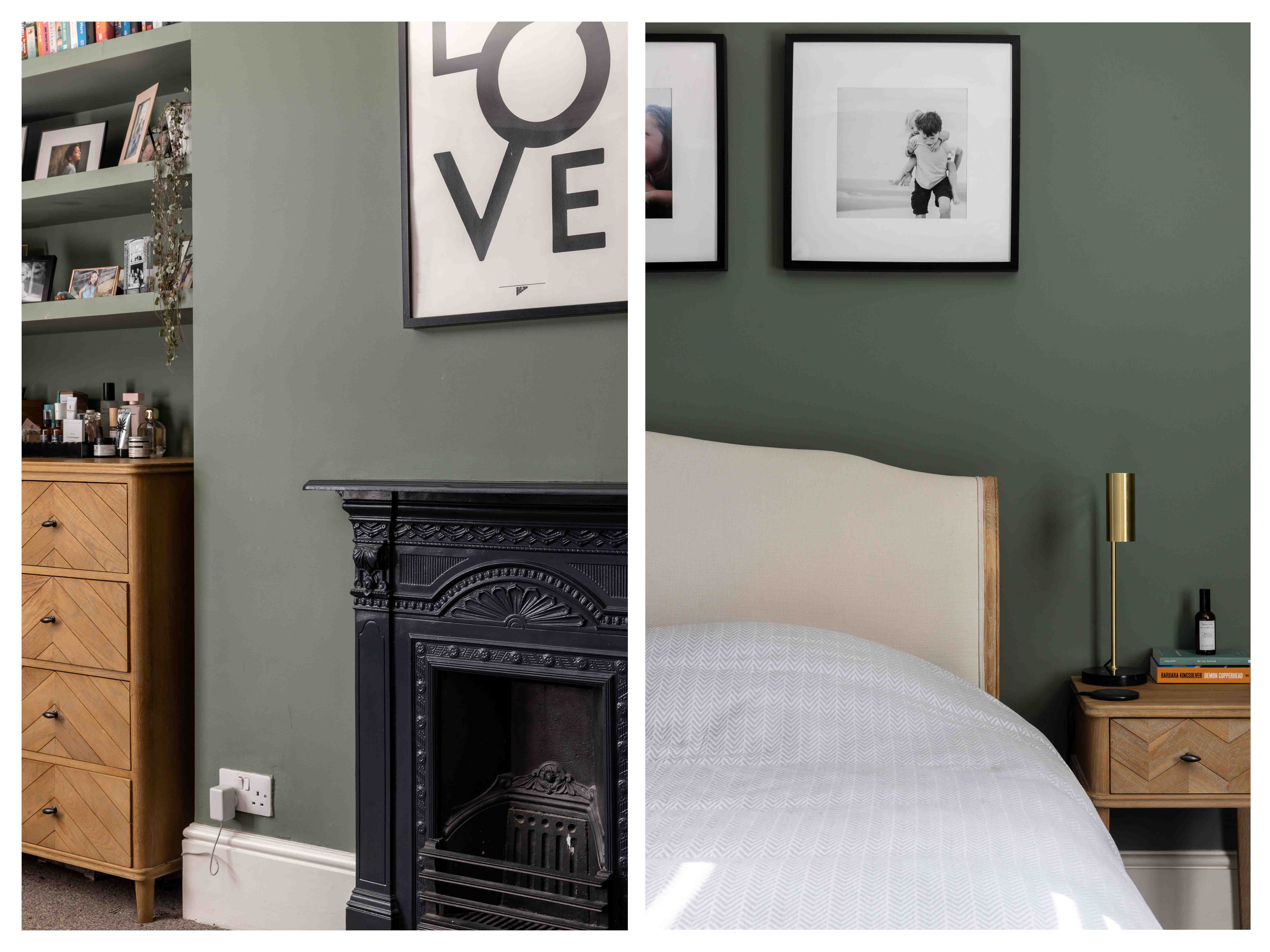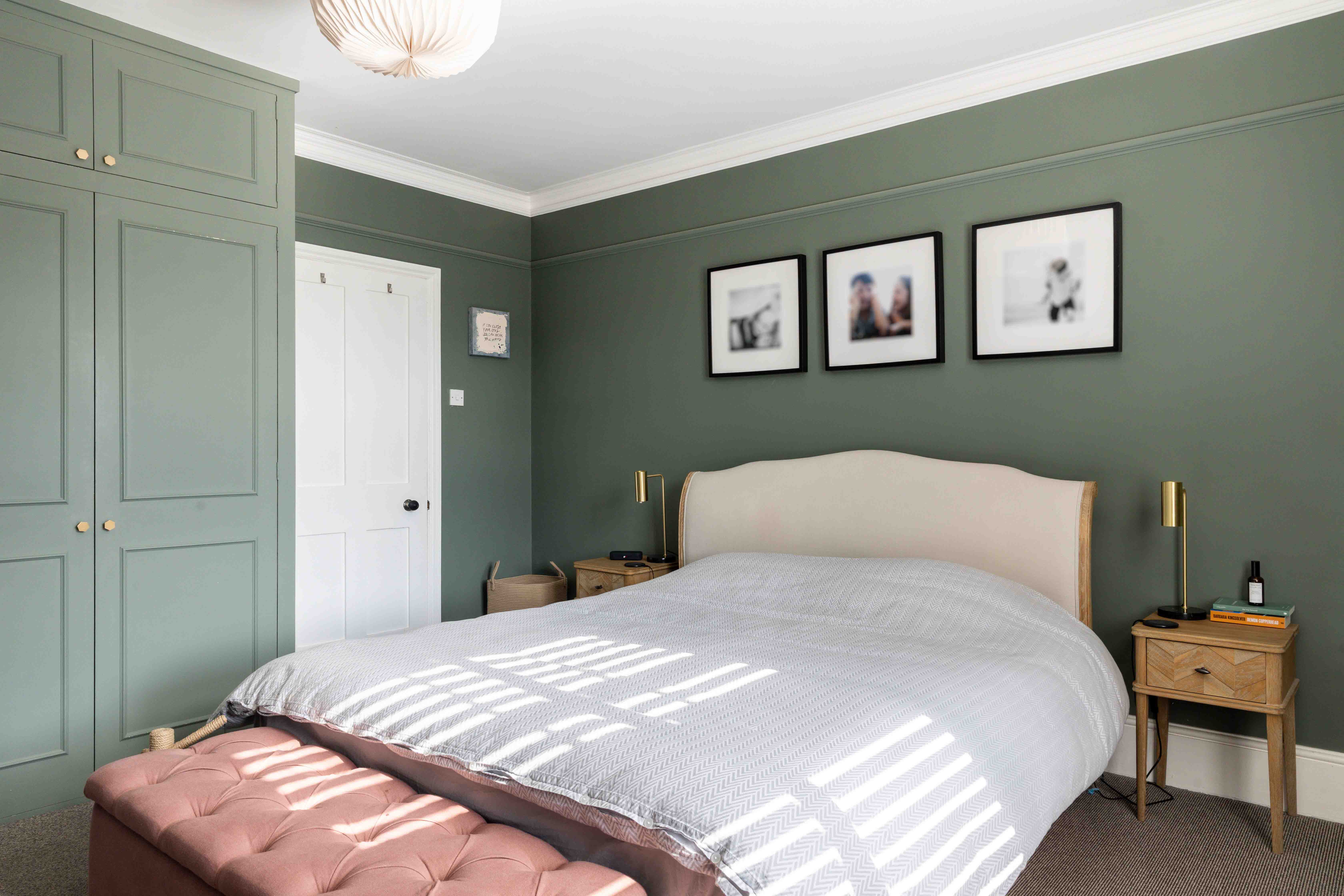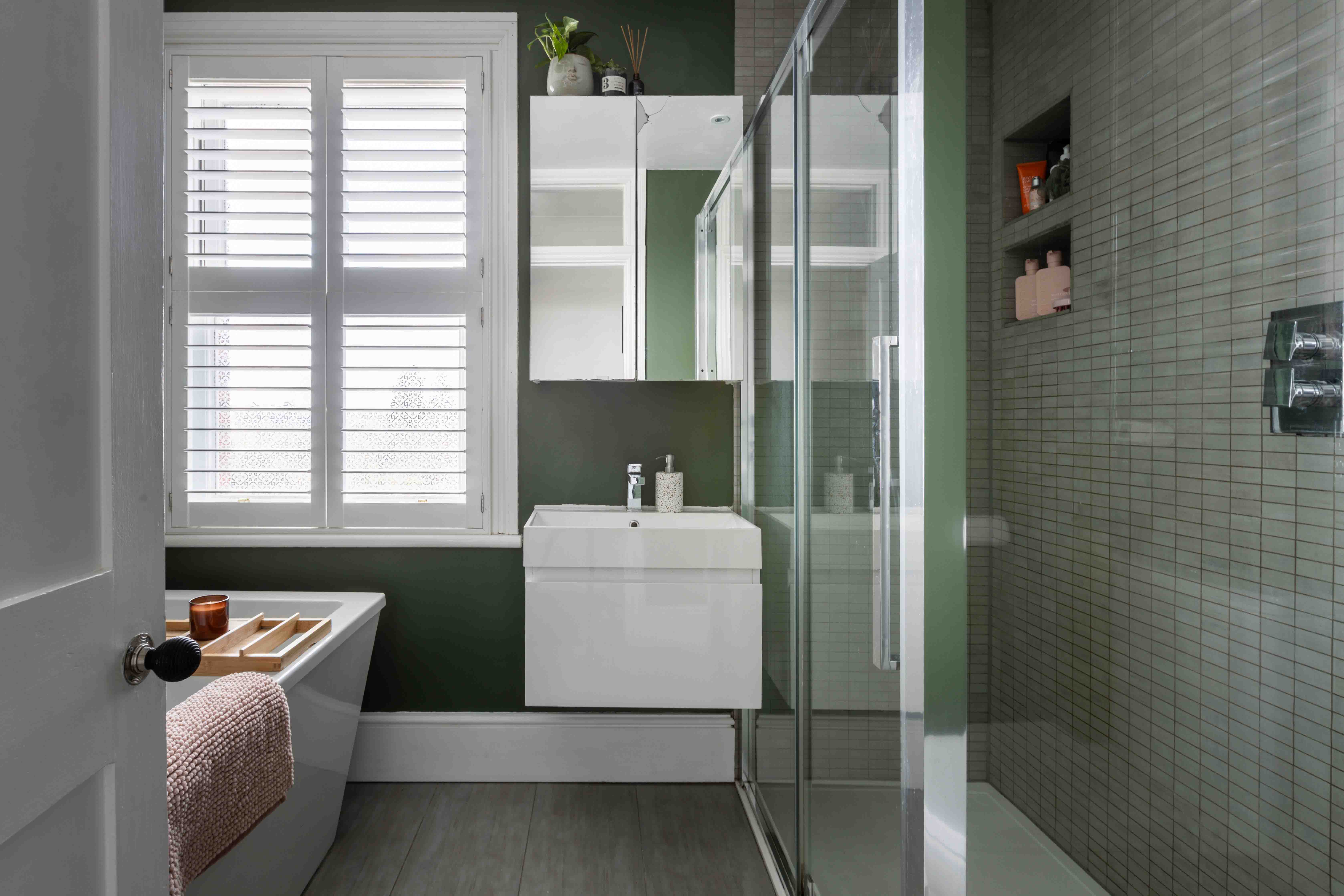The central staircase winds upwards through the home, carrying the sense of elegance to the first floor. Here, three double bedrooms benefit from tall ceilings and retained character features. The principal bedroom at the front is a generous and serene retreat, complete with built-in wardrobes and an ornate Victorian fireplace. The family bathroom is a stylish sanctuary, with a bath, walk-in shower, distinctive tiling, and rich green tones that add depth and warmth.