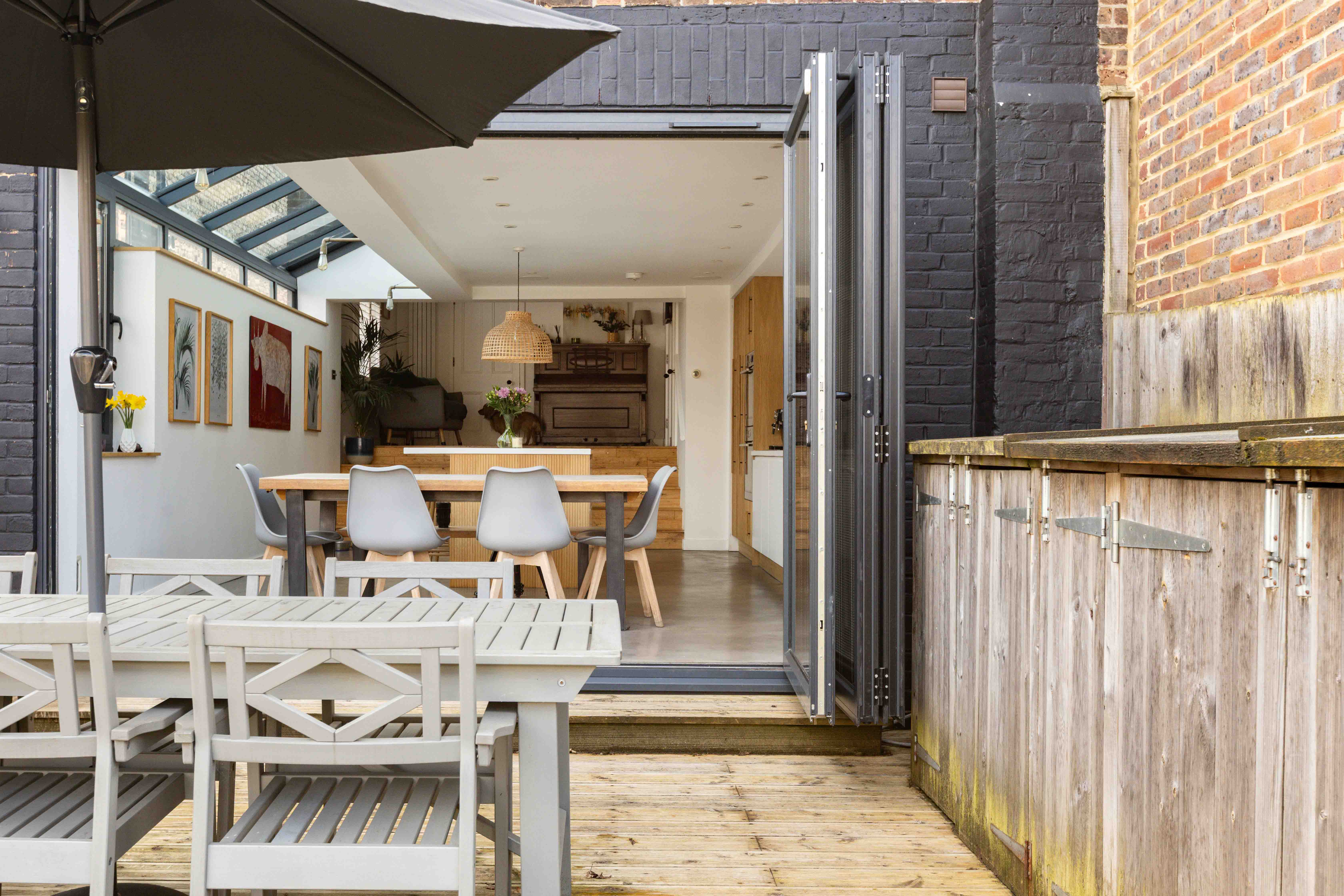 Underfoot, polished concrete floors reflect the abundant natural light streaming in from the skylights, framed in sleek black to complement the black-framed multi-light bifold doors. These doors dissolve the boundary between inside and out, leading onto a raised decking area that seamlessly extends the living space into the beautifully landscaped garden. A contemporary garden room, currently serving as a gym and office, offers versatile additional living space alongside a separate store.