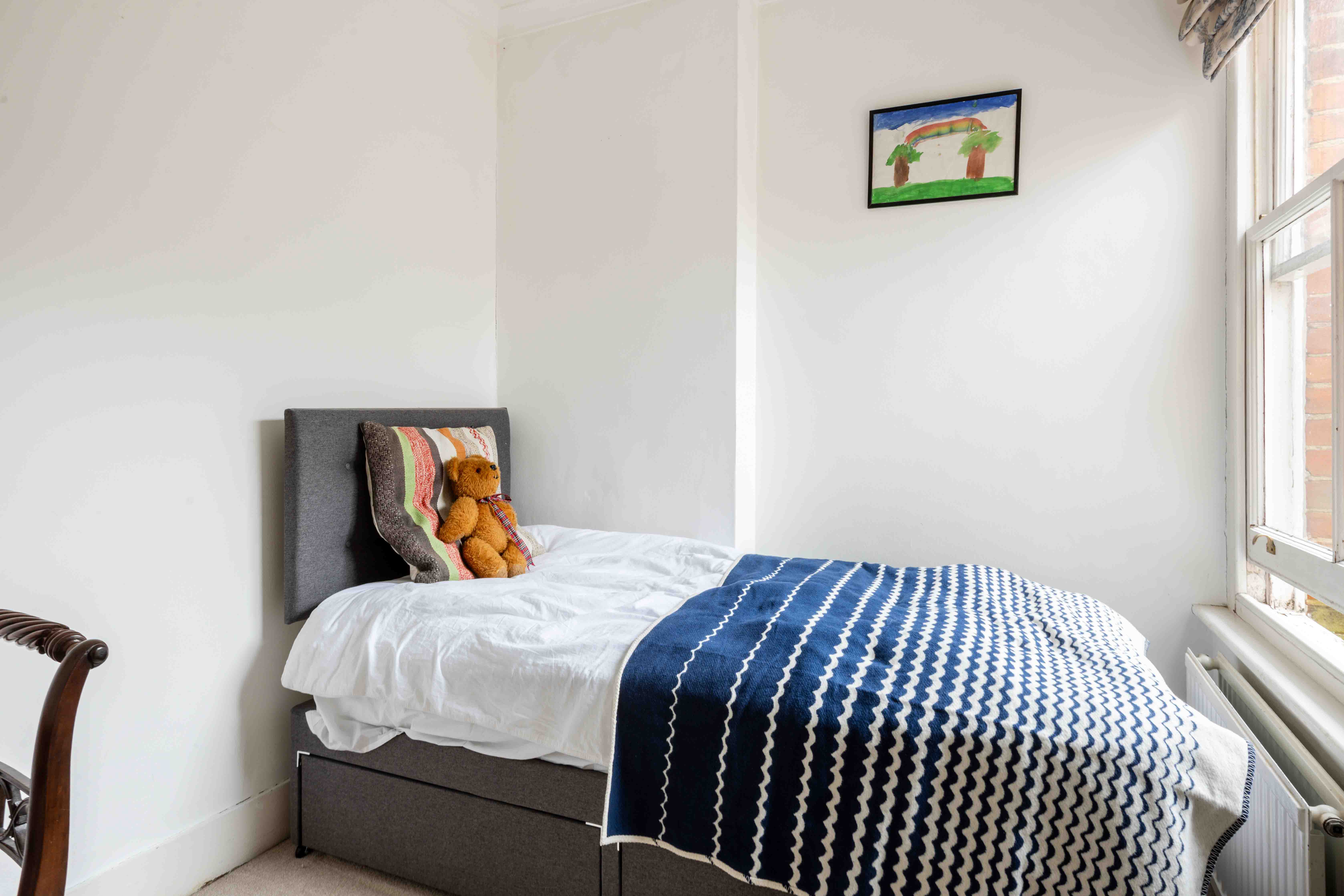 Upstairs, three well-proportioned bedrooms showcase the home’s period charm, with sash windows ensuring each room is bathed in natural light. The master bedroom boasts a stunning original Victorian tiled fireplace, while the rear double bedroom features an ornate carved painted fireplace and garden views. A modern family bathroom serves the first floor.