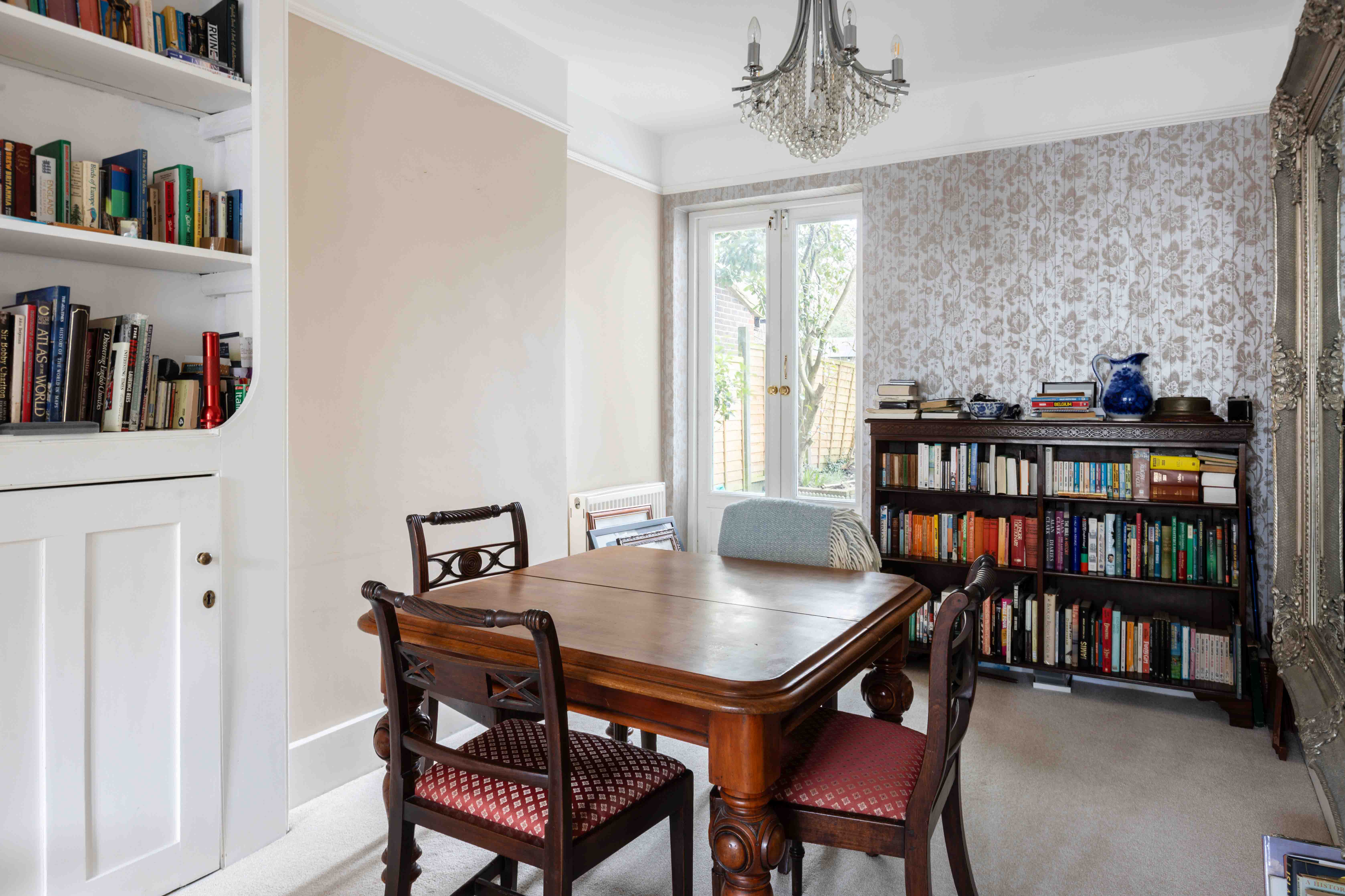 A traditional black fireplace with a carved mantel provides a striking centrepiece, offering an inviting space to relax. The adjoining dining area, complete with beautifully crafted built-in cabinetry, seamlessly connects to the garden through double doors, making it perfect for entertaining.