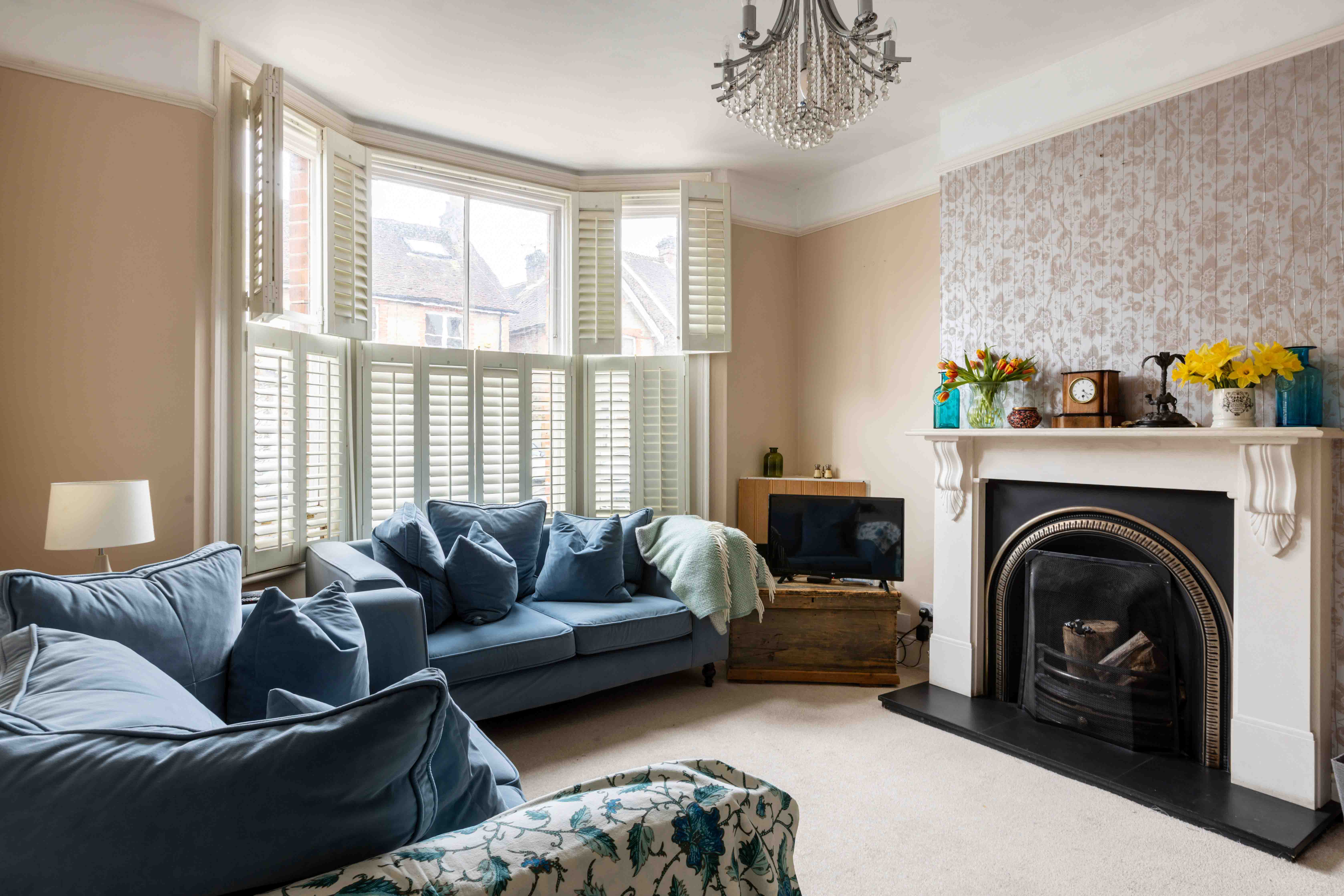 Enter through the elegant front door into a traditional entrance hall, where ornate spindled stairs rise beneath soaring ceilings. The sense of refinement continues into the spacious dual-aspect reception room, where a generous bay window, adorned with bespoke shutters, invites in natural light.
