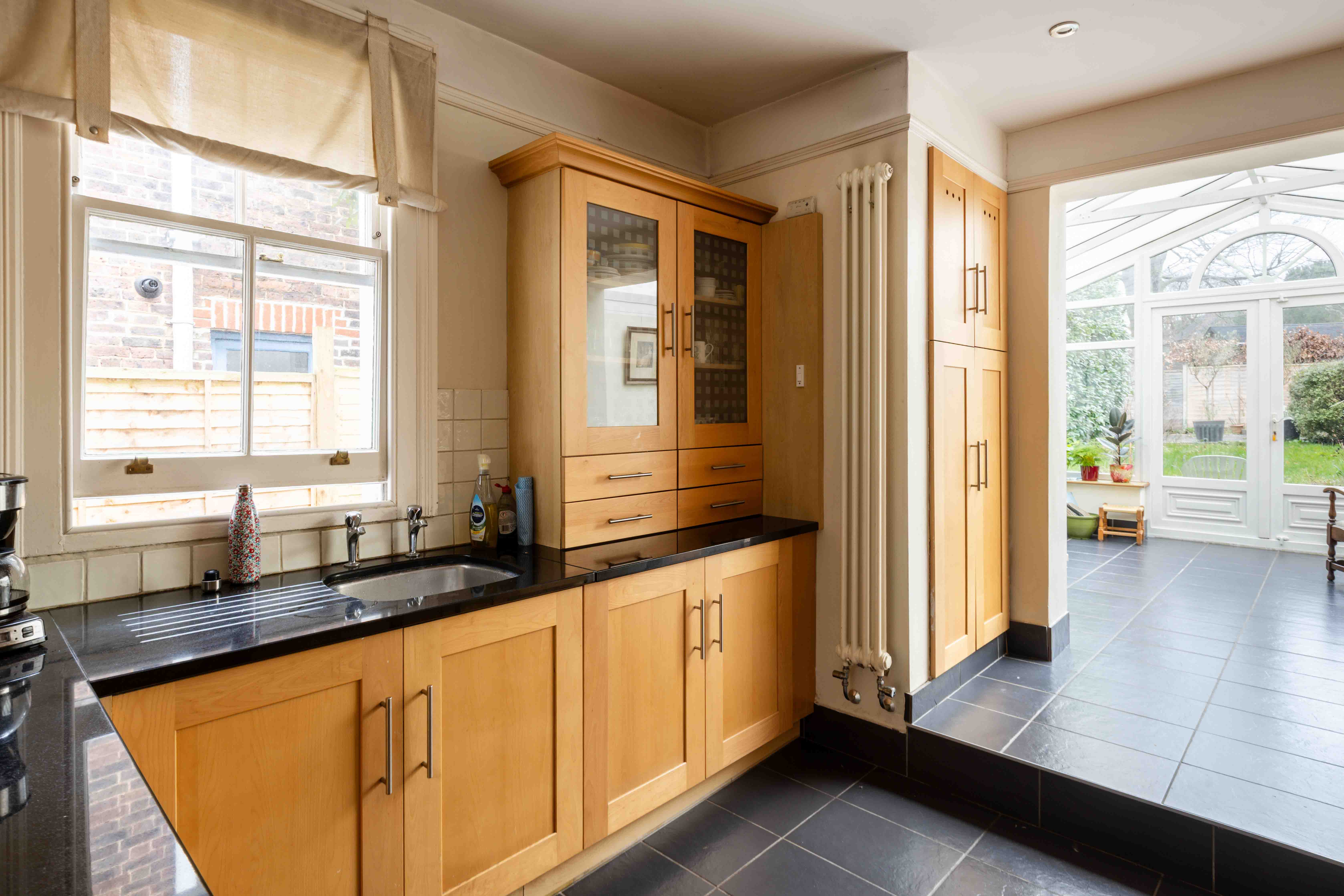 The spacious kitchen is both functional and stylish, featuring integrated appliances and ample workspace. Beyond, a charming conservatory welcomes morning light over the breakfast table, with views extending to the private, mature garden - a true oasis of greenery. A convenient downstairs WC completes the ground floor.