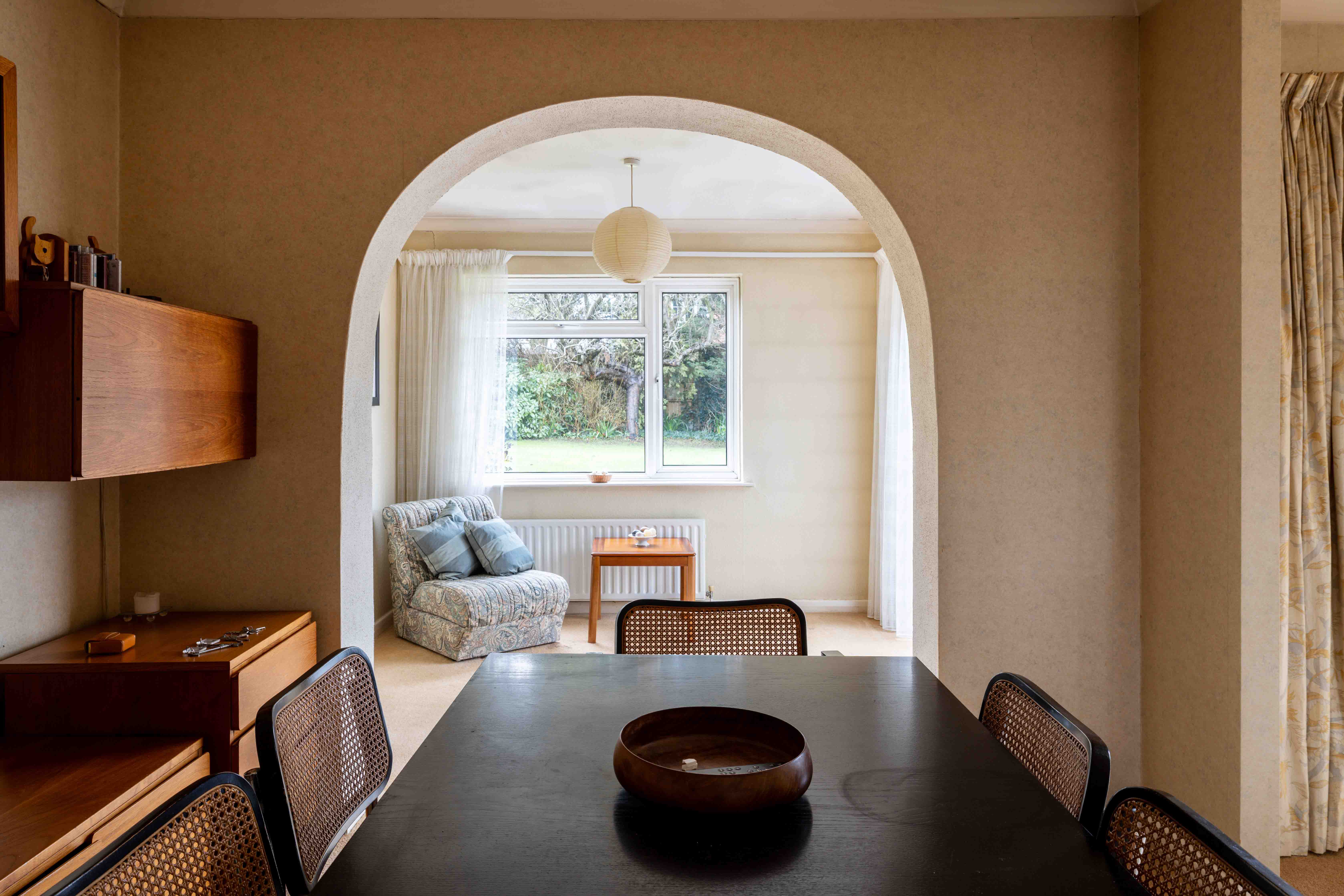 The arrival is understated and welcoming. Step into the entrance hall and the house immediately reveals its calm, balanced layout, with rooms unfolding logically and generously. The lounge–diner is the heart of the home: a bright, airy space that lends itself as easily to quiet afternoons as to convivial evenings. Large windows draw the eye outward, framing the landscaped garden beyond and allowing natural light to flood the room throughout the day. It is easy to imagine this space styled with layered textures, linen sofas and soft lighting, evolving effortlessly with the seasons. The adjoining kitchen sits conveniently alongside, functional and neutral in tone, offering a blank canvas for those keen to introduce contemporary cabinetry, statement lighting or a more open, sociable feel.