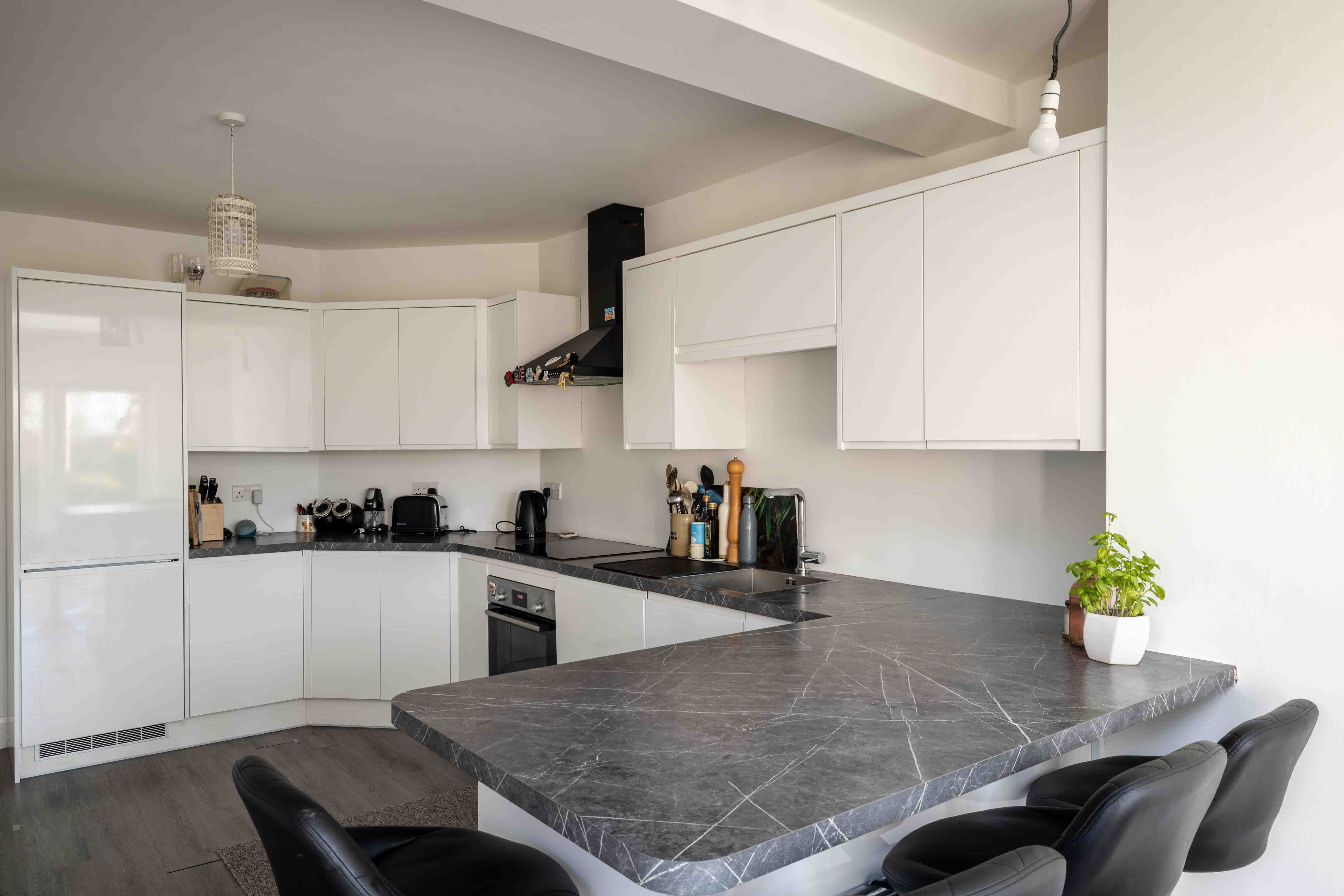 To the rear, the kitchen and dining room strikes a contemporary note — thoughtfully designed with a breakfast bar that gently zones the space, creating a natural hub for conversation, coffee, and casual meals. The ground floor is completed by a practical utility room and downstairs WC, ensuring the home works as beautifully as it feels. Double doors open out onto a raised decking area — a true sun trap and an extension of the living space during warmer months. Here, long lunches linger into the evening, barbecues spill effortlessly into the garden, and the generous plot unfolds beyond, leading to a charming summer house at the rear.