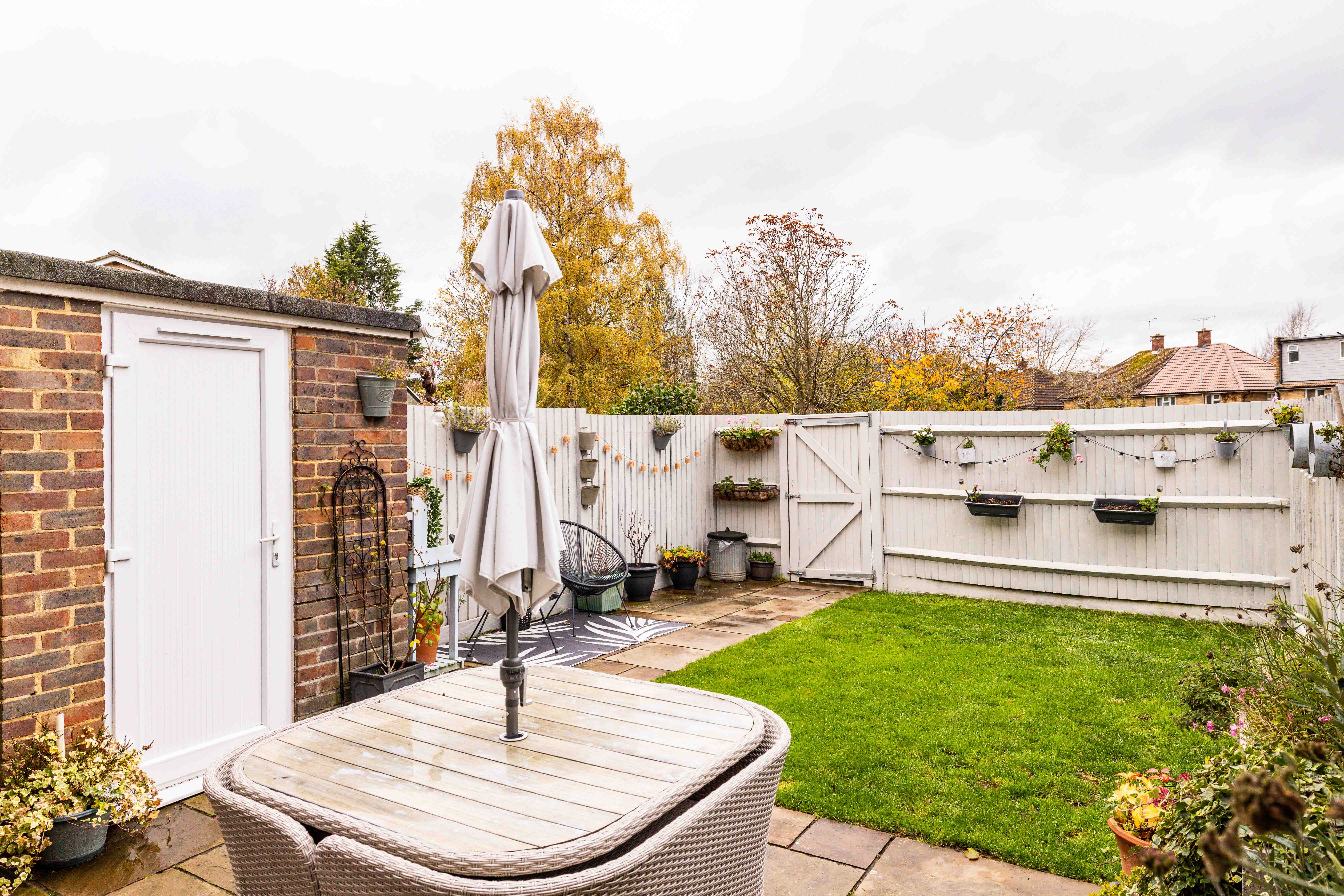 Upstairs, there are three well-proportioned bedrooms, with the principal bedroom featuring fitted wardrobes. The family bathroom is finished in a modern style, complete with a shower bath (with separate wall controls), WC and wash hand basin. The garden feels like an inviting extension of the living space, with a sun terrace leading to a neat lawn, a brick store and gated rear access. The property also benefits from double glazing, gas central heating and a garage en bloc.