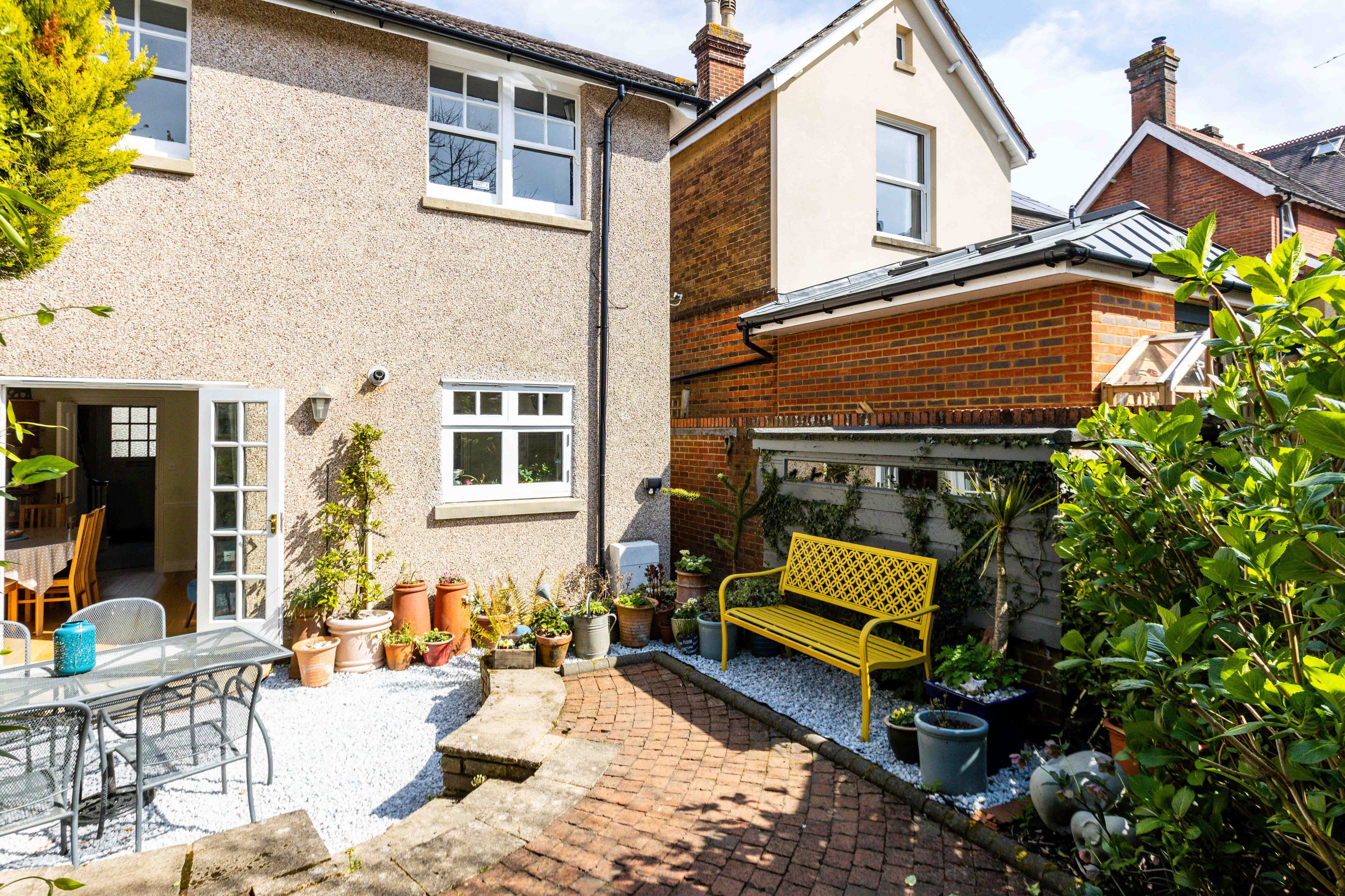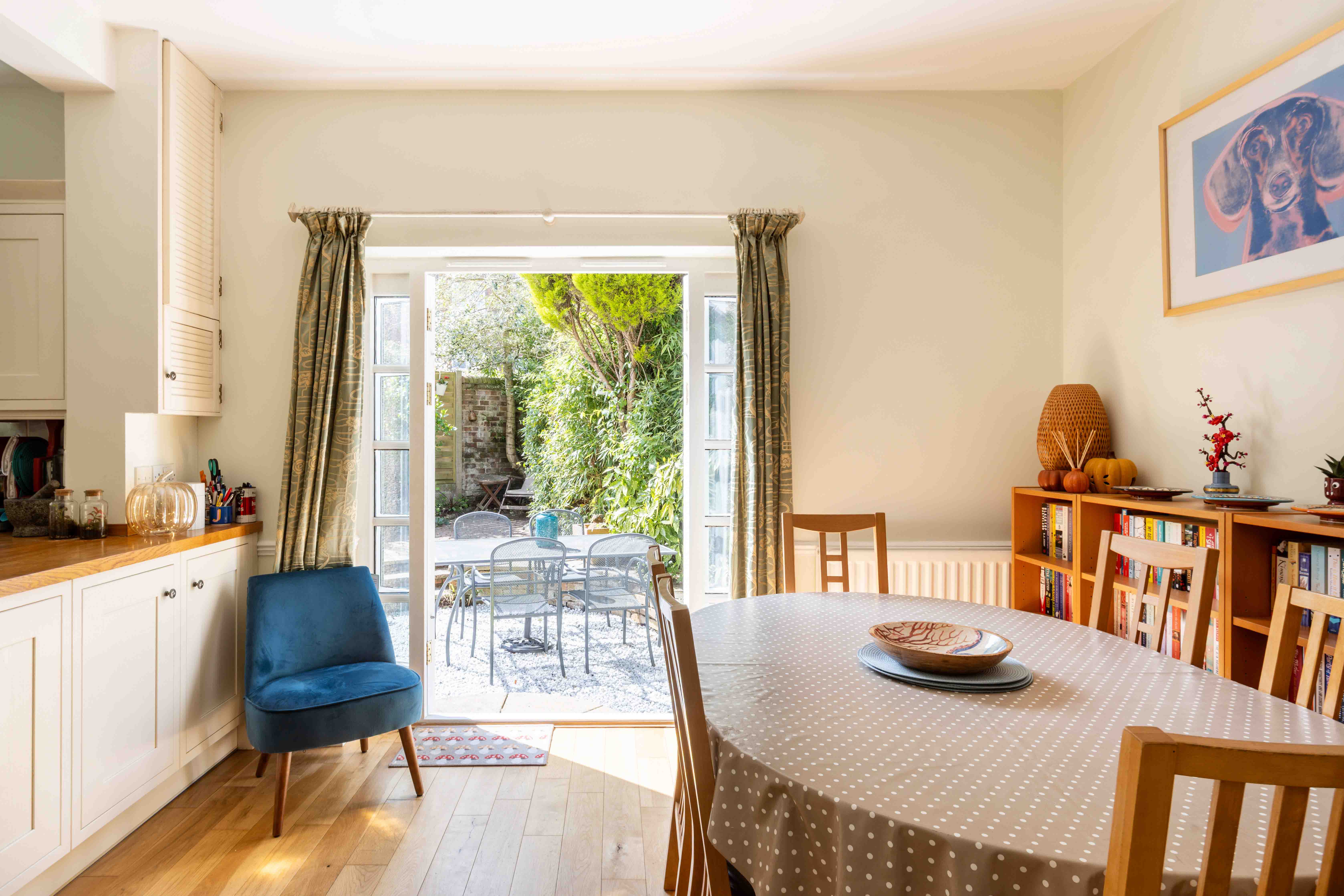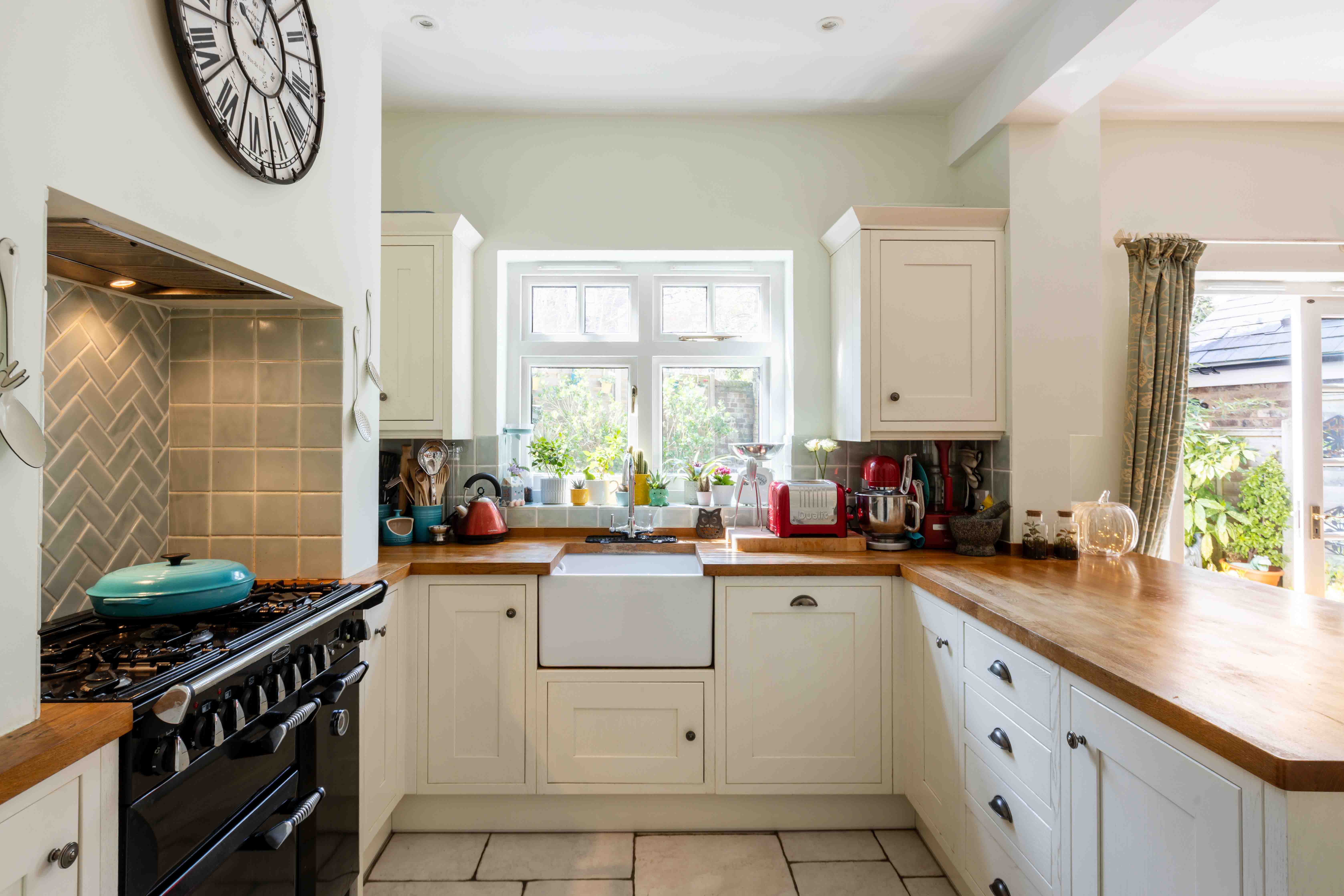 The rear of the property opens into a generous kitchen breakfast room, designed for modern family life. The modern kitchen benefits from a sympathetic traditional design, with cream shaker cabinetry, tongue-and-groove panelling, a butler sink and oak worktops. A chimney breast houses the oven with beautiful herringbone metro tiling.