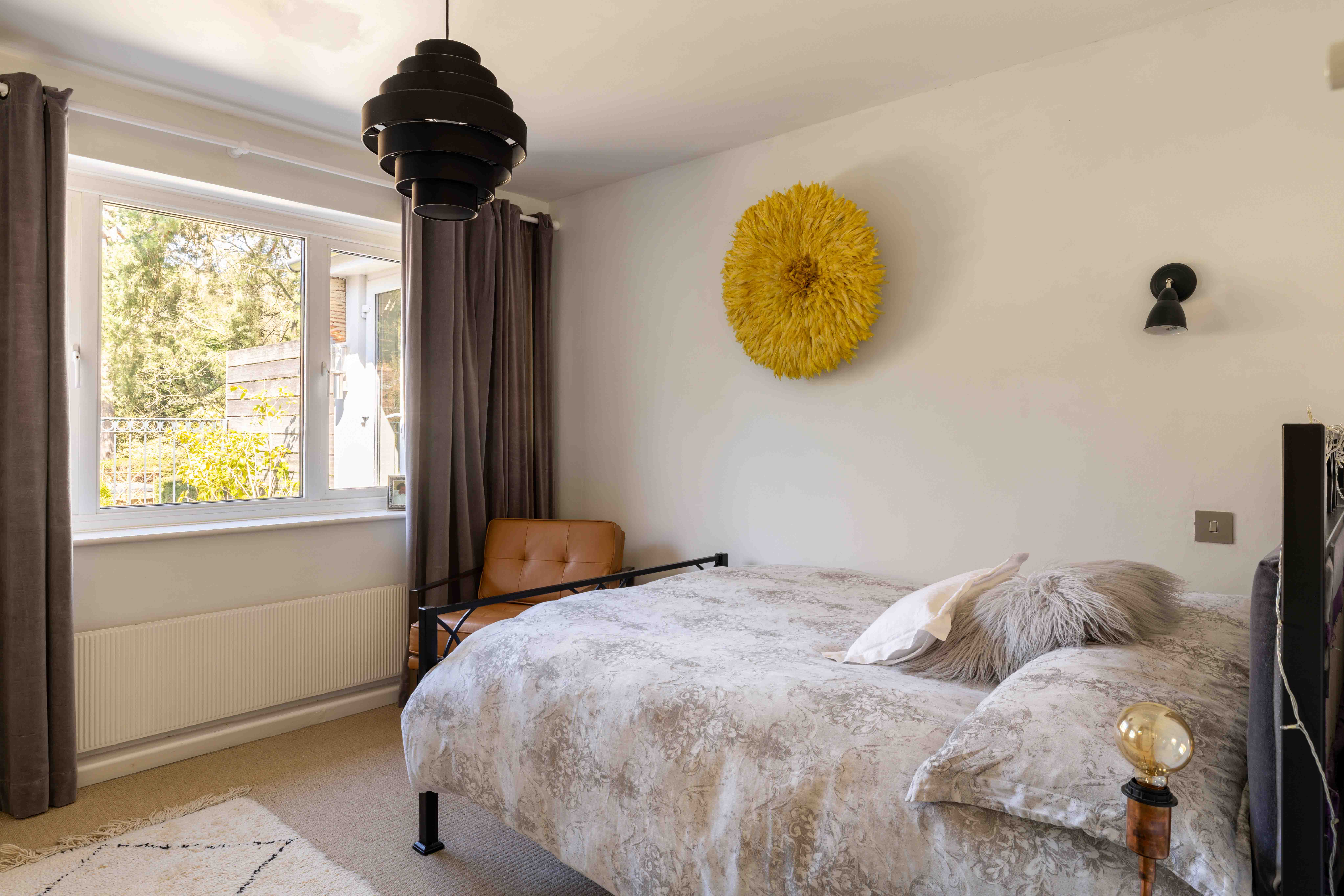 Upstairs, the balance between form and function continues. Five bedrooms are arranged, supported by three well-appointed bathrooms. The principal suite feels particularly generous in scale, with a large ensuite that includes both bath and separate shower, alongside substantial wardrobe space. Double doors open onto a first floor balcony, where the view stretches across the garden and beyond. It’s an easy place to start the day, coffee in hand, or to retreat to when the sun loungers call in warmer months. A second bedroom mirrors this sense of thoughtfulness, with its own ensuite, fitted wardrobes, and shared access to the balcony. The outlook here extends further still, across Reigate Hill — a view that feels both elevated and quietly cinematic.