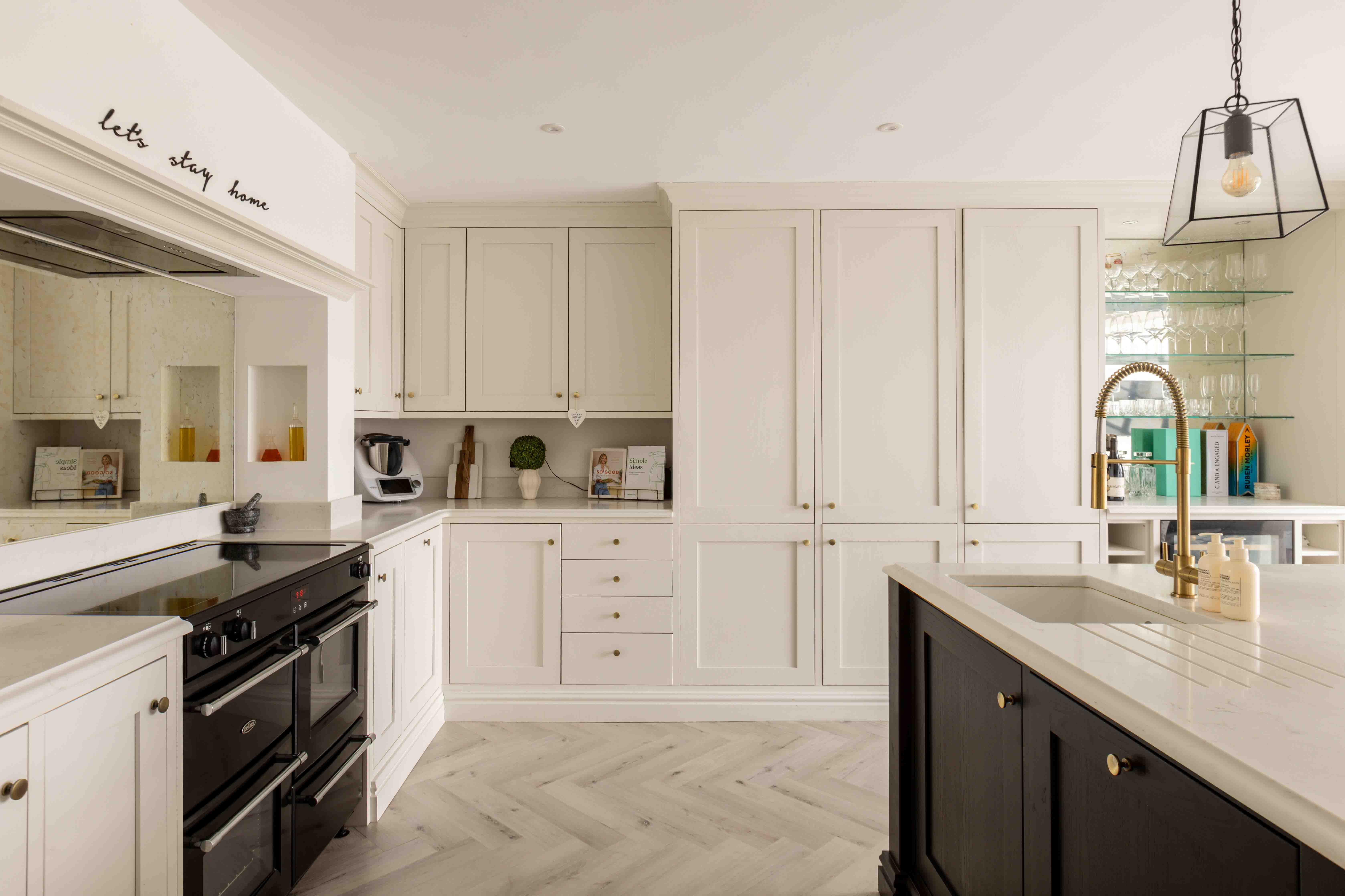 A false chimney breast houses an antique mirror, adding an elegant touch, with the oven cleverly integrated into the design. The central island, with contrasting dark cabinetry, sink, and gold hardware, offers both function and style. Its beautiful curved design extends into a built-in dining area, inspired by the atmosphere of a café, creating an inviting space for family meals or entertaining friends.