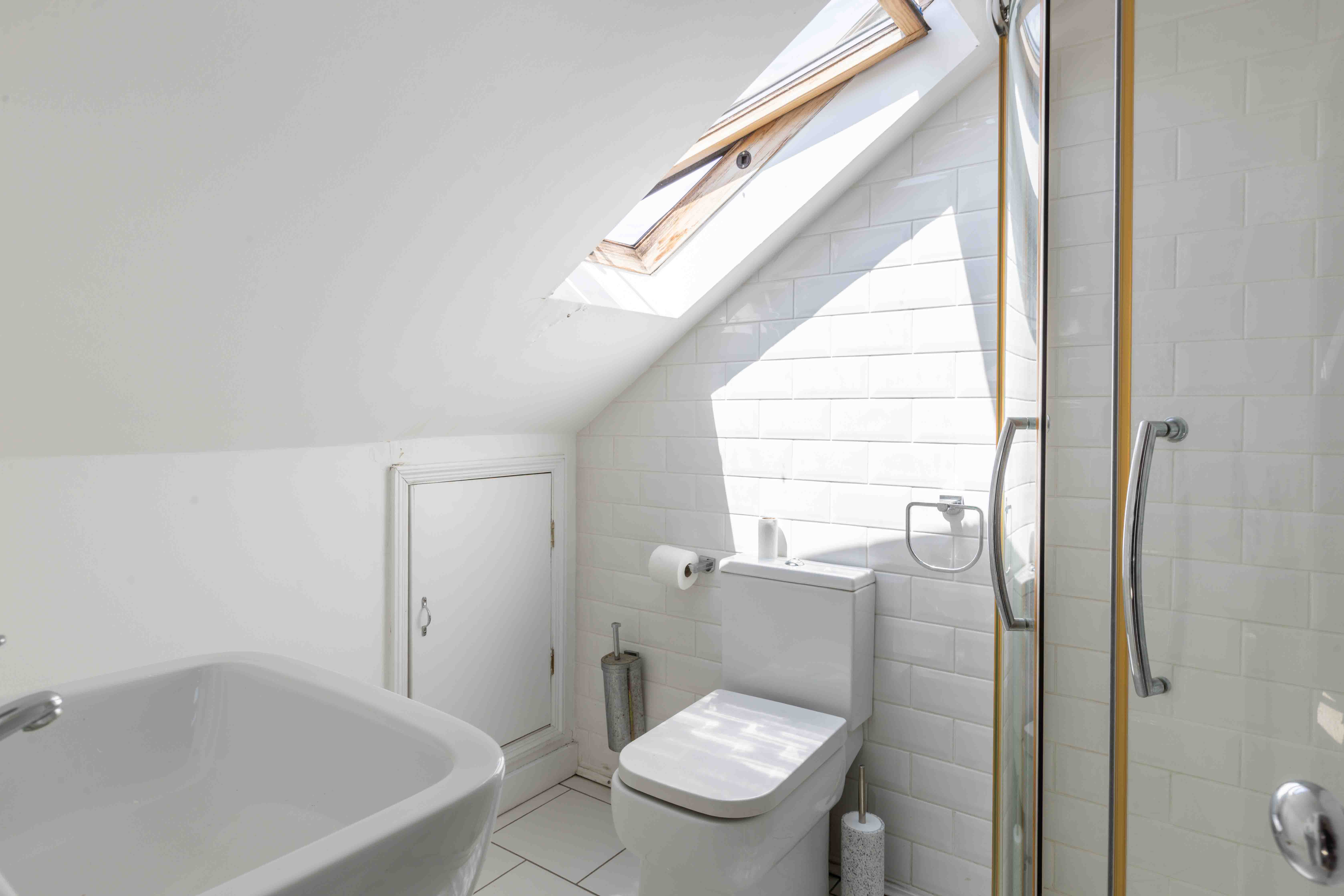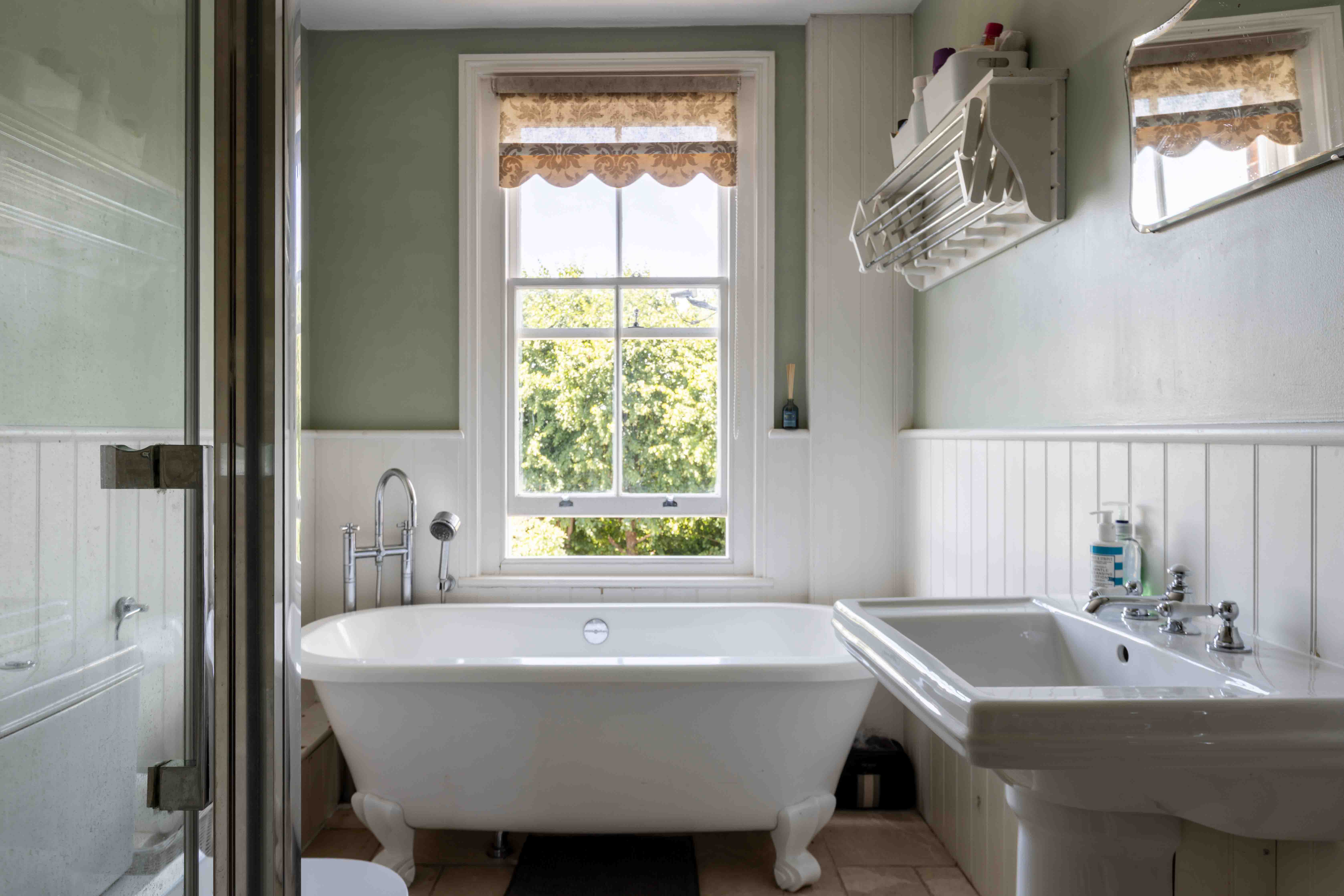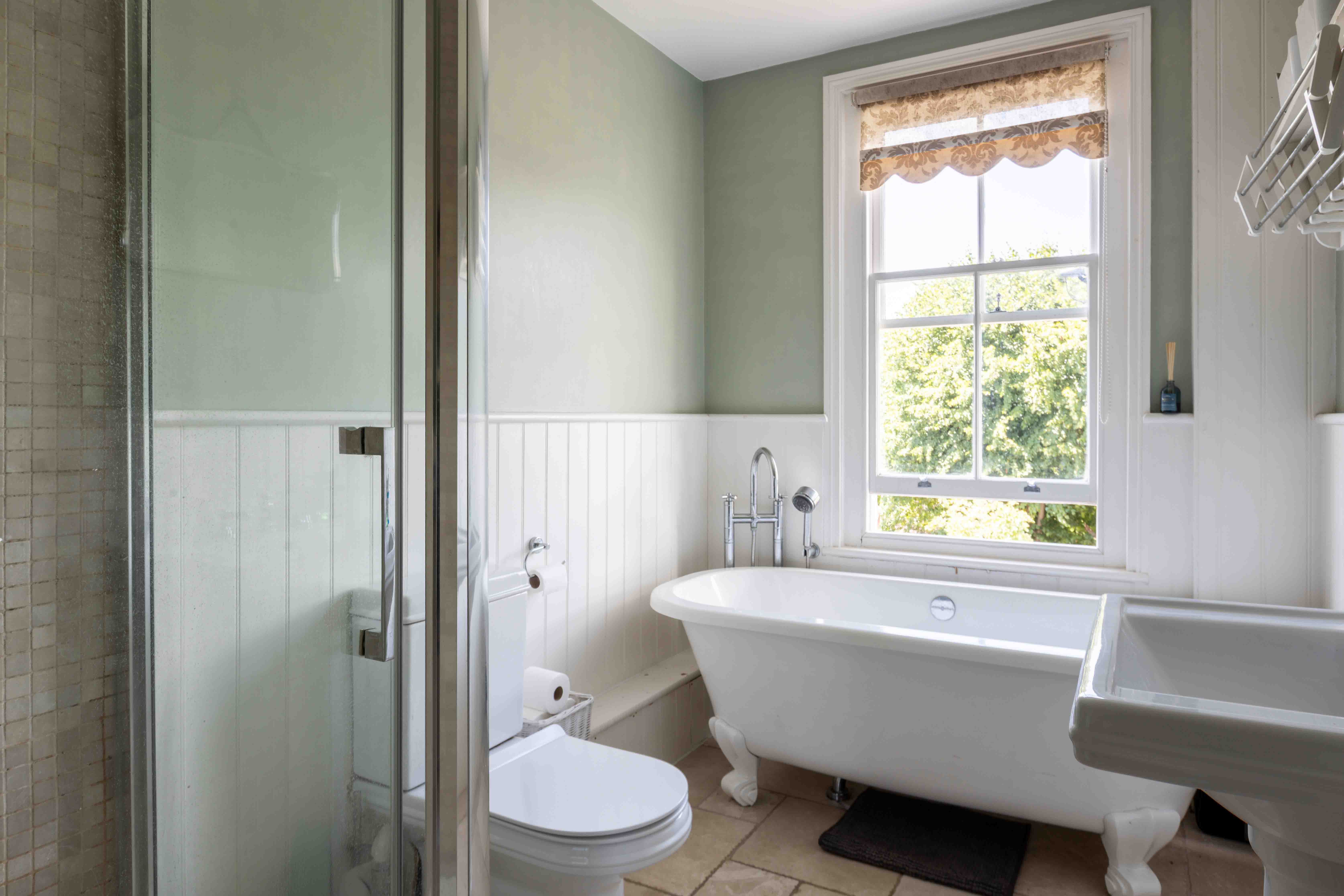 Upstairs, three double bedrooms are laid out across two floors, each with their own individual charm and leafy views. The first floor family bathroom is a masterclass in modern heritage design, with tongue and groove panelling, a roll-top bath and separate shower, all wrapped in soft period tones and polished chrome.