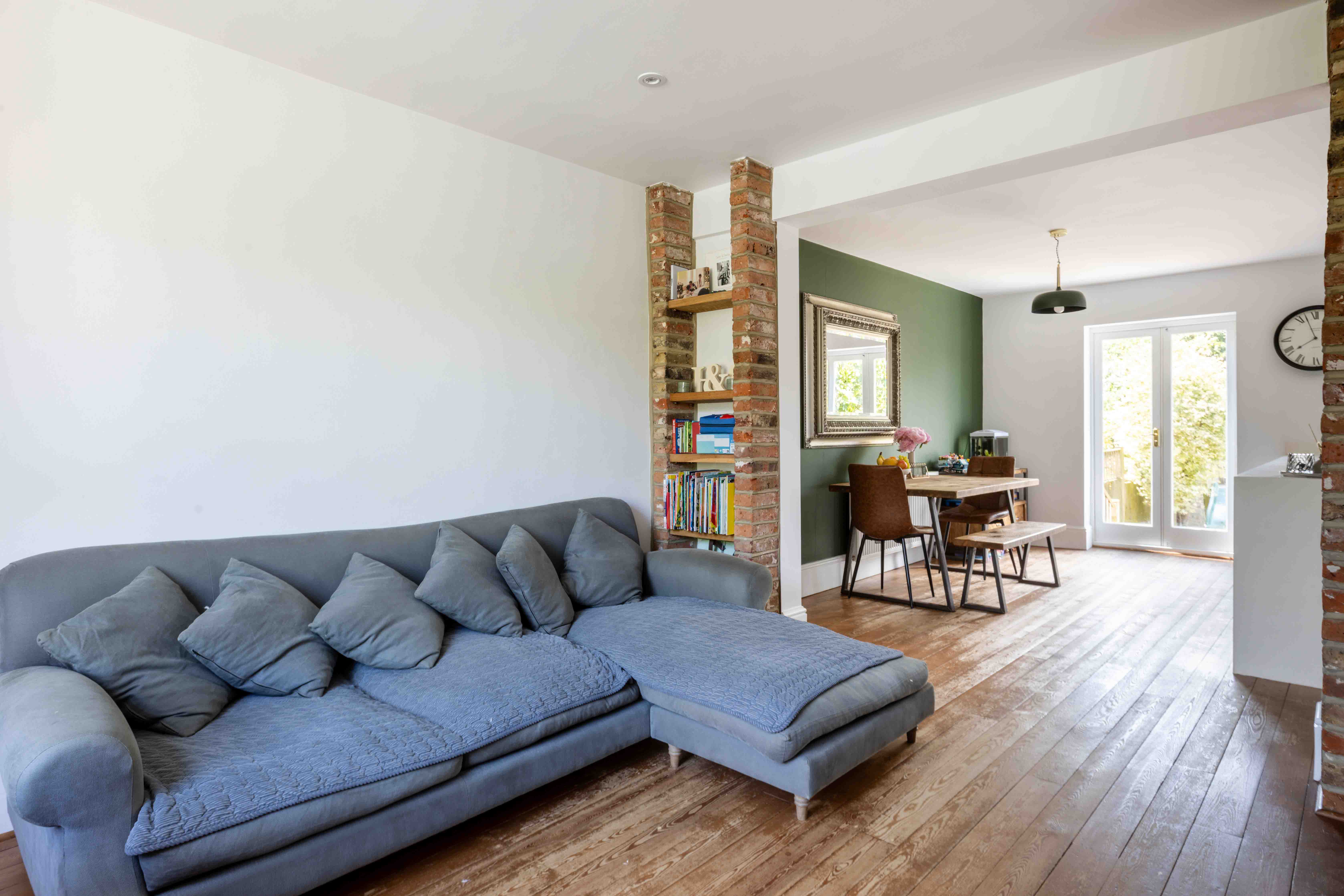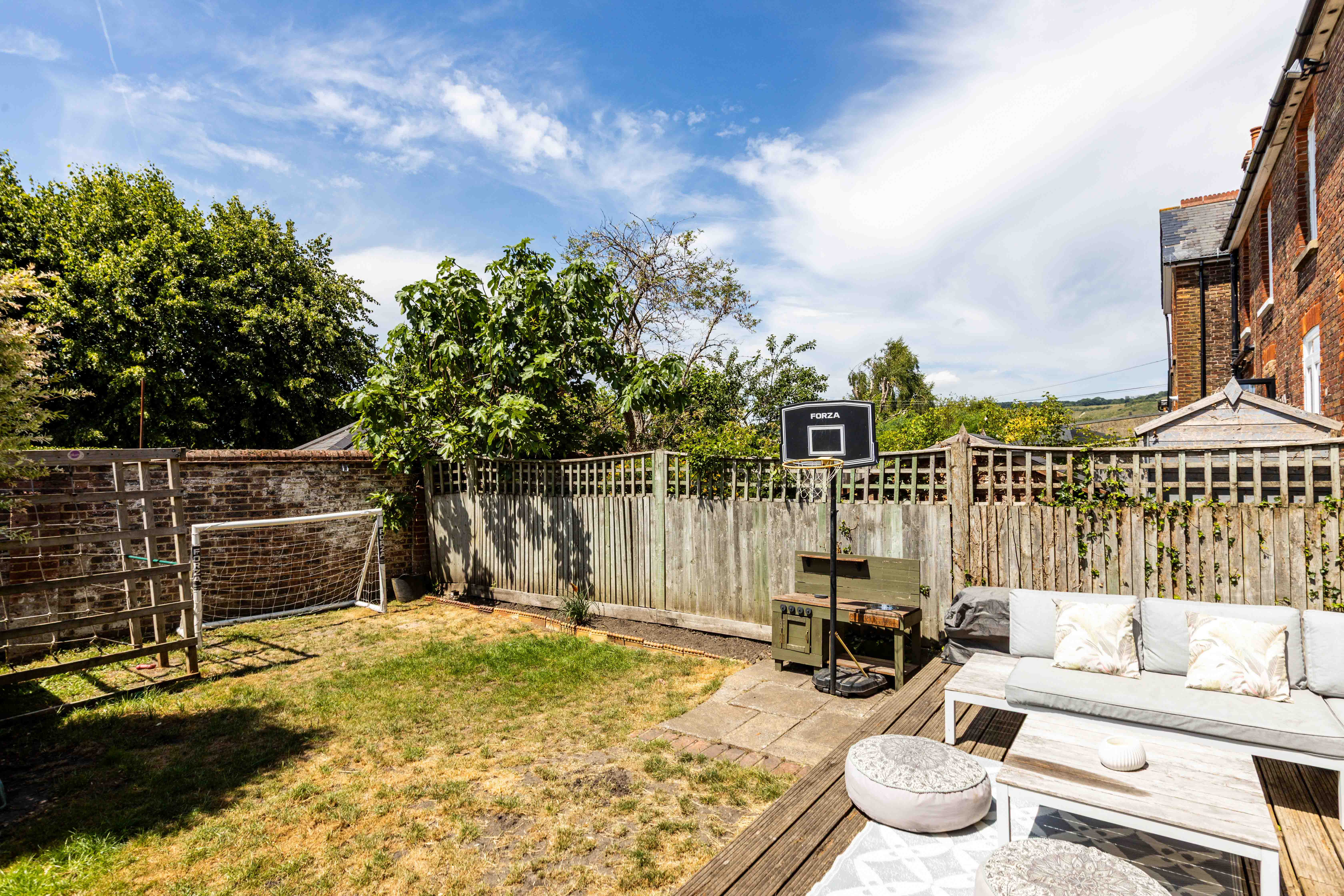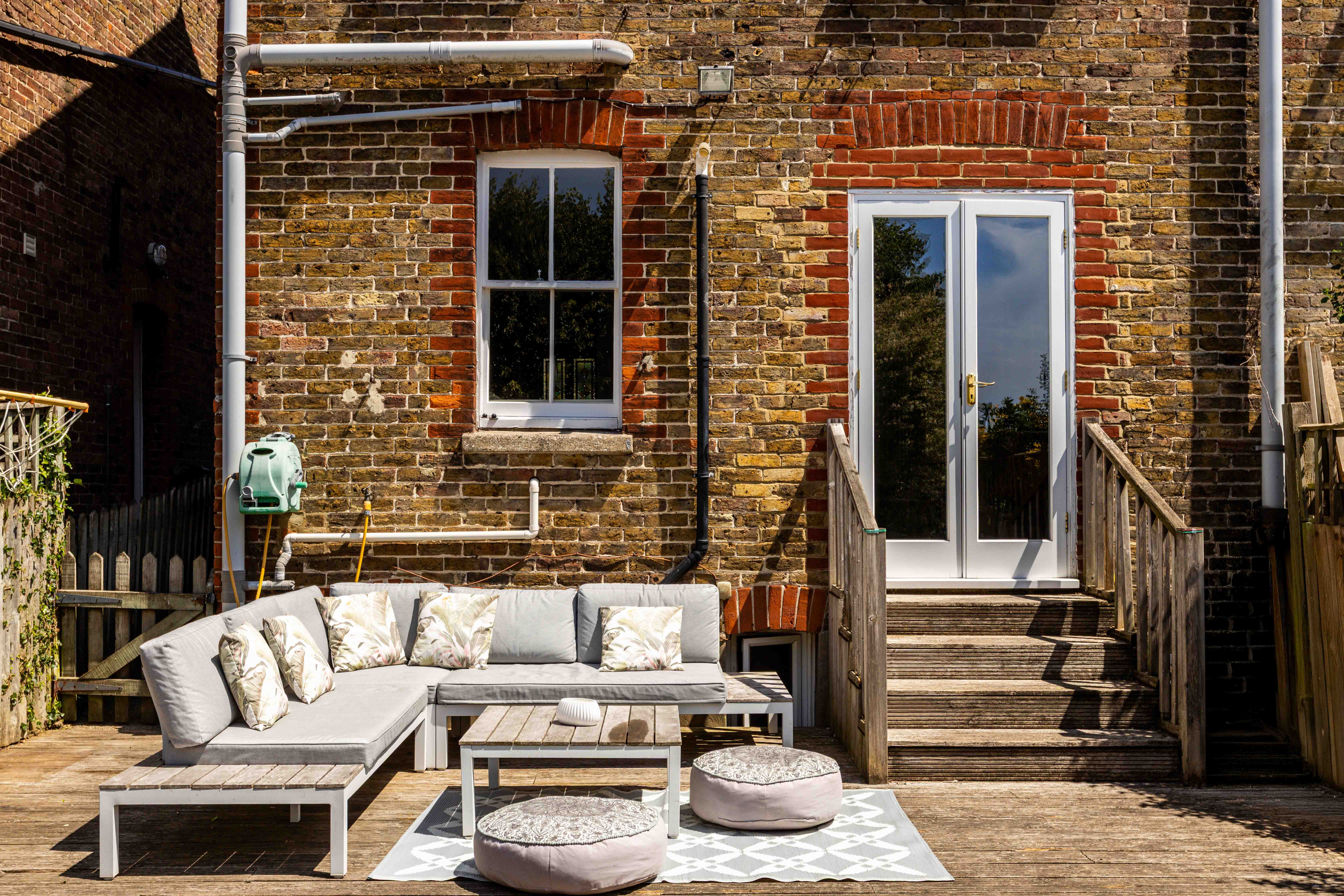 Double doors extend the space outdoors, where a west-facing deck soaks up the afternoon sun. It is the perfect spot for relaxed summer suppers or weekend breakfasts, with a lawned garden framed by a characterful rear brick wall that lends a touch of old-world charm.