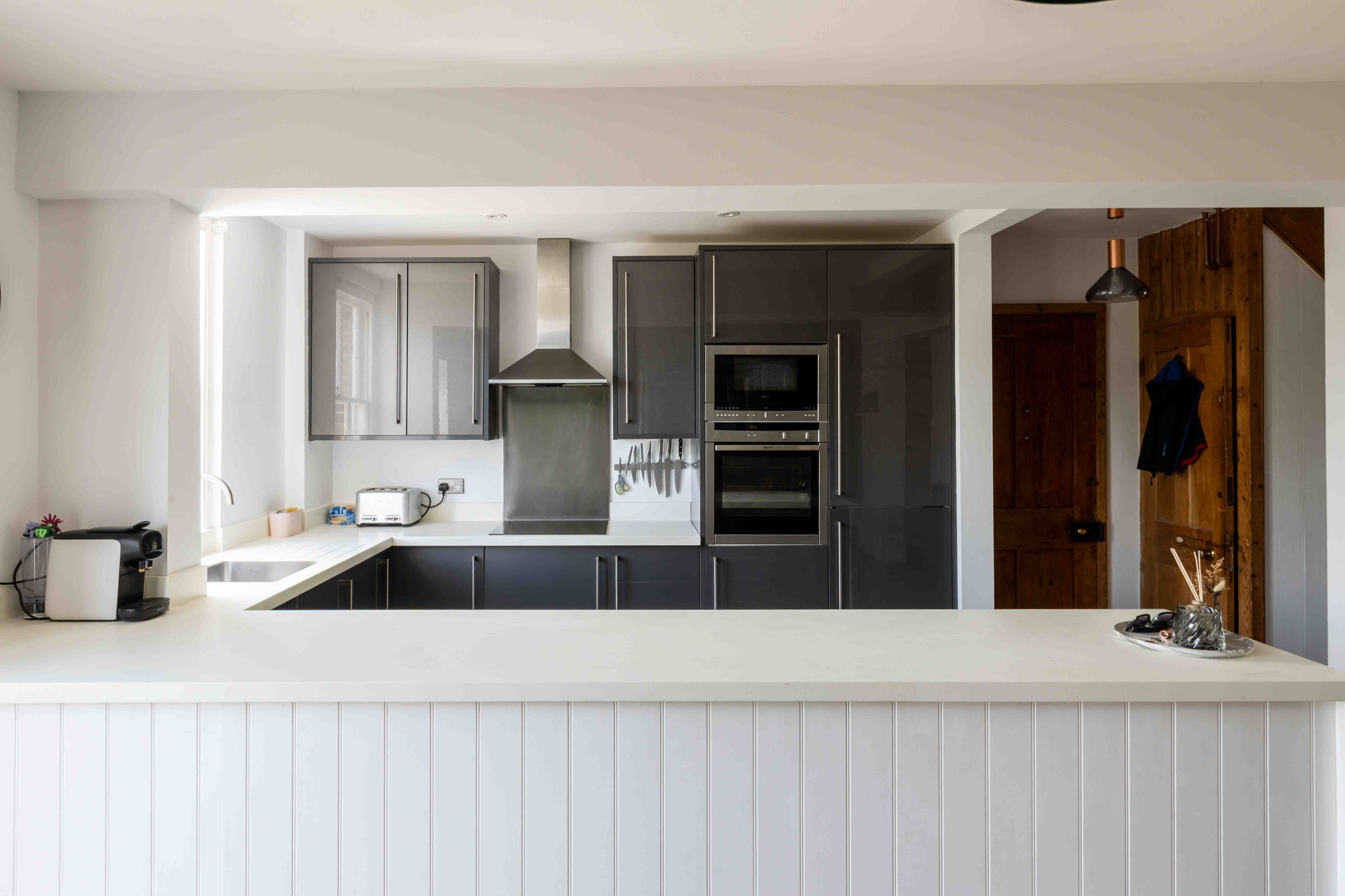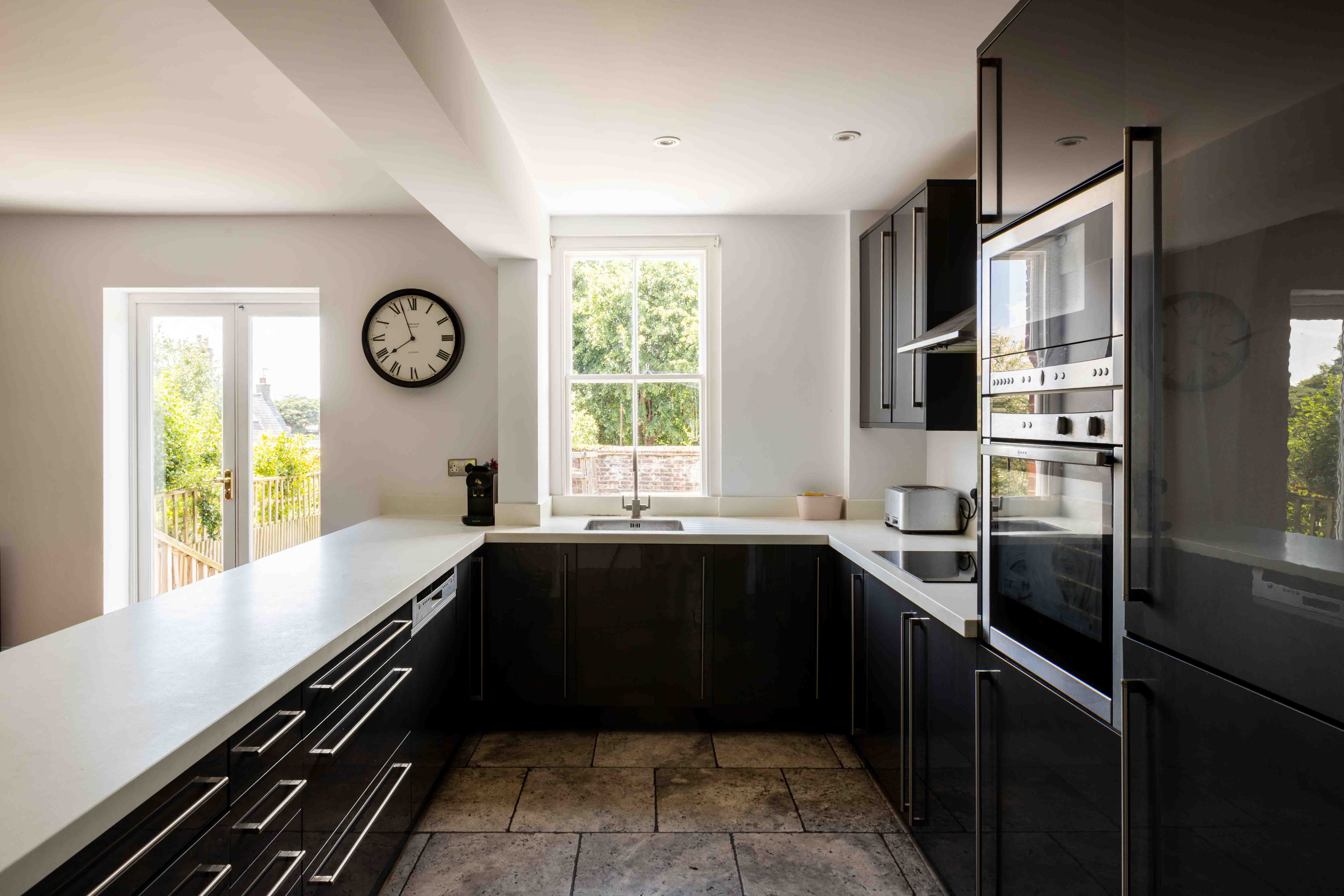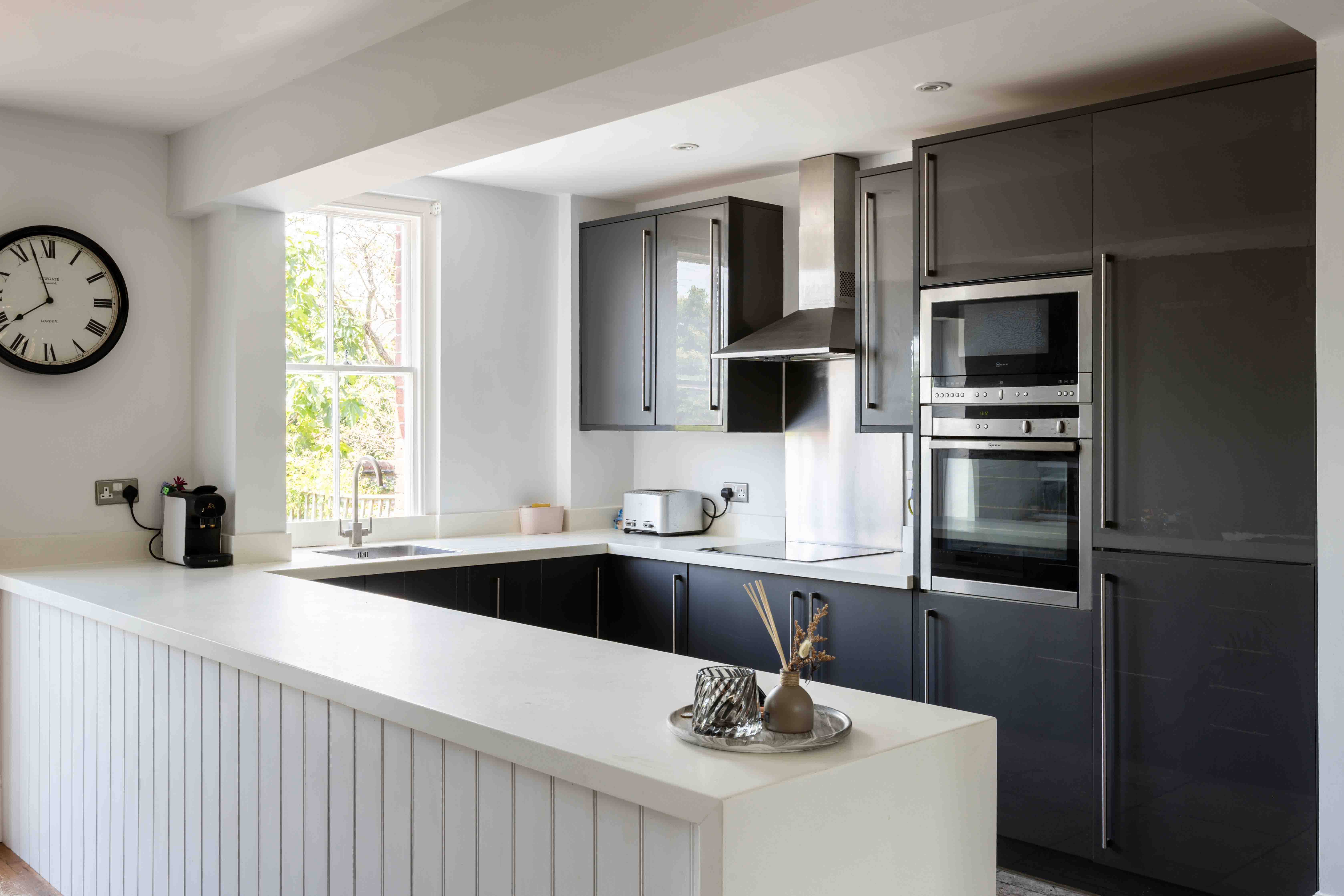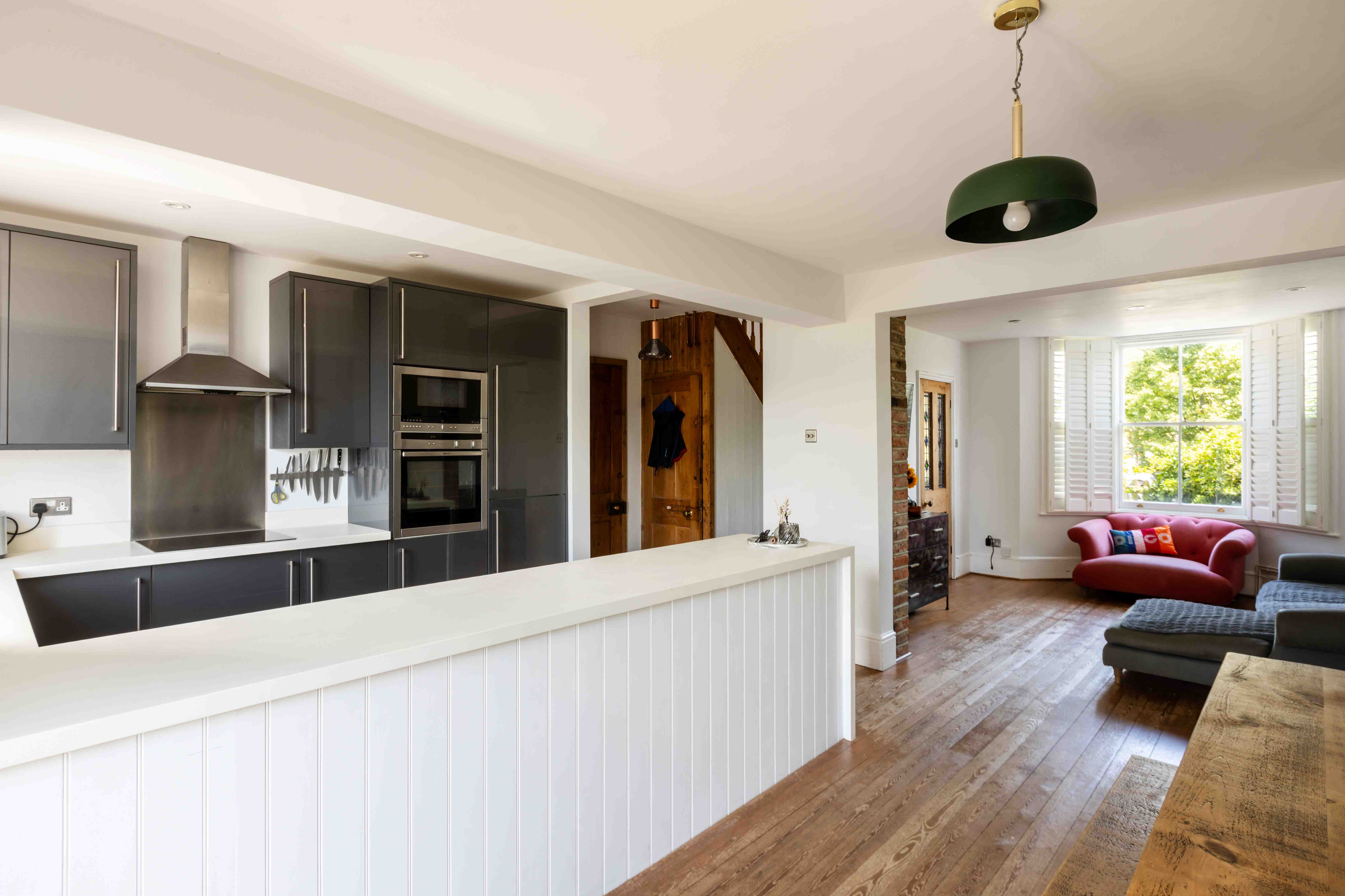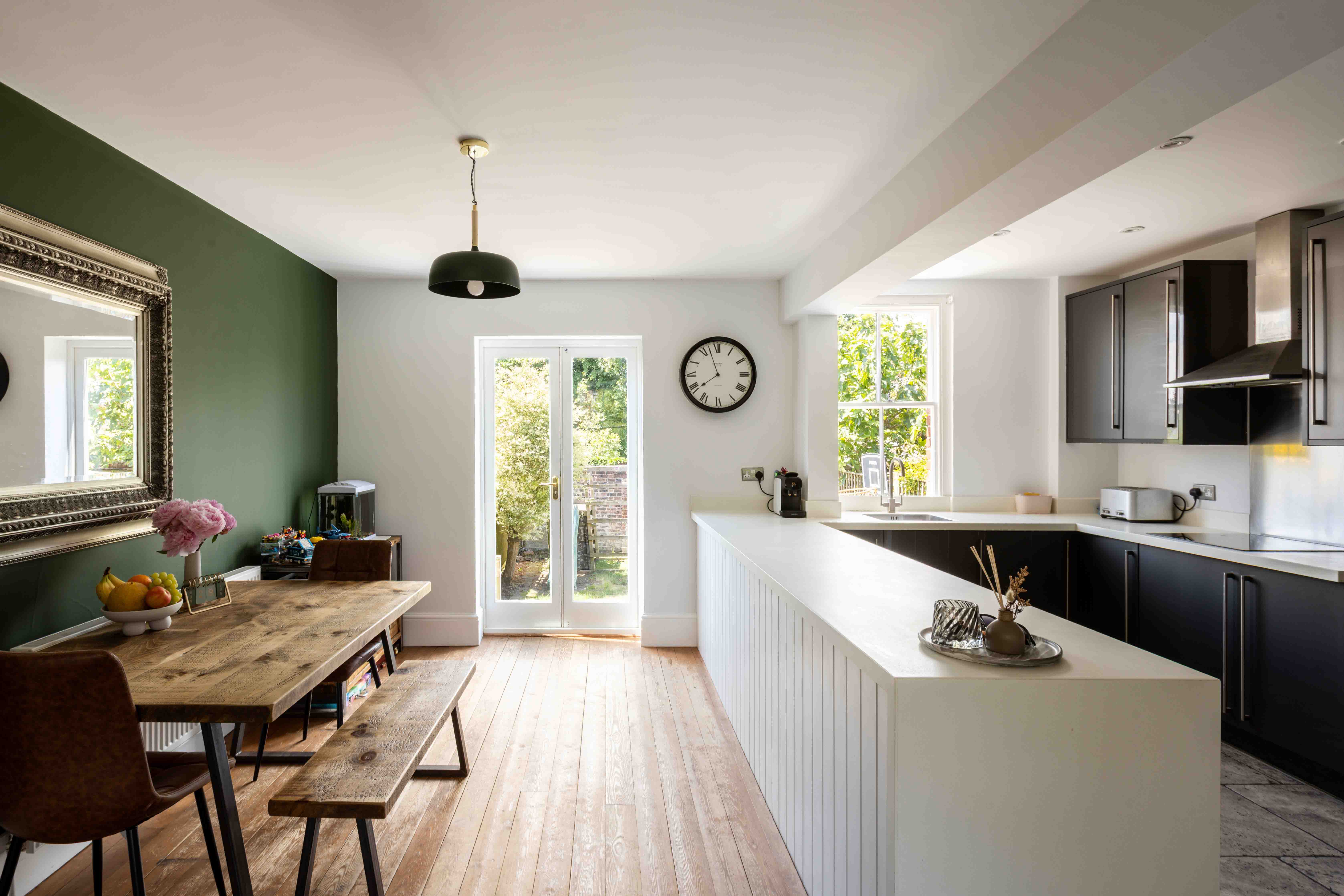 Step inside, and the house opens up in a way that feels both welcoming and elegant. A sociable layout on the ground floor encourages easy everyday living and a natural rhythm for entertaining. The front living room, with its soft light and traditional sash window, flows through to a contemporary kitchen and dining space. Here, deep-toned handleless cabinetry sits handsomely beside chrome hardware and integrated appliances, giving the kitchen a clean yet luxurious edge.