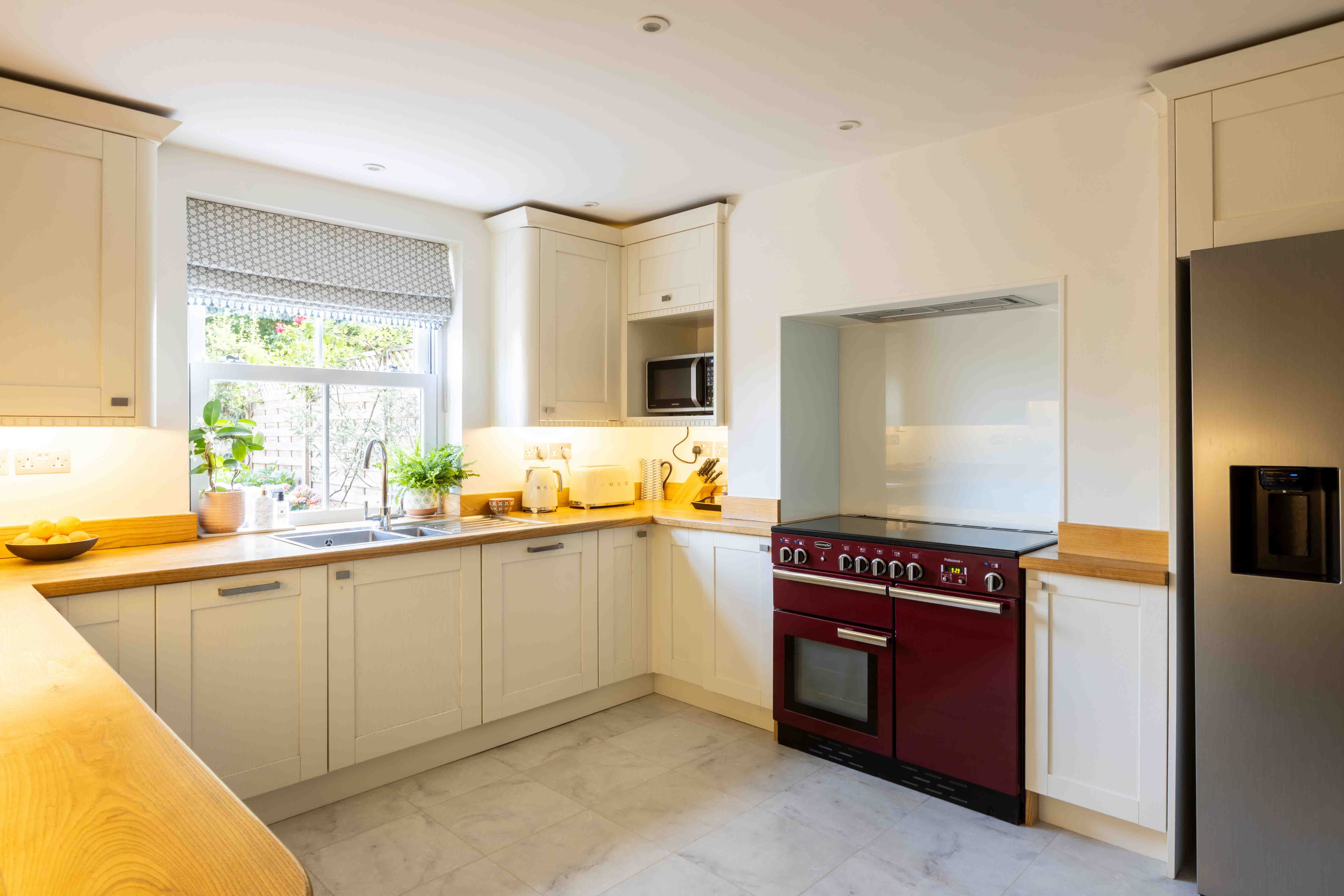 Descend to the lower ground floor and the heart of the home reveals itself — a kitchen and breakfast room with a contemporary-country sensibility. Cream shaker cabinetry is paired with oak worktops, and a tiled floor. A chimney breast wraps around the Rangemaster cooker, ready for Sunday roasts and midweek suppers alike.