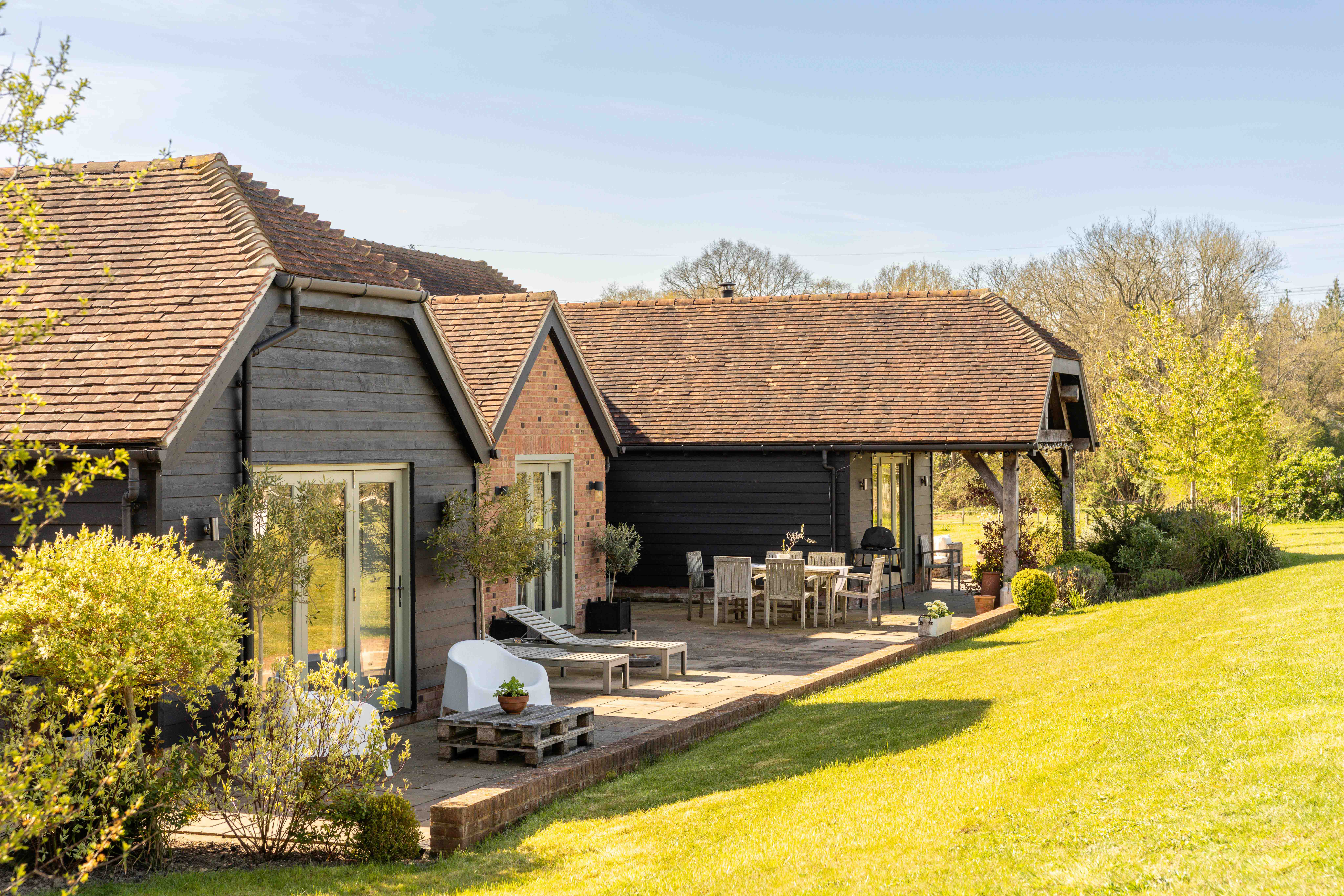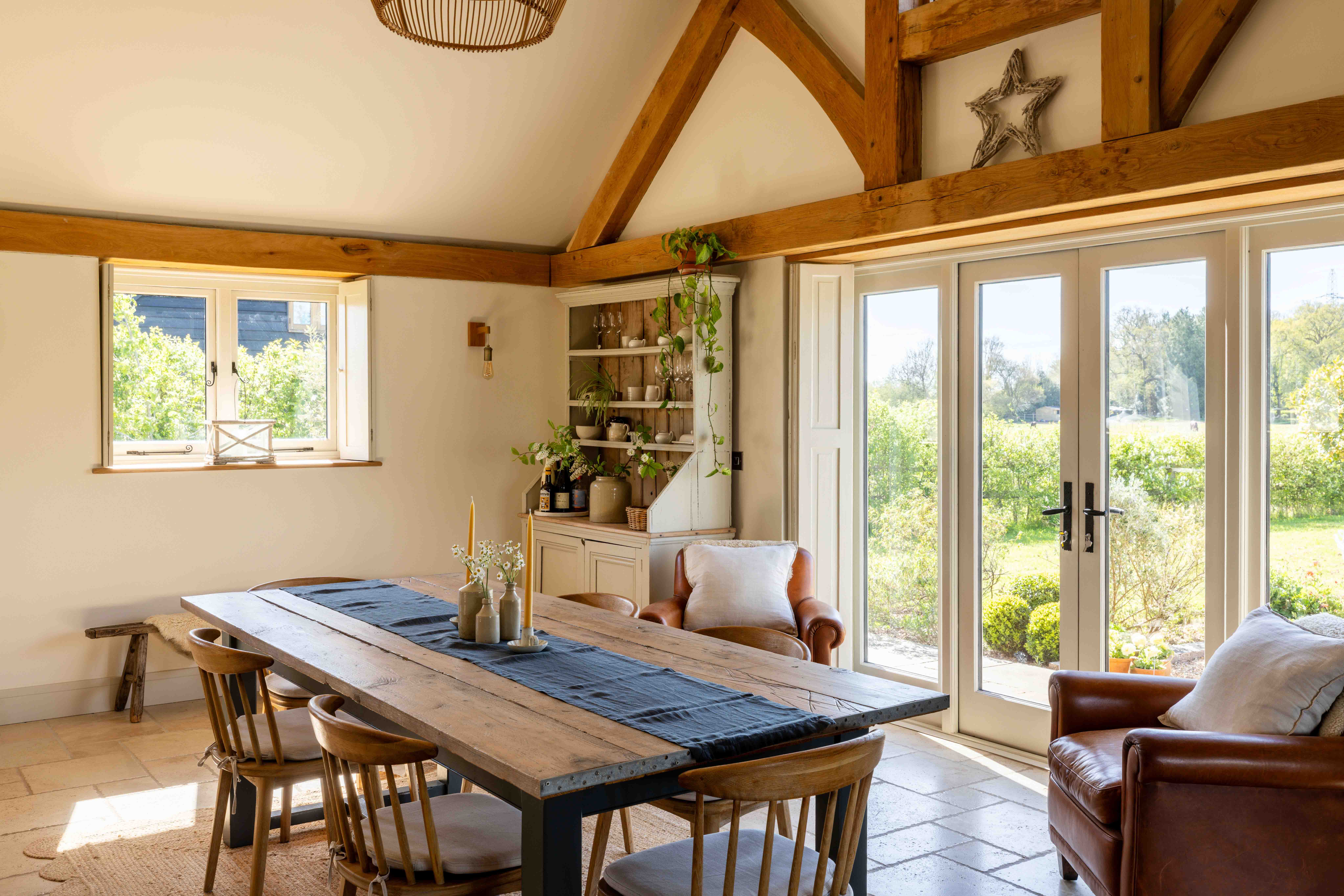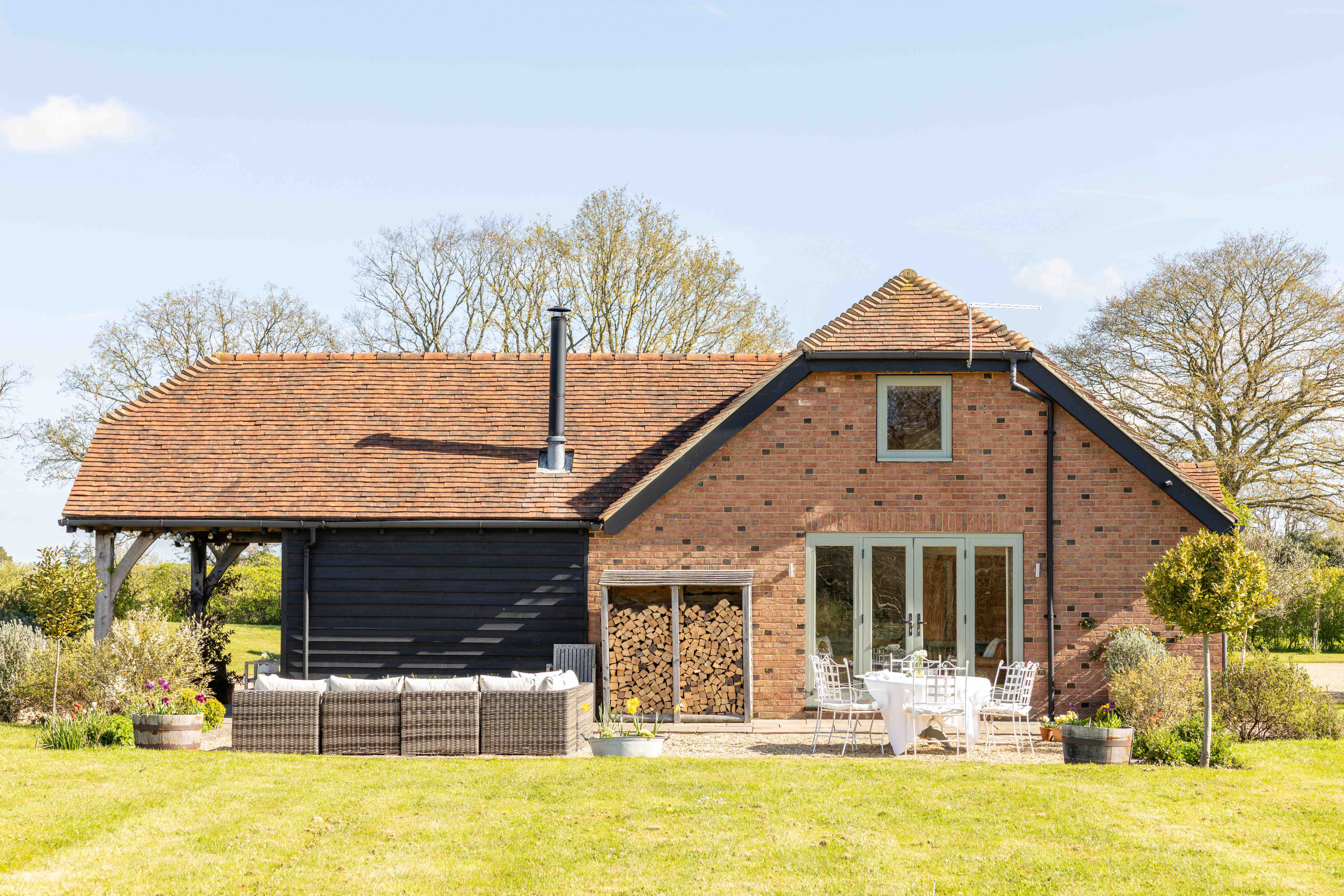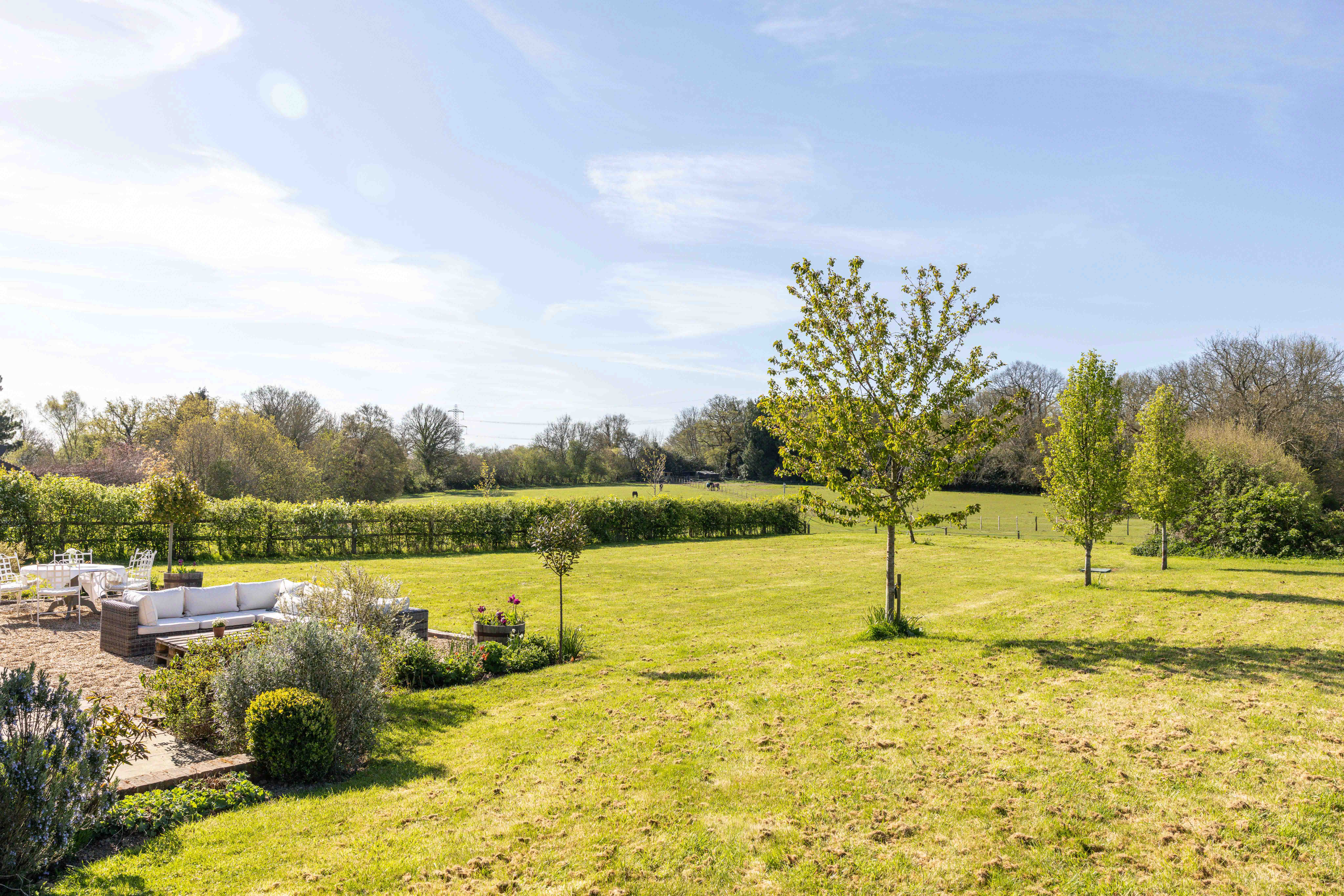 Externally, the transformation of the grounds has been significant. Once a blank plot, the gardens have been carefully landscaped and planted, with native hedging and trees now maturing beautifully. A variety of seating and dining areas allow the garden to be enjoyed throughout the day, following the sun from morning through to golden hour. The setting is wonderfully private, with open views across neighbouring fields, often dotted with deer and horses, offering a scene that feels almost cinematic. Flowering trees, including cherry, bring seasonal colour, while a meadow-style boundary enhances the naturalistic feel.