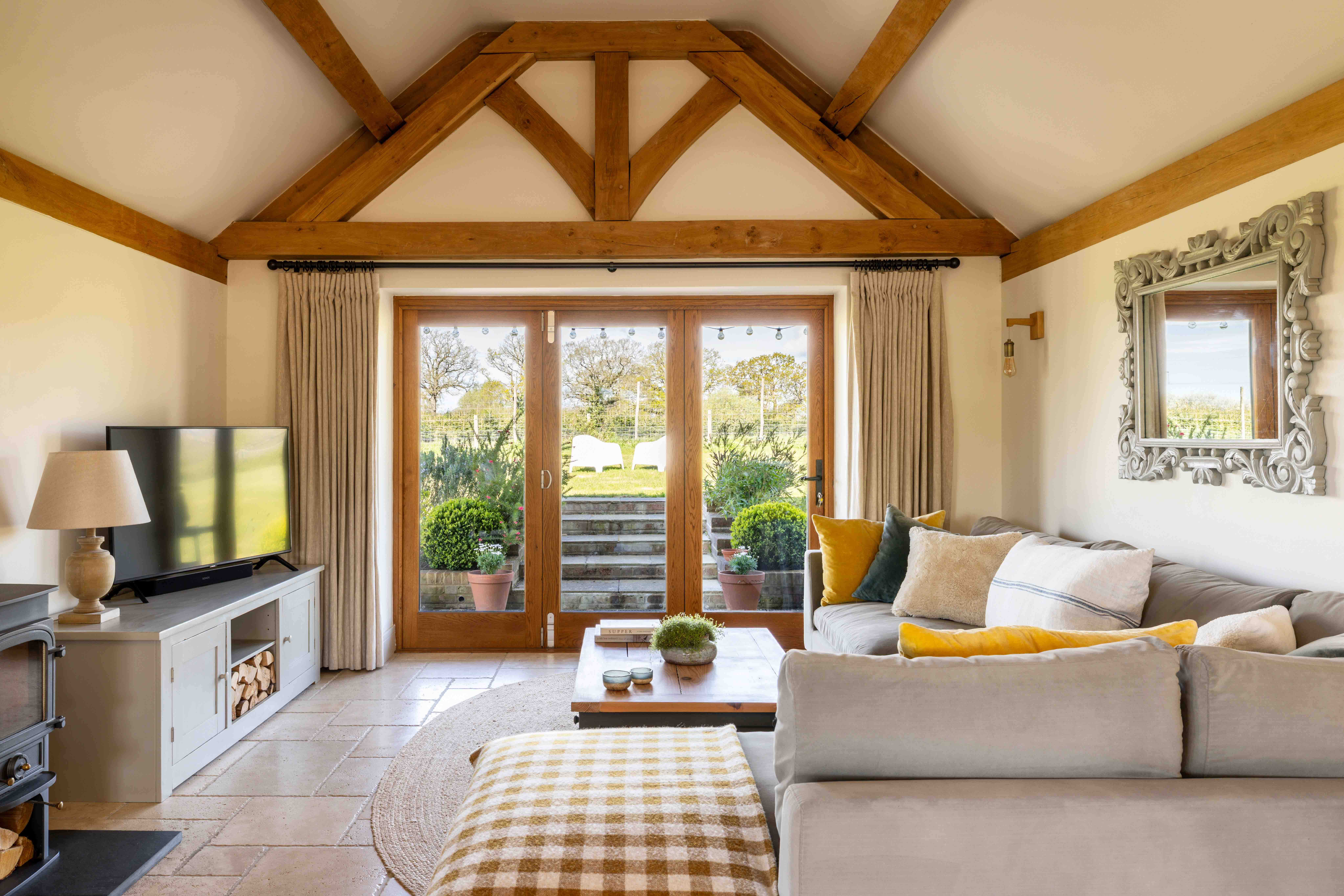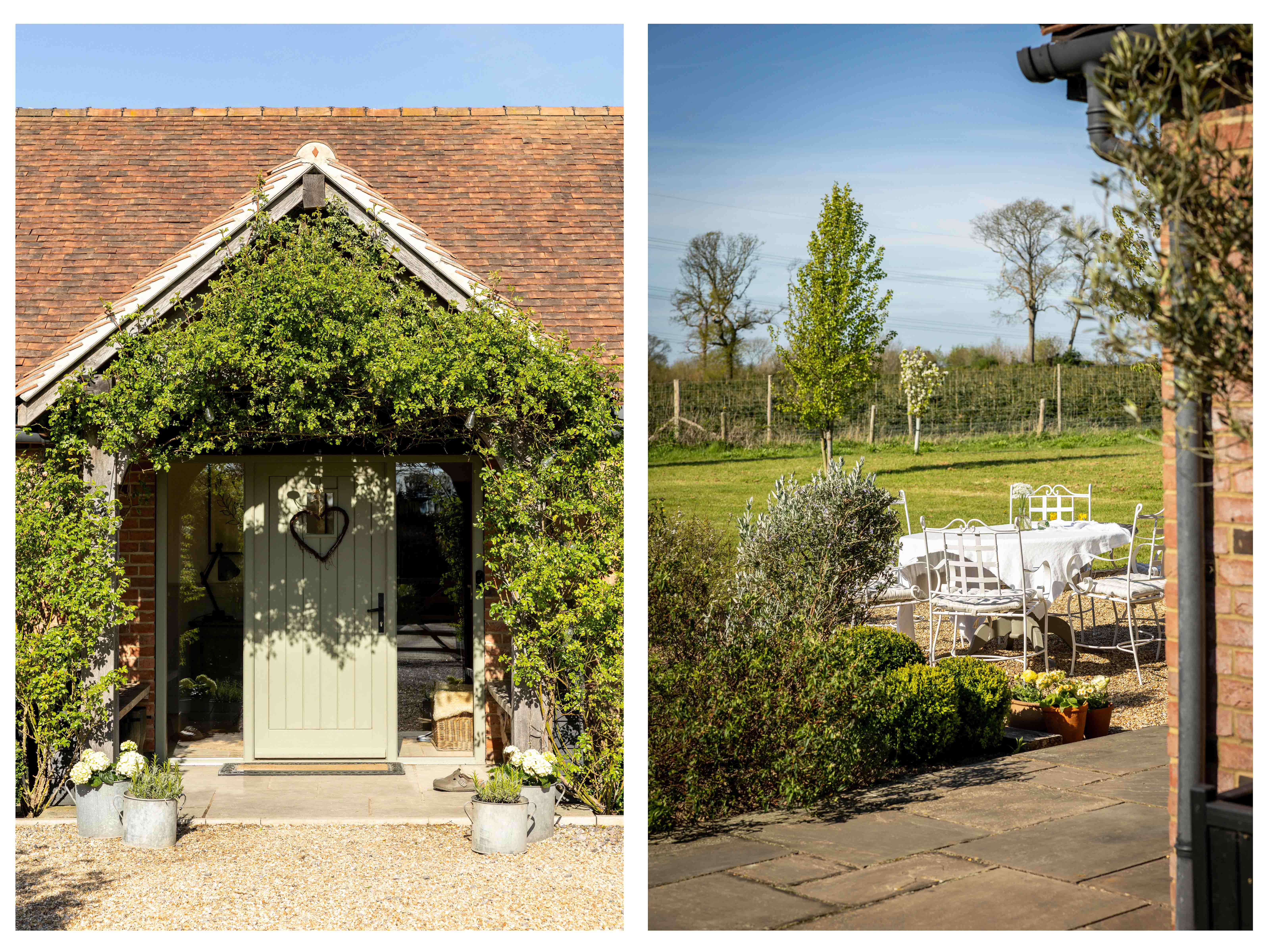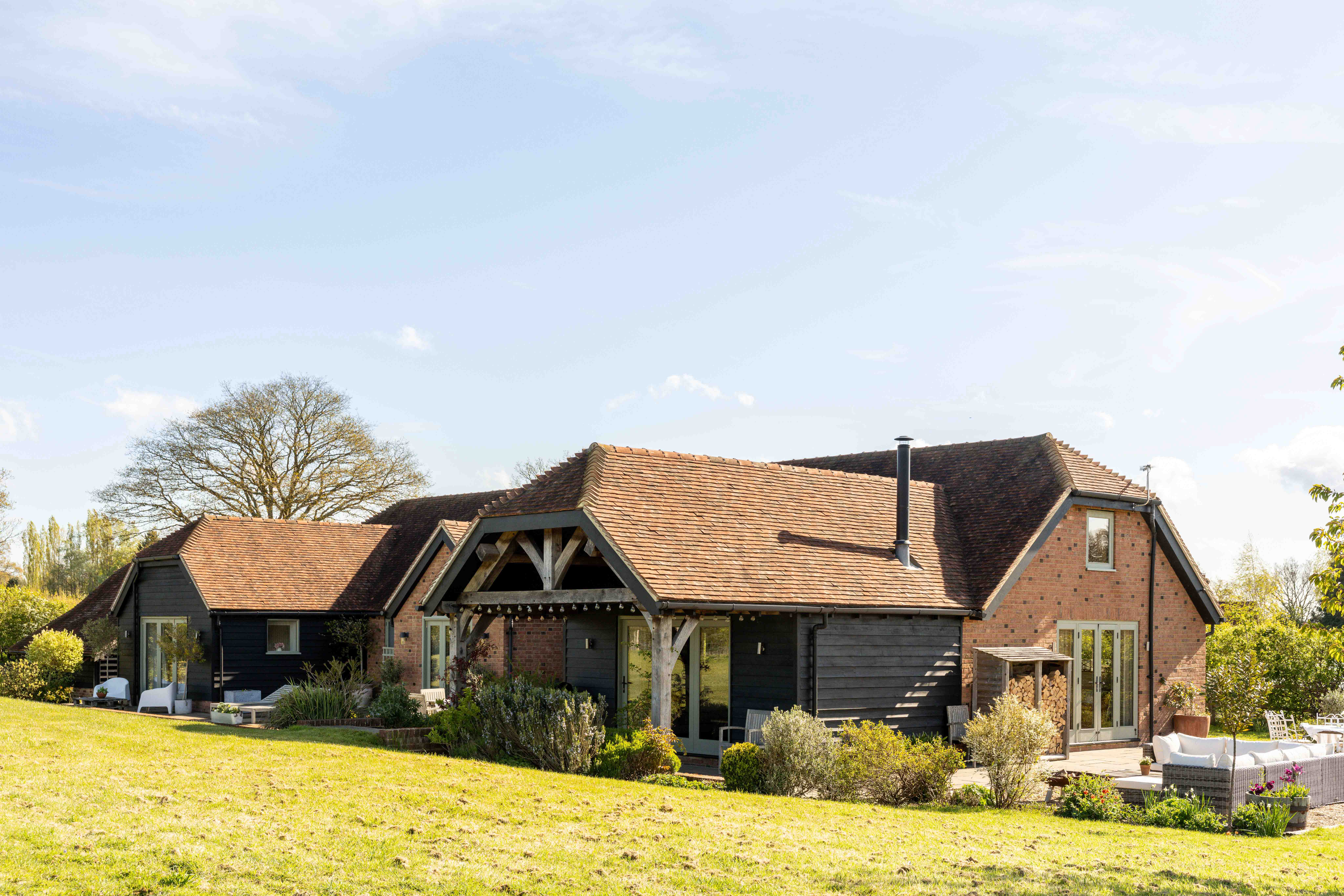 Externally, the transformation of the grounds has been significant. Once a blank plot, the gardens have been carefully landscaped and planted, with native hedging and trees now maturing beautifully. A variety of seating and dining areas allow the garden to be enjoyed throughout the day, following the sun from morning through to golden hour. The setting is wonderfully private, with open views across neighbouring fields, often dotted with deer and horses, offering a scene that feels almost cinematic. Flowering trees, including cherry, bring seasonal colour, while a meadow-style boundary enhances the naturalistic feel.