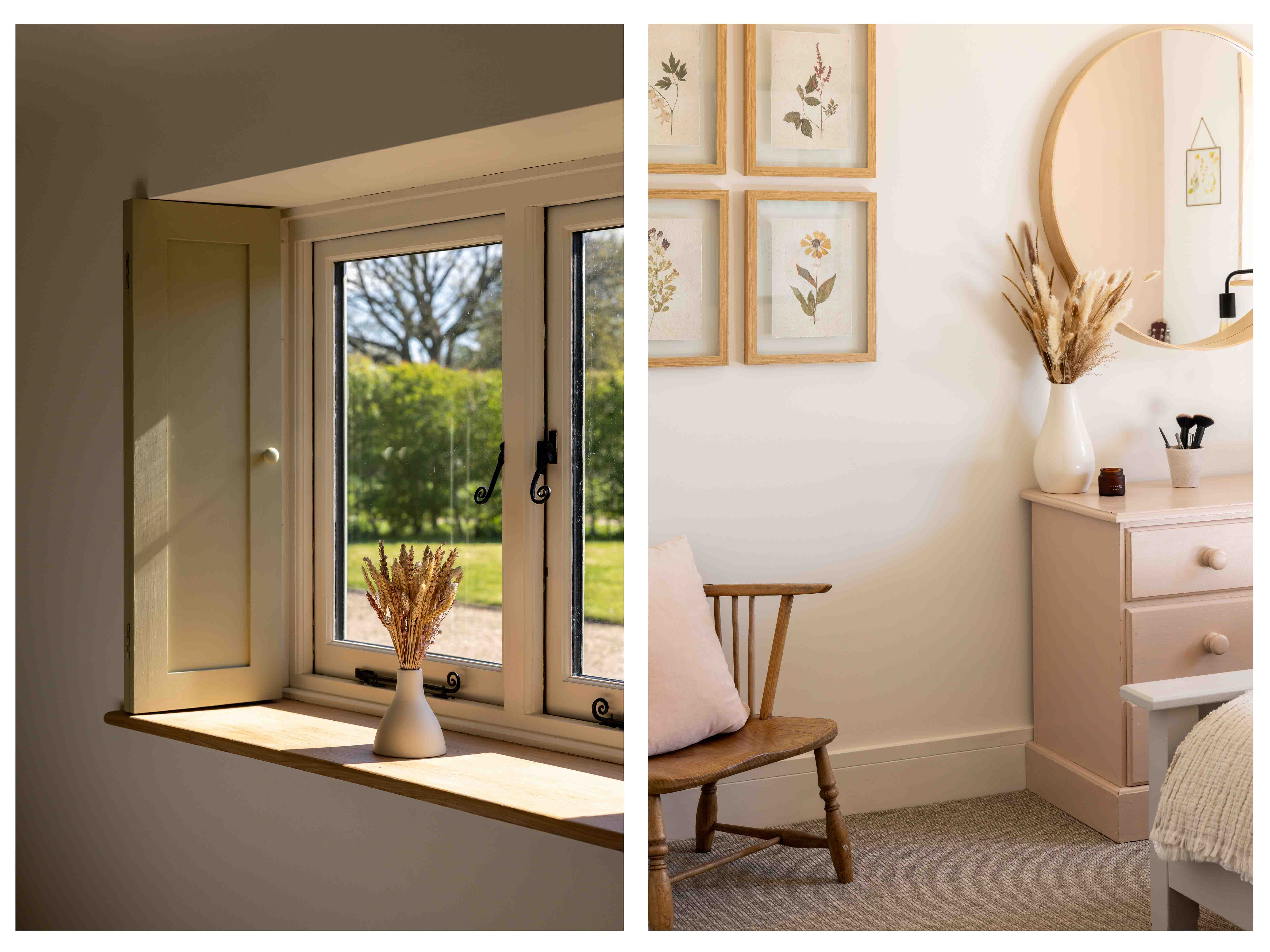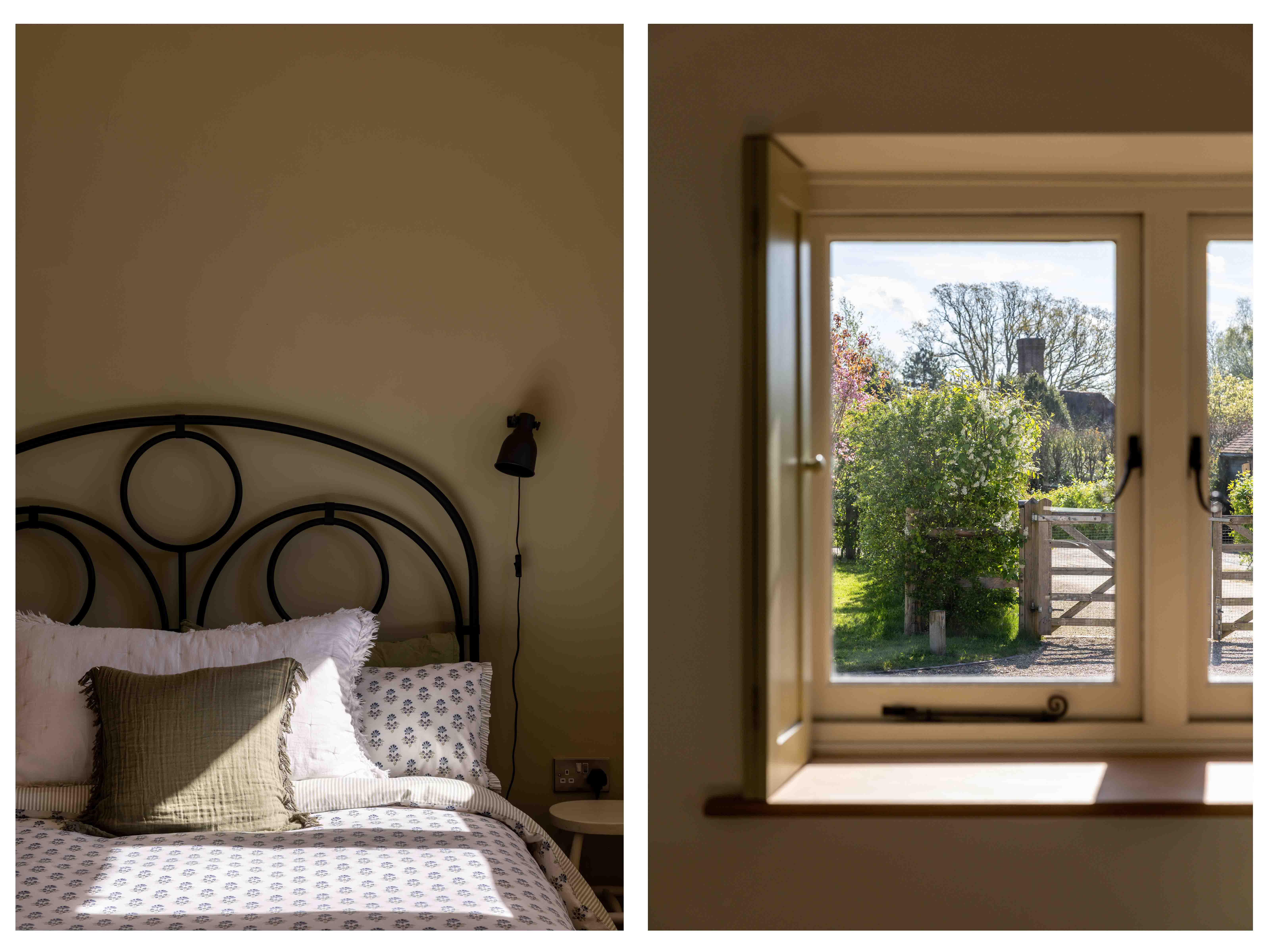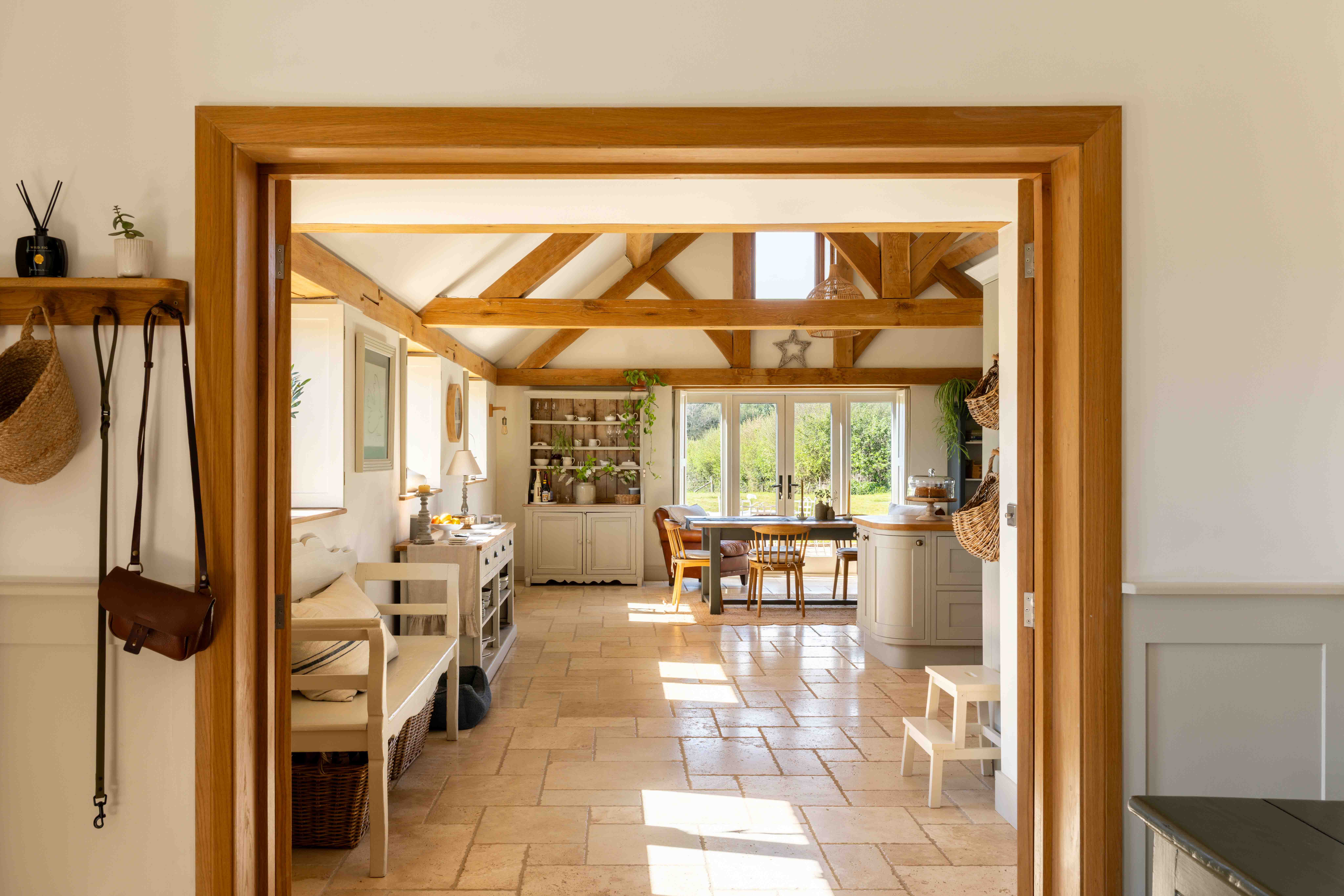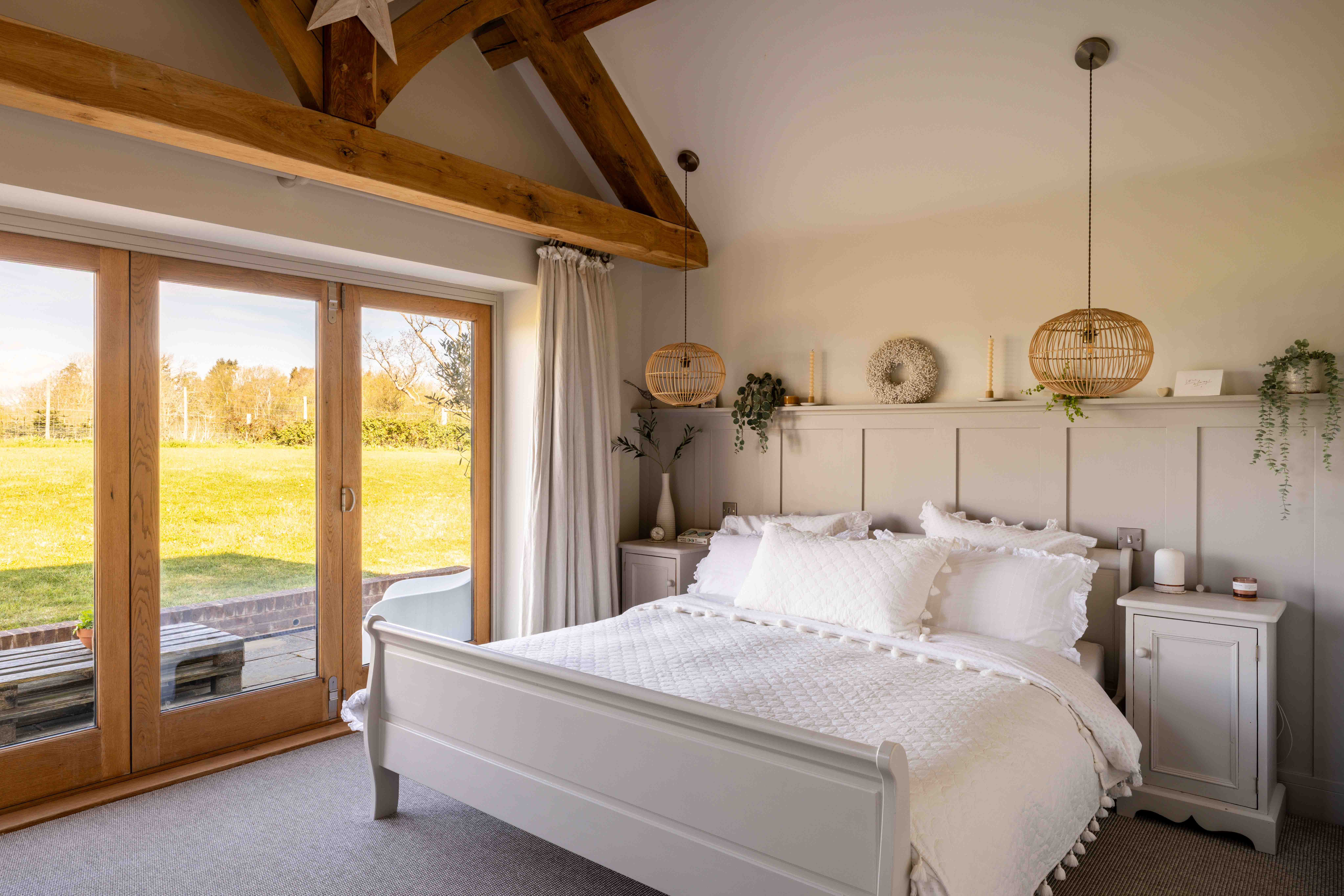 Externally, the transformation of the grounds has been significant. Once a blank plot, the gardens have been carefully landscaped and planted, with native hedging and trees now maturing beautifully. A variety of seating and dining areas allow the garden to be enjoyed throughout the day, following the sun from morning through to golden hour. The setting is wonderfully private, with open views across neighbouring fields, often dotted with deer and horses, offering a scene that feels almost cinematic. Flowering trees, including cherry, bring seasonal colour, while a meadow-style boundary enhances the naturalistic feel.