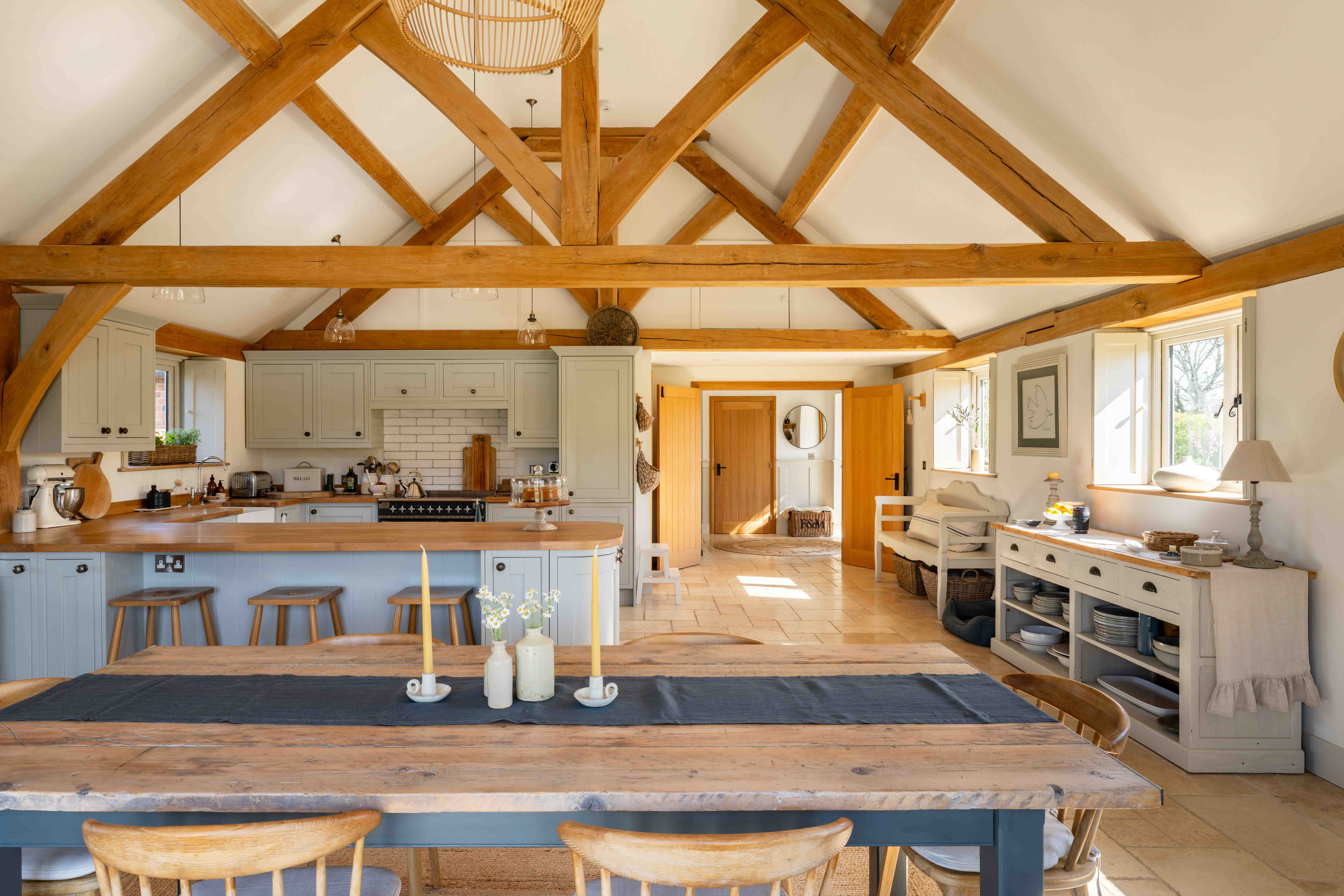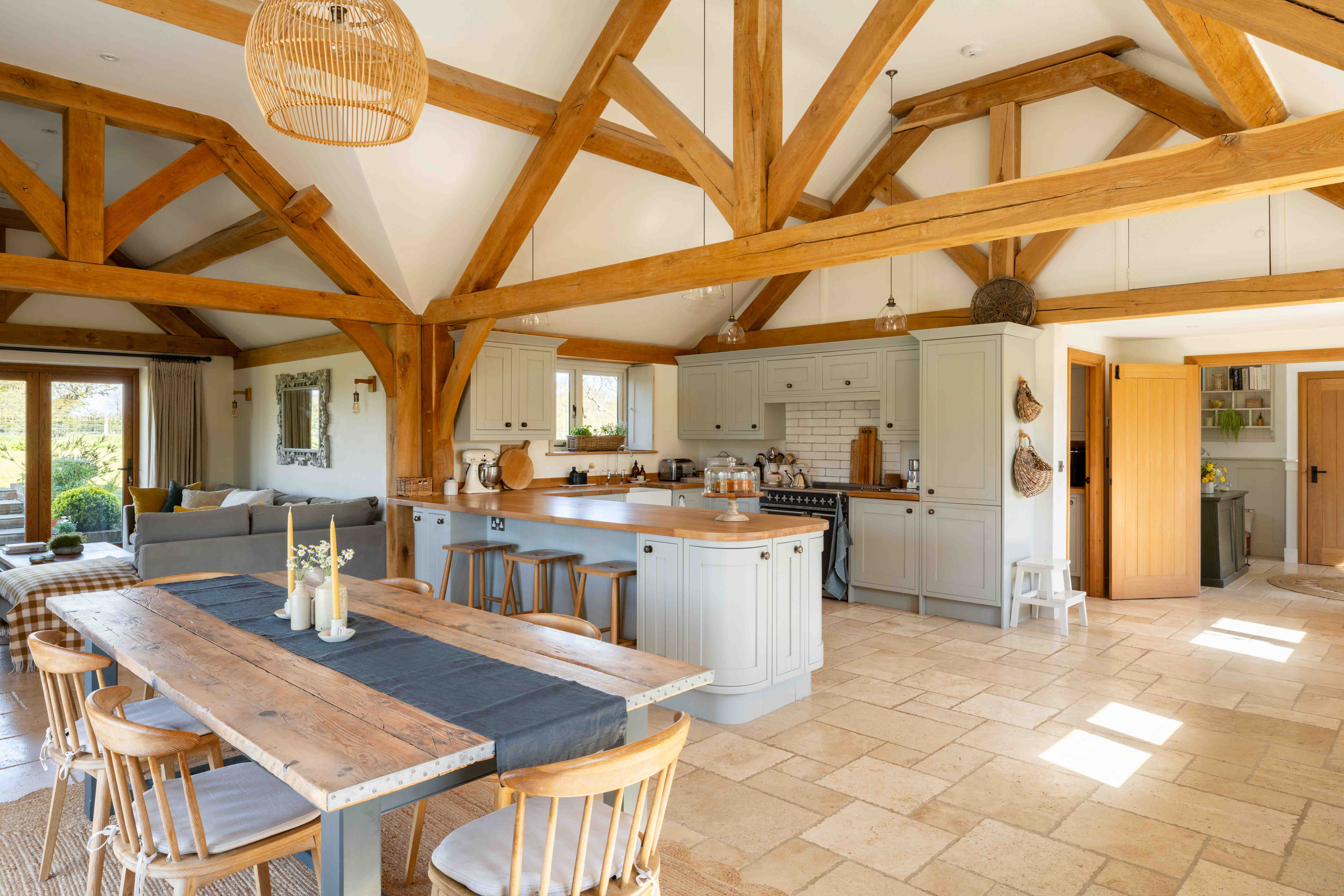 At the heart of the home lies an outstanding open plan living space, designed very much as a sociable hub. Bathed in natural light from multiple aspects, East, South and West - it offers an ever-changing outlook across the surrounding landscape. In the warmer months, doors can be thrown open to seamlessly connect indoor and out; While in winter the space remains cosy and inviting, centred around a Clearview wood burner. Underfoot, travertine limestone flows through the principal areas, warmed by underfloor heating throughout, with individual room thermostats ensuring both comfort and efficiency. The kitchen is beautifully appointed, featuring oak block worktops and a range of integrated appliances including Neff refrigeration and dishwasher, alongside a Rangemaster Elise induction range cooker with double ovens and separate grill. A separate utility room provides further functionality, with additional integrated refrigeration and access to a substantial boarded loft space above, one of several cleverly incorporated storage solutions throughout the home.