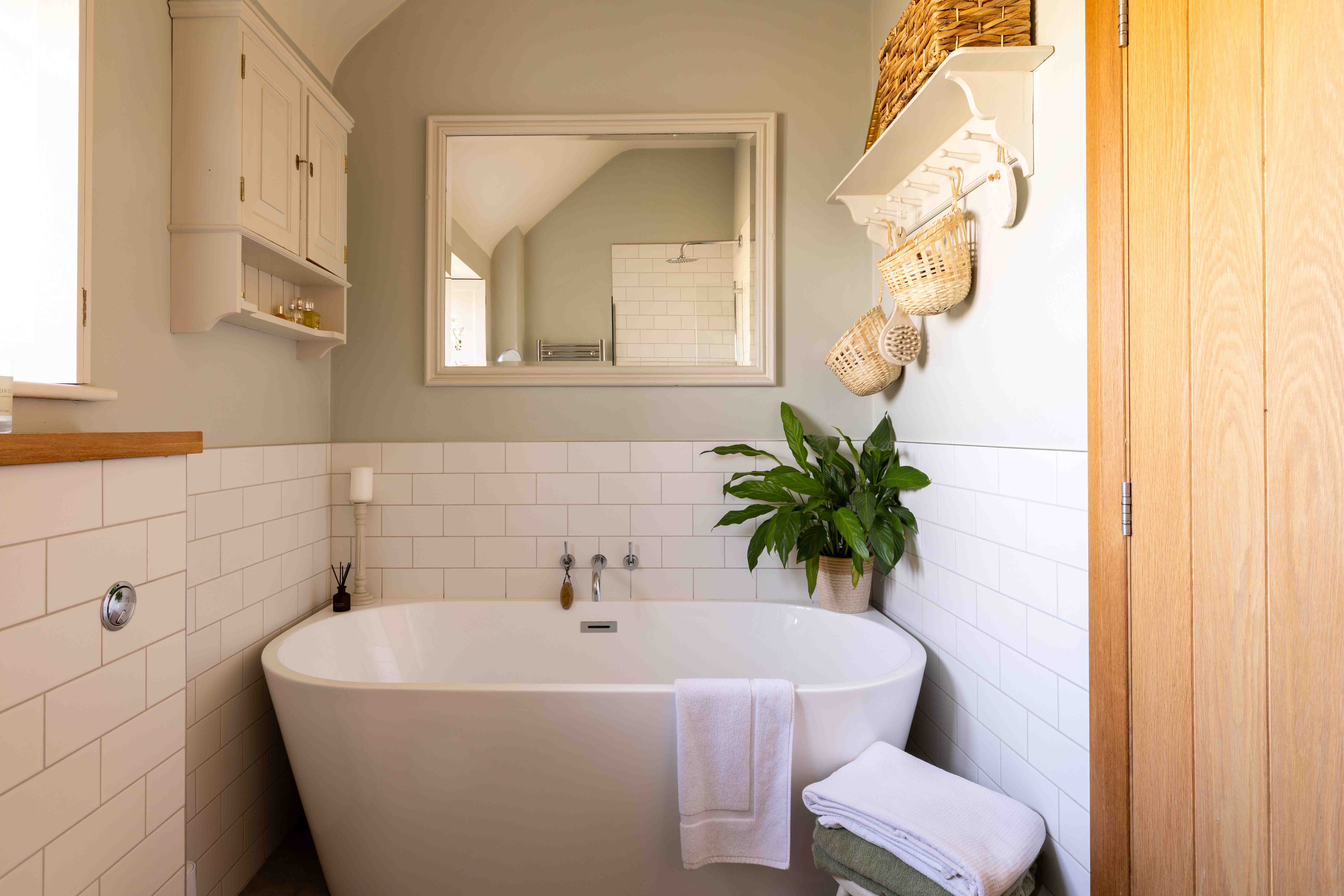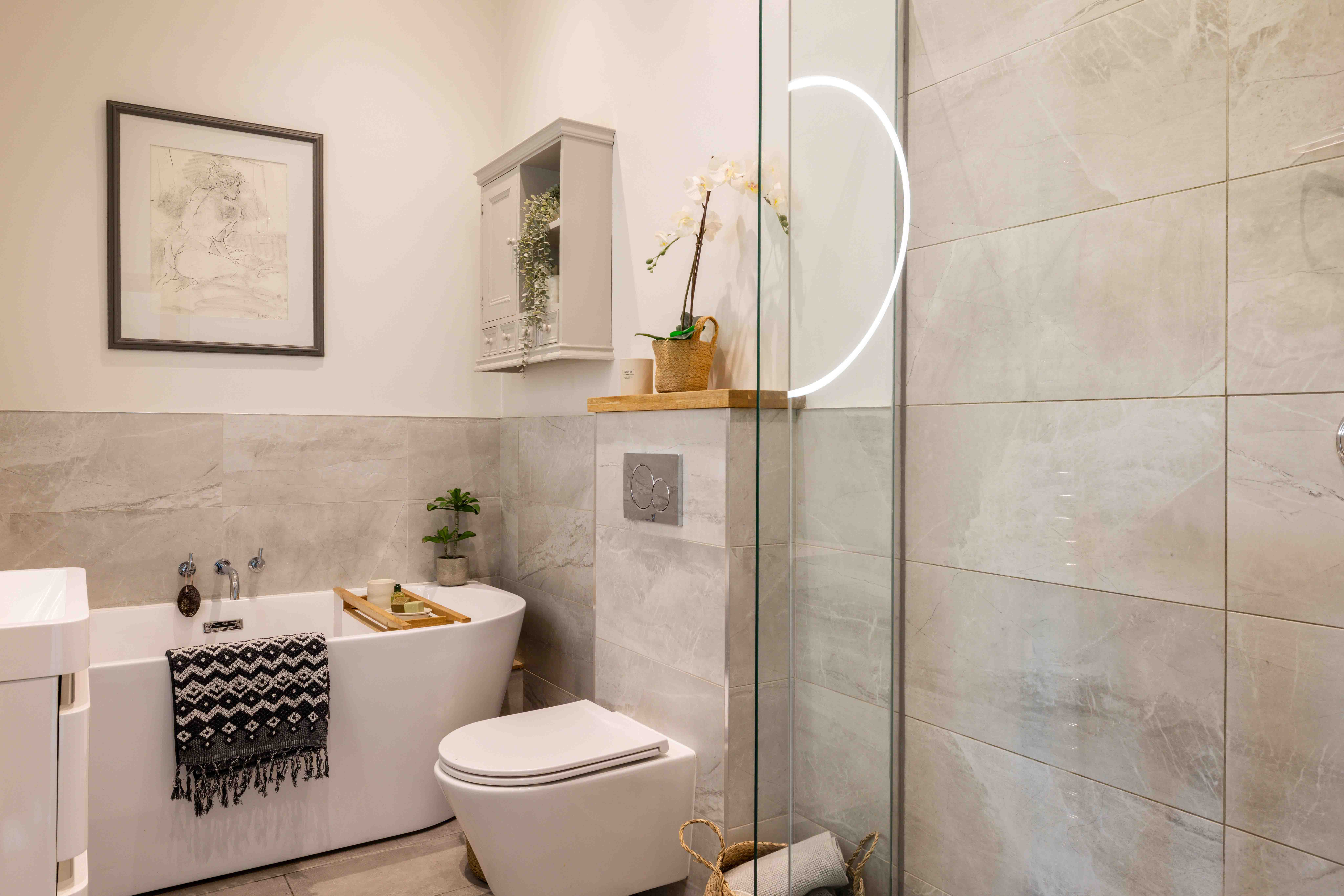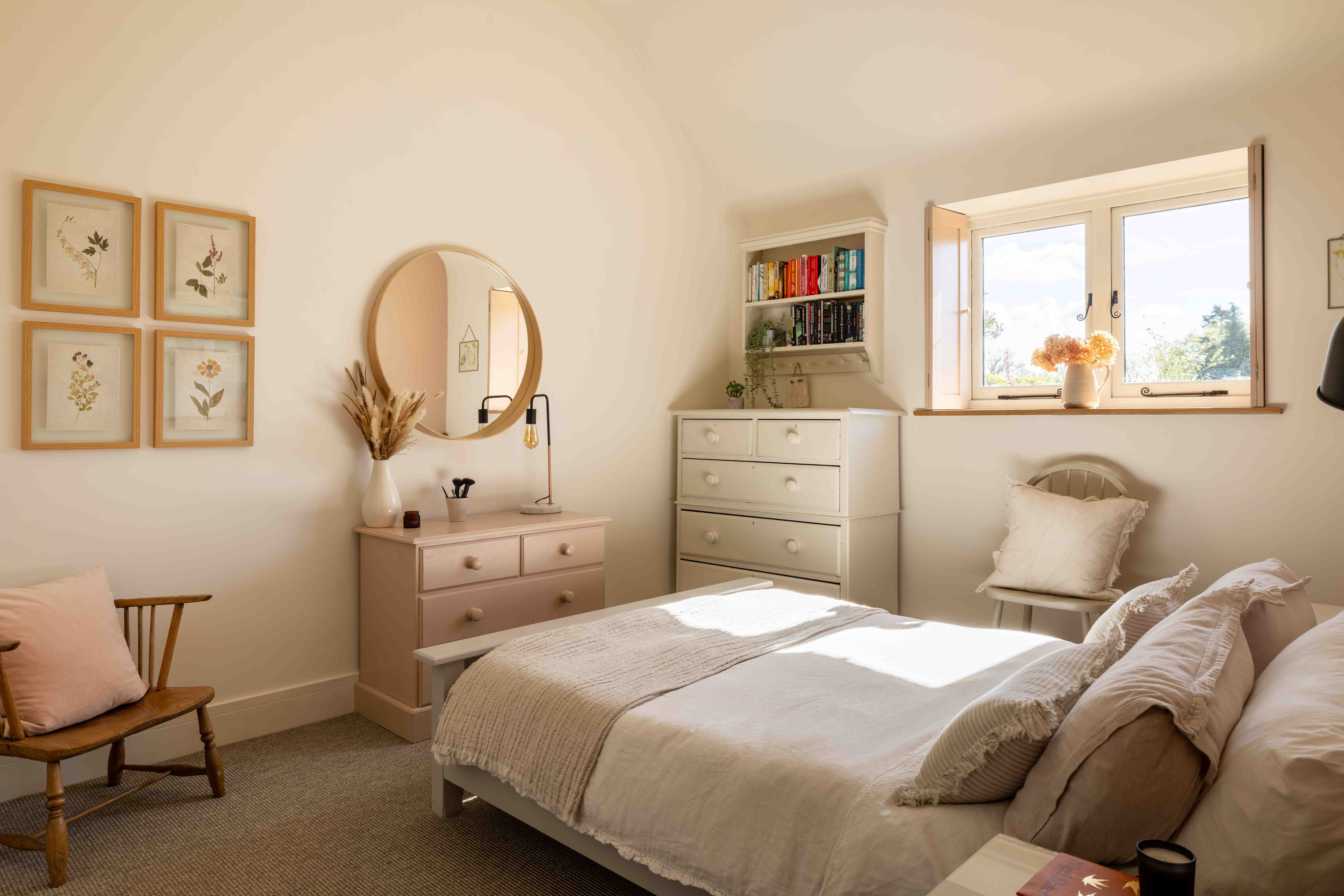 The bedrooms are thoughtfully arranged on the ground floor, each benefitting from built-in wardrobes and soft sisal-look carpeting designed to work harmoniously with the underfloor heating system. The principal suite enjoys direct access to the garden, creating a particularly calm and restorative retreat. Further storage is found in a generous plant cupboard within the hallway, ideal for drying clothes, along with additional loft space above the garage and bedrooms.
