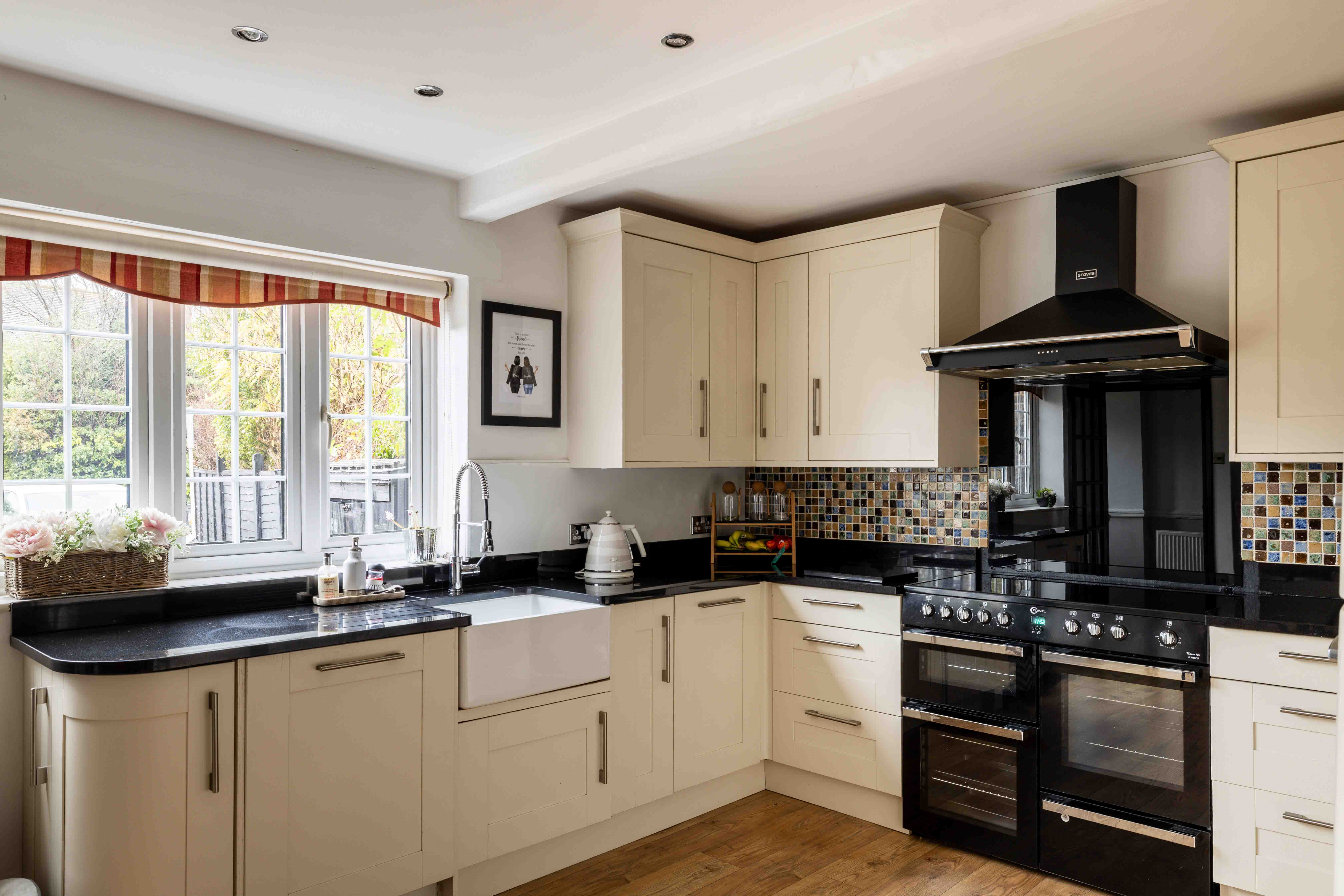 This is a house that does not shout for attention, but instead reveals its character slowly, rewarding those who appreciate light, texture and a sense of calm continuity throughout. Inside, you are welcomed directly into the kitchen, the true heartbeat of the home. Here, crisp white cabinetry creates a fresh, timeless backdrop, perfectly balanced by deep black quartz worktops that add both drama and practicality. A traditional butler’s sink sits proudly in place, lending a subtle nod to classic country living while remaining entirely suited to modern life. This is a kitchen designed for real use — from leisurely weekend breakfasts to impromptu supper with friends — yet it never loses its quiet elegance. To one side, thoughtfully tucked away, the downstairs WC and utility room ensure everyday necessities are neatly concealed, allowing the main spaces to remain uncluttered and serene.