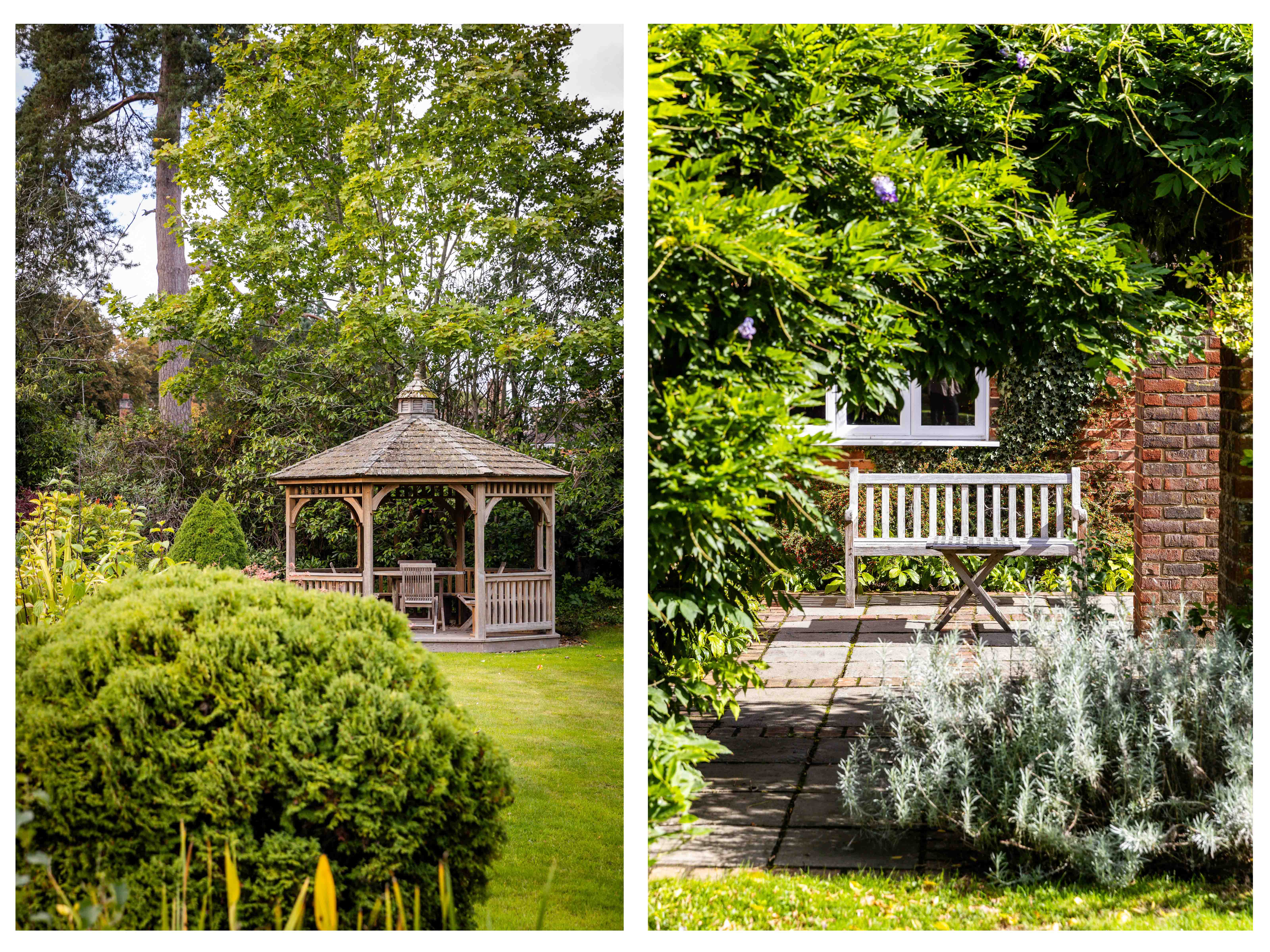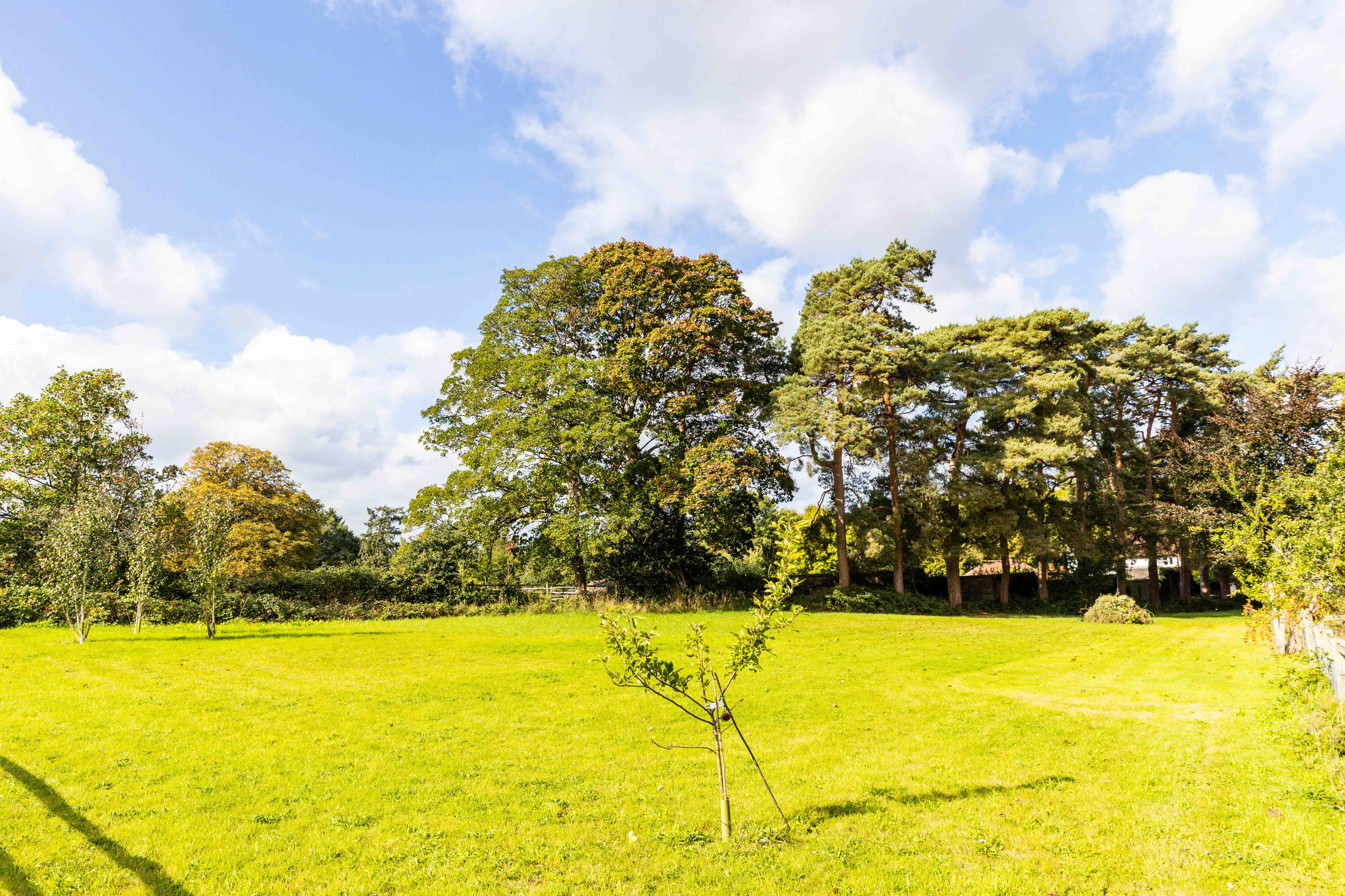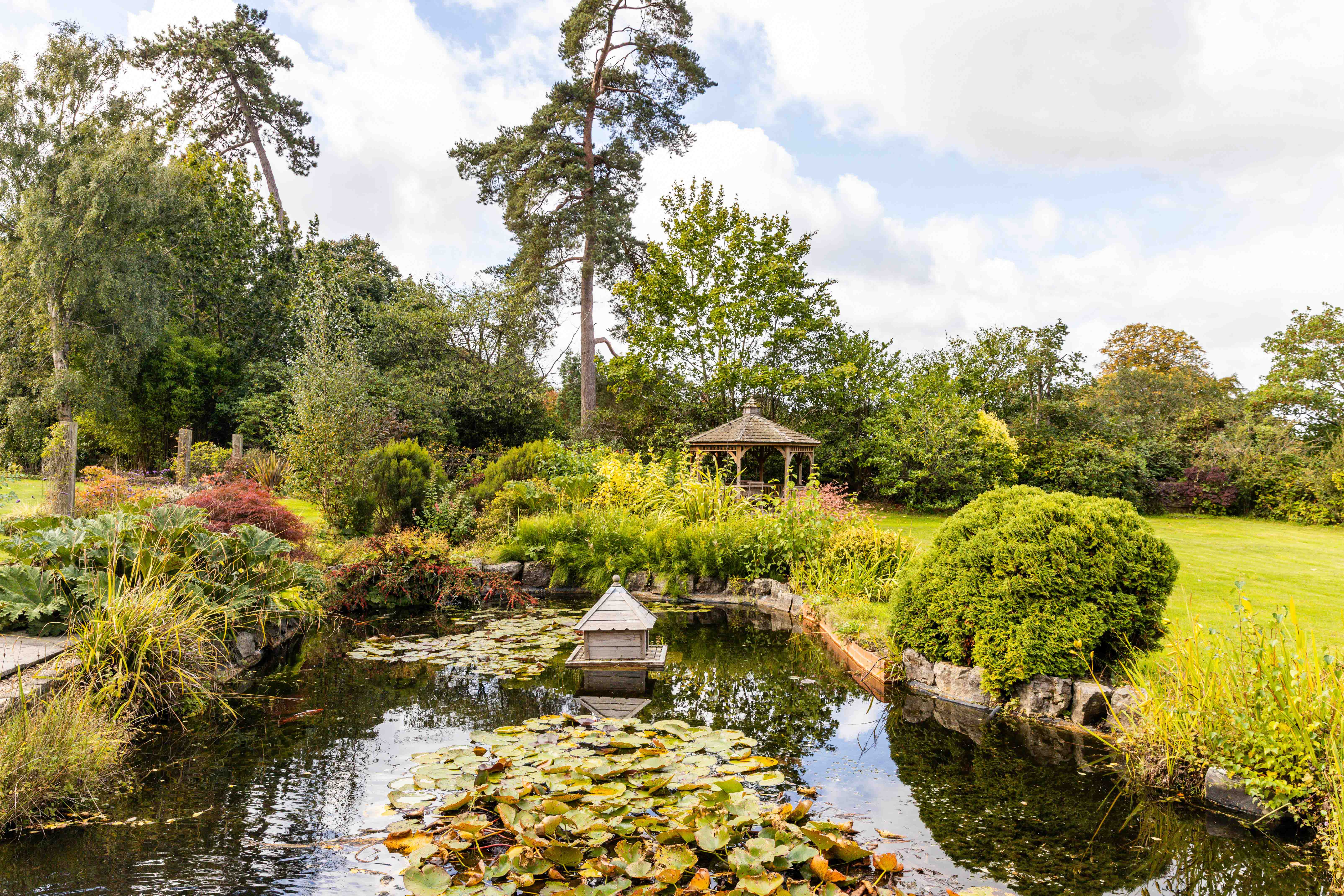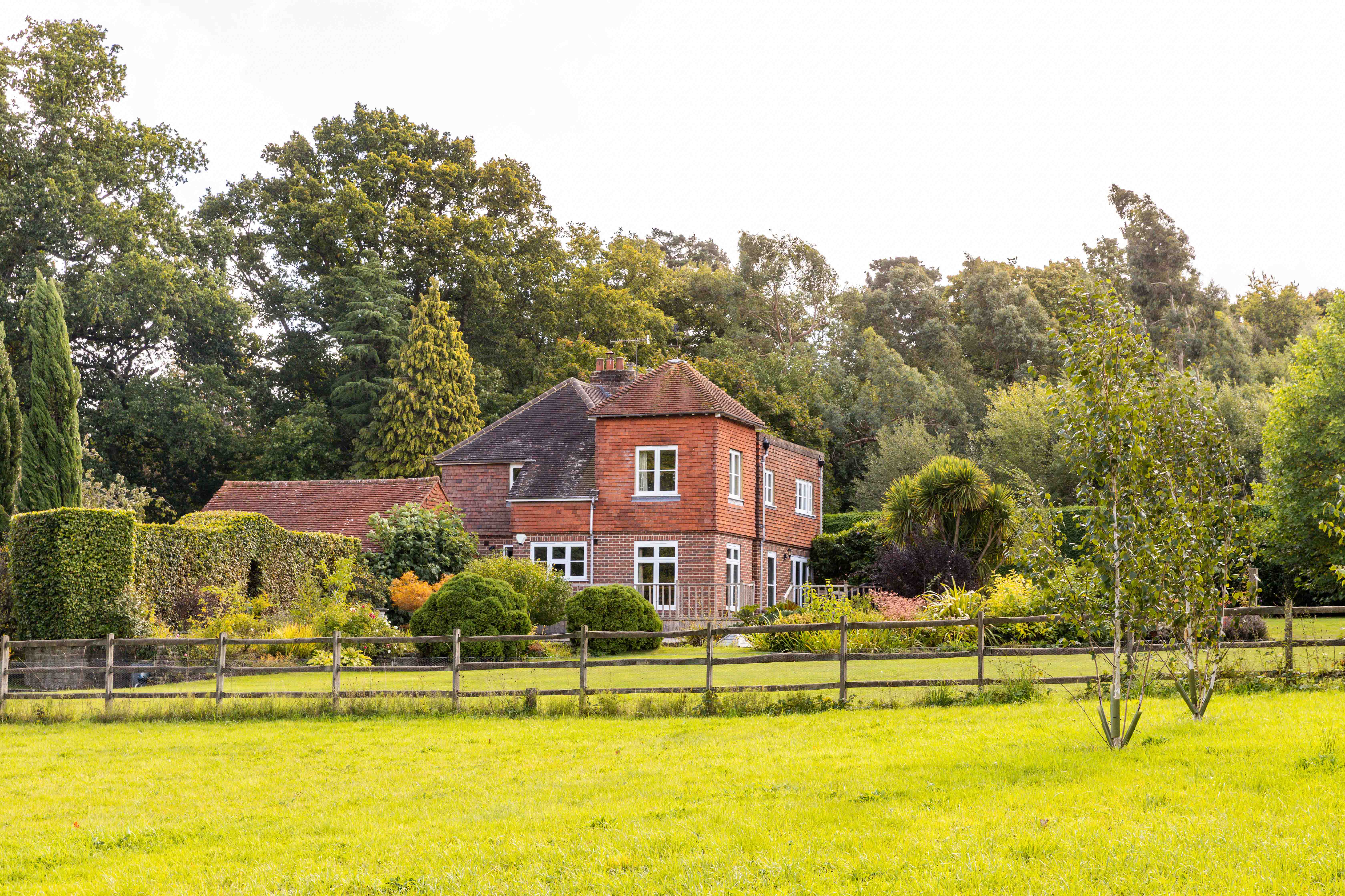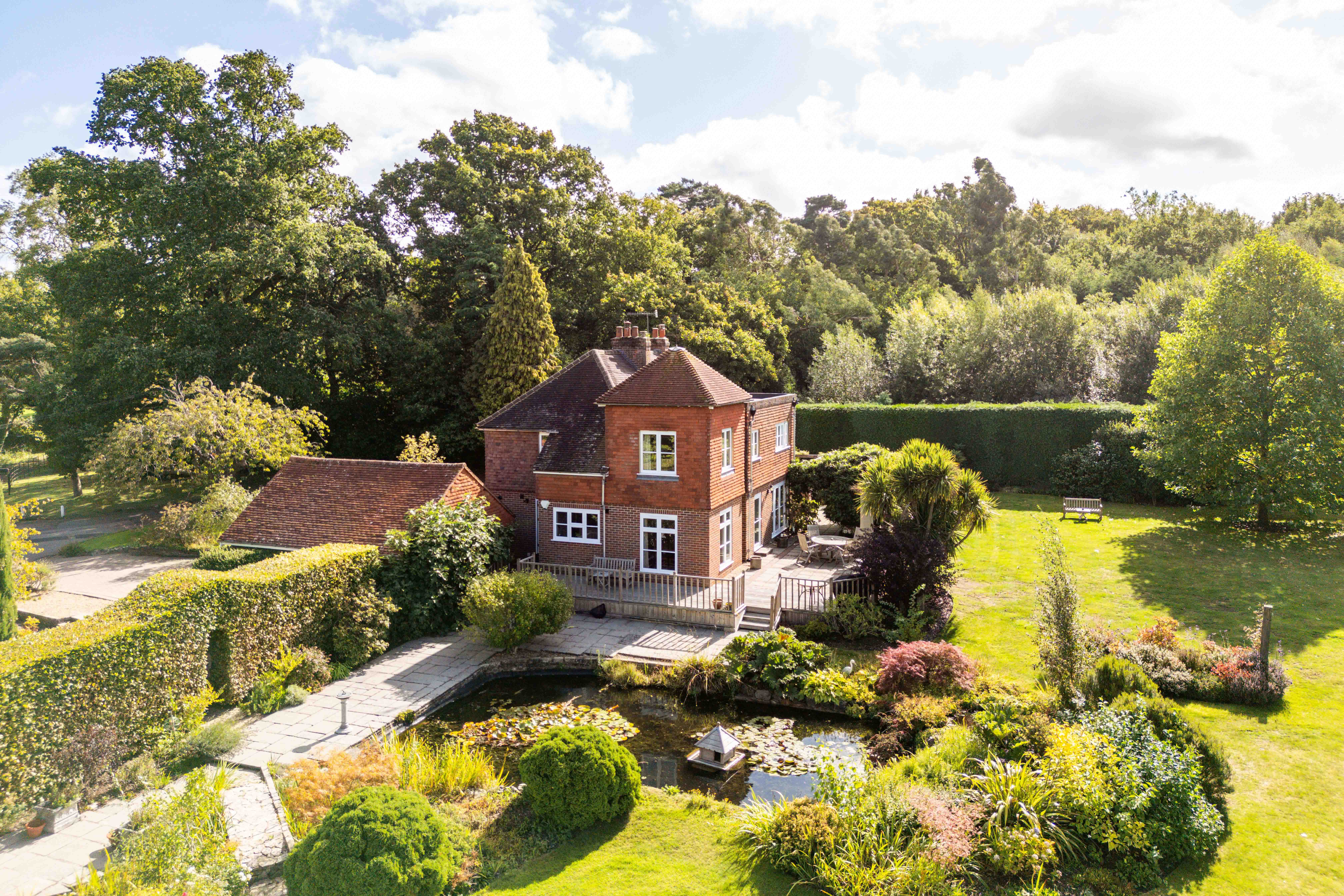 Spread across approximately an acre and a half, the grounds have been shaped into a series of outdoor rooms: wide south-facing lawns for play and leisure, a terrace for entertaining, a pond glinting in the afternoon sun, and a productive vegetable patch for those inclined towards self-sufficiency. It is a garden made for hosting—summer evenings stretching long with friends and family, the house itself a backdrop to life lived in harmony with nature.