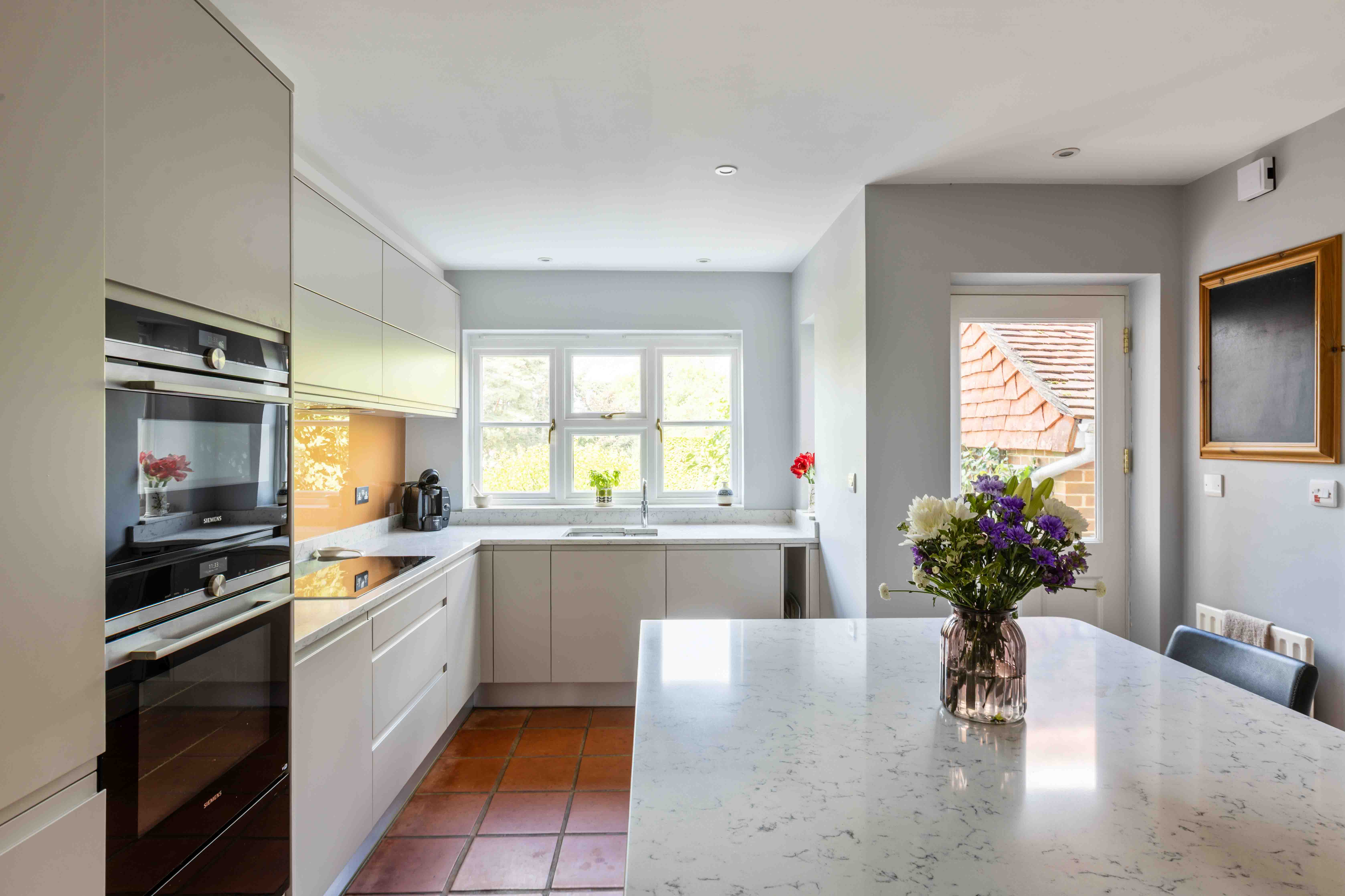 Inside, warm tones lend a sense of calm to the five bedrooms, three bathrooms, and two reception rooms. The flow of the house is thoughtful, offering spaces to gather and to retreat. Light filters through generously sized windows, catching the soft textures of natural materials, while the kitchen and reception areas open to the garden beyond—a garden that feels very much an extension of the living space.
