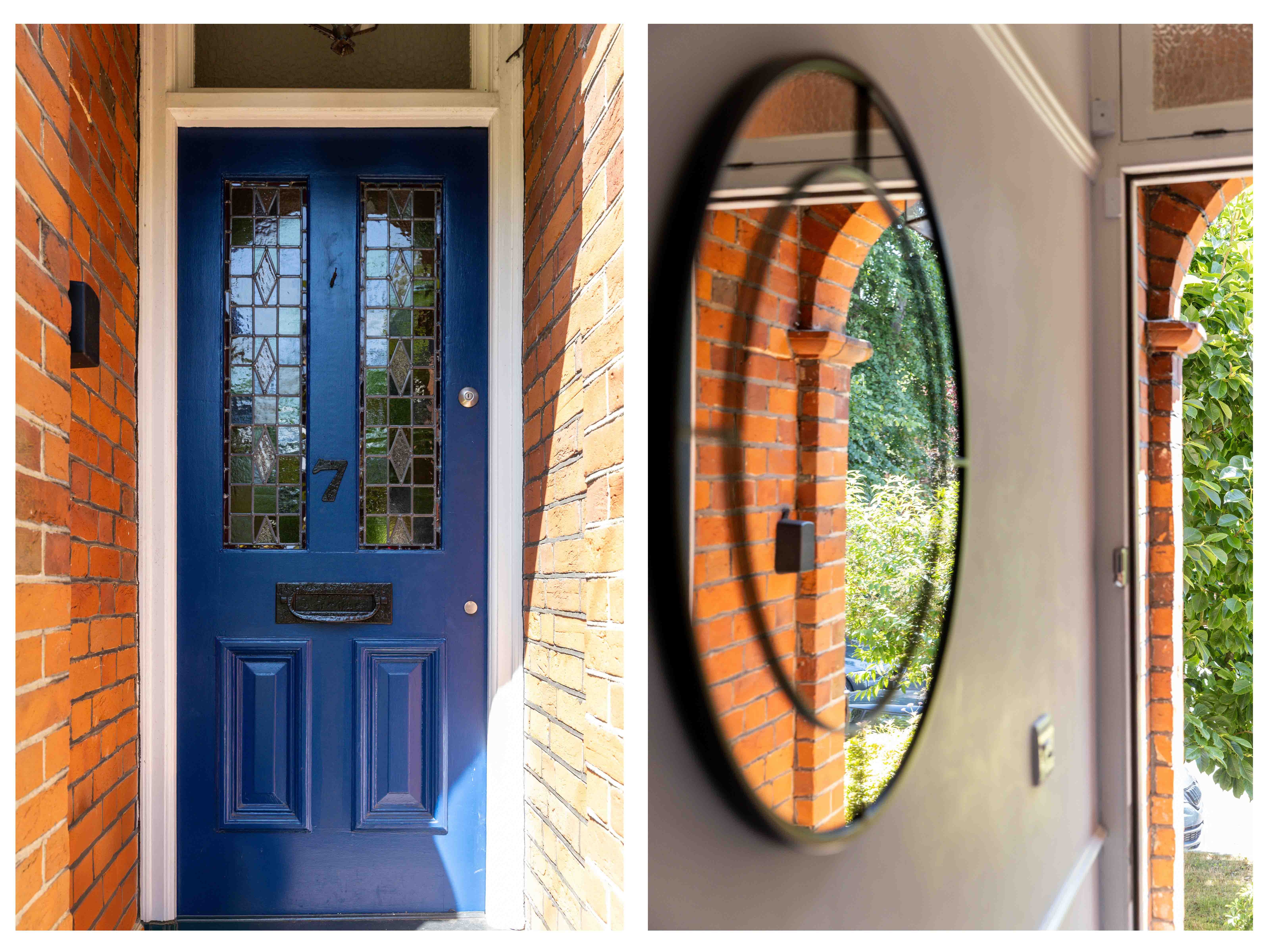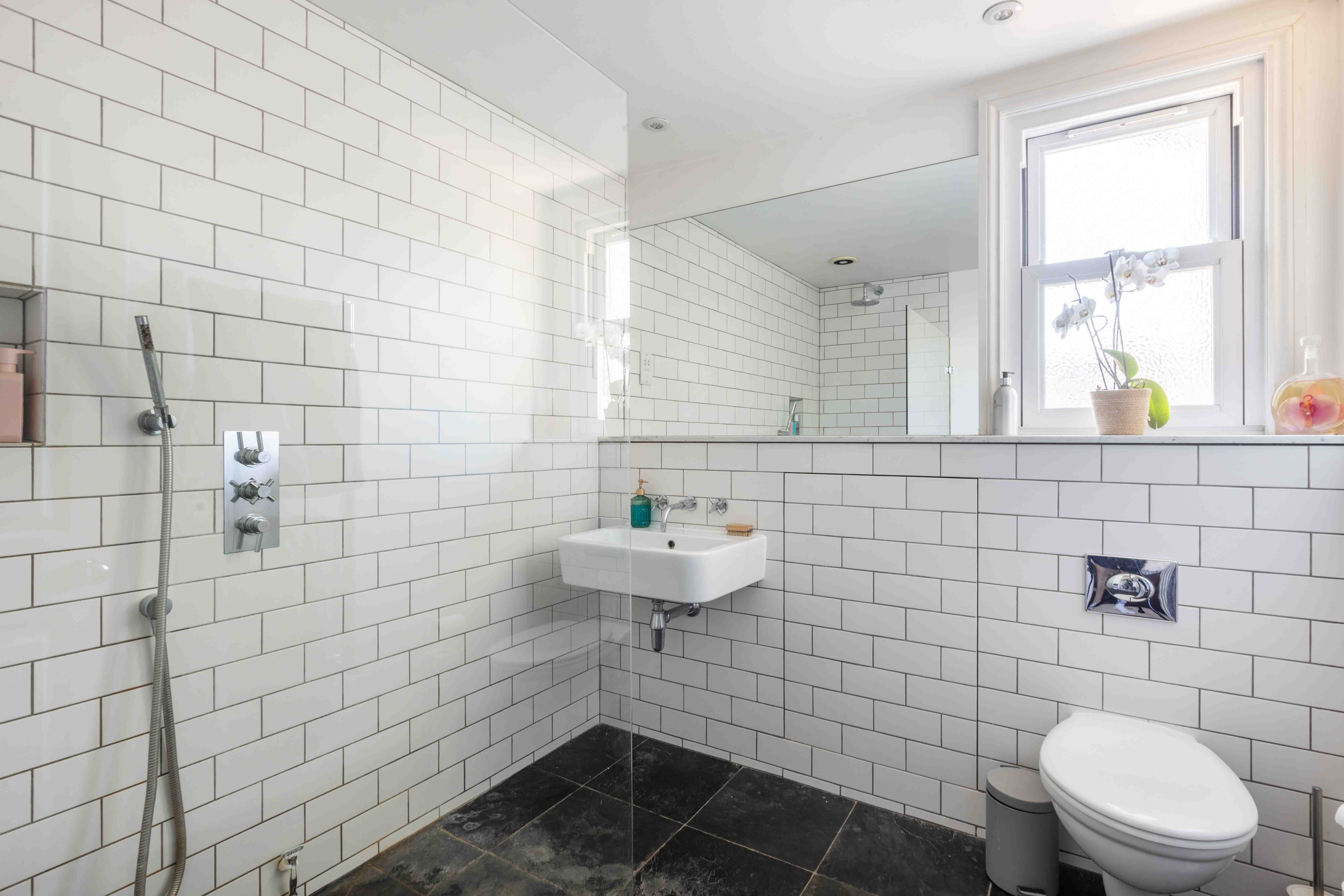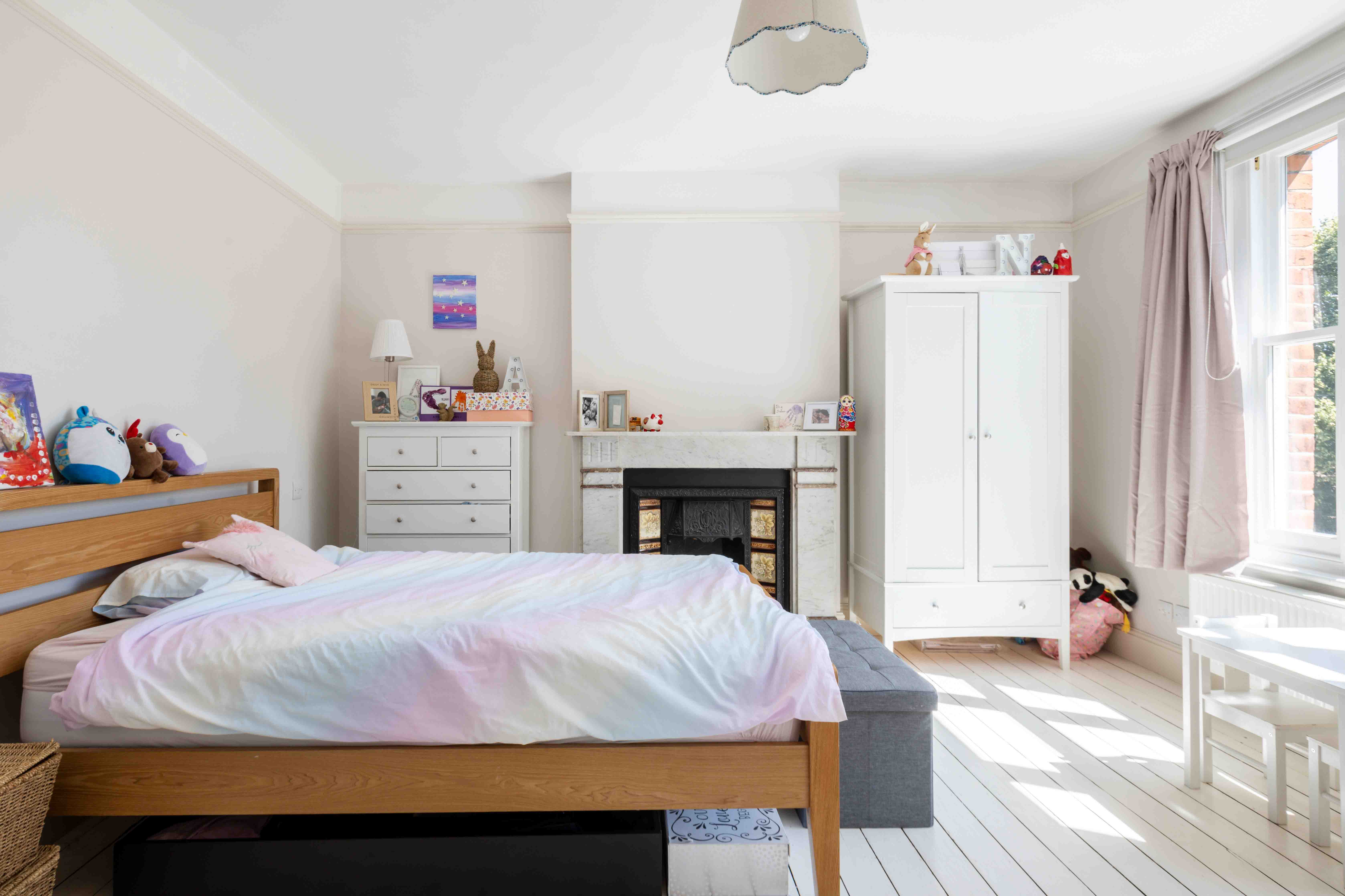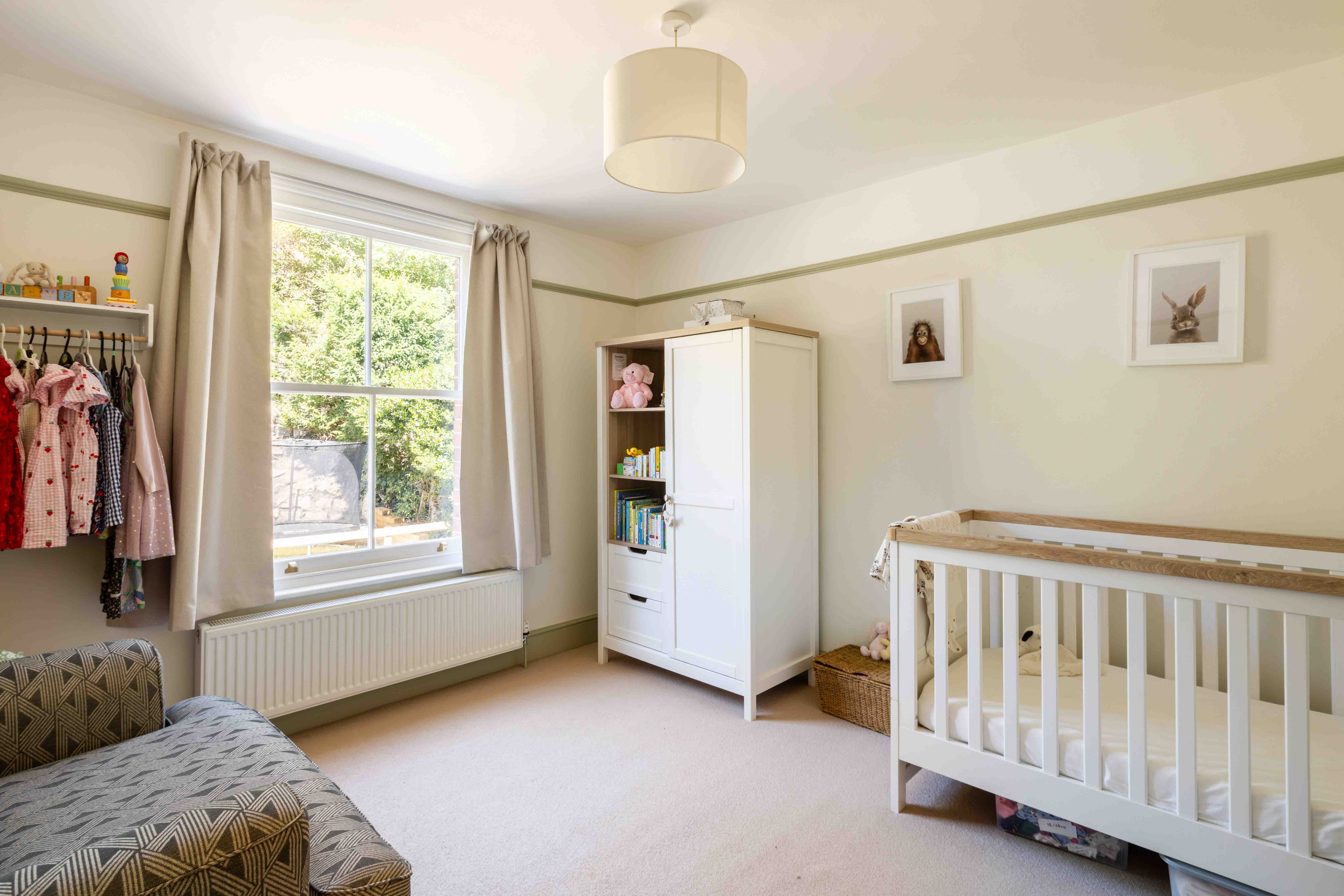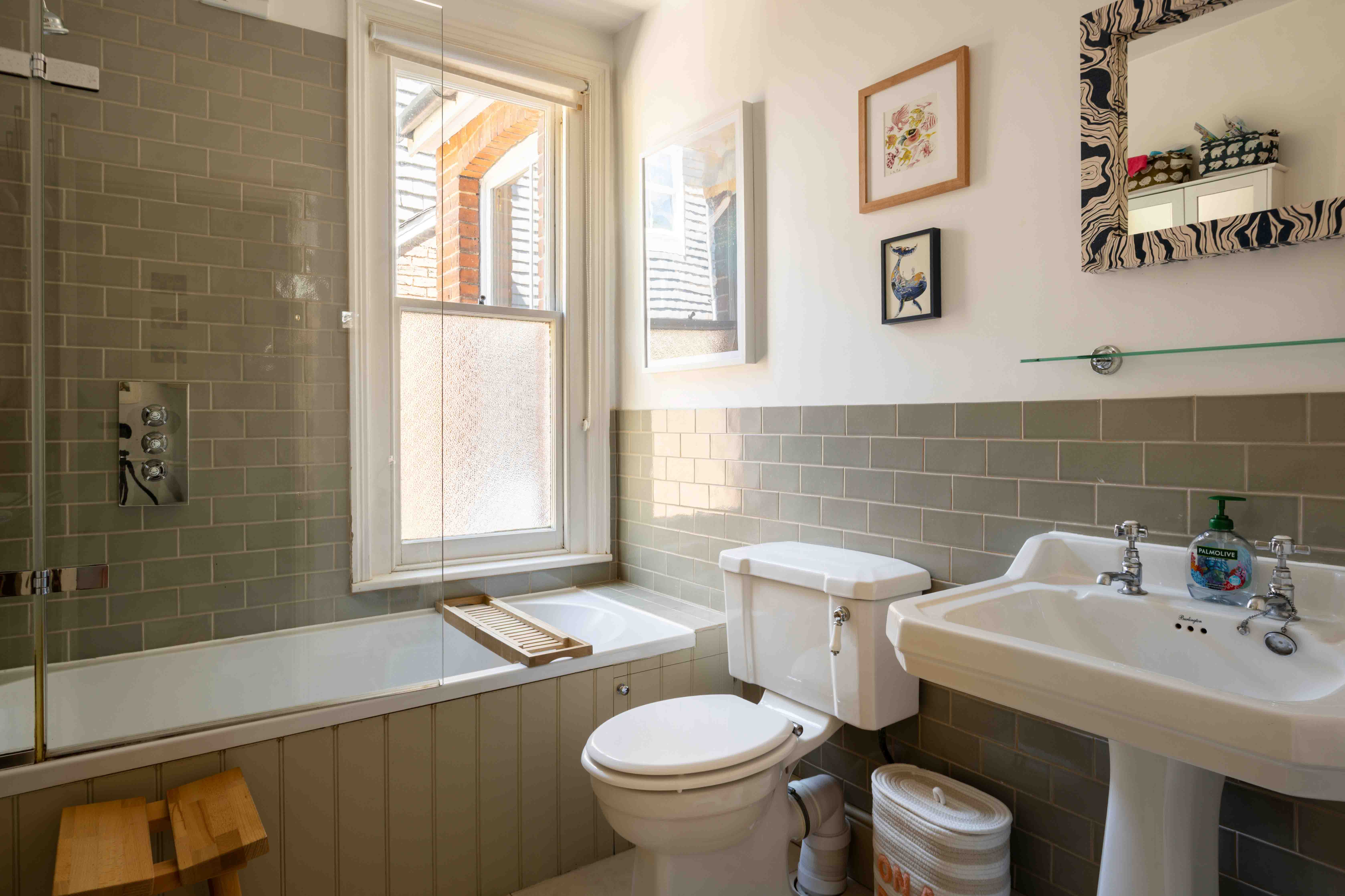On the first floor, three doubles are served by a beautifully styled family bathroom: soft green tones, tongue and groove panelling, and hotel-luxe Burlington sanitary ware under a large window that floods the space with natural light. The front bedroom mirrors the charm of the sitting room below, with its own decorative fireplace, and all rooms offer leafy outlooks to either the mature front garden or the layered greenery at the rear.
