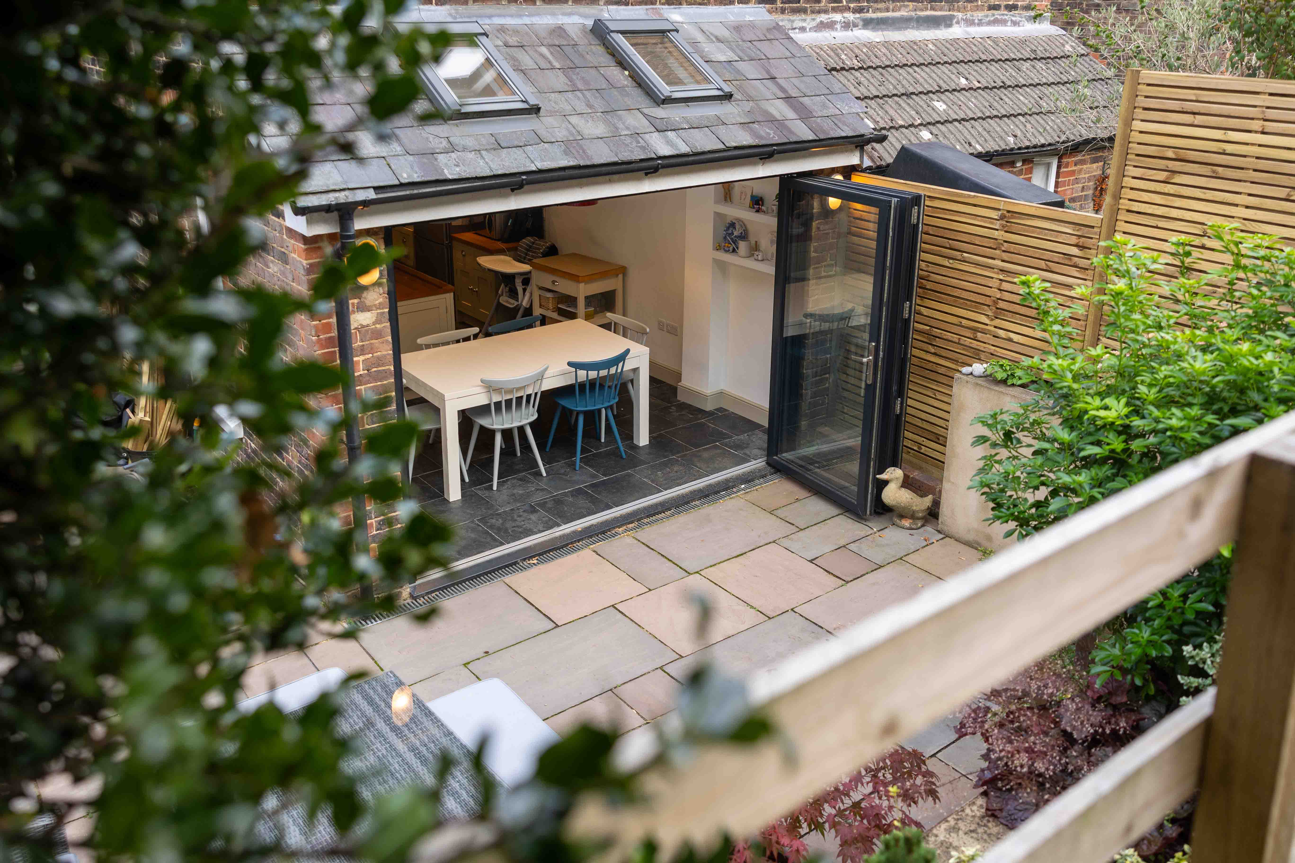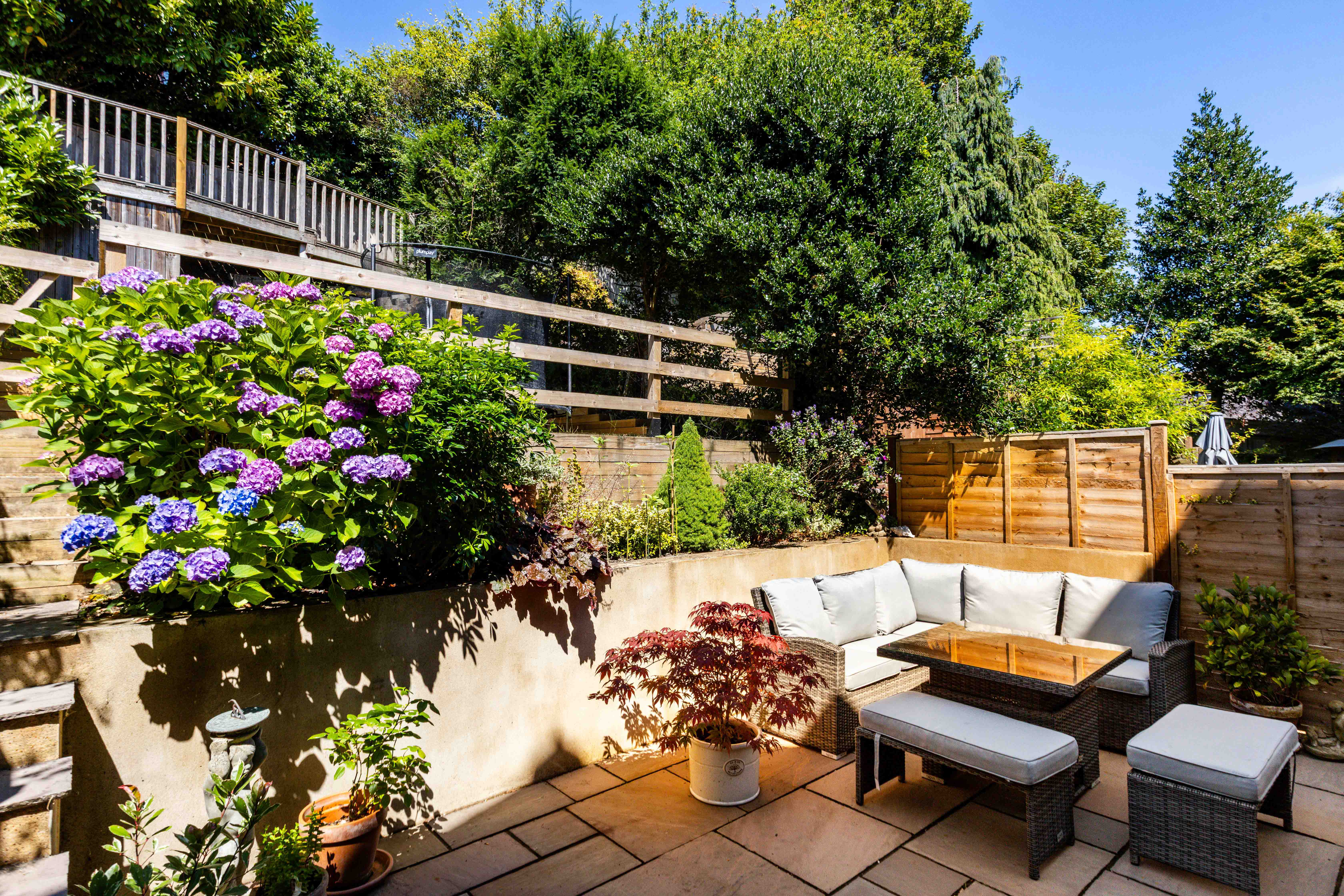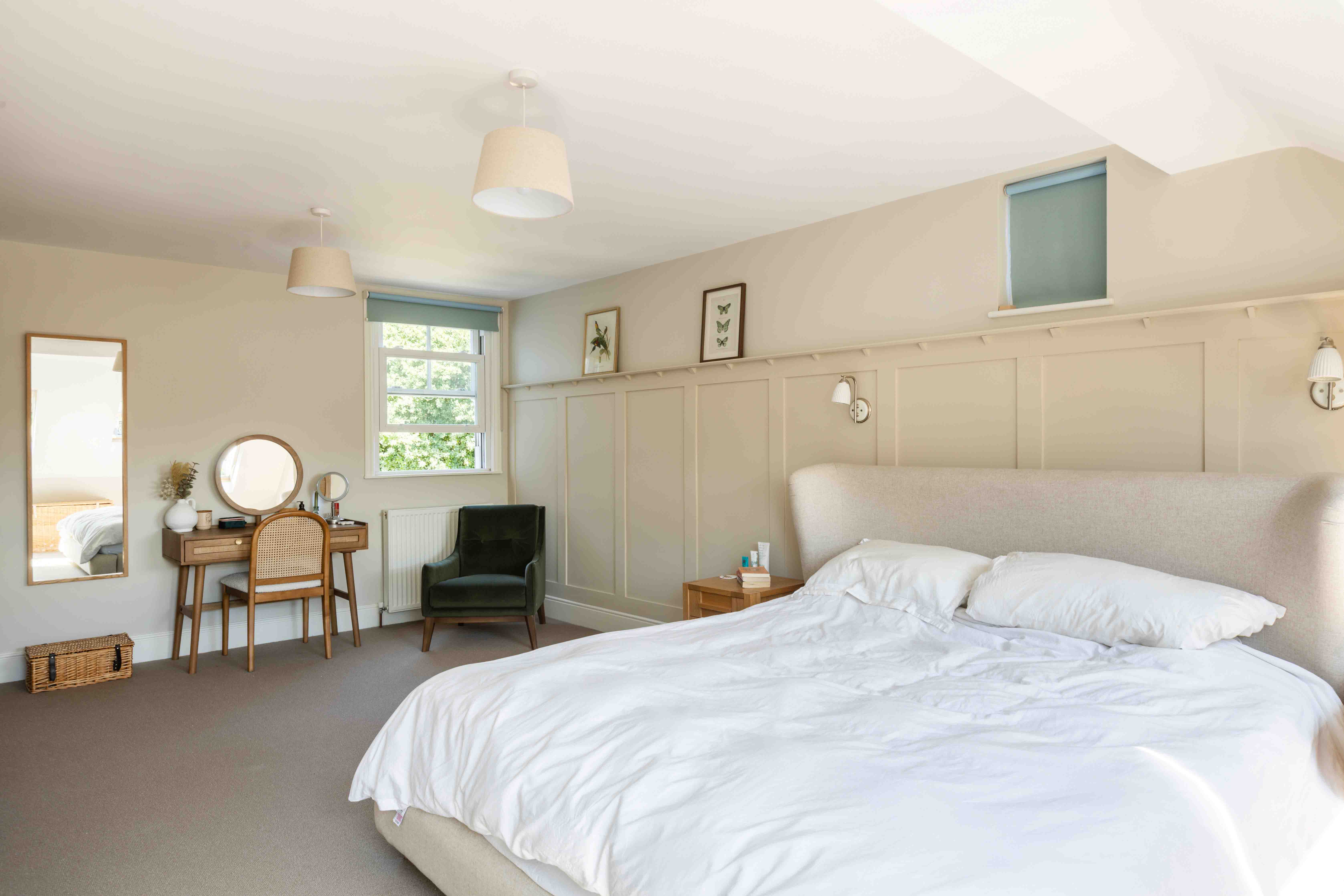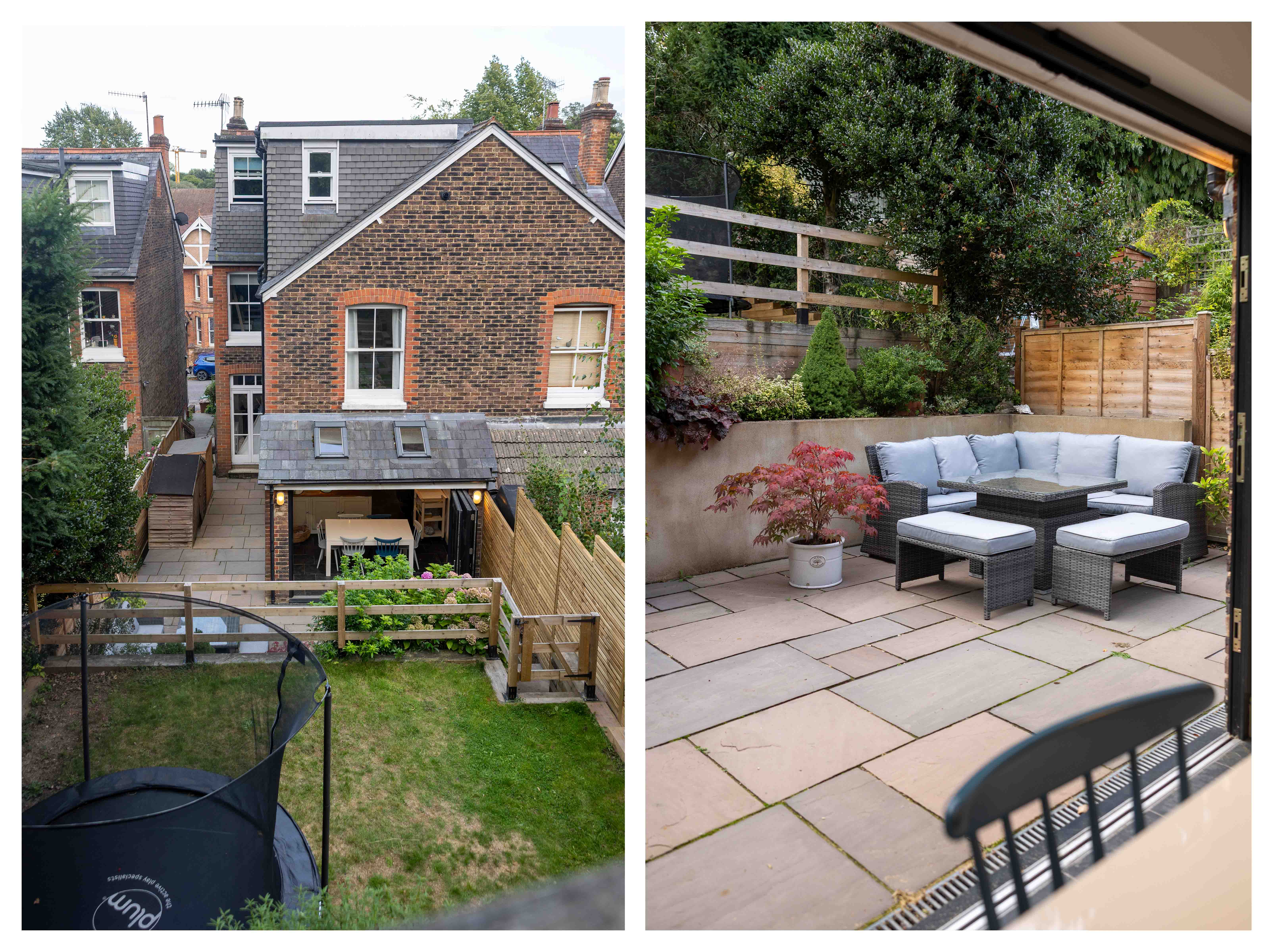 The kitchen/breakfast room is a real heart-of-the-home moment: a masterclass in how to honour an older property while embracing the practicalities of modern living. Soft-toned shaker cabinetry, oak worktops, and tongue-and-groove panelling create a warm, timeless feel, while metro tiles and chrome hardware add a dash of crisp polish. Skylights and bifold doors let the light dance through, drawing you out into a garden that’s pure lifestyle goals - part Mediterranean-inspired patio with micro-cemented walls for alfresco dinners, part tiered English garden with mature planting, a west-facing lawn for golden hour games, and a tucked-away spot perfect for the BBQ.