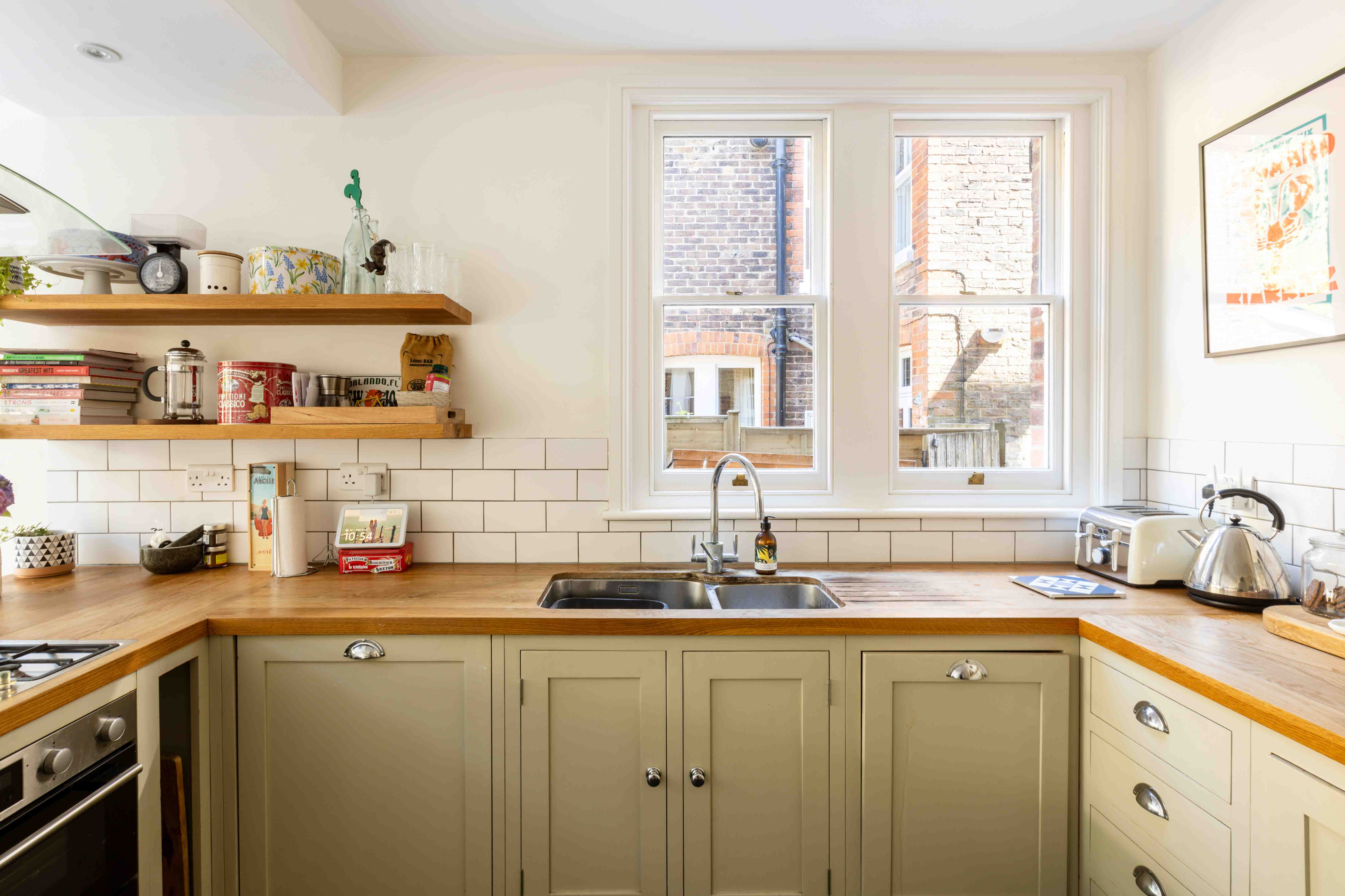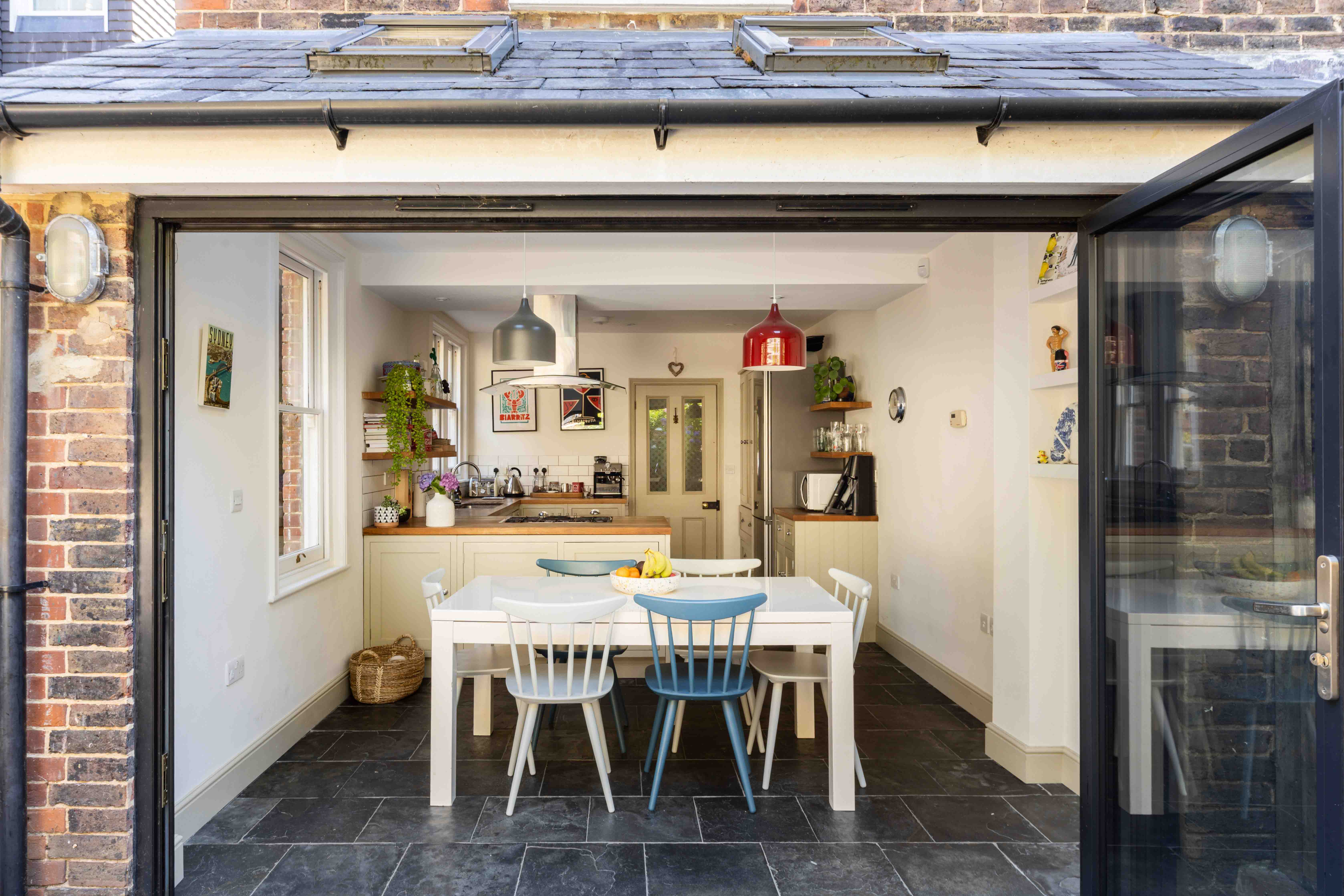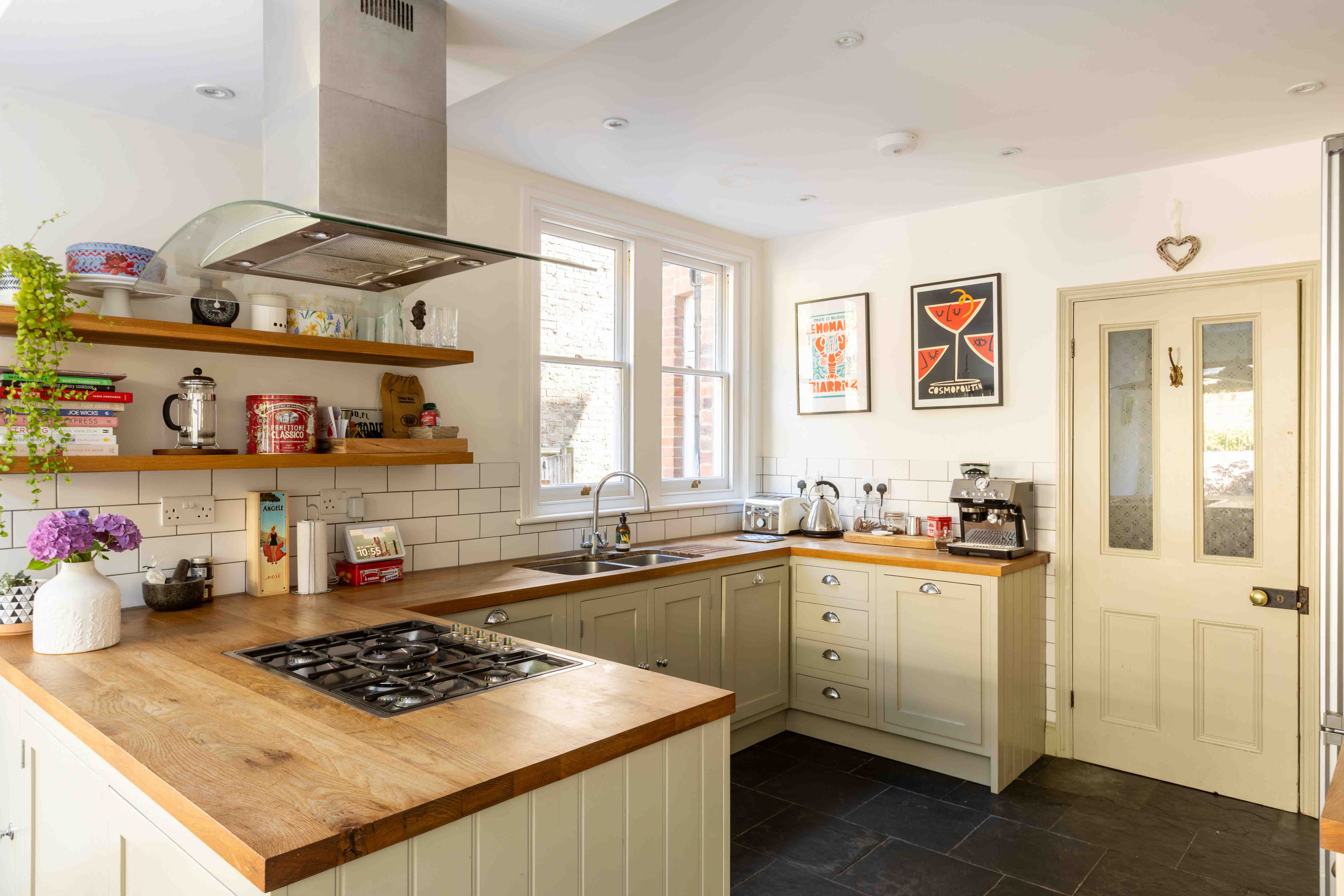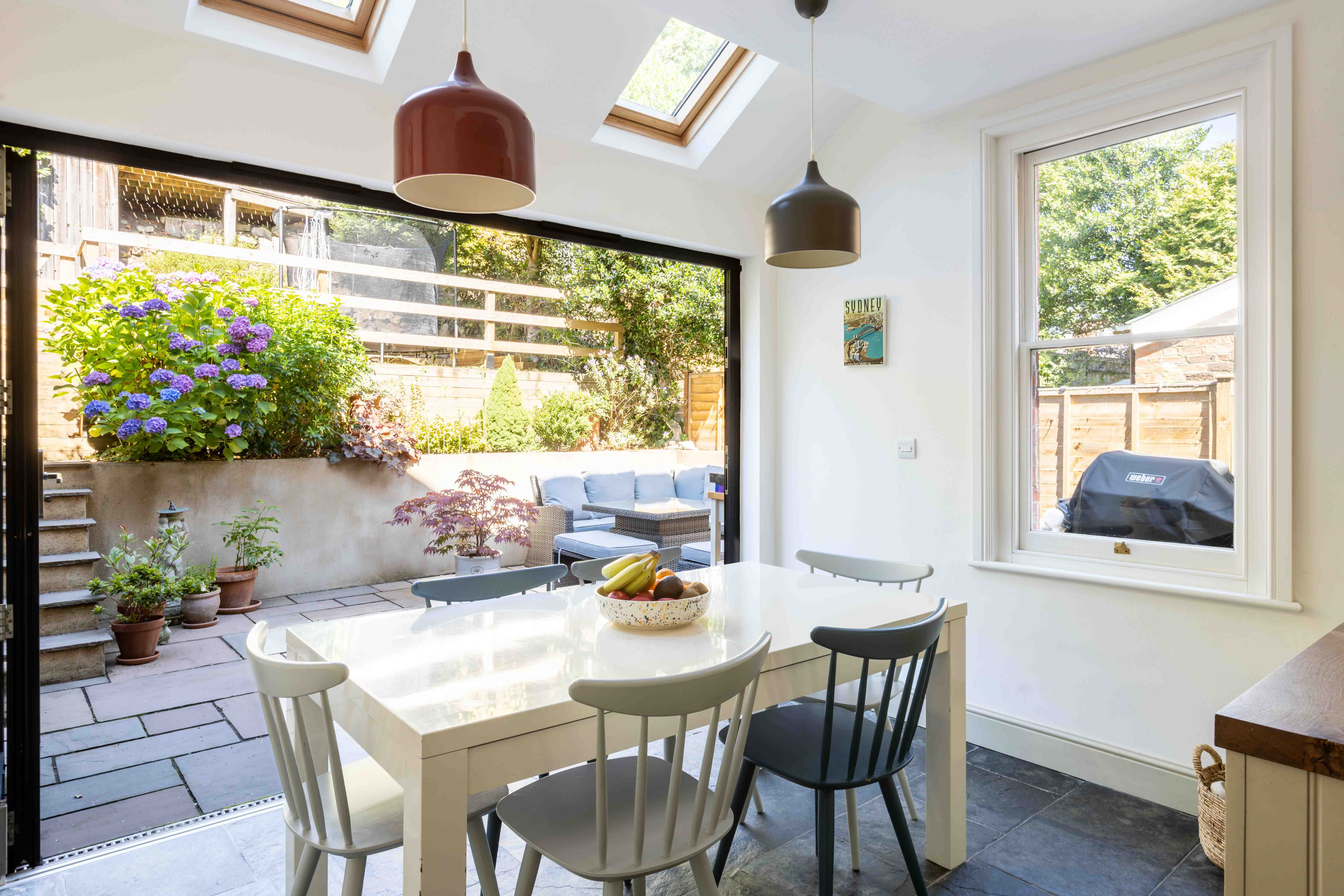 The kitchen/breakfast room is a real heart-of-the-home moment: a masterclass in how to honour an older property while embracing the practicalities of modern living. Soft-toned shaker cabinetry, oak worktops, and tongue-and-groove panelling create a warm, timeless feel, while metro tiles and chrome hardware add a dash of crisp polish. Skylights and bifold doors let the light dance through, drawing you out into a garden that’s pure lifestyle goals - part Mediterranean-inspired patio with micro-cemented walls for alfresco dinners, part tiered English garden with mature planting, a west-facing lawn for golden hour games, and a tucked-away spot perfect for the BBQ.