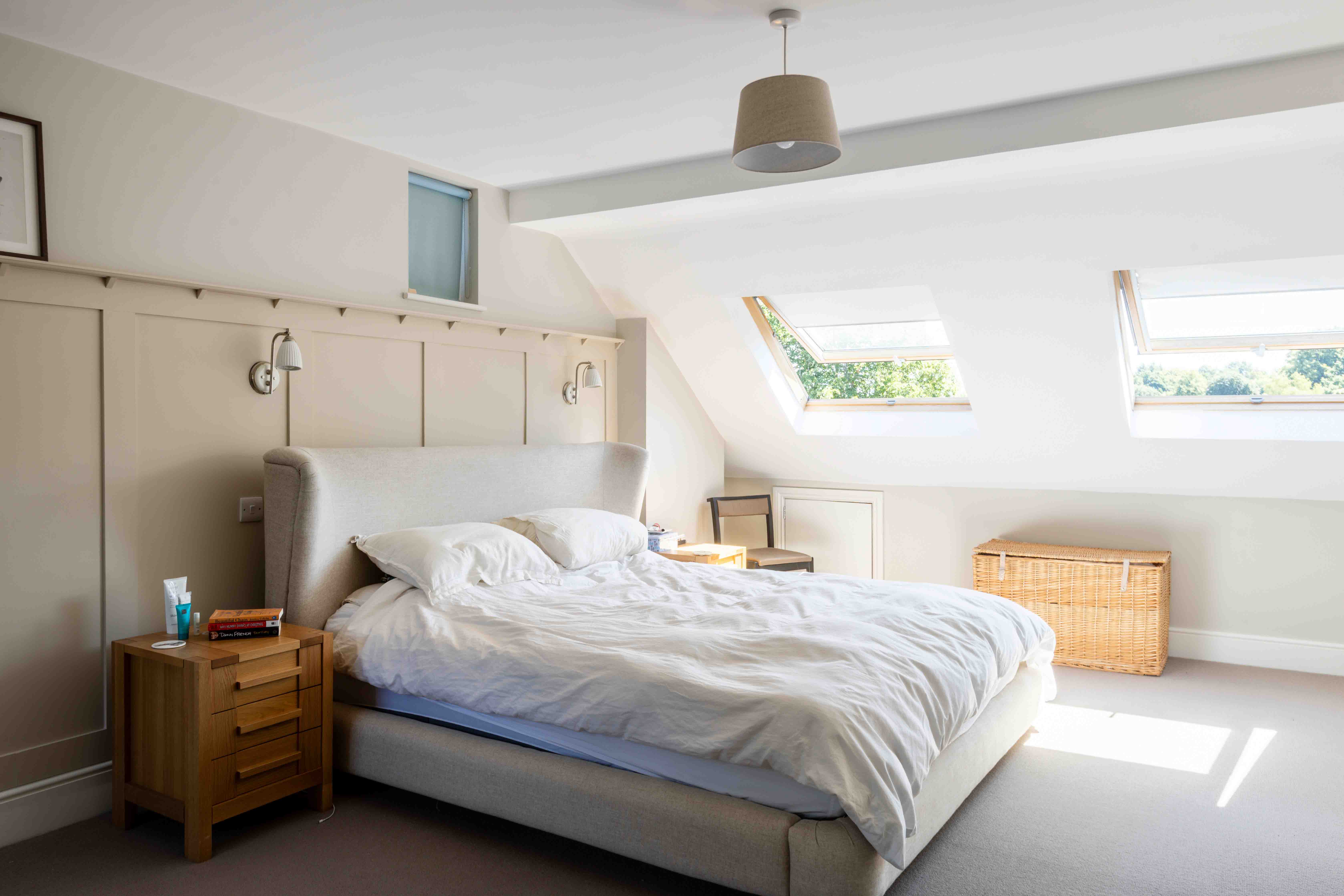 The top floor houses a serene principal suite, a spacious retreat with calming paint colours, statement wall lights, and plenty of under-eaves storage. The adjoining shower room feels chic and practical, with metro tiles, a large walk-in shower, and modern fixtures. A fifth bedroom next door doubles as the perfect work-from-home spot or could be adapted into a dressing room, should you wish to create a true sanctuary across the entire second floor.