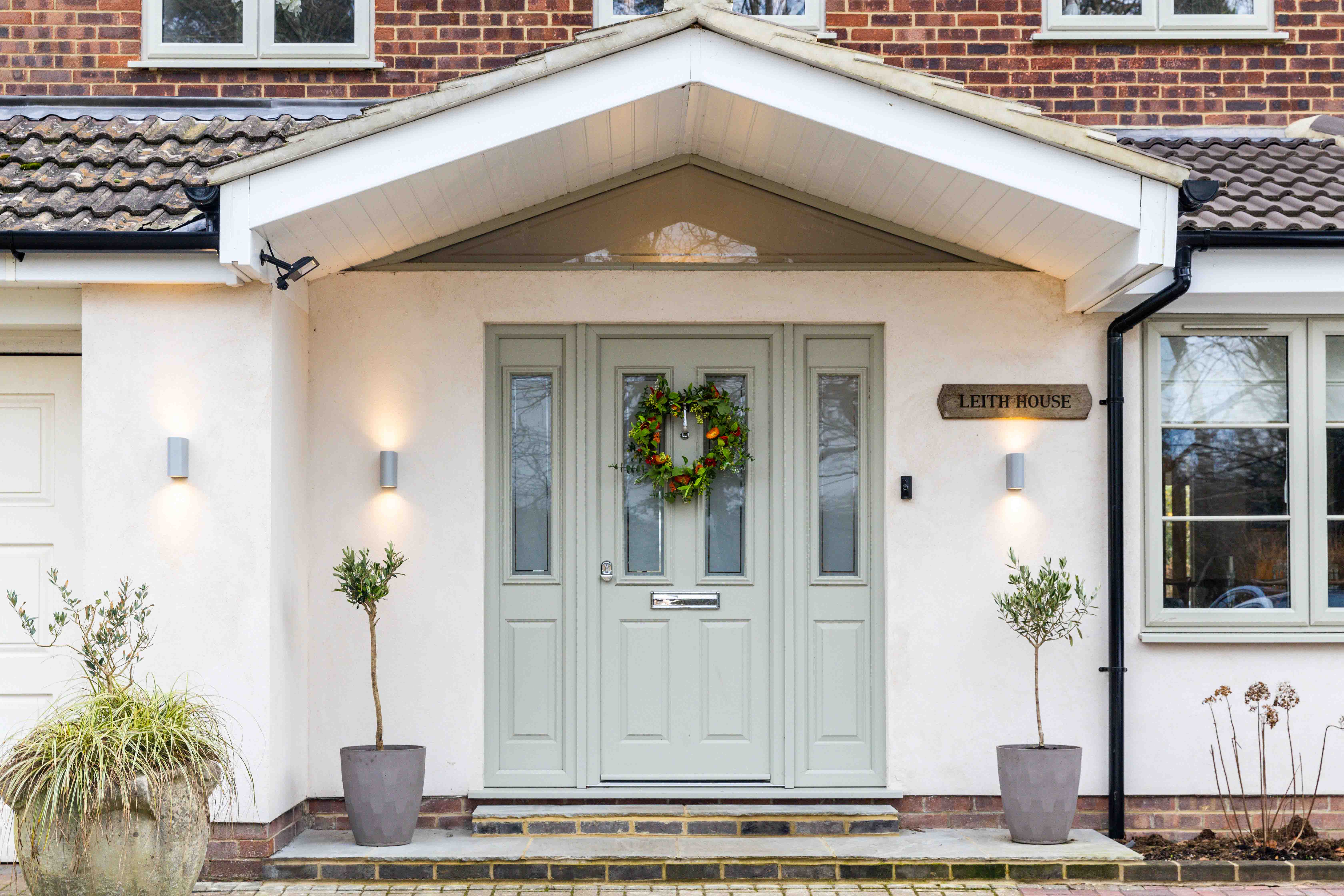 With its striking facade of white render, red brick, and sage windows, this property is as beautiful as its setting. The impressive traditional entrance beneath a dormer porch makes for a grand entrance, complemented by a spacious driveway and large garage offering ample parking.