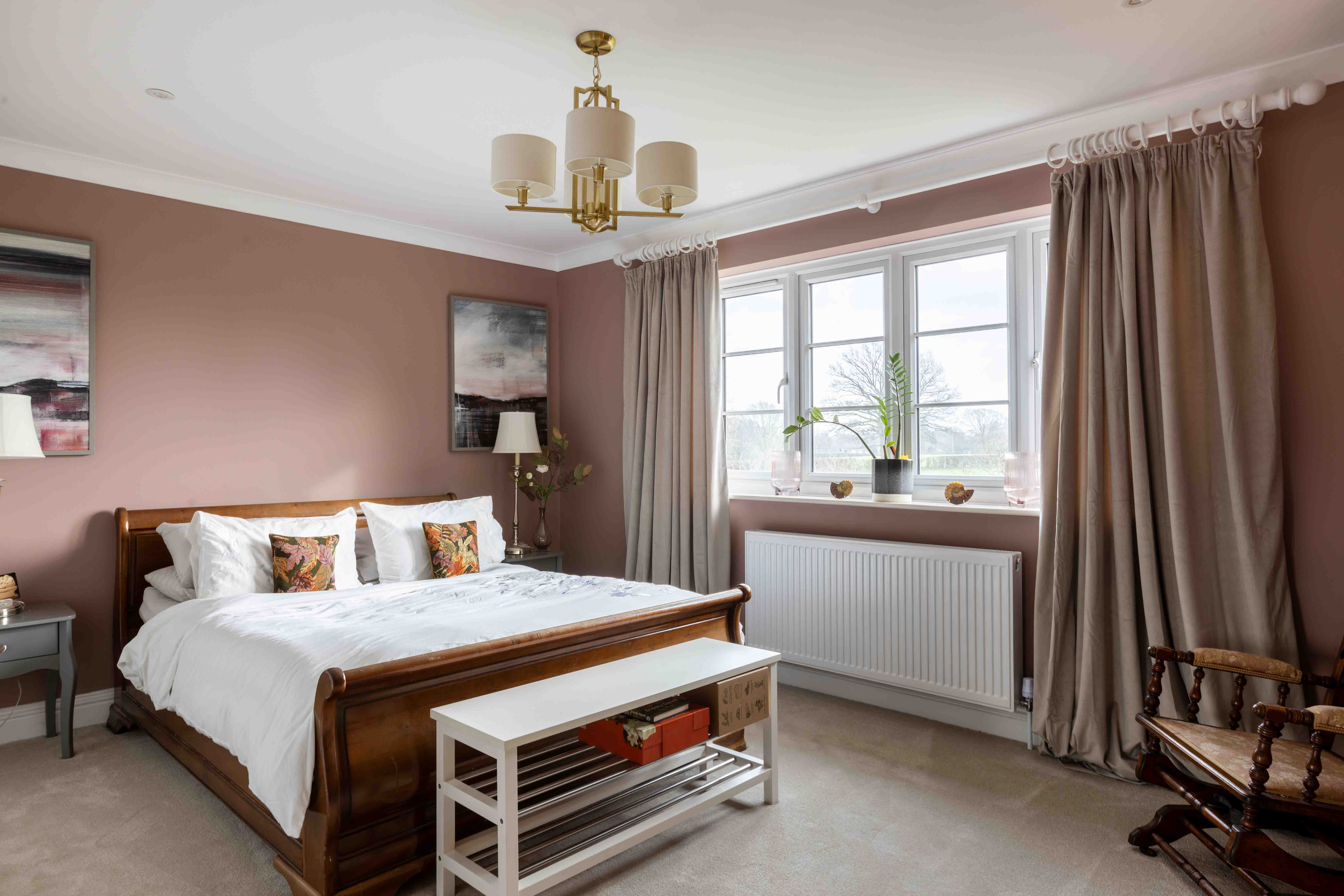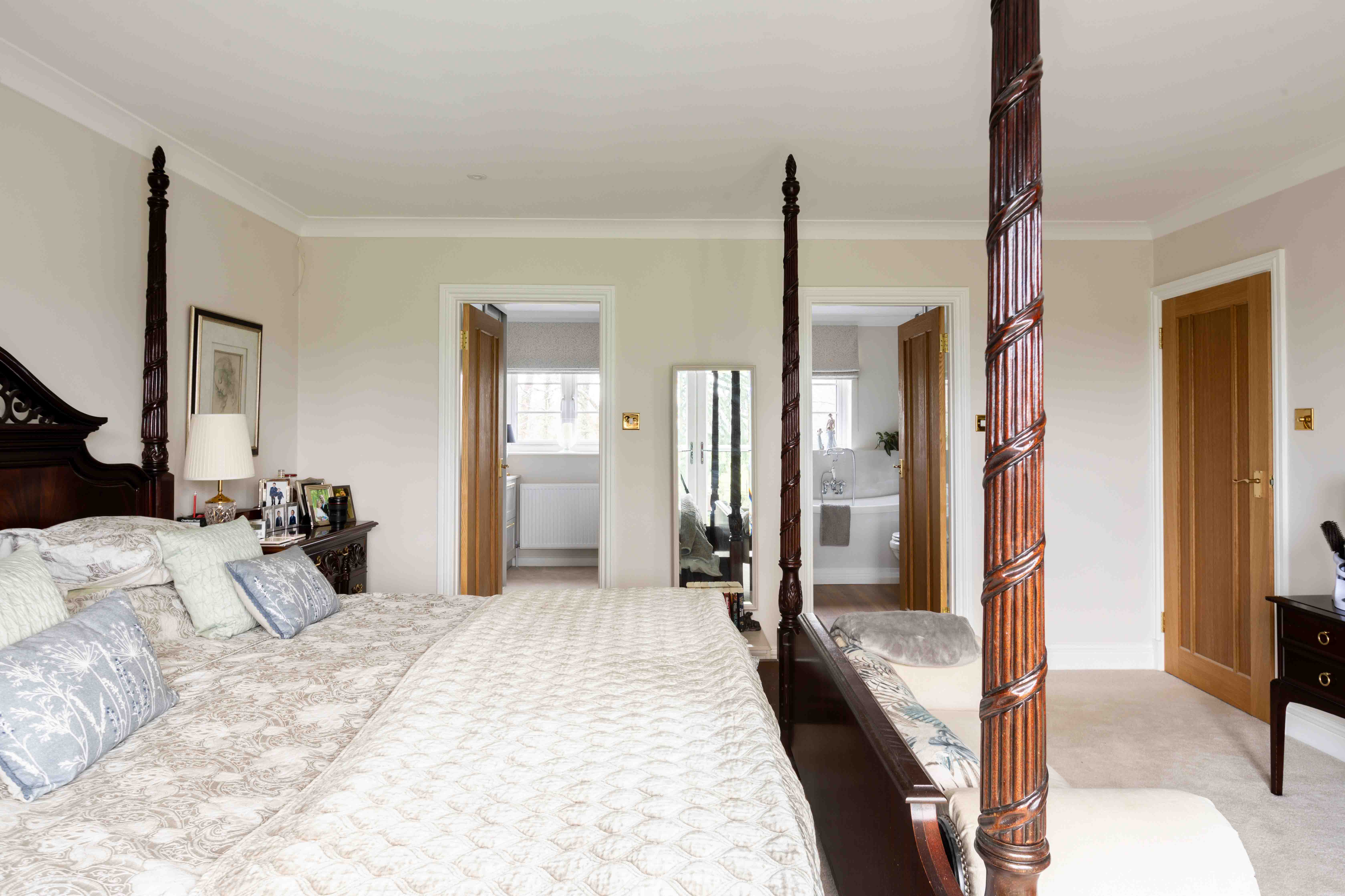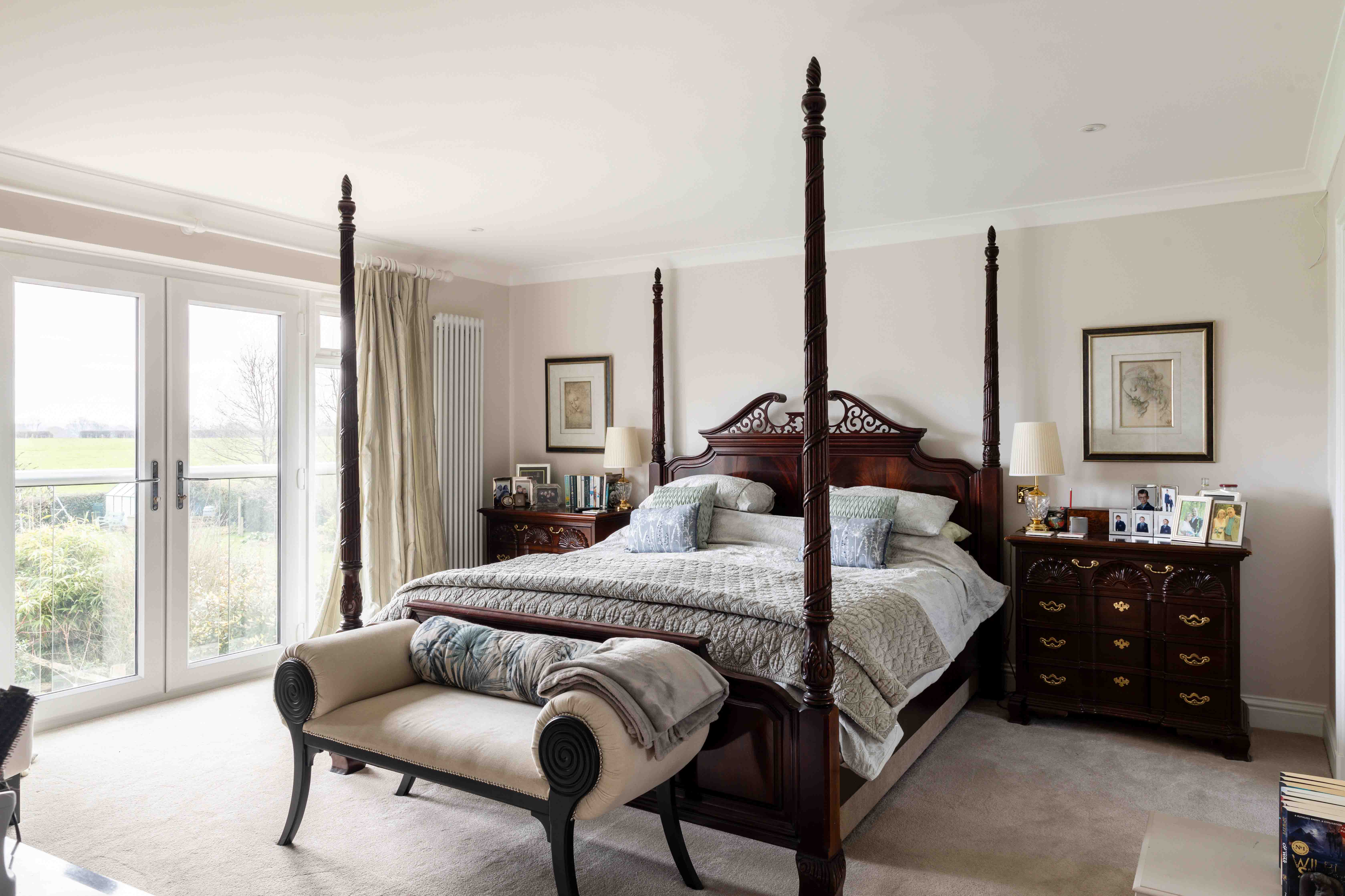The first floor houses four beautifully appointed double bedrooms, each thoughtfully designed for comfort. The three additional bedrooms are served by an impressive family bathroom, complete with a roll-top bath and separate shower, blending classic design with modern convenience. The principal suite is a standout feature, boasting a Juliet balcony with uninterrupted countryside views, a generous walk-in wardrobe with bespoke cabinetry, and a luxurious en suite - complete with Burlington sanitary ware. The en suite offers a standalone bathtub and a separate shower, making it a true retreat.