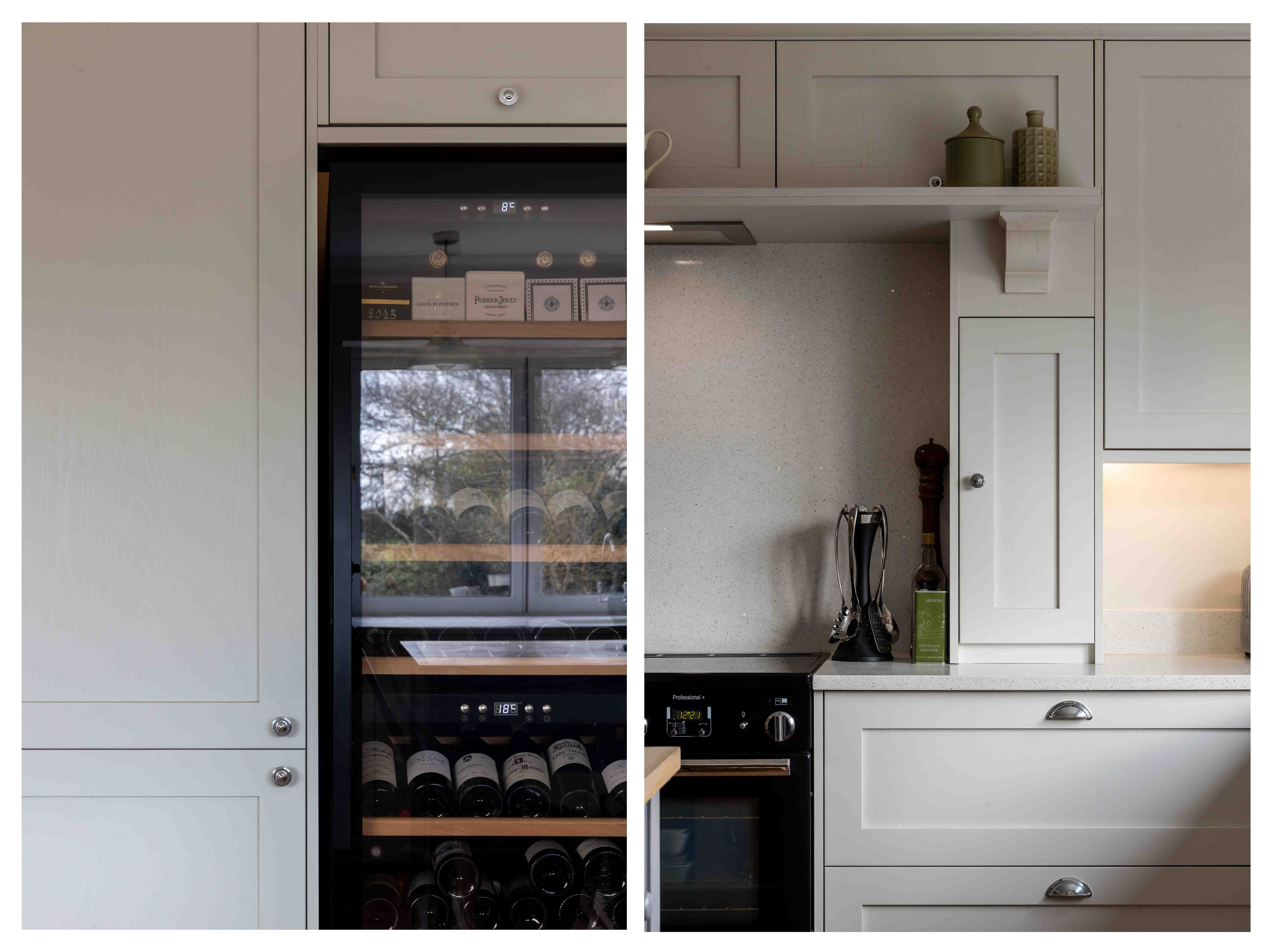 The centrepiece of this property is undoubtedly the open plan kitchen, dining, and family room, stretching across the rear of the home to maximise the verdant countryside views. The kitchen’s contemporary design incorporates shaker cabinetry in harmonious beige and sage tones, with a central island providing a perfect space for food preparation and casual conversation. A thoughtfully placed sink overlooks the stunning landscape, while full-height cabinetry offers both pantry storage and a dedicated drinks fridge. The room is beautifully finished with parquet flooring, and the dining area, large enough for a central table, flows seamlessly into a cosy family corner.