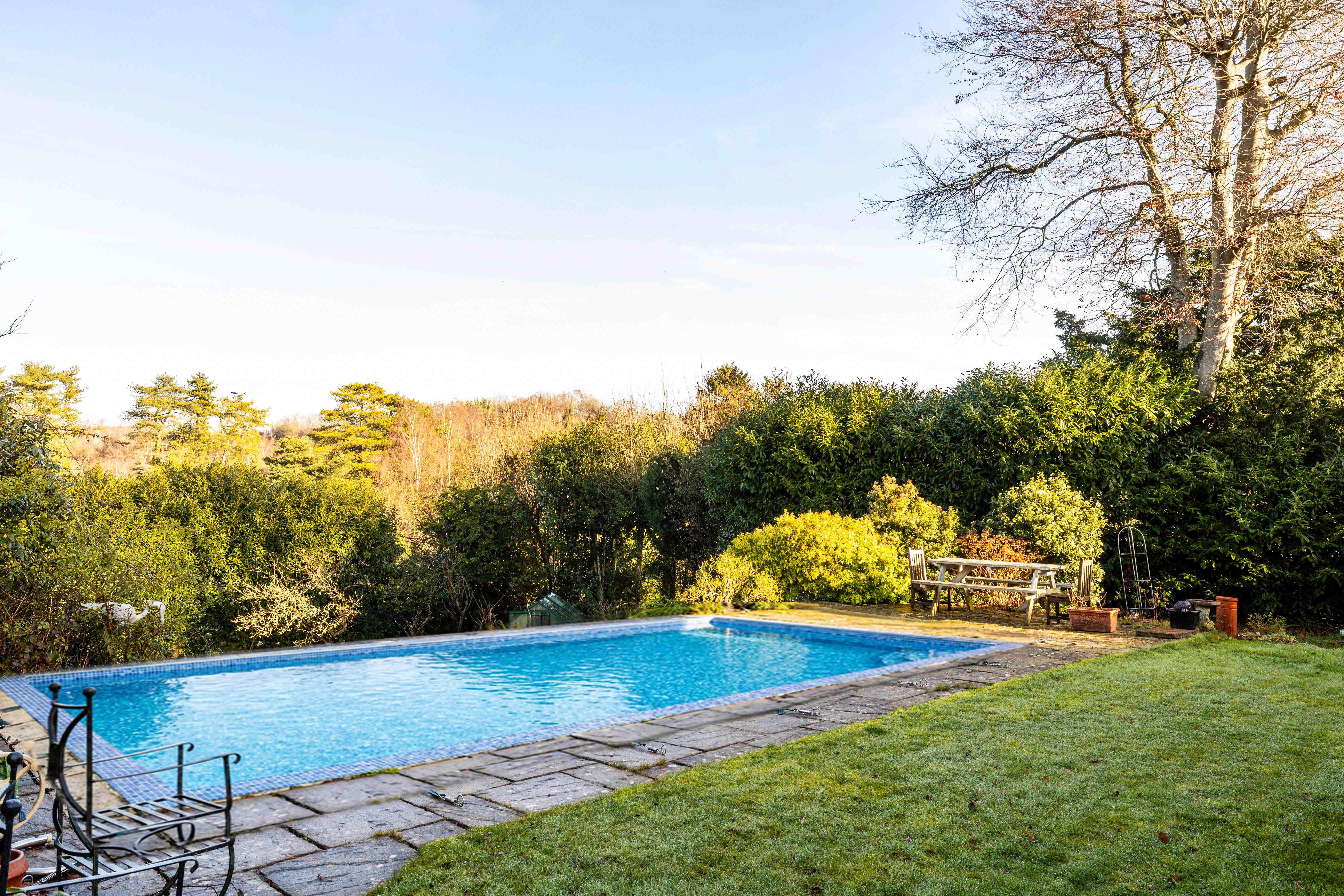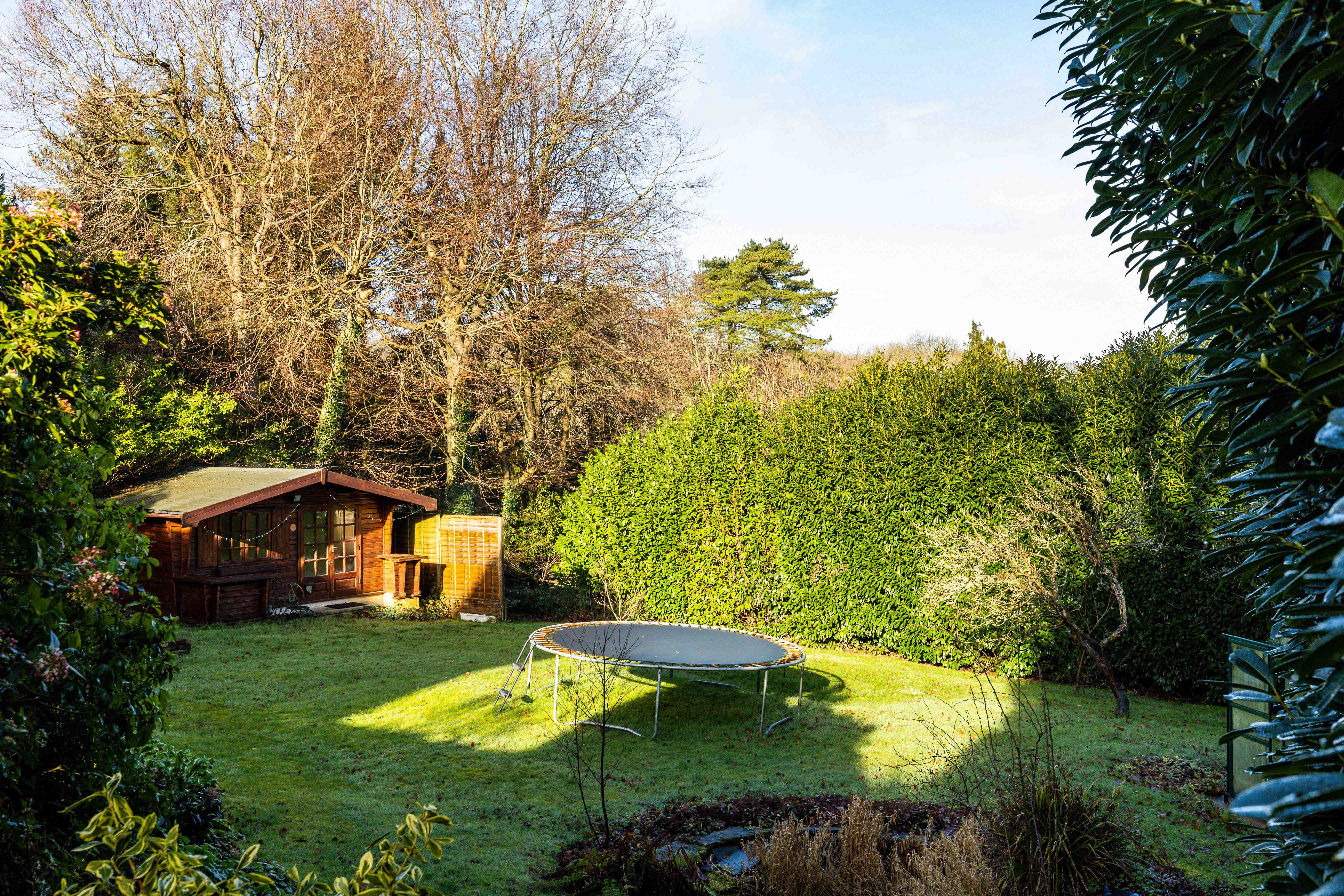 Outside, the garden has been designed as a series of inviting zones. From the raised decking — perfect for alfresco dining and relaxed seating — steps lead down to the swimming pool level, framed by leafy views that create a feeling of escape. Further steps reveal a large lawn, ideal for games, play or simply stretching out in the sun, with a charming summer house offering a peaceful retreat or entertaining space at the far end. It is a garden that works hard but never feels over-designed, welcoming families of all ages and encouraging long days spent outdoors.