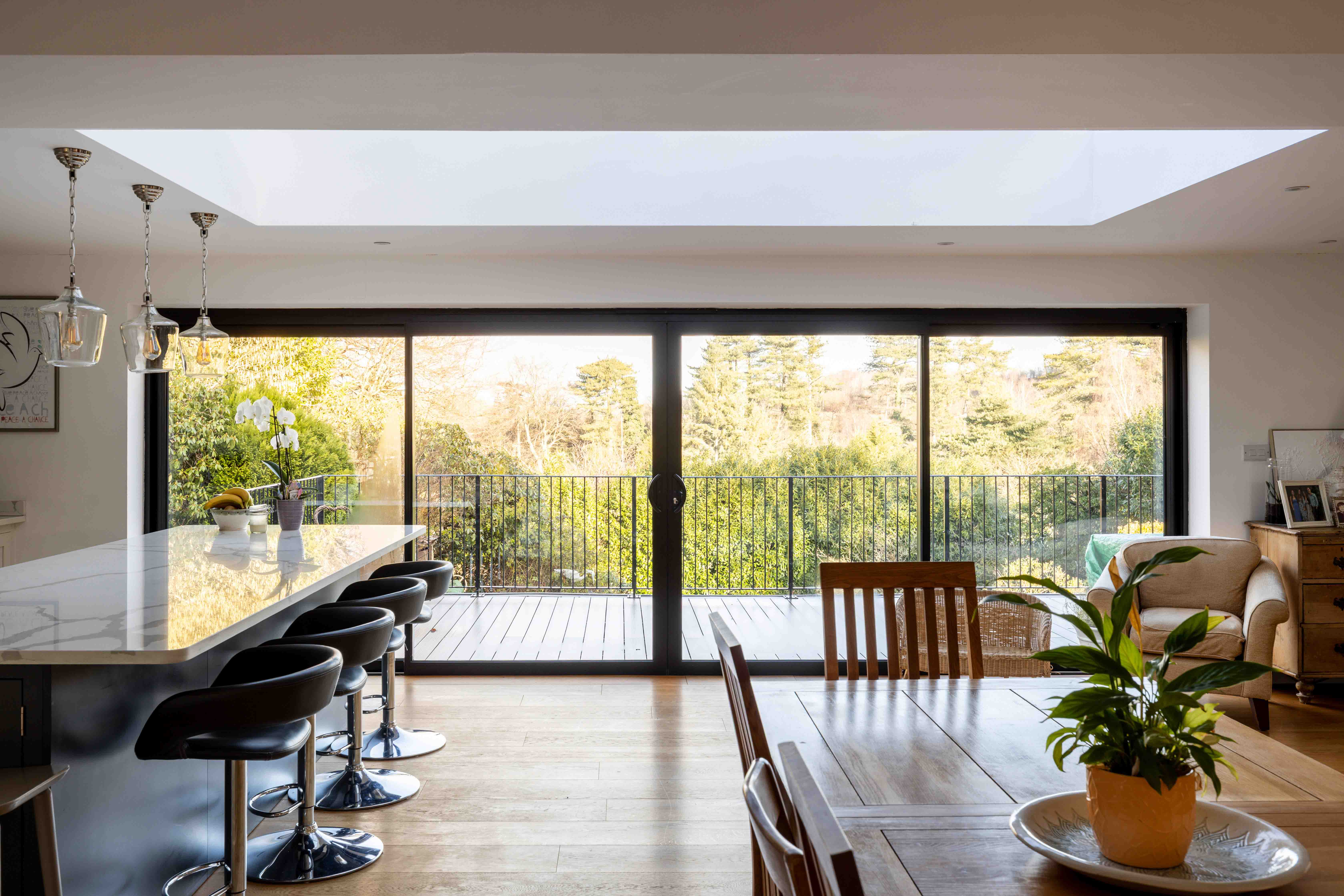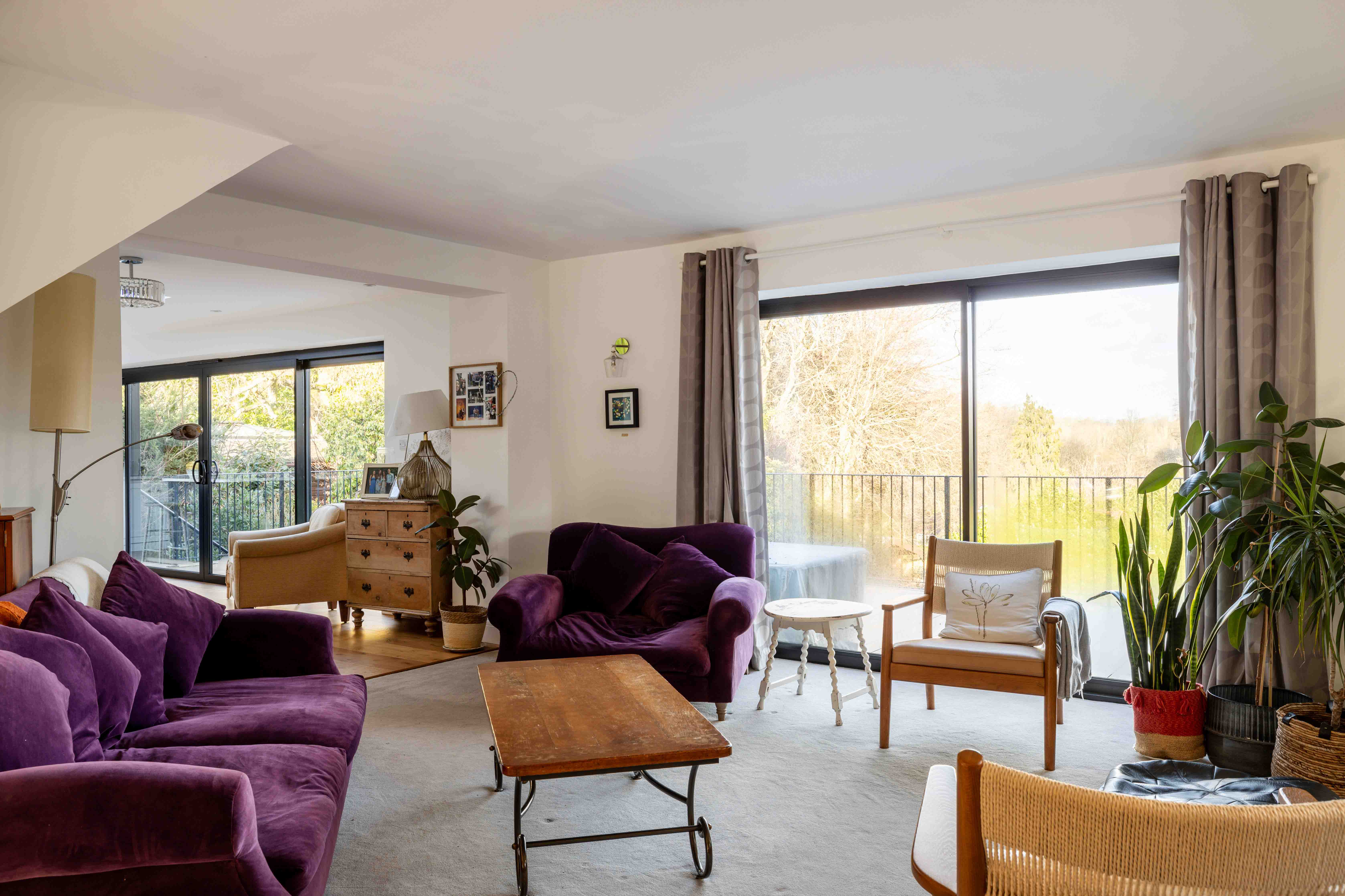 The main living room is both elegant and inviting, benefiting from a lovely triple aspect that captures light throughout the day. A large bay window overlooks trees and shrubbery to the front, creating a sense of seclusion, while to the rear, sliding doors open onto a raised deck that runs the full width of the house. In warmer months, the boundary between inside and out all but disappears, making this a space equally suited to relaxed family evenings and larger gatherings with friends.