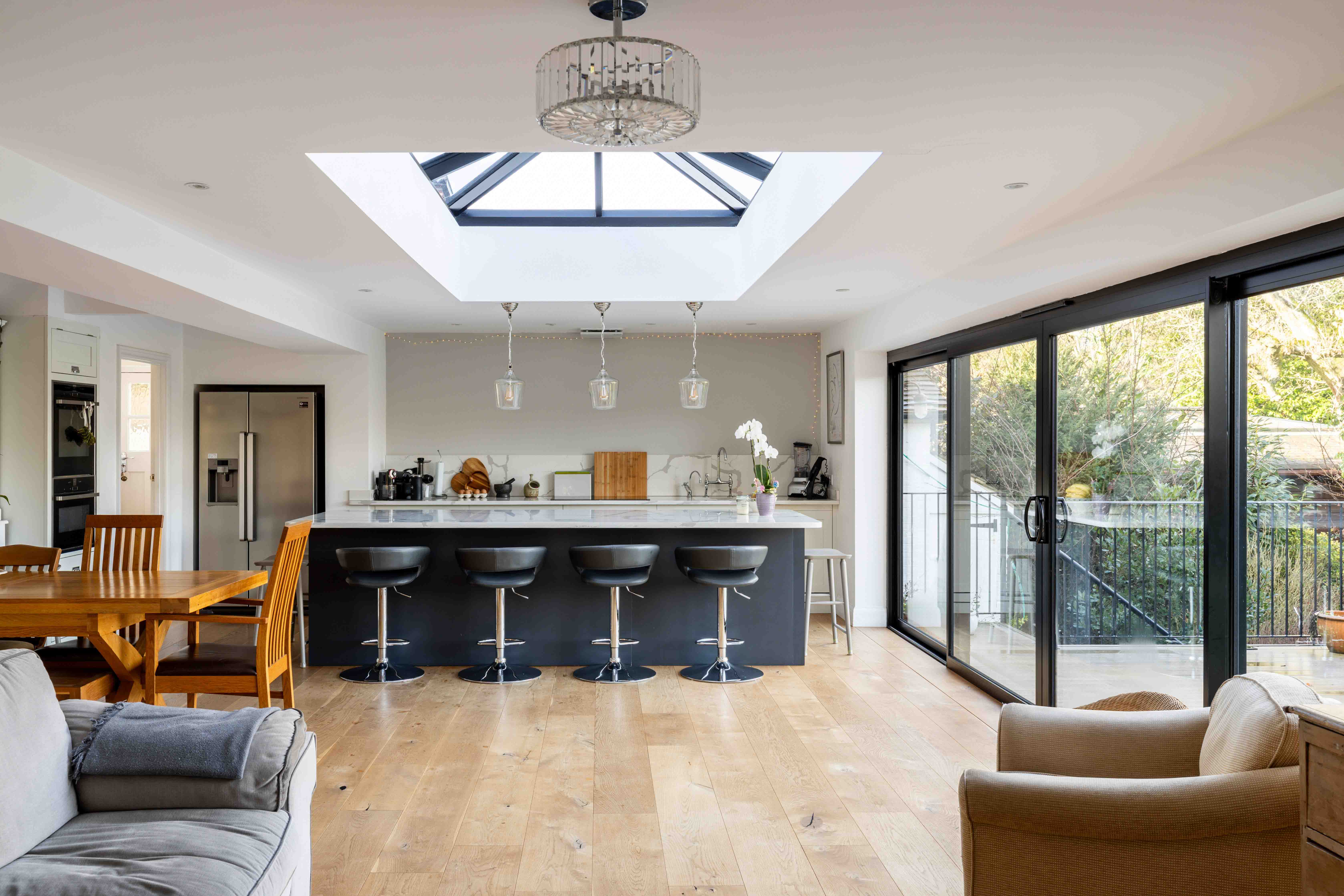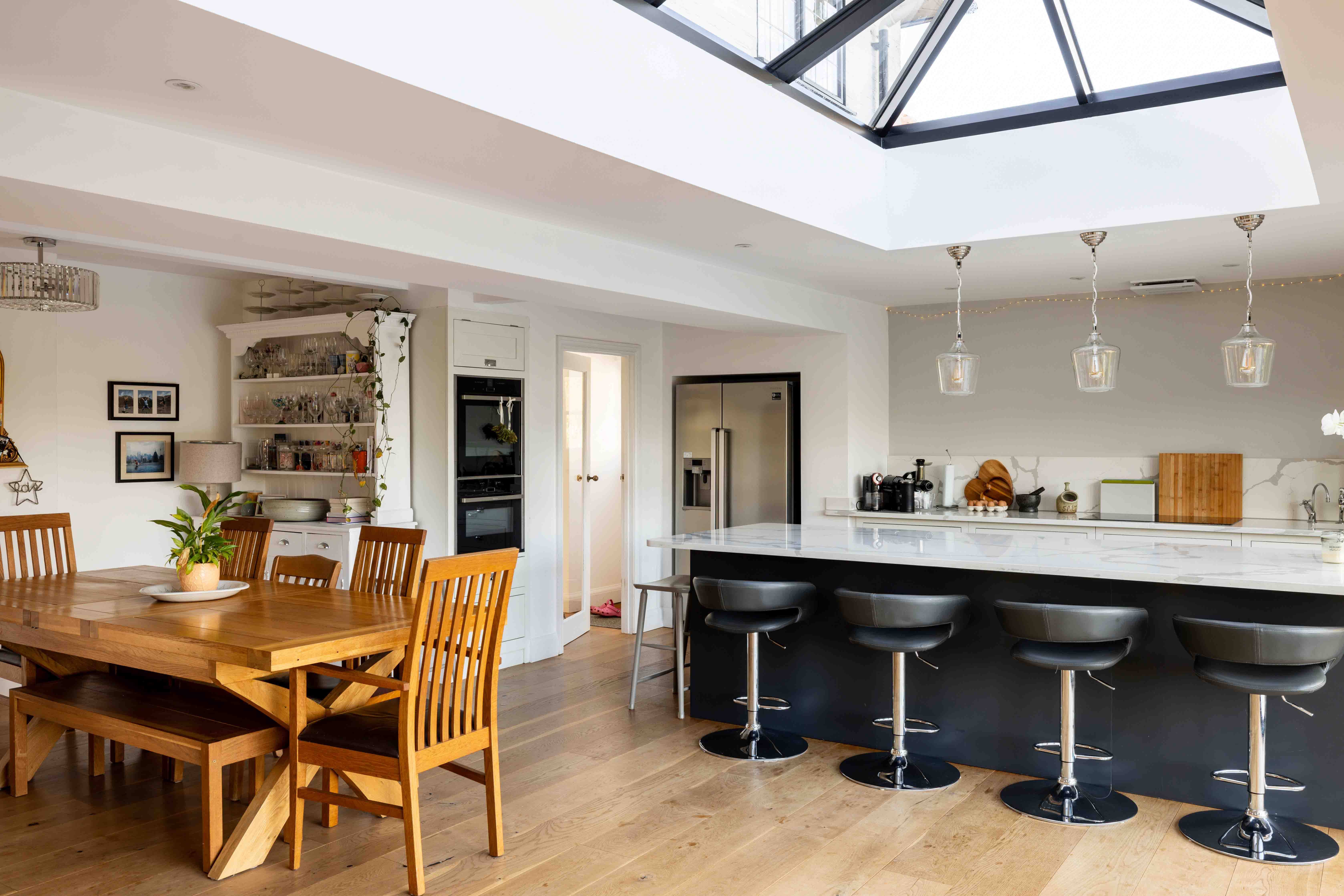 At the heart of the house sits the impressive open-plan kitchen and dining area — a space that has clearly been designed with modern family life in mind. Flooded with natural light from a dramatic pitched skylight and a run of sliding doors, it is both uplifting and wonderfully practical. The kitchen itself is sleek yet warm, centred around a generous island and breakfast bar dressed in charcoal shaker-style cabinetry with marble-effect worktops. Neutral slab-door wall units, chrome cup handles, a glass electric hob and tall backsplash give the room a polished, editorial finish, while a separate utility room keeps everyday essentials neatly out of sight. This is a room made for conversation: children doing homework at the island, friends lingering over supper, doors thrown open on summer evenings.