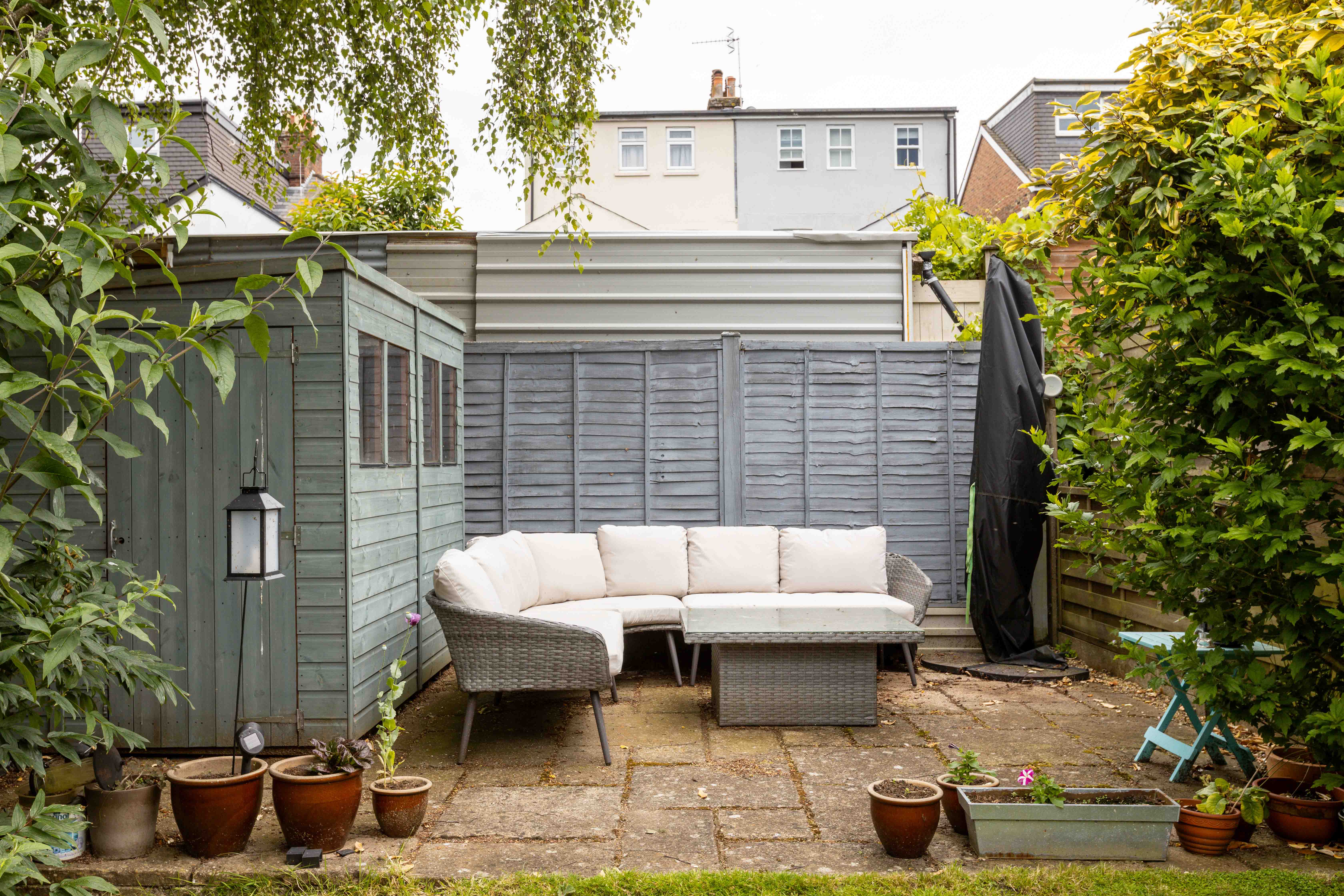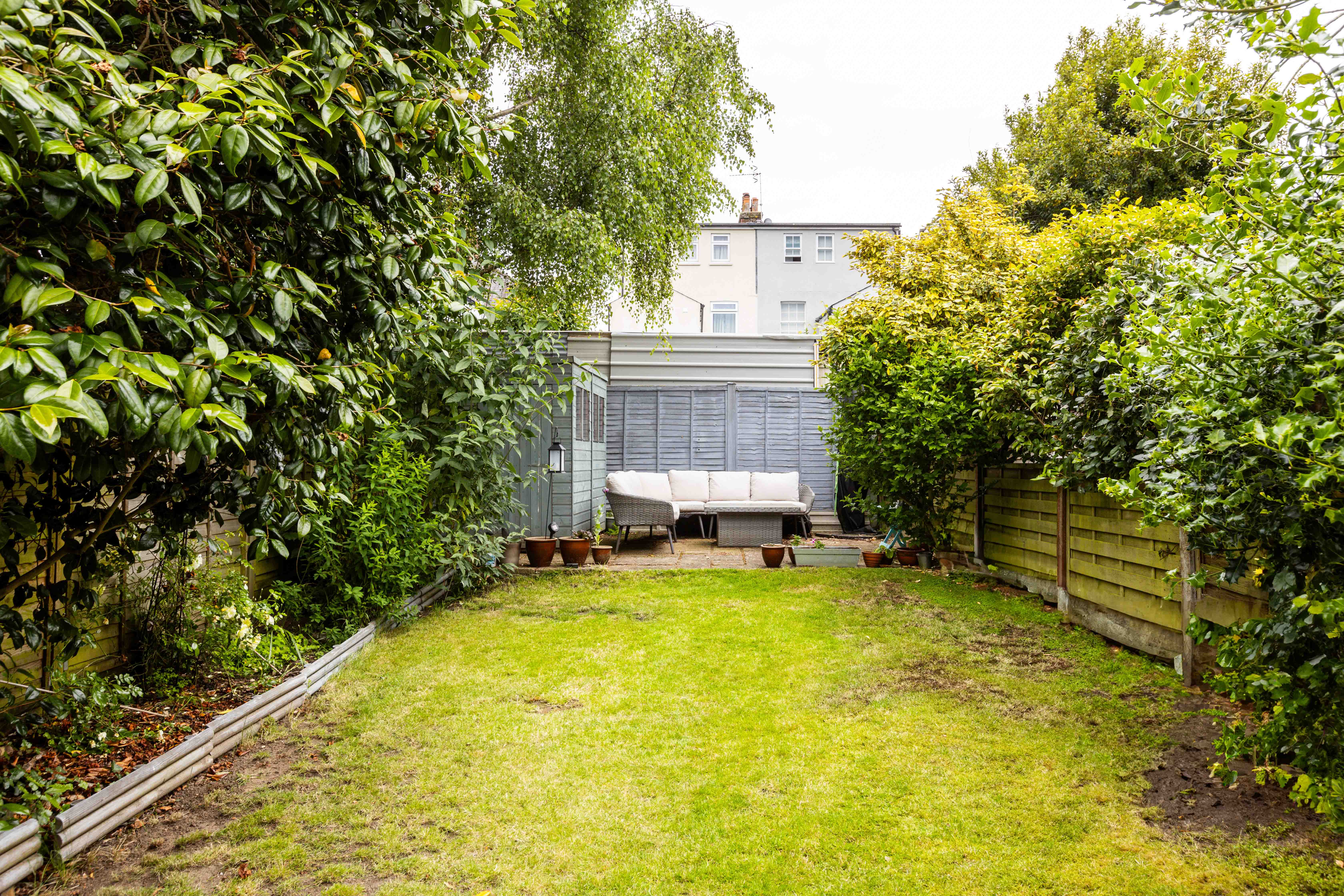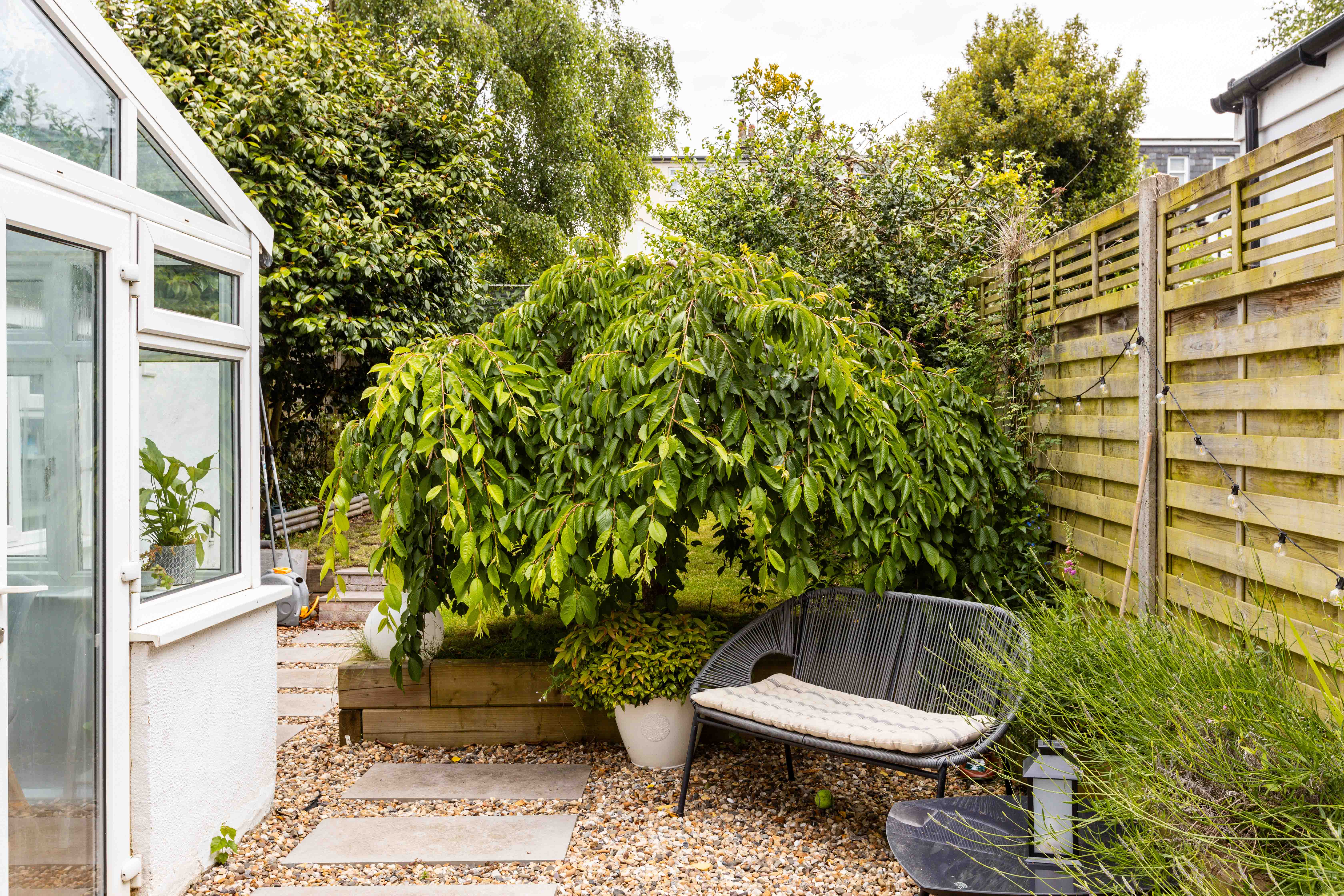 Outside, the meticulously landscaped garden is a true highlight. Designed to maximize enjoyment of the outdoors, it features two delightful seating areas flanking a lush green lawn, perfectly positioned to capture the sun throughout the day.