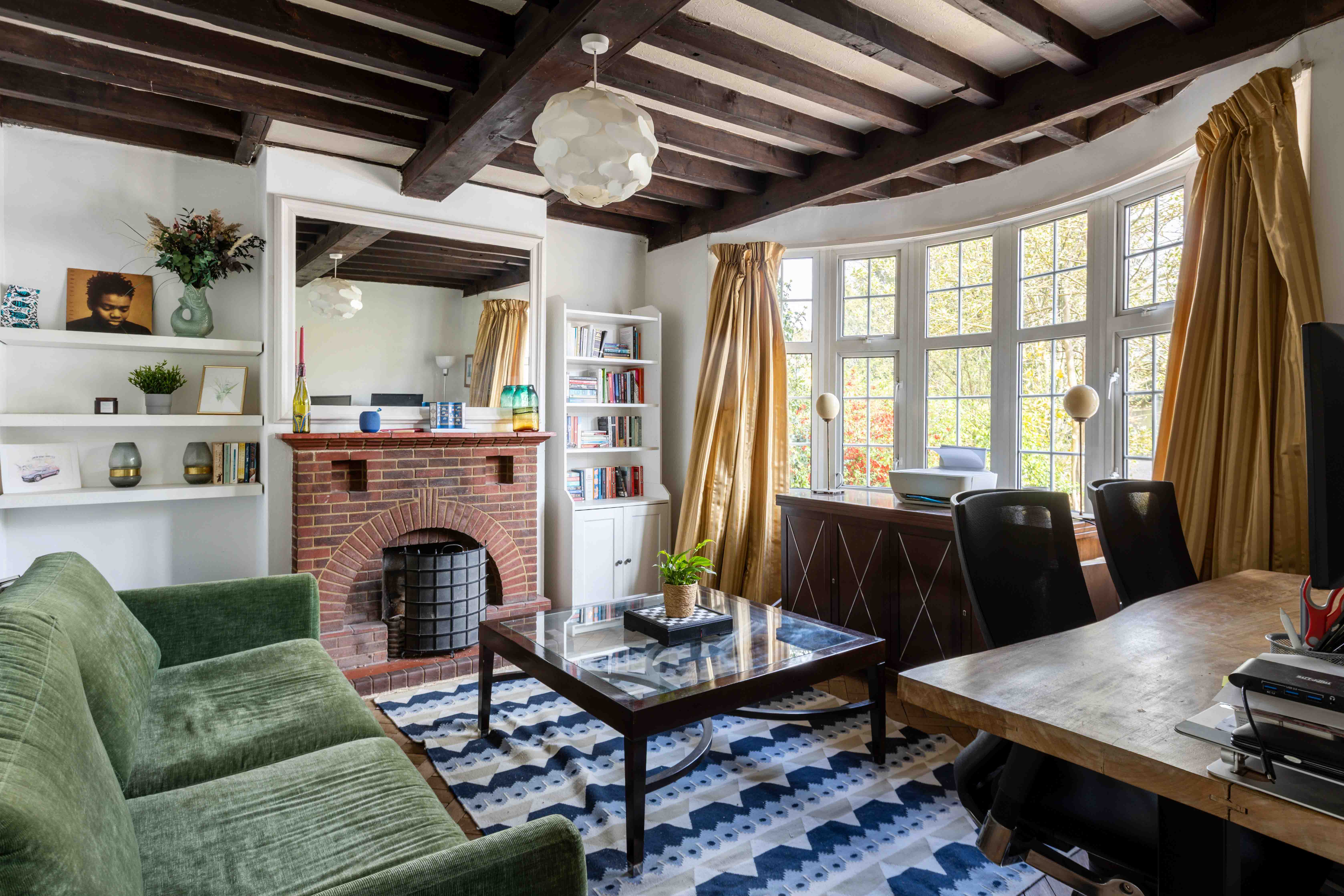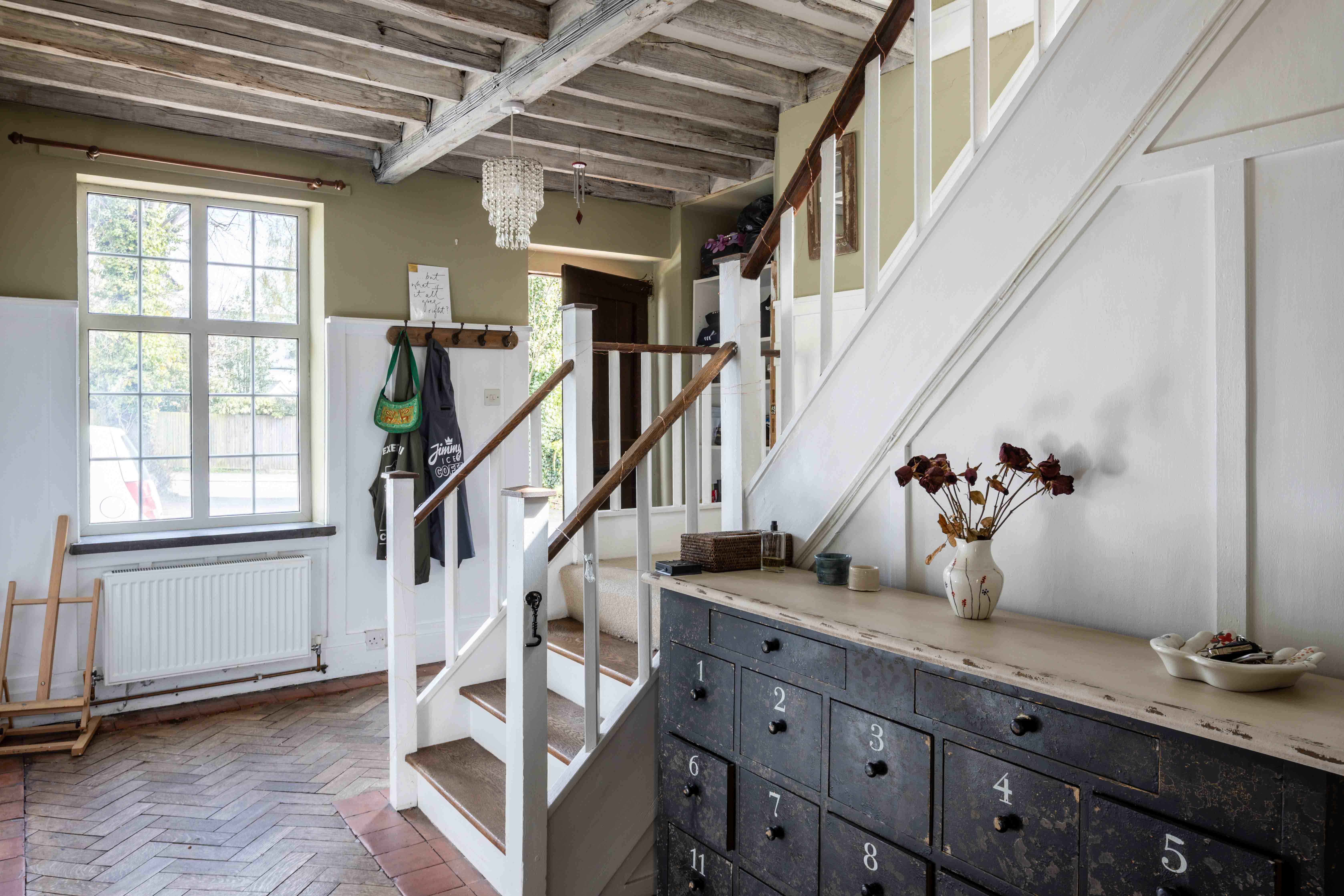 Arranged over two floors, the property is full of charm, with character features such as parquet and slate flooring, exposed ceiling beams, and brick fireplaces in both the sitting and dining rooms.