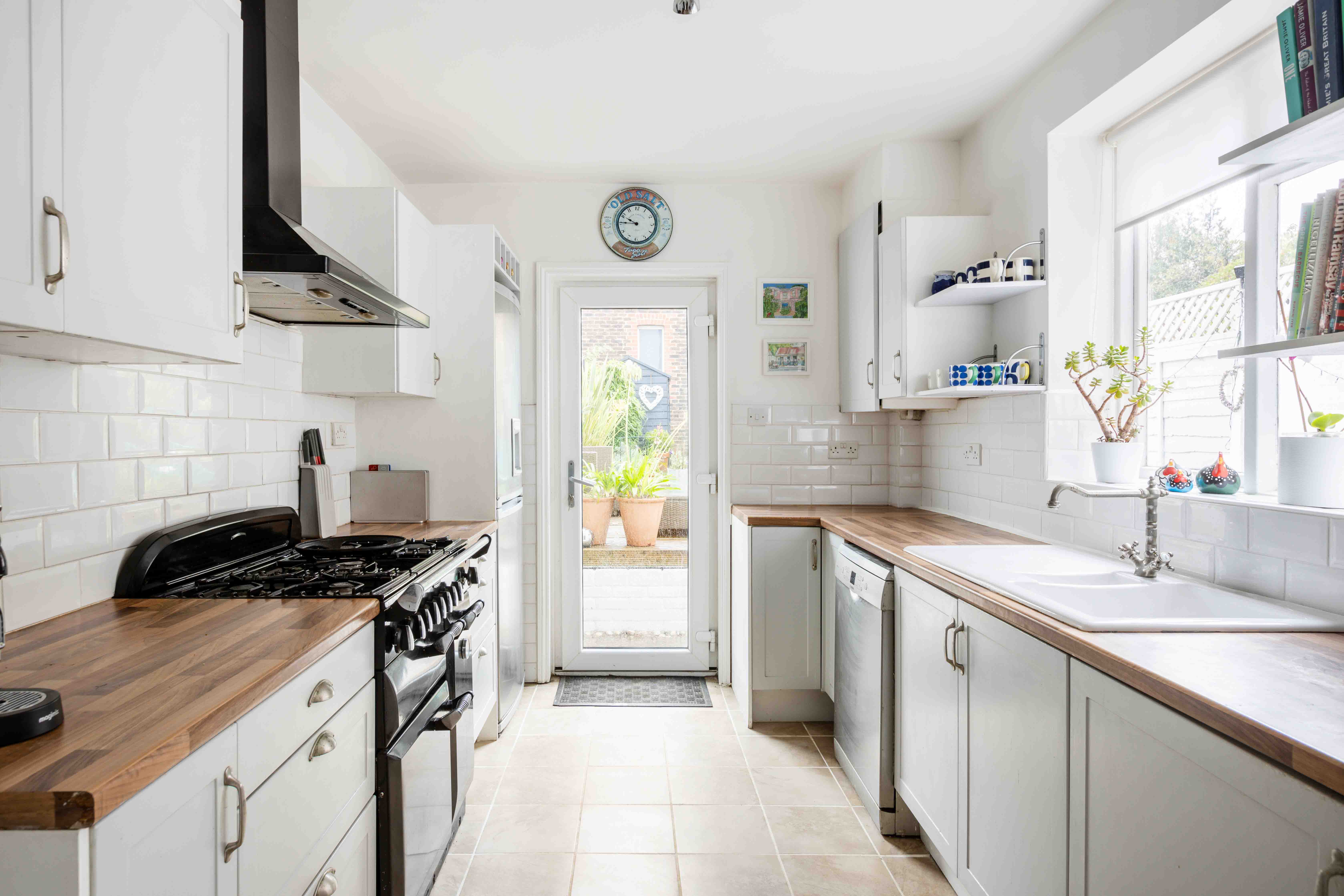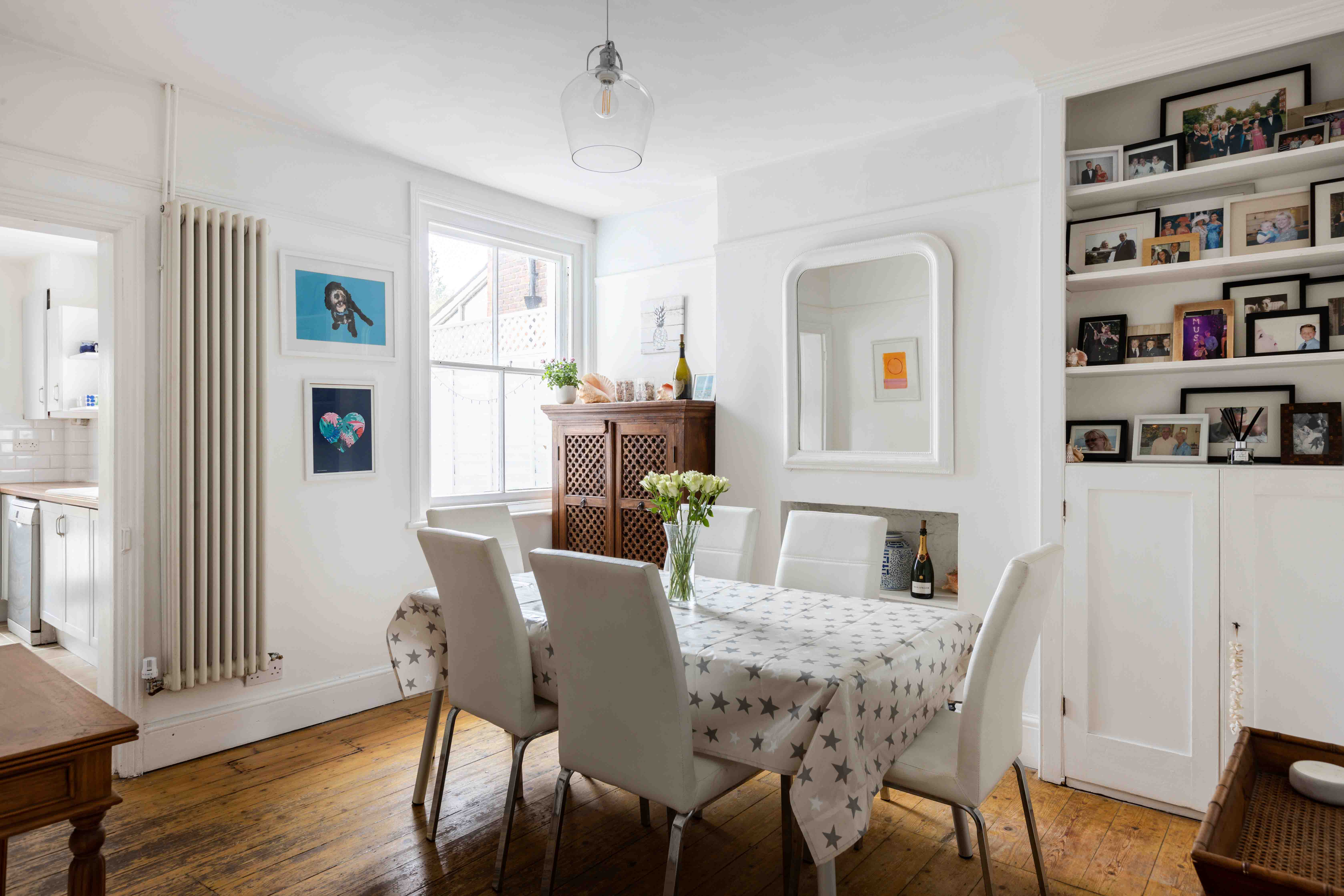 Spanning three floors, the property seamlessly blends period charm with modern enhancements. The ground floor features two spacious and inviting reception rooms. The living room boasts an elegant bay window, a striking feature fireplace with intricate tile work, and built-in cabinetry, perfect for additional storage or display. The dining room, equally generous in size, also benefits from bespoke cabinetry, providing both practicality and style. The well-proportioned kitchen, with direct access to the rear garden, offers scope for reconfiguration or an extension to create a more open-plan living area (subject to the necessary consents).
