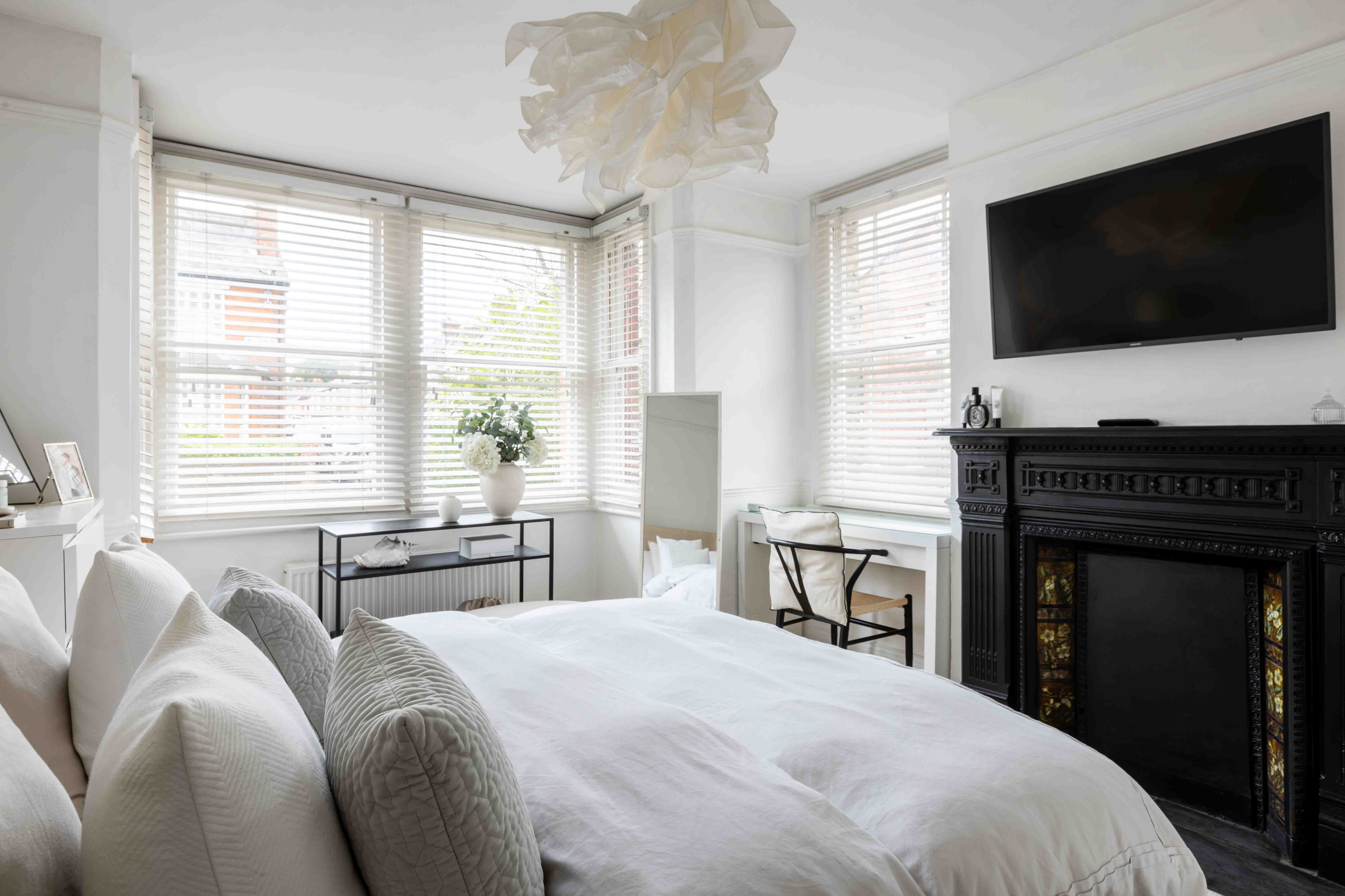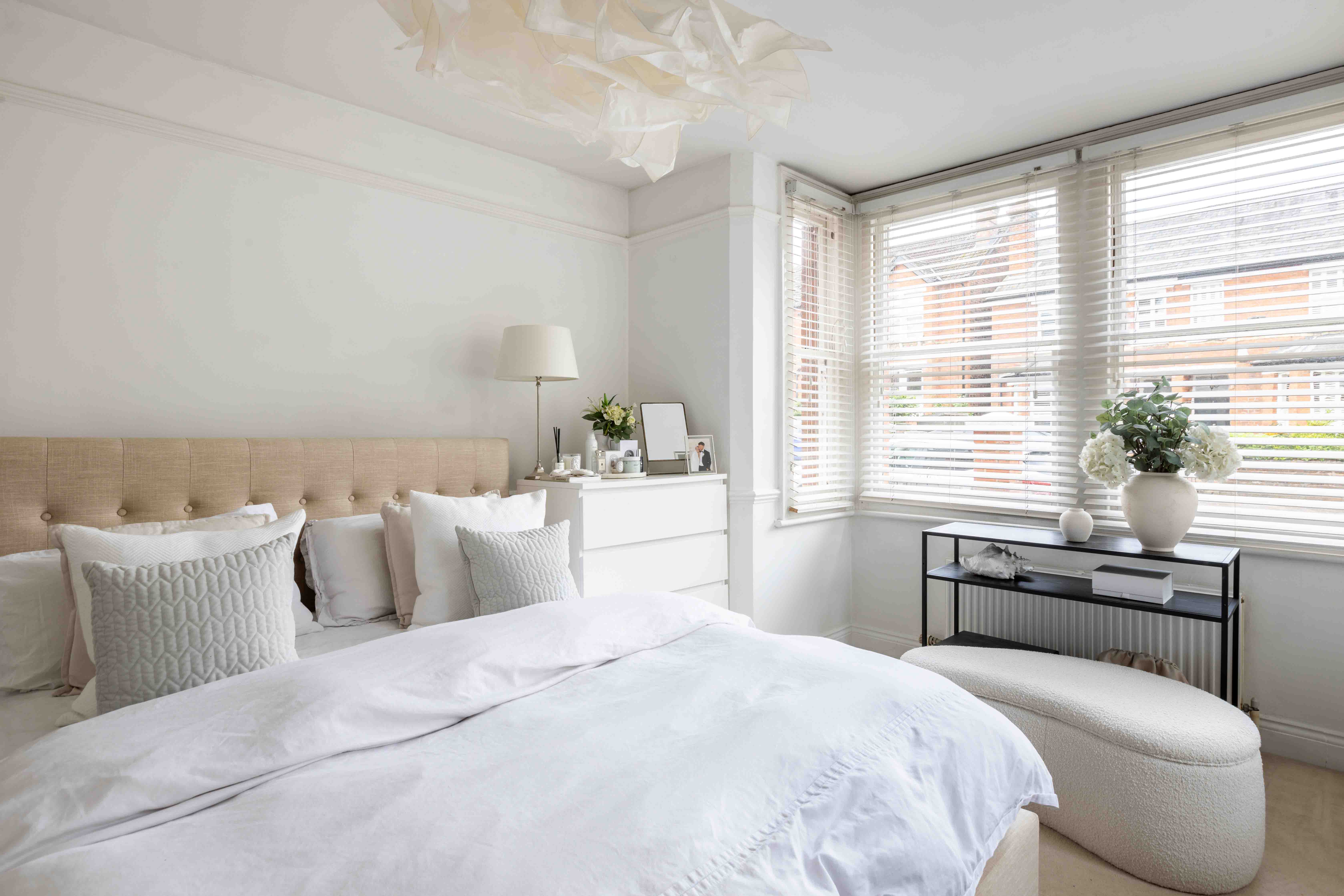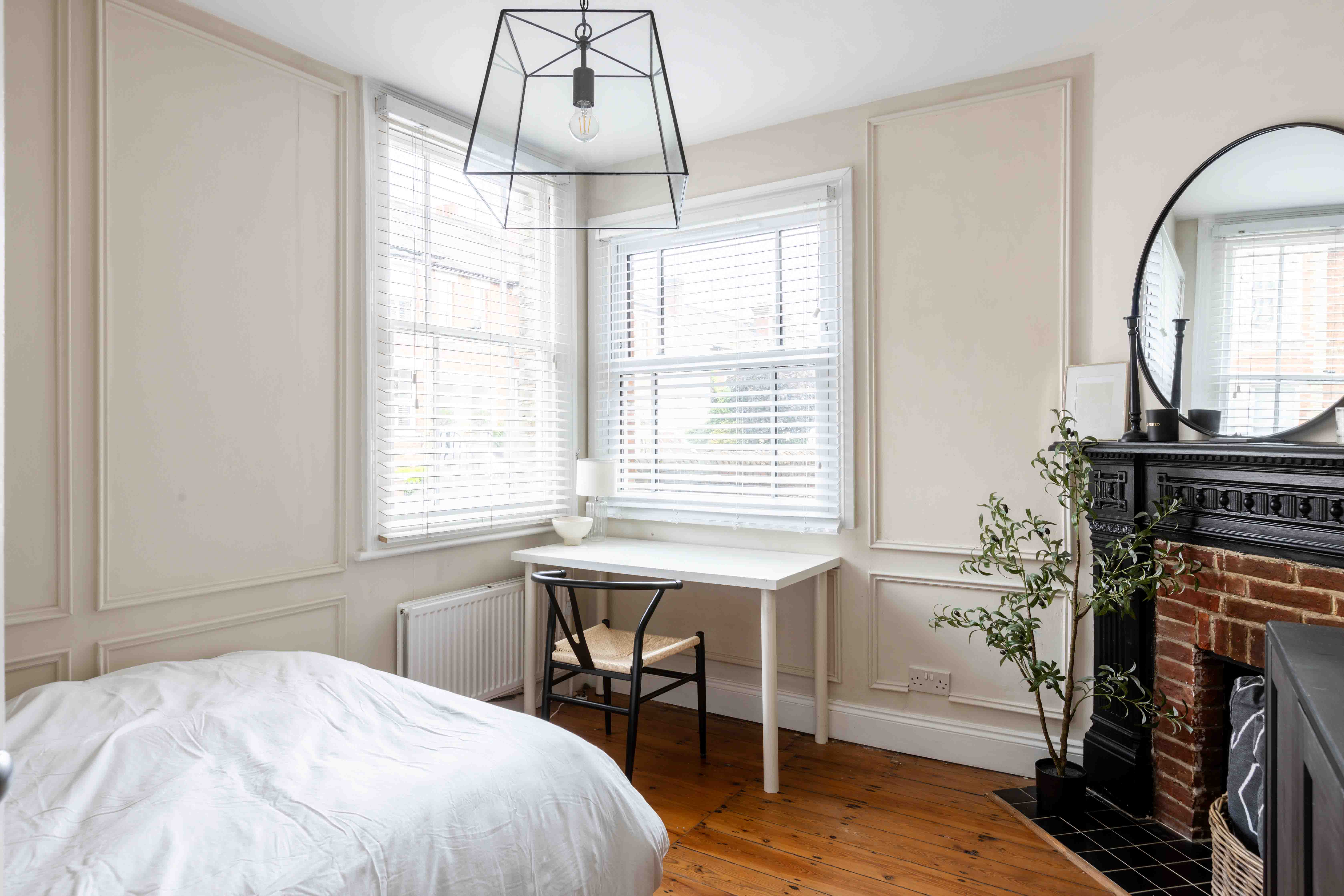 The two double bedrooms are thoughtfully designed with original attractive tiled fireplaces and decorated in soft neutral tones, enhanced by classic panelling that adds a touch of sophistication. Both rooms offer ample space, maintaining the home's tranquil and timeless atmosphere. The modern bathroom is a sanctuary of understated elegance, featuring neutral tones and sleek design. Large white tiles create a clean, crisp backdrop, beautifully contrasted by a striking Crittal-style shower screen. This thoughtful combination of textures and finishes adds a touch of modern luxury to the space, offering both style and sophistication for a truly relaxing experience.