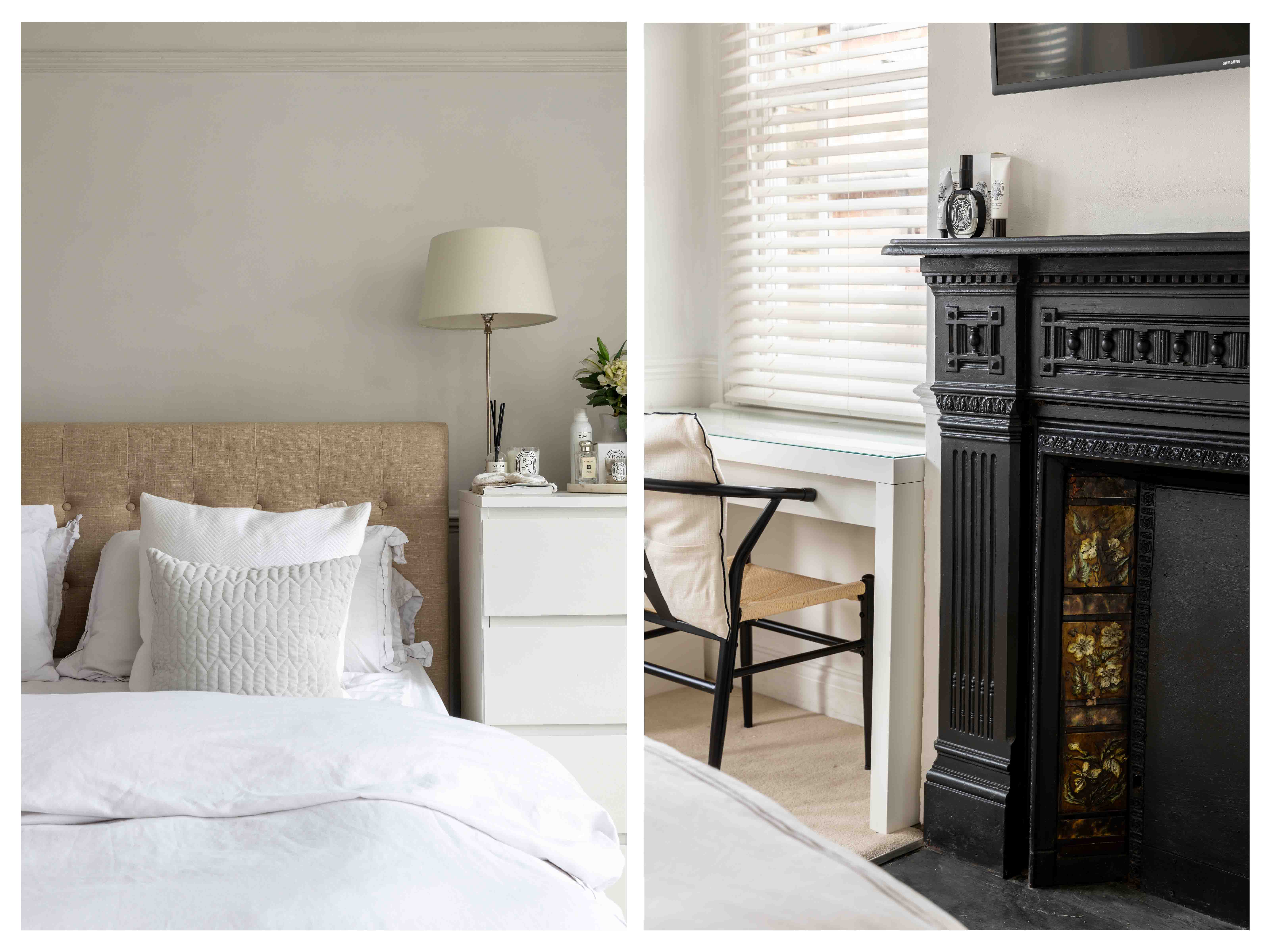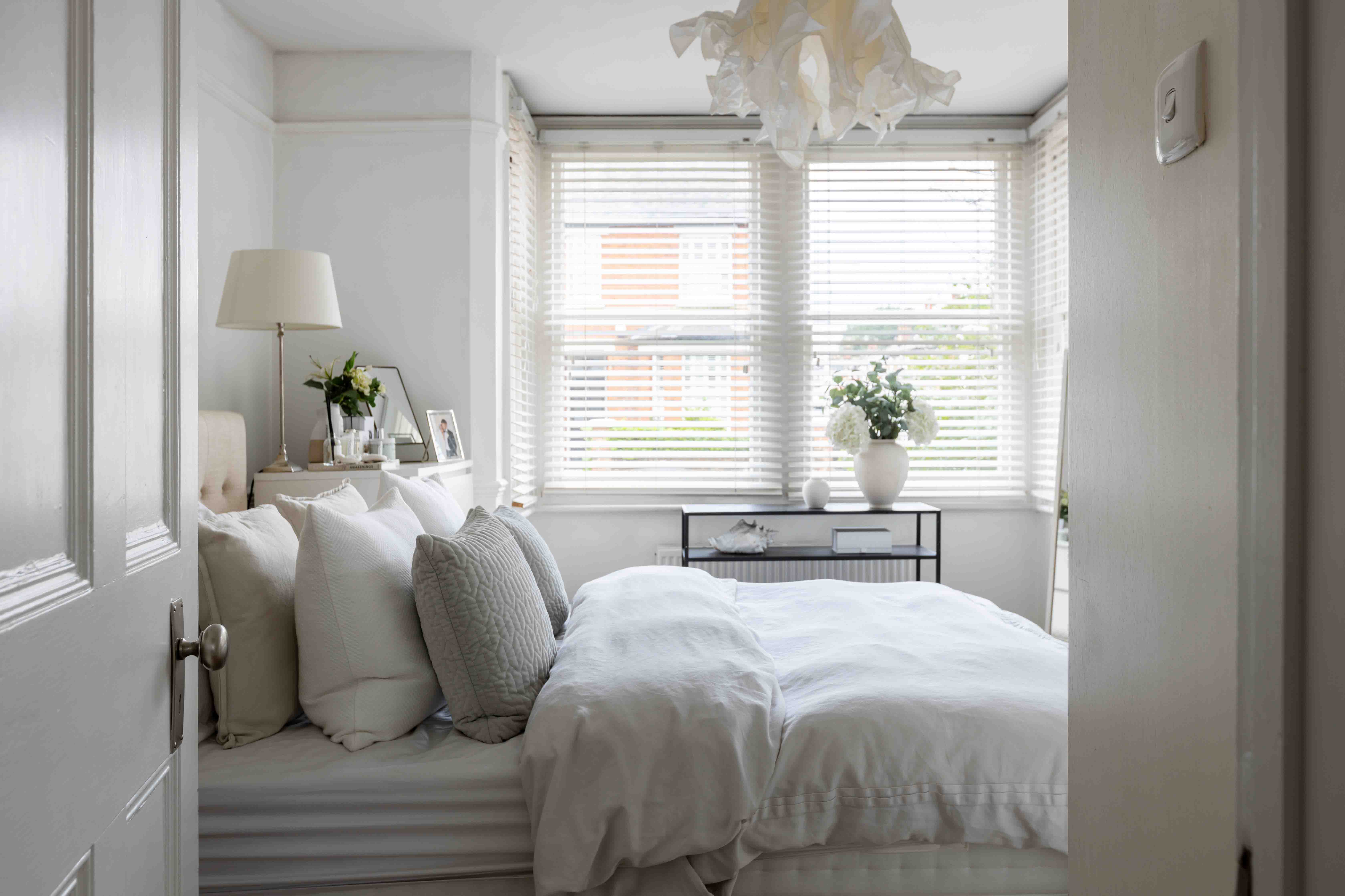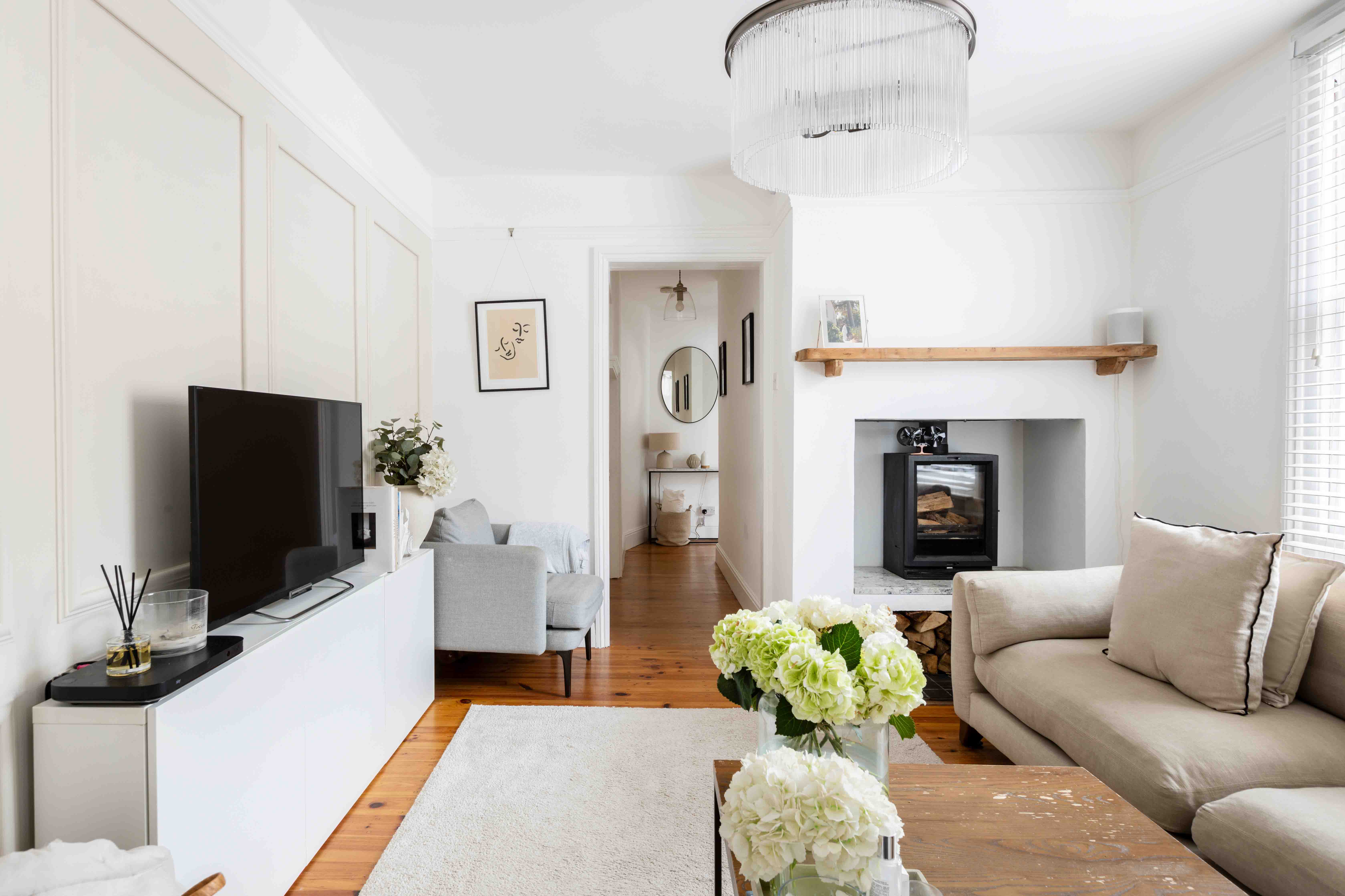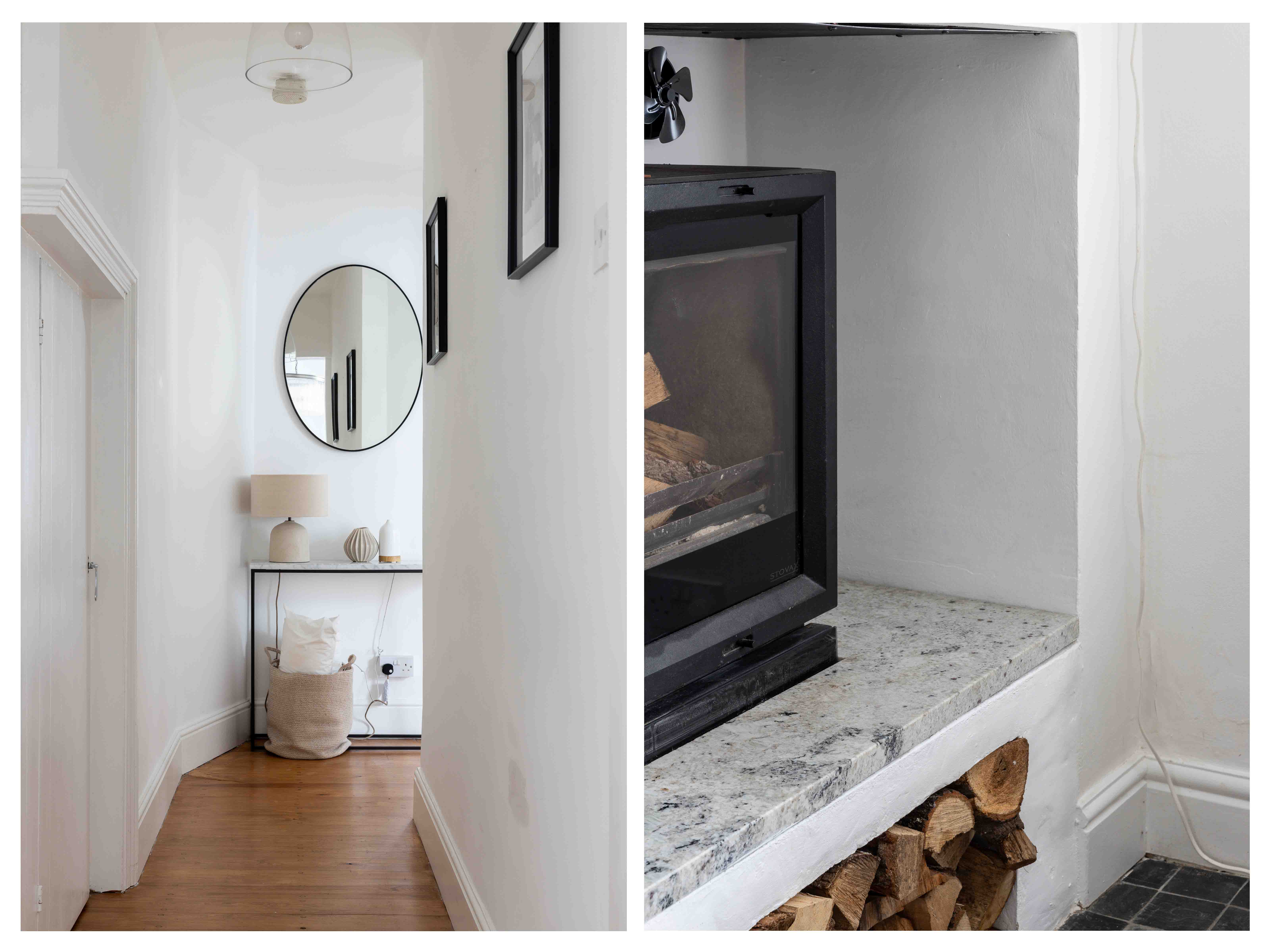 The two double bedrooms are thoughtfully designed with original attractive tiled fireplaces and decorated in soft neutral tones, enhanced by classic panelling that adds a touch of sophistication. Both rooms offer ample space, maintaining the home's tranquil and timeless atmosphere. The modern bathroom is a sanctuary of understated elegance, featuring neutral tones and sleek design. Large white tiles create a clean, crisp backdrop, beautifully contrasted by a striking Crittal-style shower screen. This thoughtful combination of textures and finishes adds a touch of modern luxury to the space, offering both style and sophistication for a truly relaxing experience.