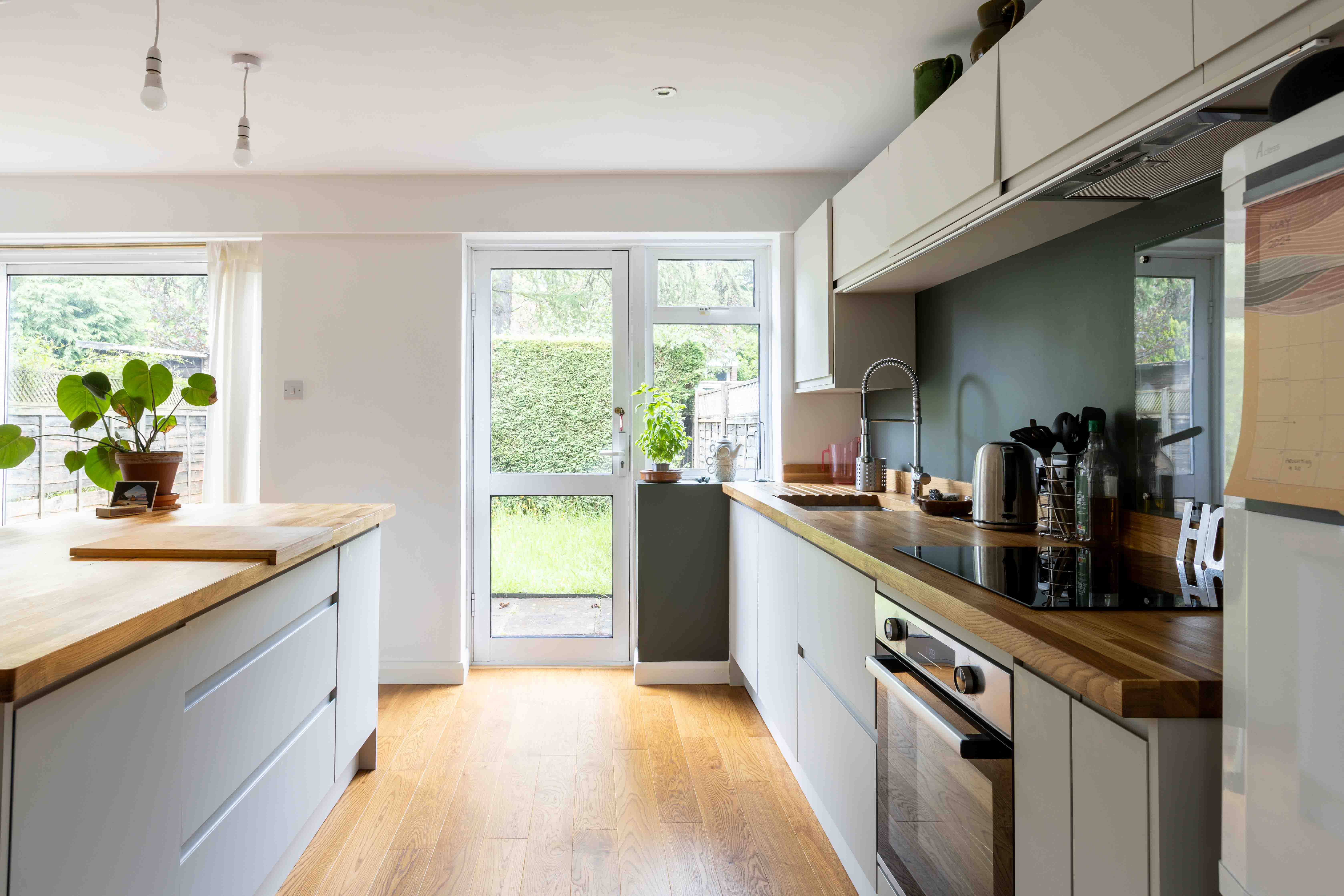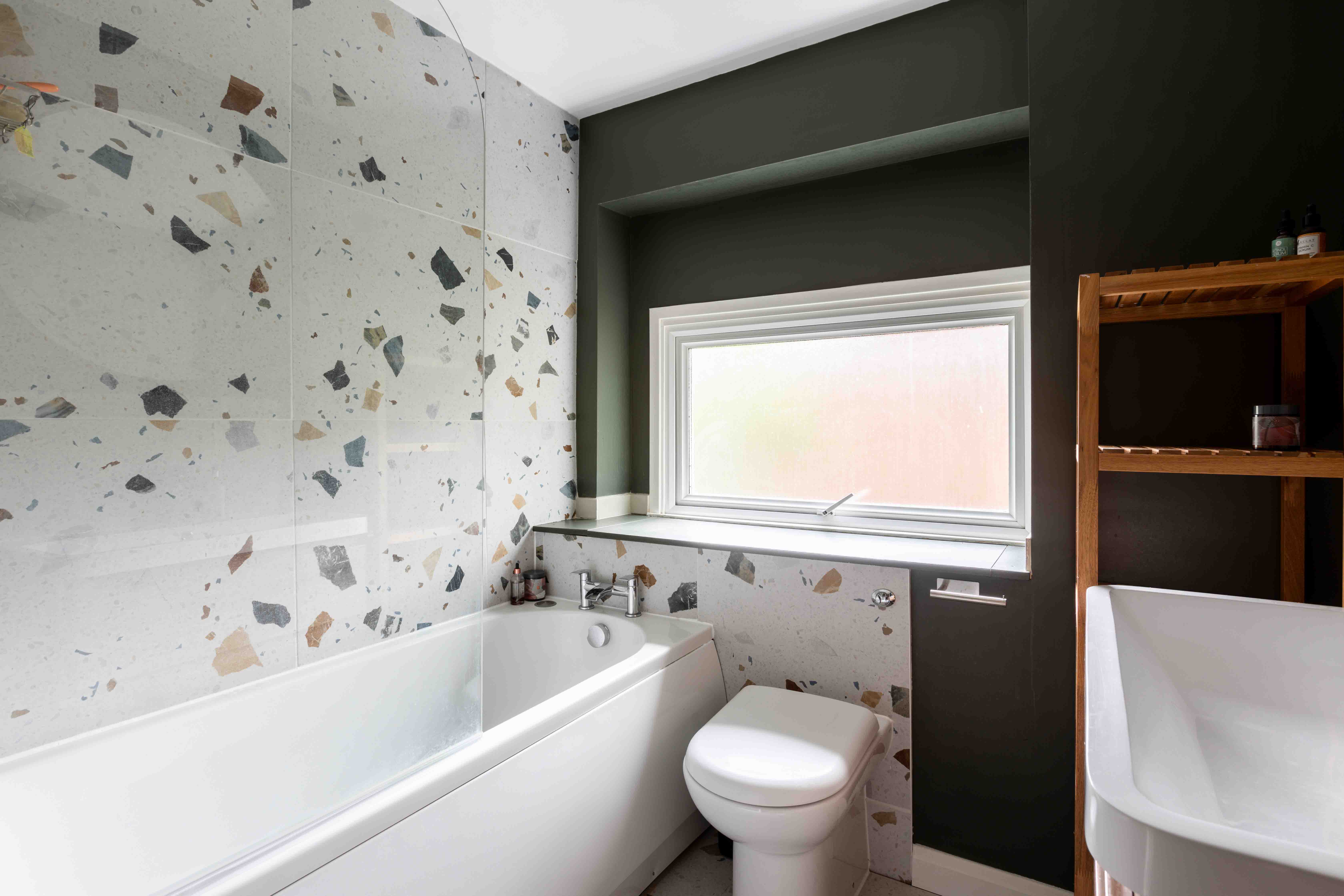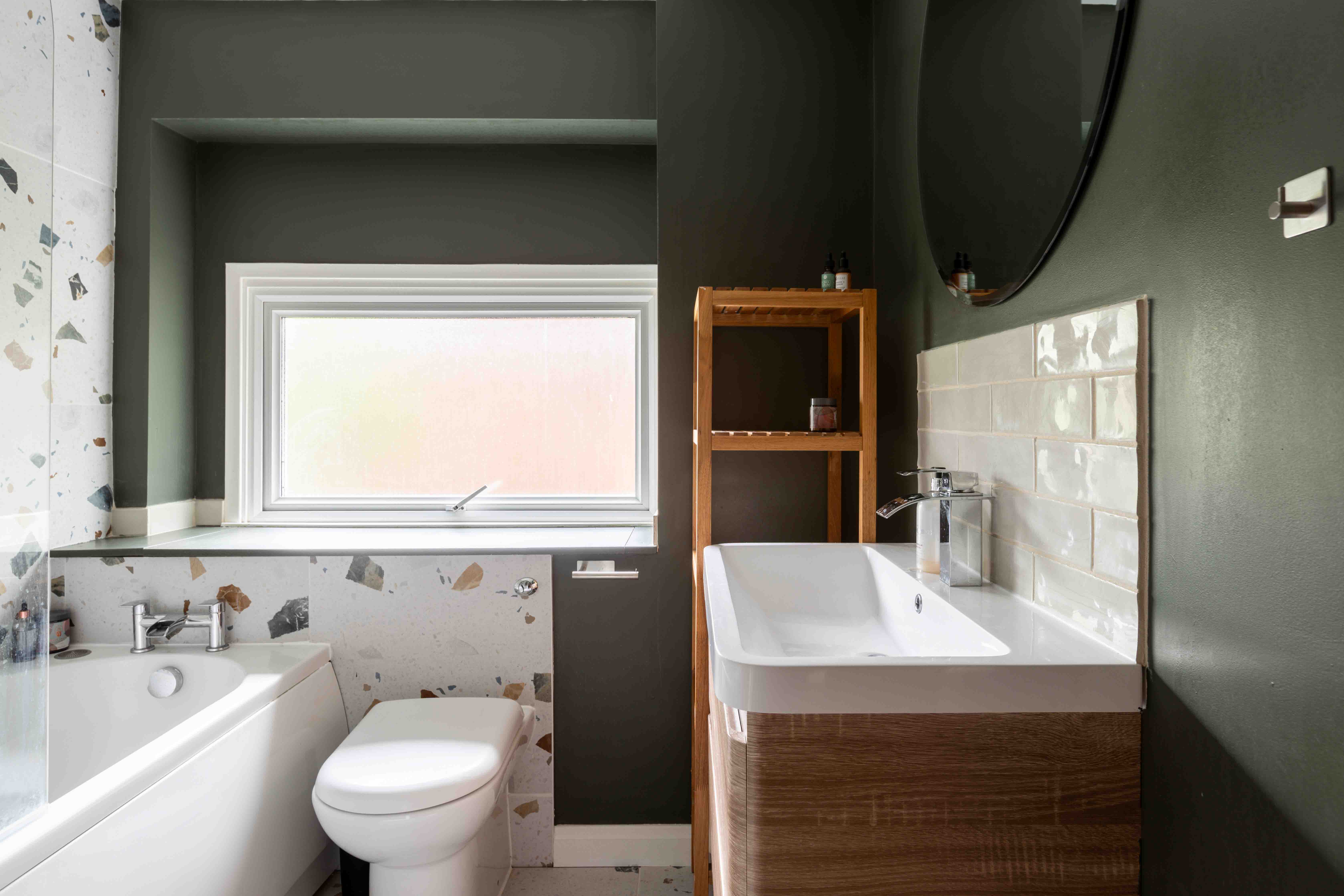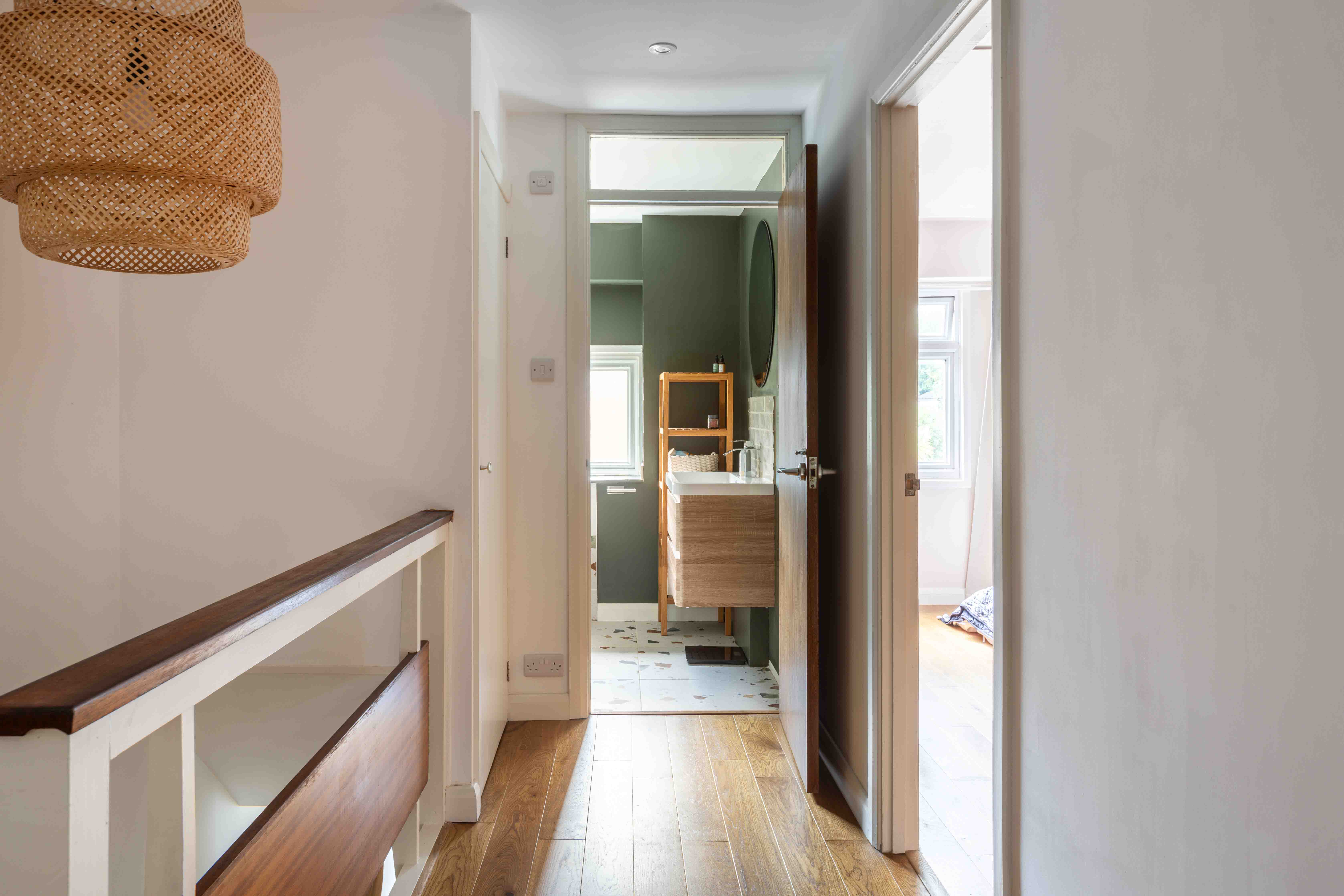 Ascending to the first floor, you will find three well proportioned bedrooms and a beautifully designed family bathroom. The front double bedroom has been cleverly enhanced with a dressing room, offering additional storage and a touch of luxury. The family bathroom is a delightful blend of style and practicality, featuring playful tiled flooring and bath, oak cabinetry, metro tiling and green walls.