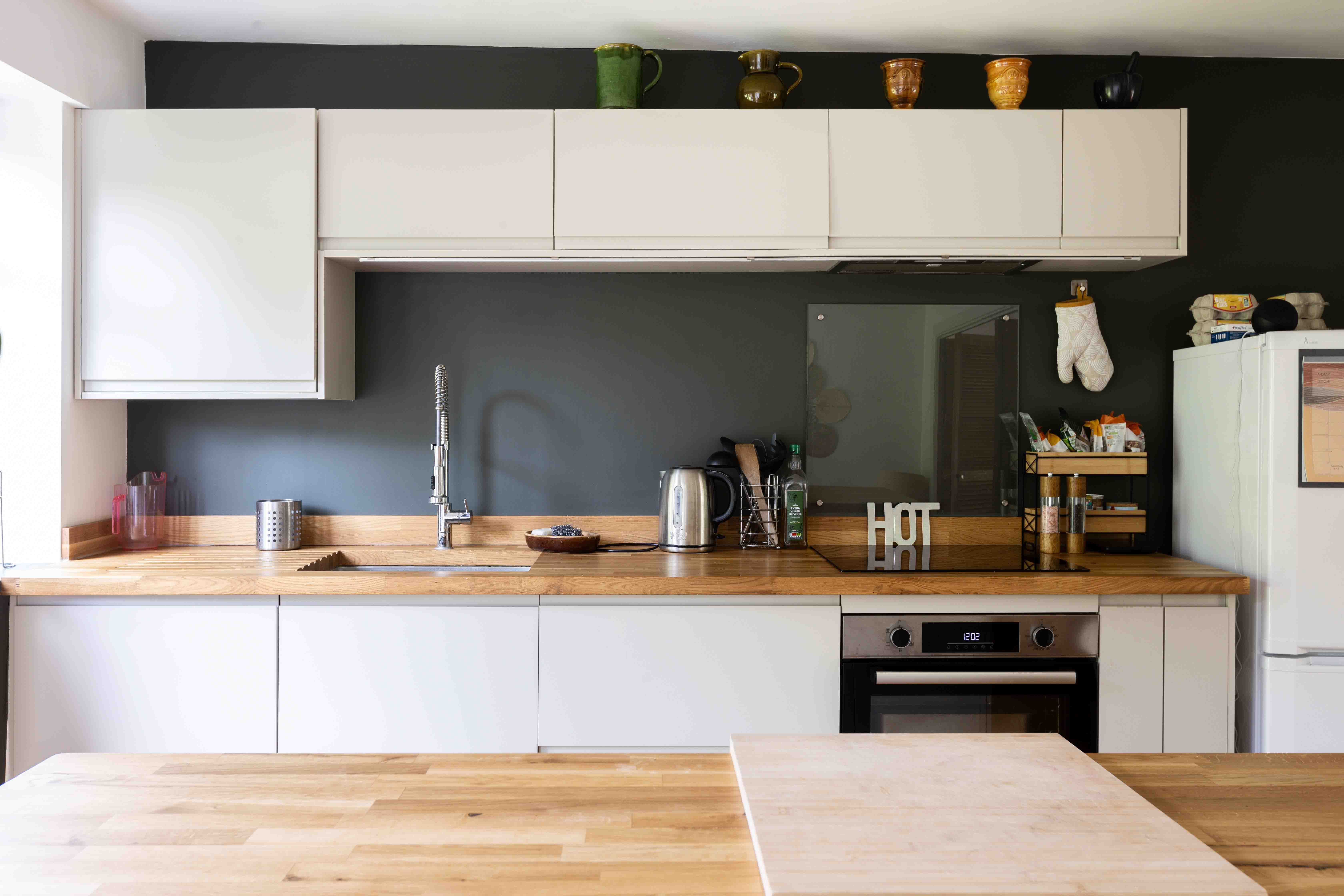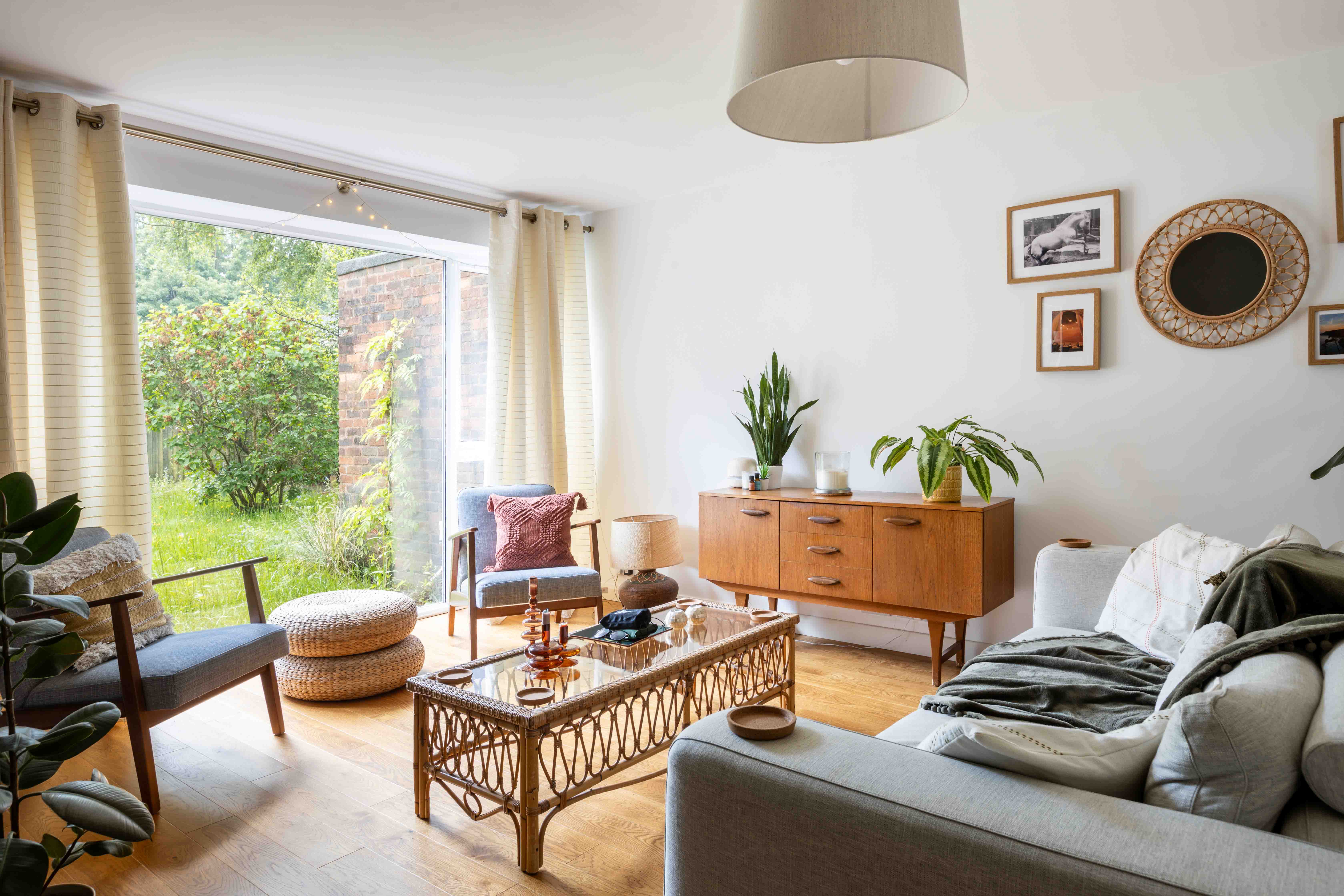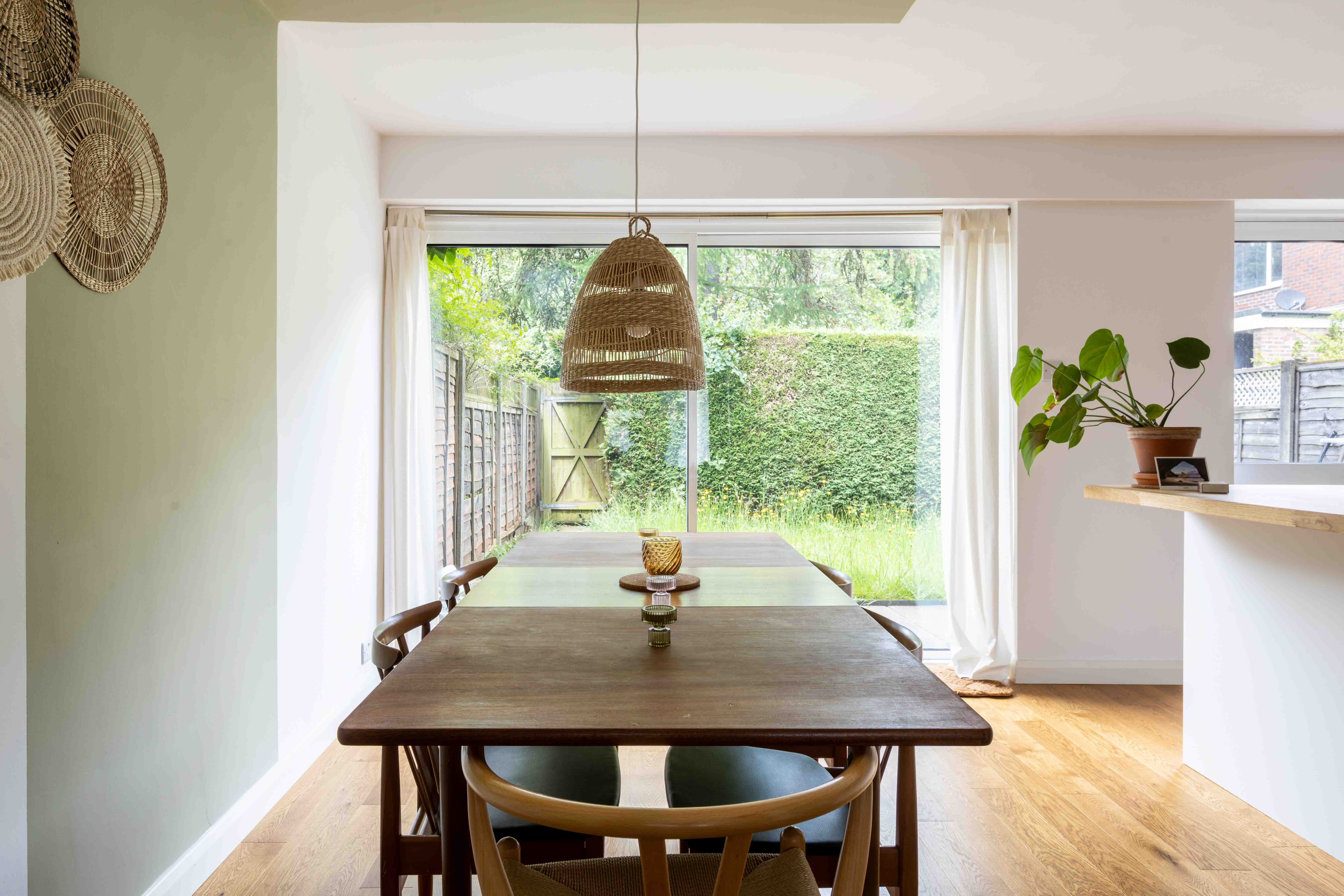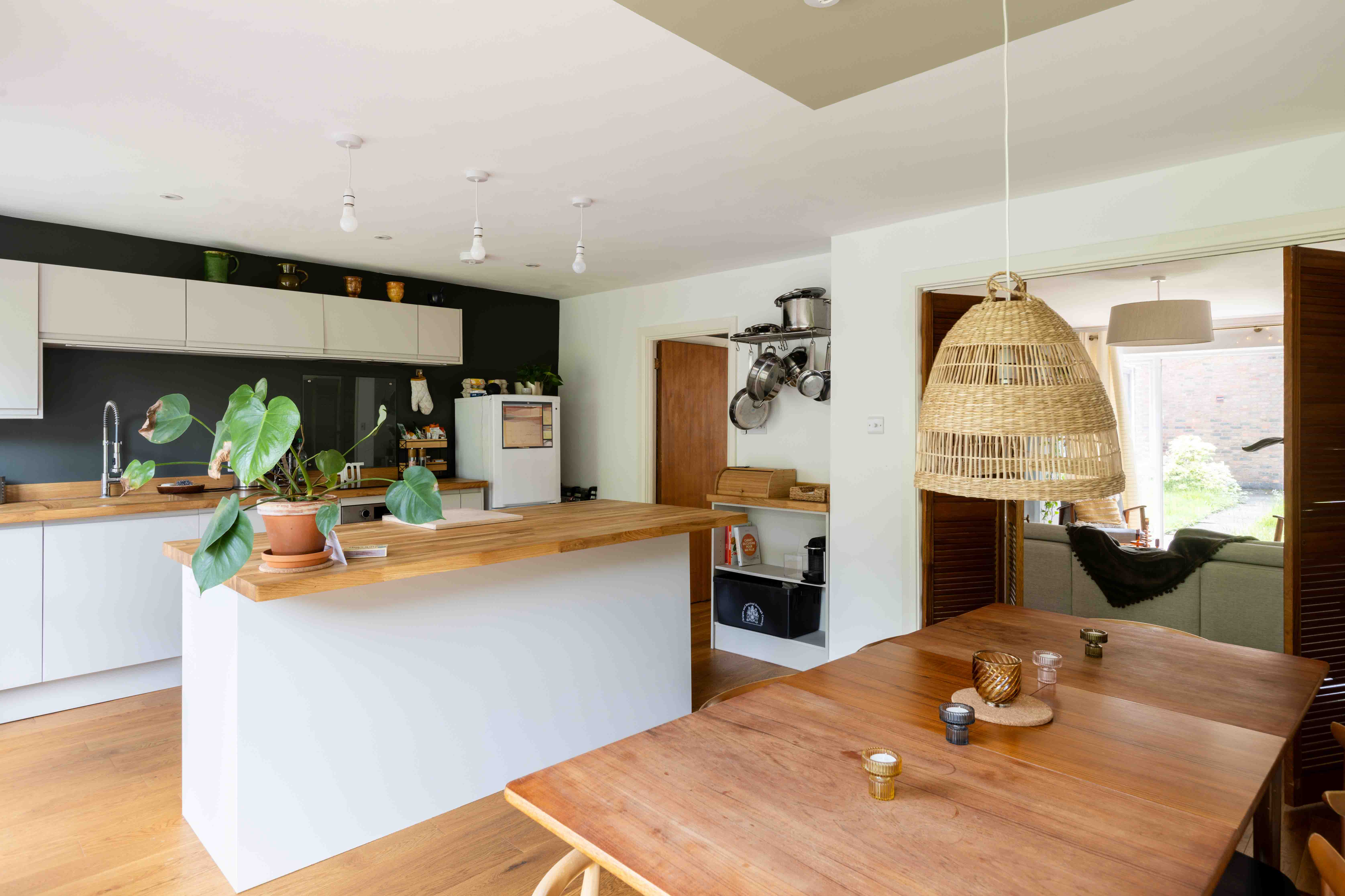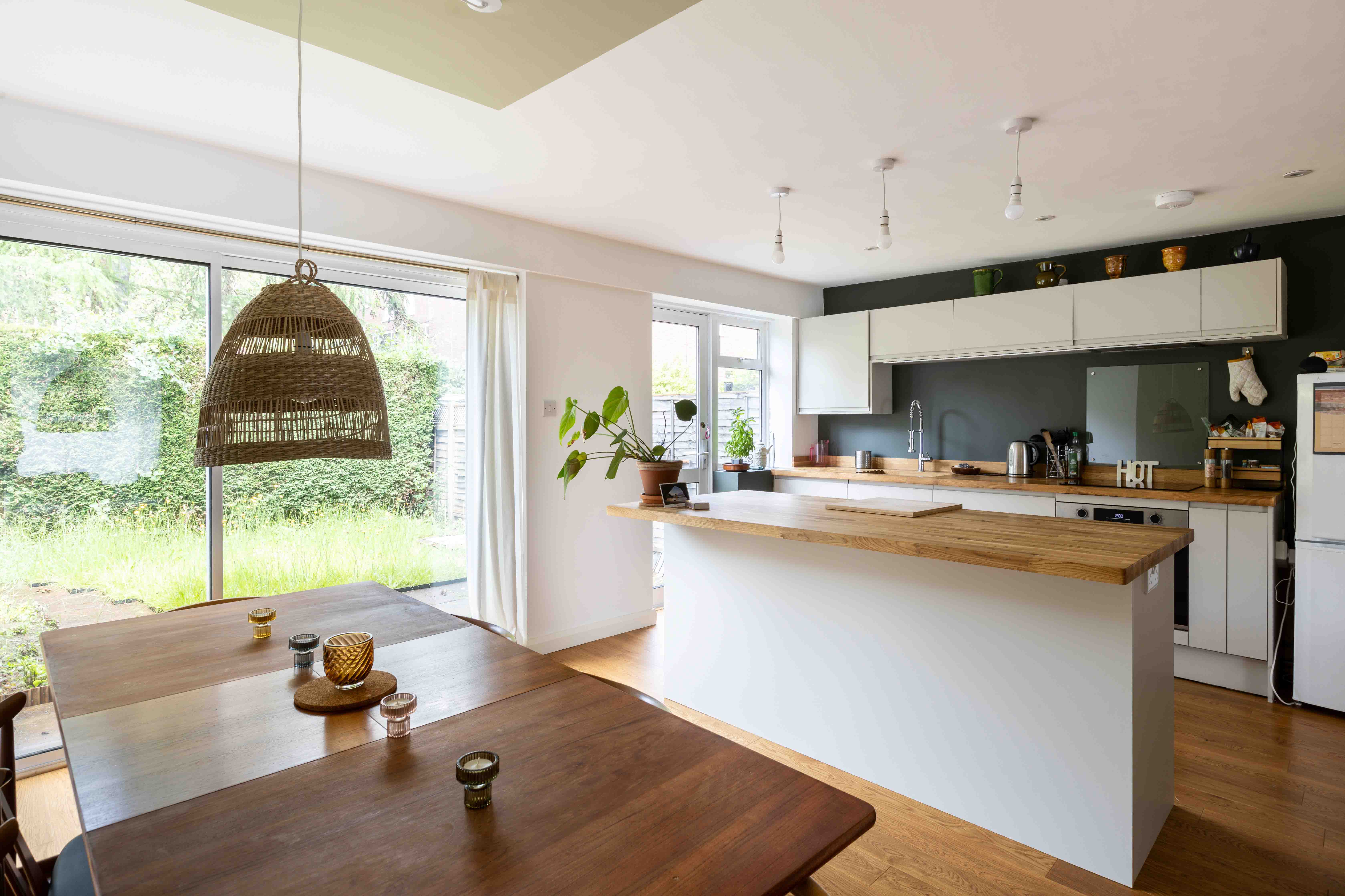 Stepping within, the warmth of oak flooring extends throughout the ground floor and a unique glass partition with integrated shelving introduces you to a generously proportioned reception room, bathed in natural light. The current owners have tastefully styled this space with a harmonious mix of mid-century and Scandinavian interiors, creating an inviting and stylish ambiance. Traditional wooden bifold doors seamlessly connect the reception area to a large kitchen and dining room. At the heart of this open-plan space, a substantial island serves as a natural divider, delineating cooking and dining zones. The kitchen itself is a study in modern neutrality, featuring sleek cabinetry and a wooden worktop, providing both functionality and aesthetic appeal. There is also a stylish downstairs WC.