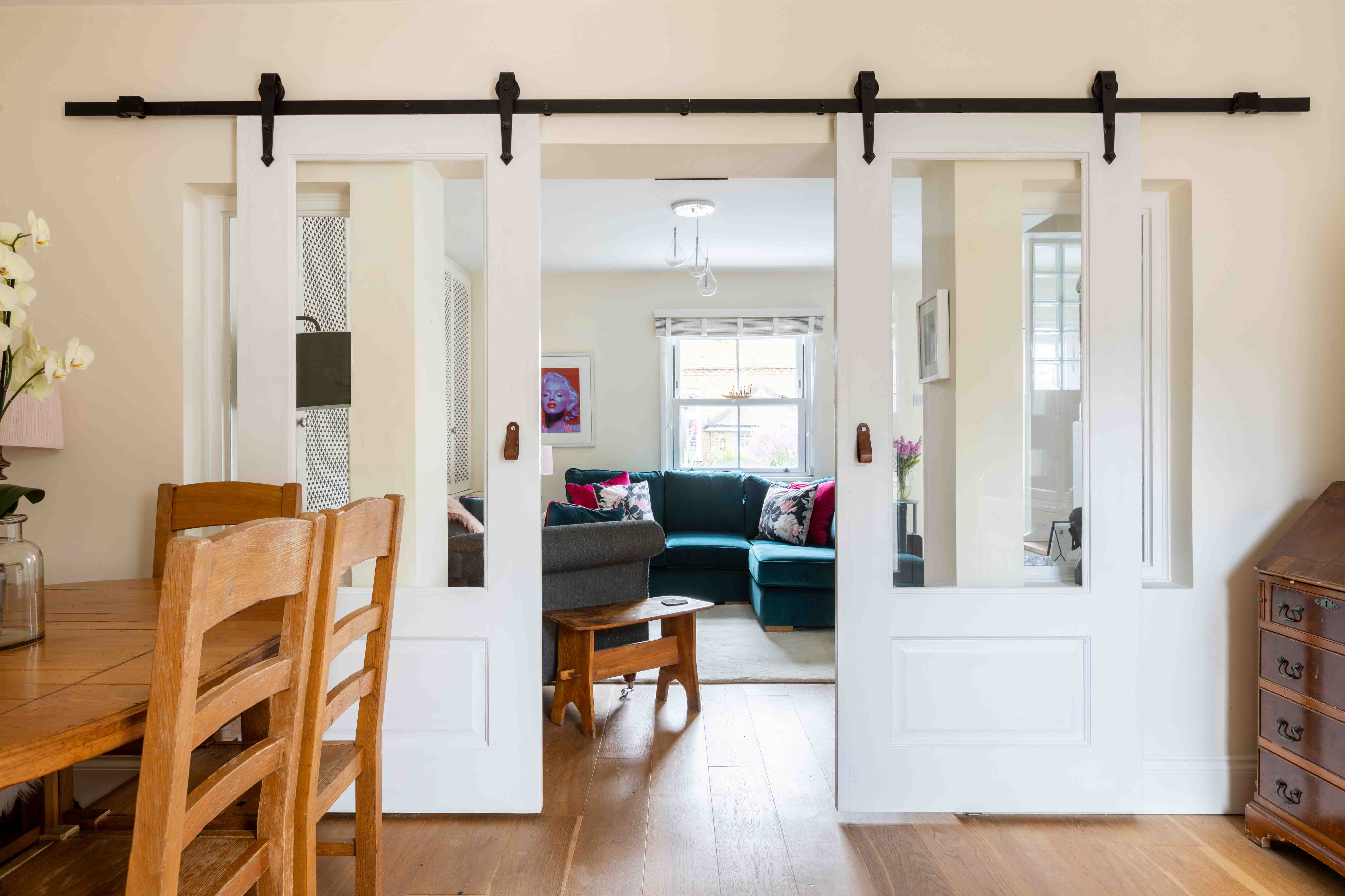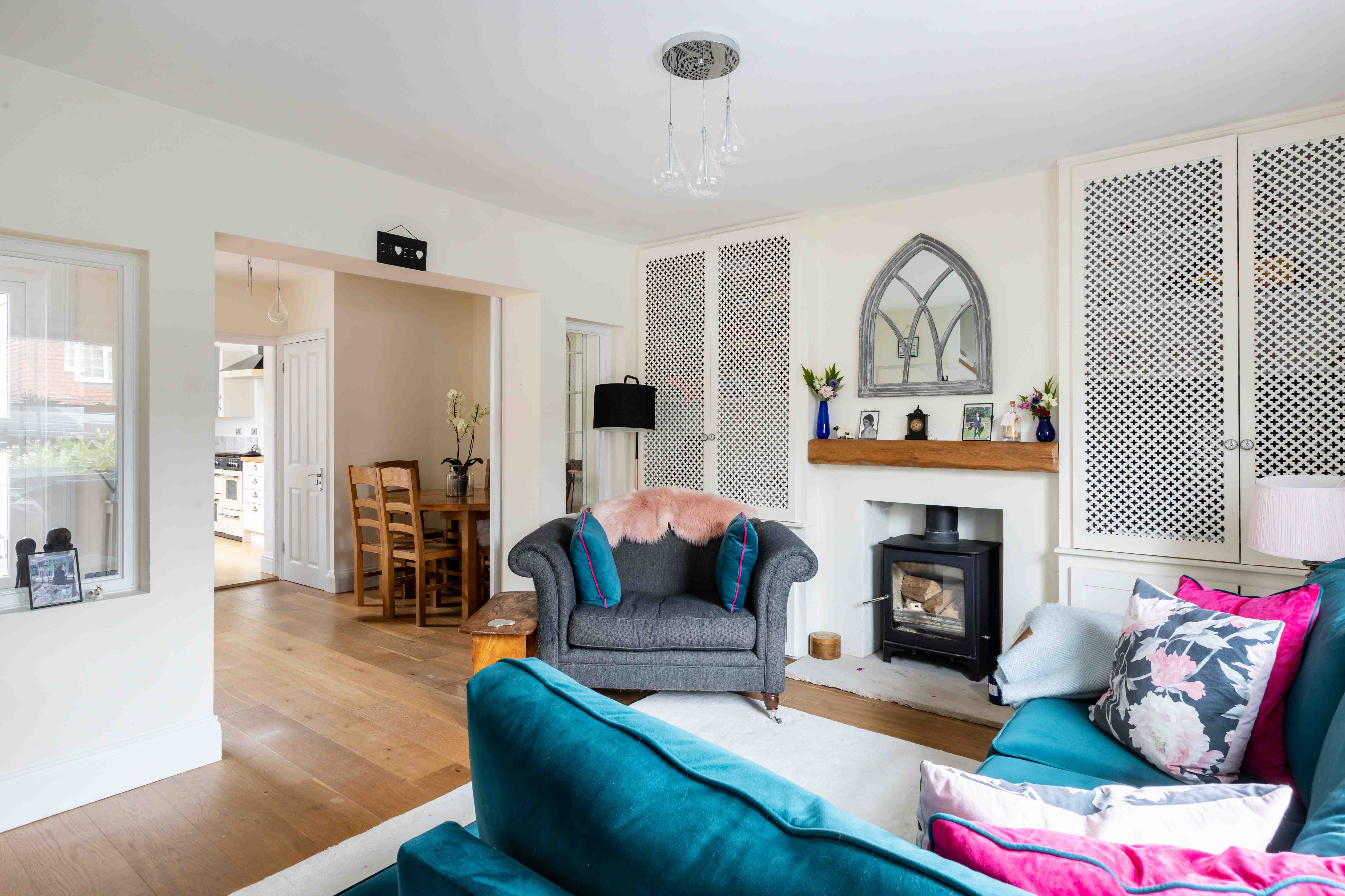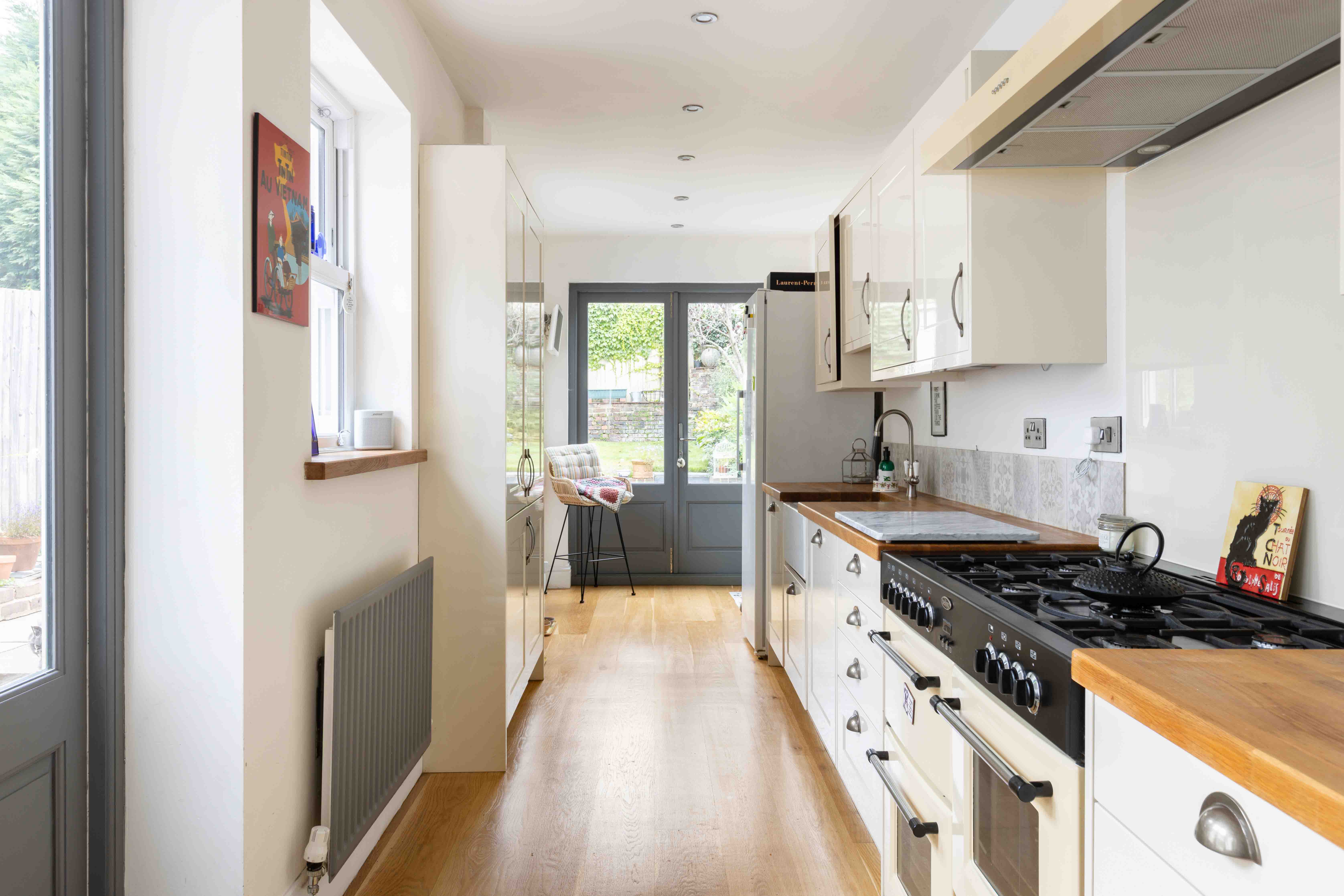 The approach is marked by a traditional front door, charmingly positioned within a brick wall that encloses a thoughtfully maintained front garden. Stepping inside, the double reception room impresses with its spacious layout, where barn doors subtly divide the cosy living room and elegant dining area. The living room is a warm and inviting space, featuring a log burner and bespoke built-in cabinetry, while the dining room offers seamless outdoor access, perfect for al-fresco dining on the private patio. At the rear of the home is the 25ft kitchen—a beautifully designed space that blends style and practicality. Glossy shaker-style cabinets with oak worktops and classic cup handles create a sophisticated feel, while integrated appliances and ample storage cater to modern needs. French doors flood the kitchen with morning light and lead out to an east-facing garden, ideal for soaking up the sunrise. A convenient downstairs WC completes the ground floor.